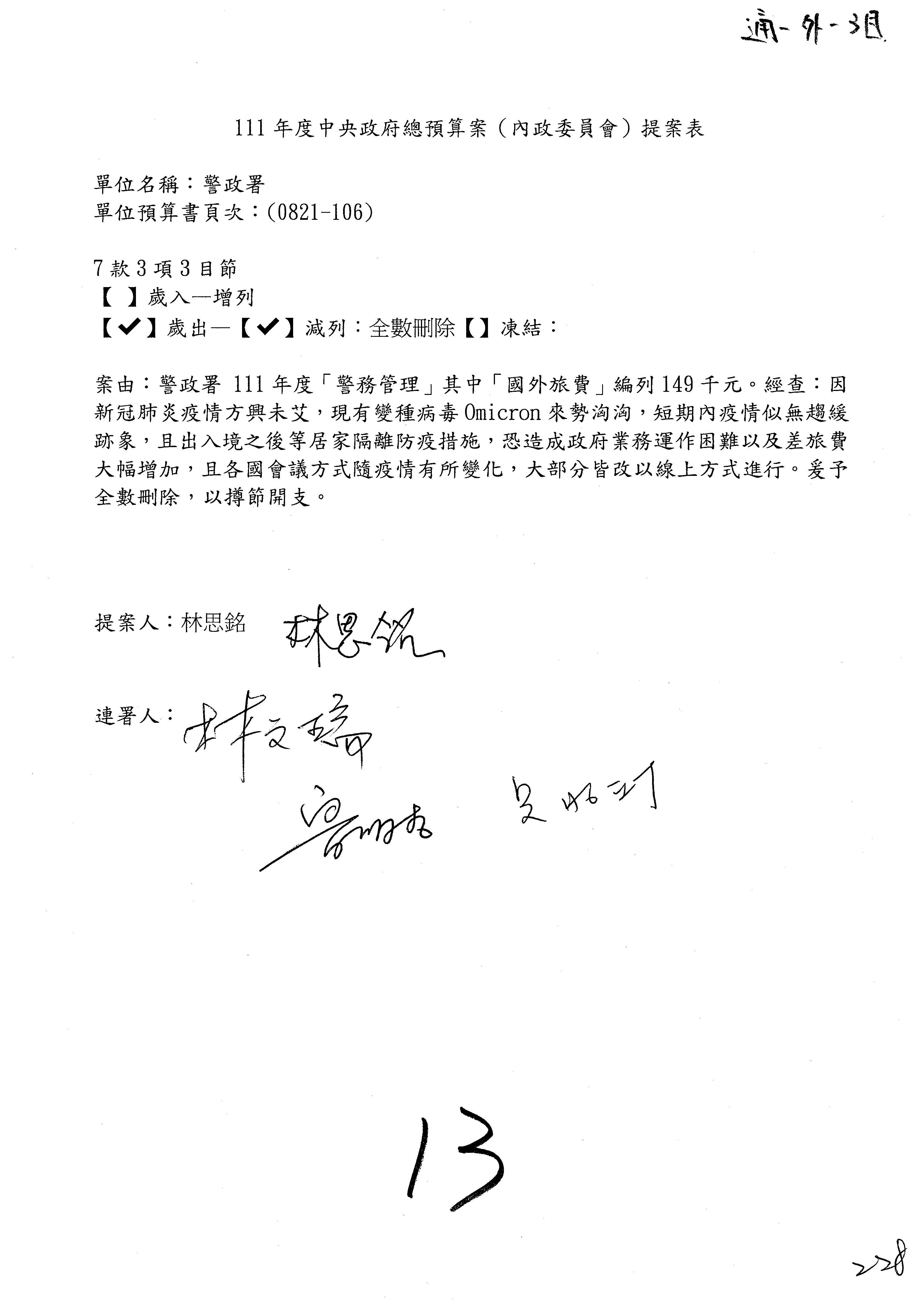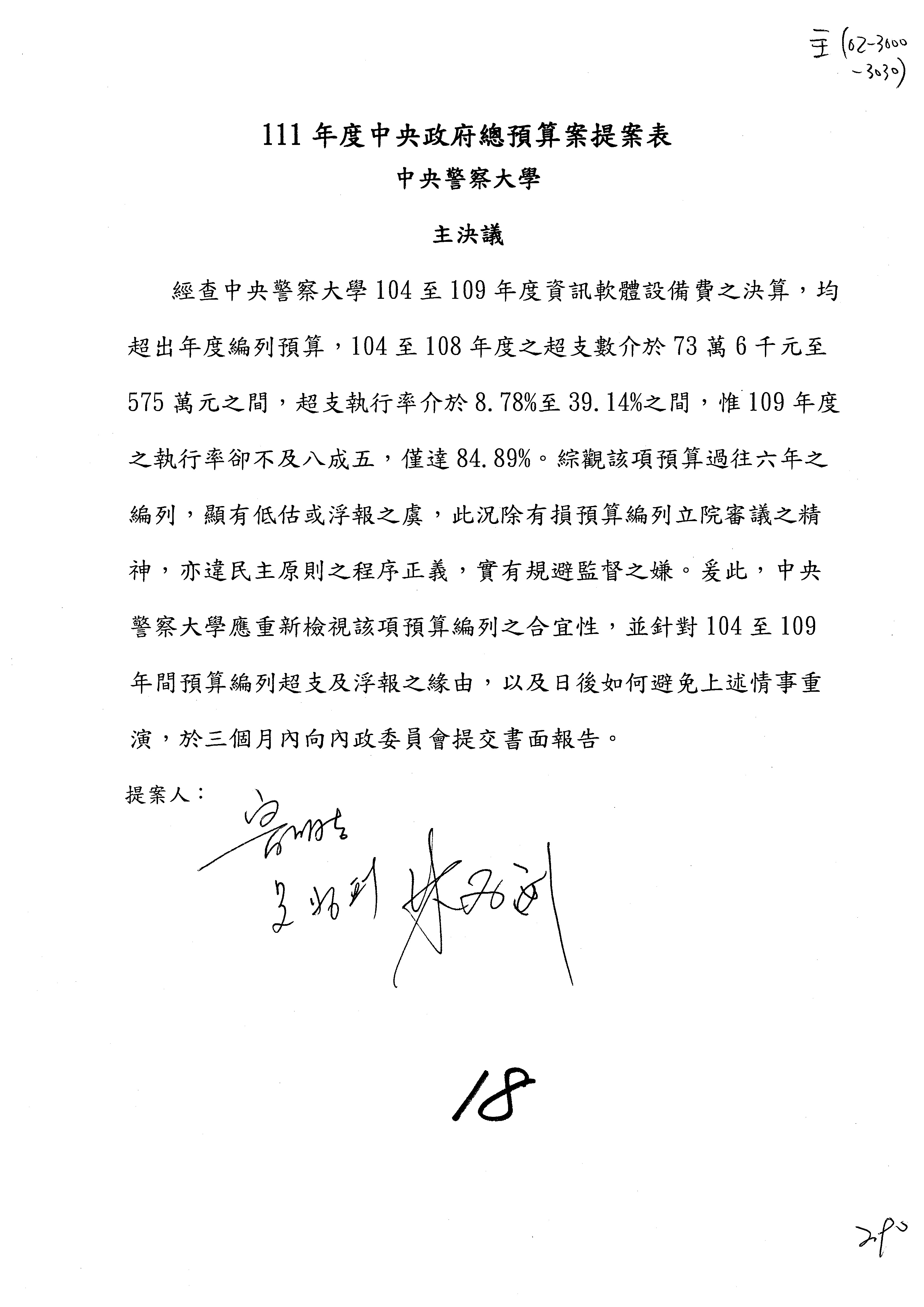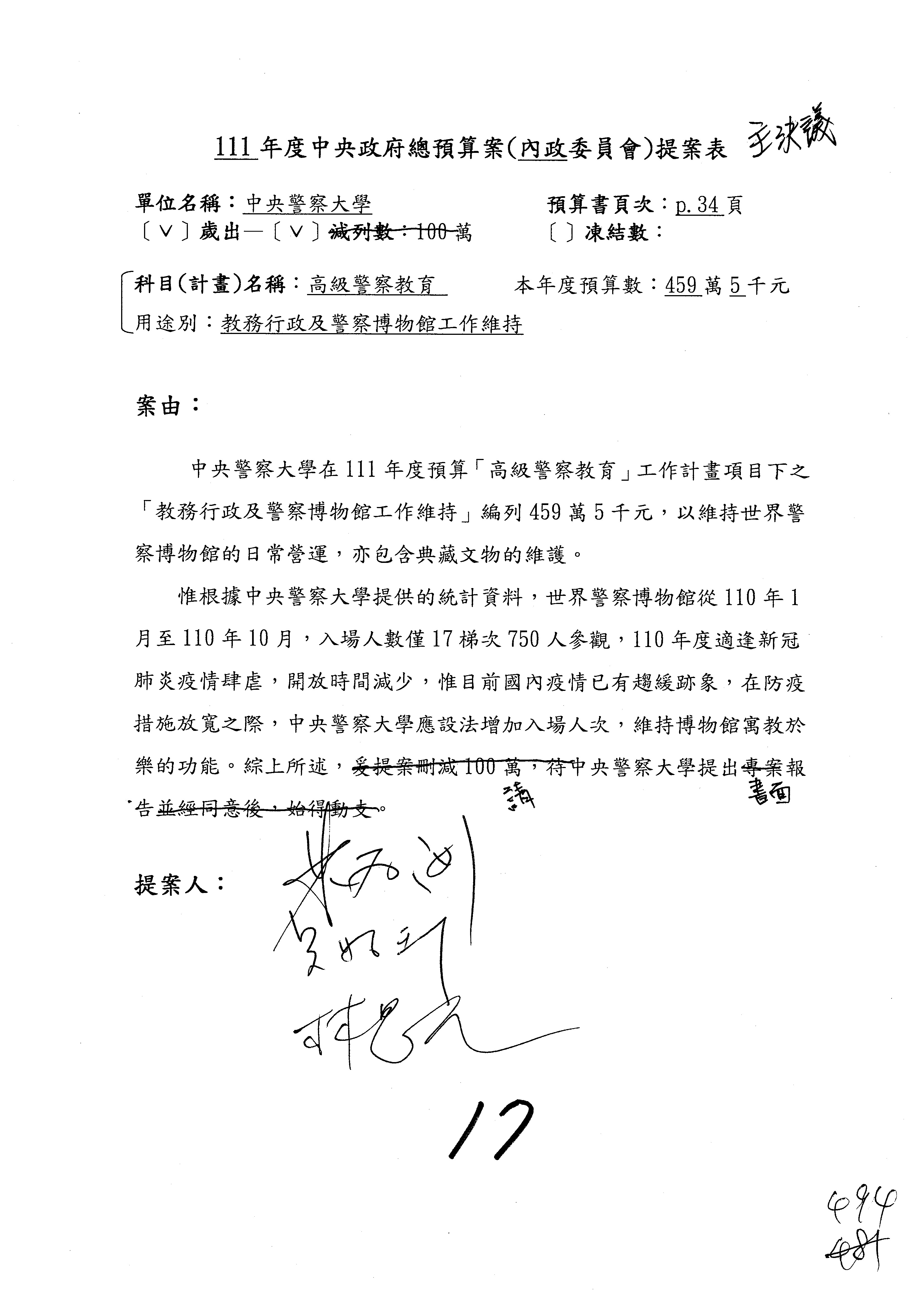 主席:這個是張宏陸委員的建議,然後還有其他的委員提減列的,已經改成主決議,其中第10案改成主決議。另外有撤案的,本席先宣告一下,第13案,撤案;第15案、第16案,撤案;吳琪銘委員有提減列,所以這個……