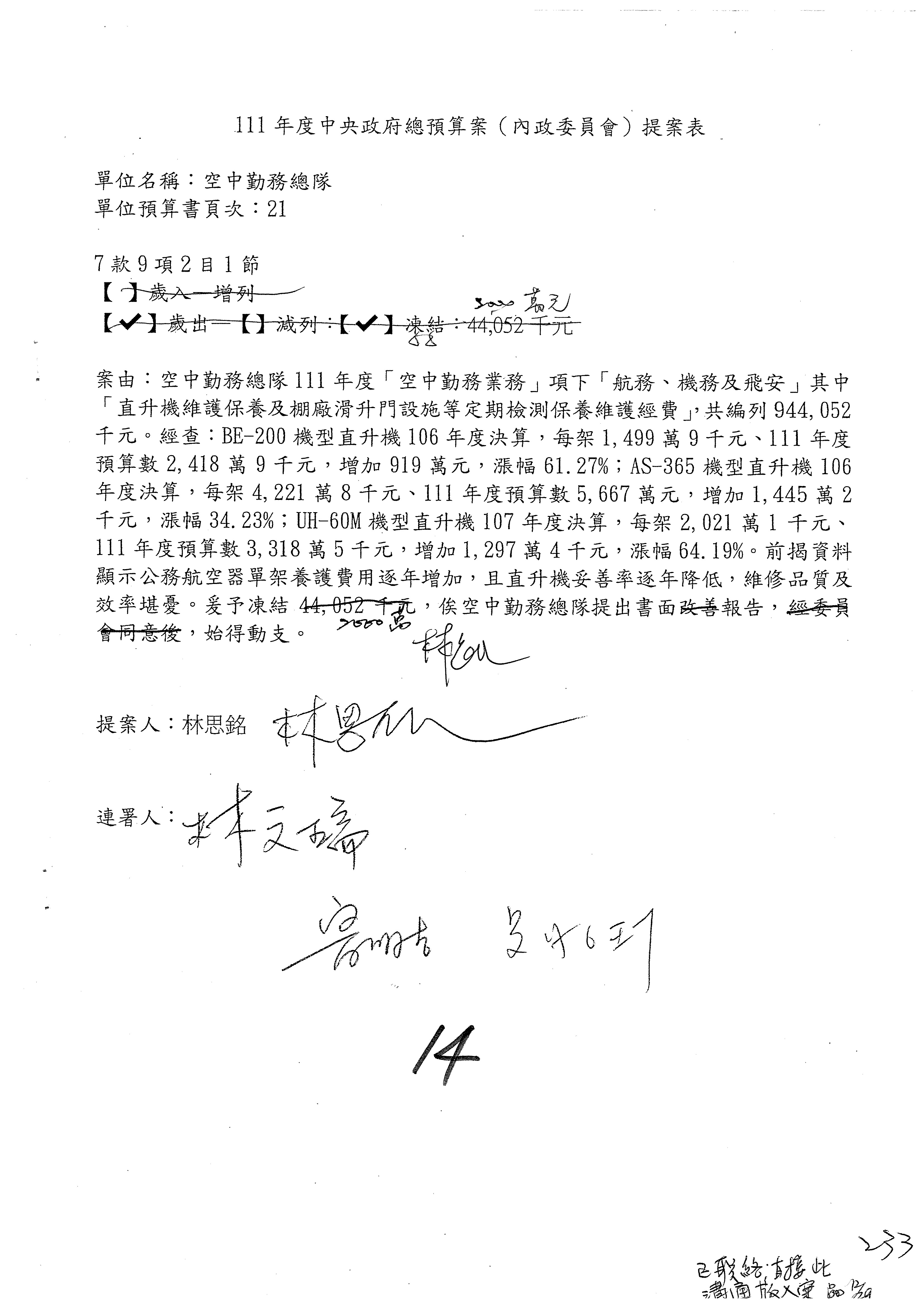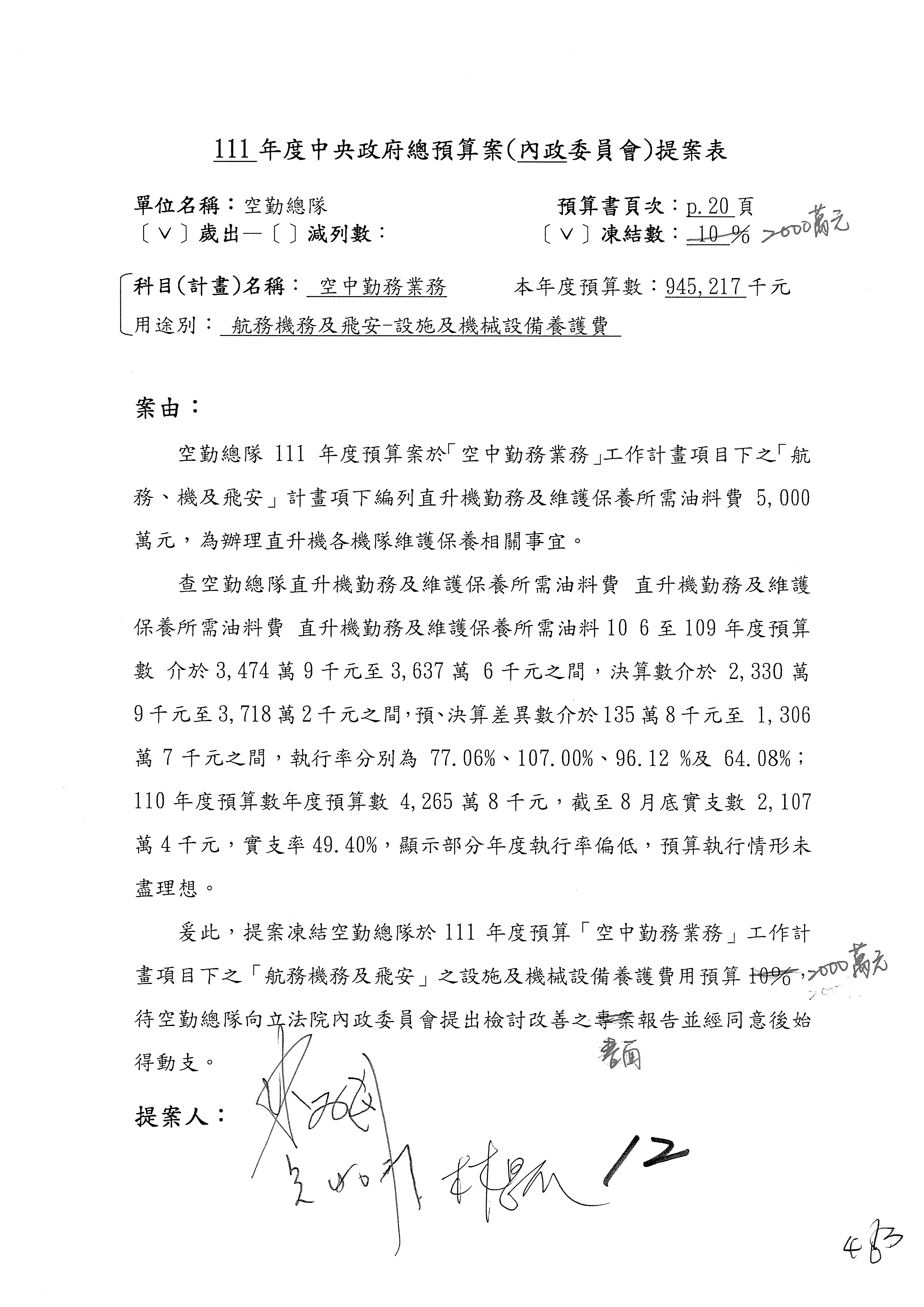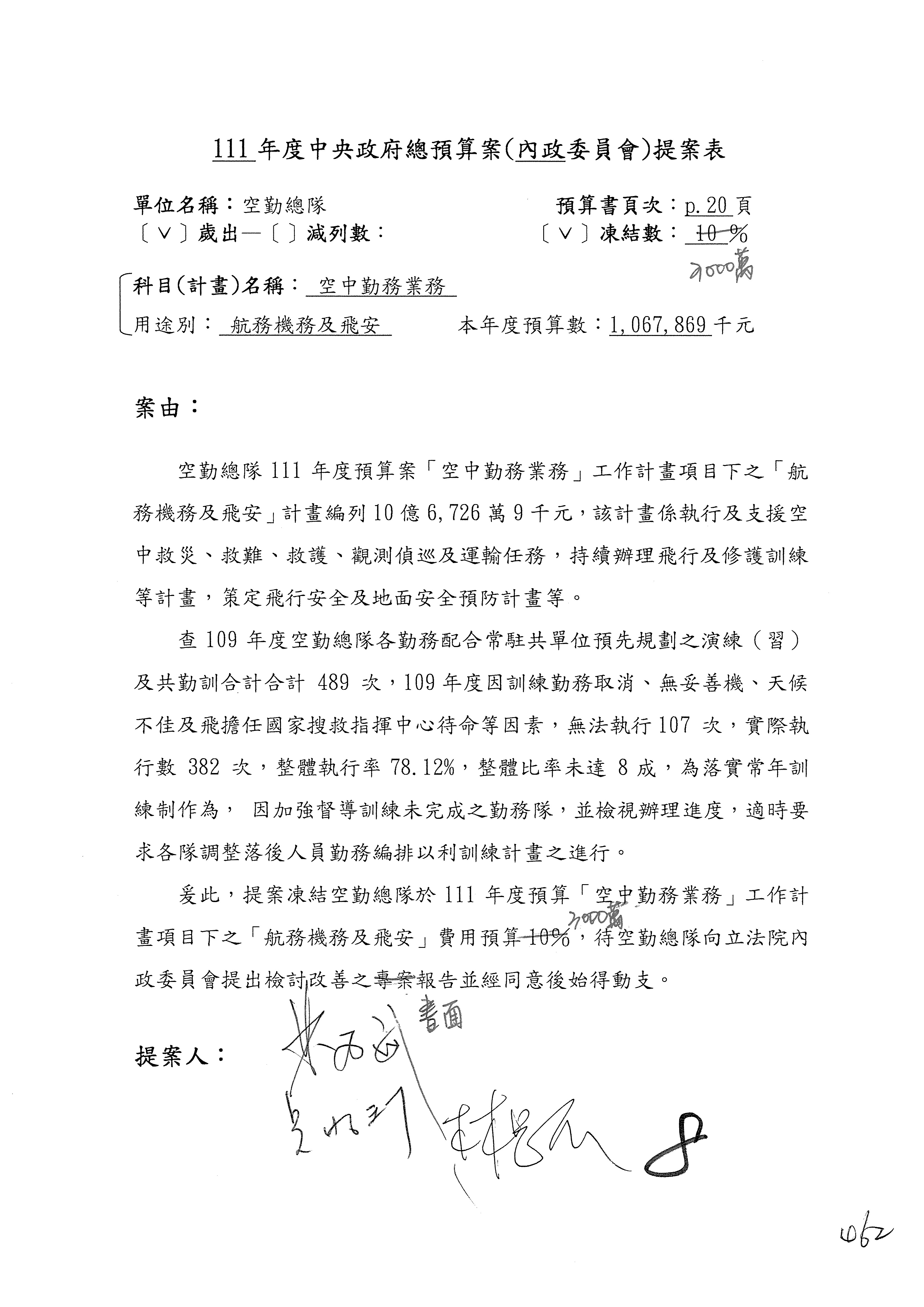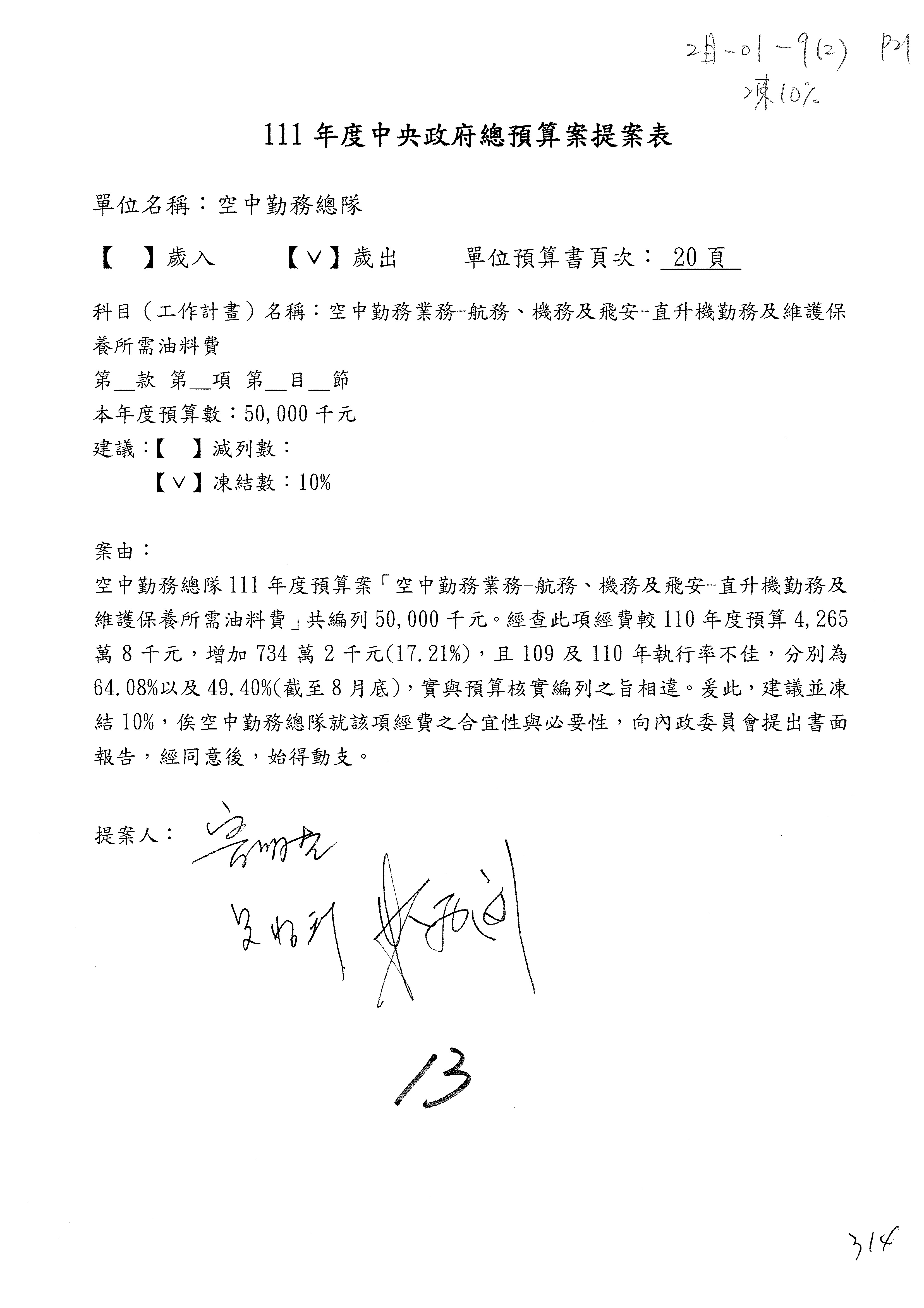 魯委員明哲:抱歉,耽誤1分鐘。我提的是第13案,主要是純從數字、預算切入,剛剛部長也特別說這兩年勤務特別多、很忙,所以你沒有辦法參加共訓,我們可以接受,可是如果你們是已經精銳盡出、全力以赴的狀況之下,我就不太瞭解,109年跟110年油料費的執行率只達到64%跟49%,是不是已經盡了全力?我的意思是純粹從數字看,你說飛機料油,沒有人在刪凍這個,只是說你編這個預算的數字,如果你已經拼全勁了,可是油料只用到了五成、六成,新的一年(111年)又要在上面增加734萬元,我只是不解,我相信這是實支實付,我也不要說對你們油料怎麼樣,我這個就撤案,好不好?