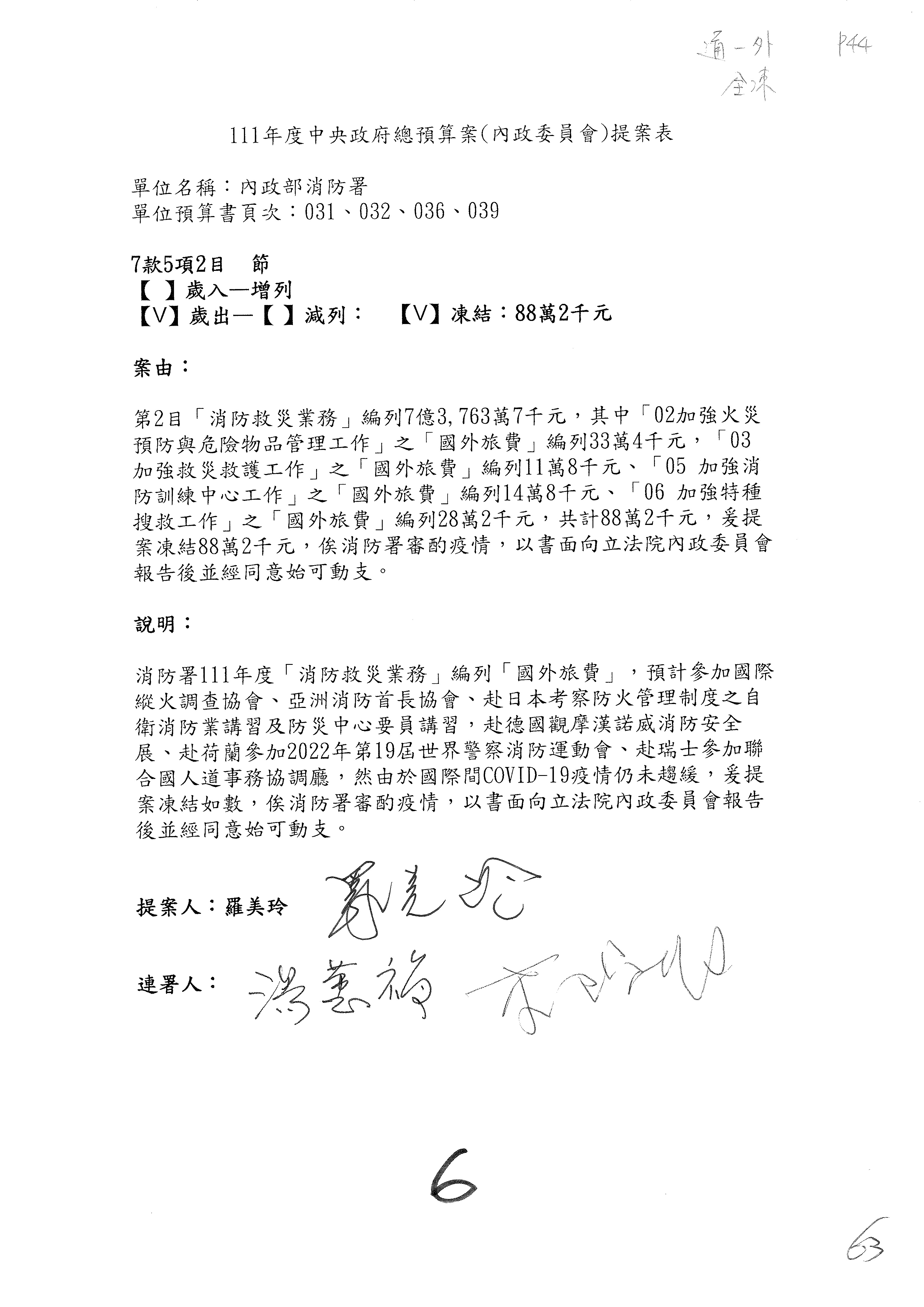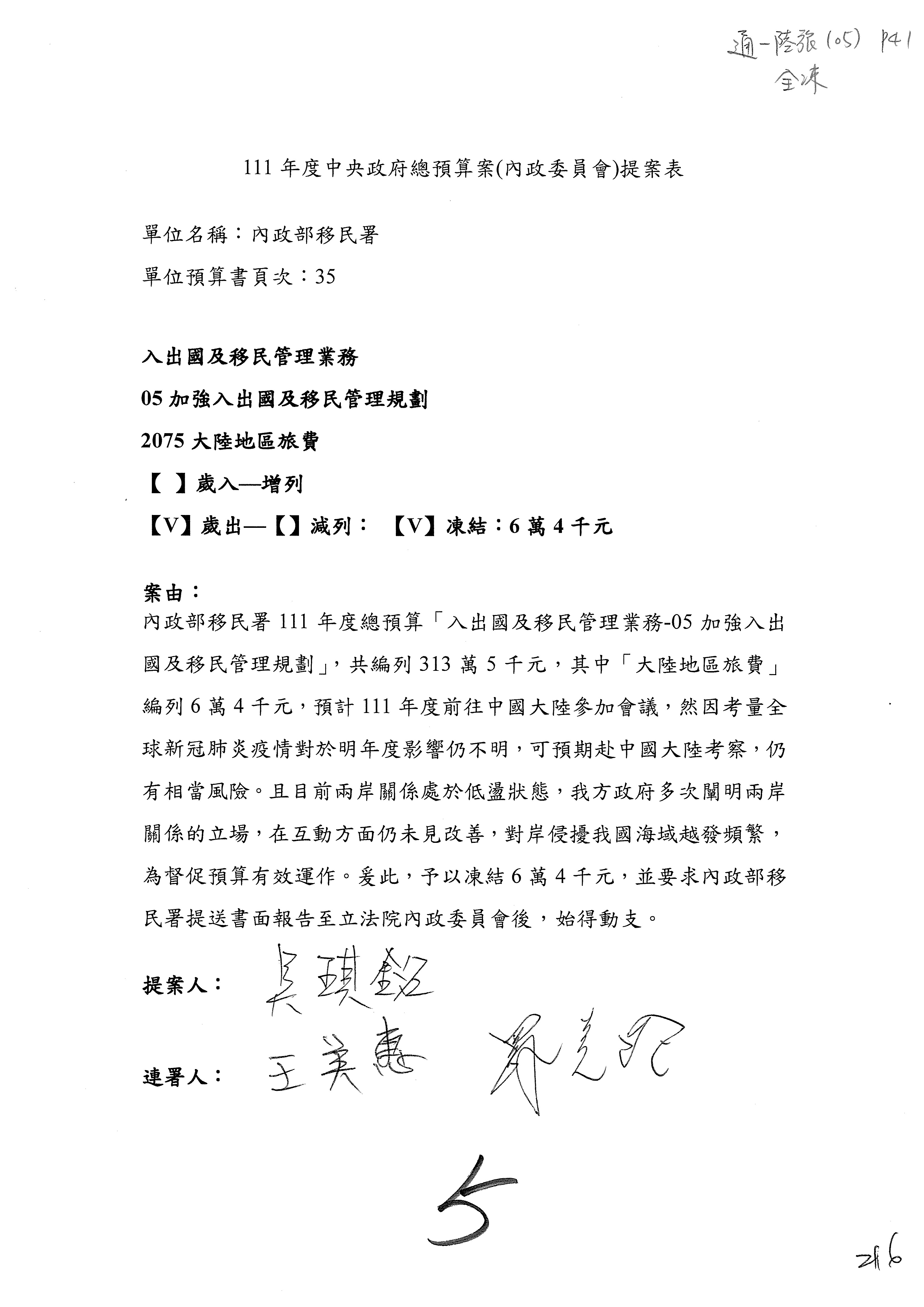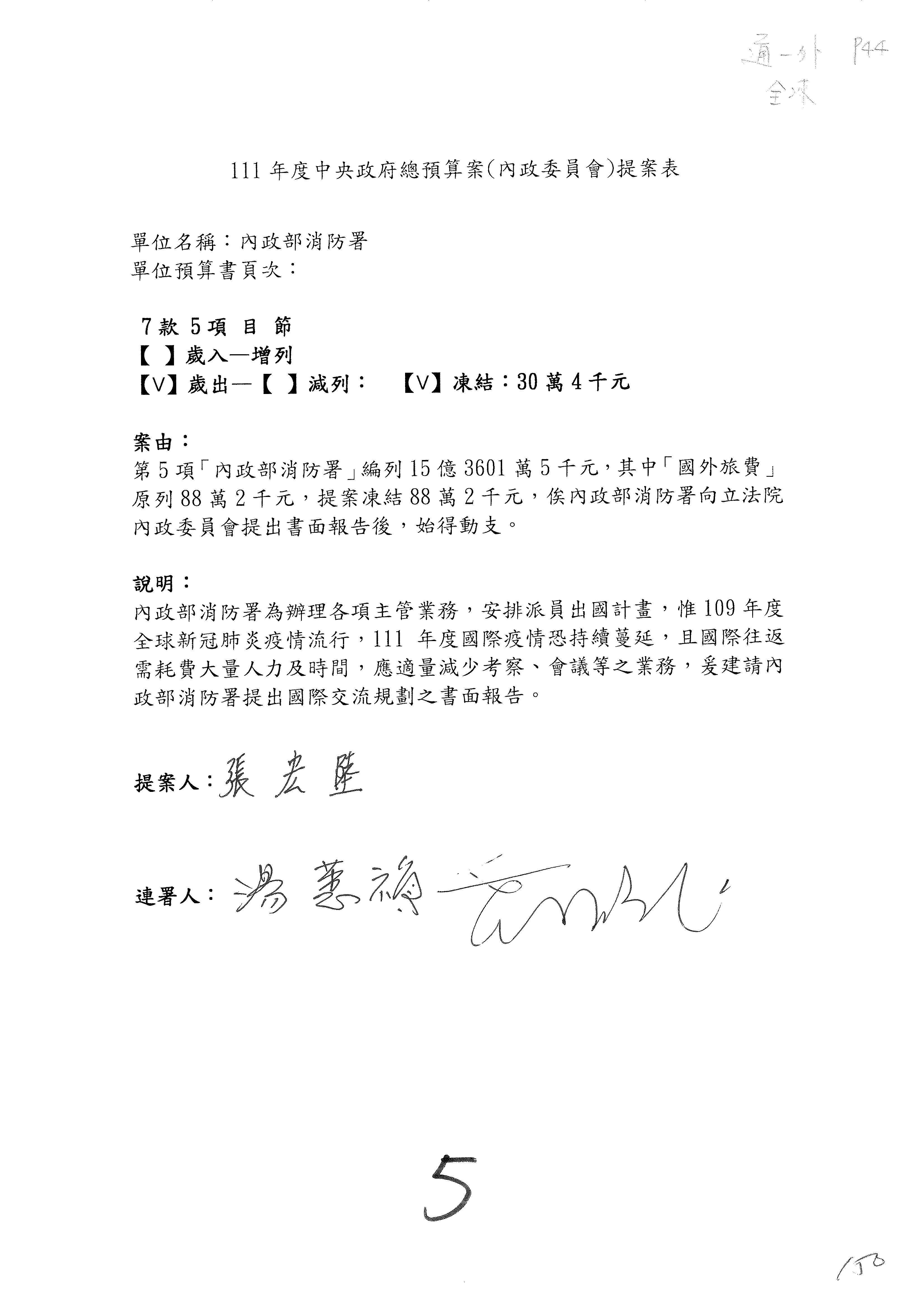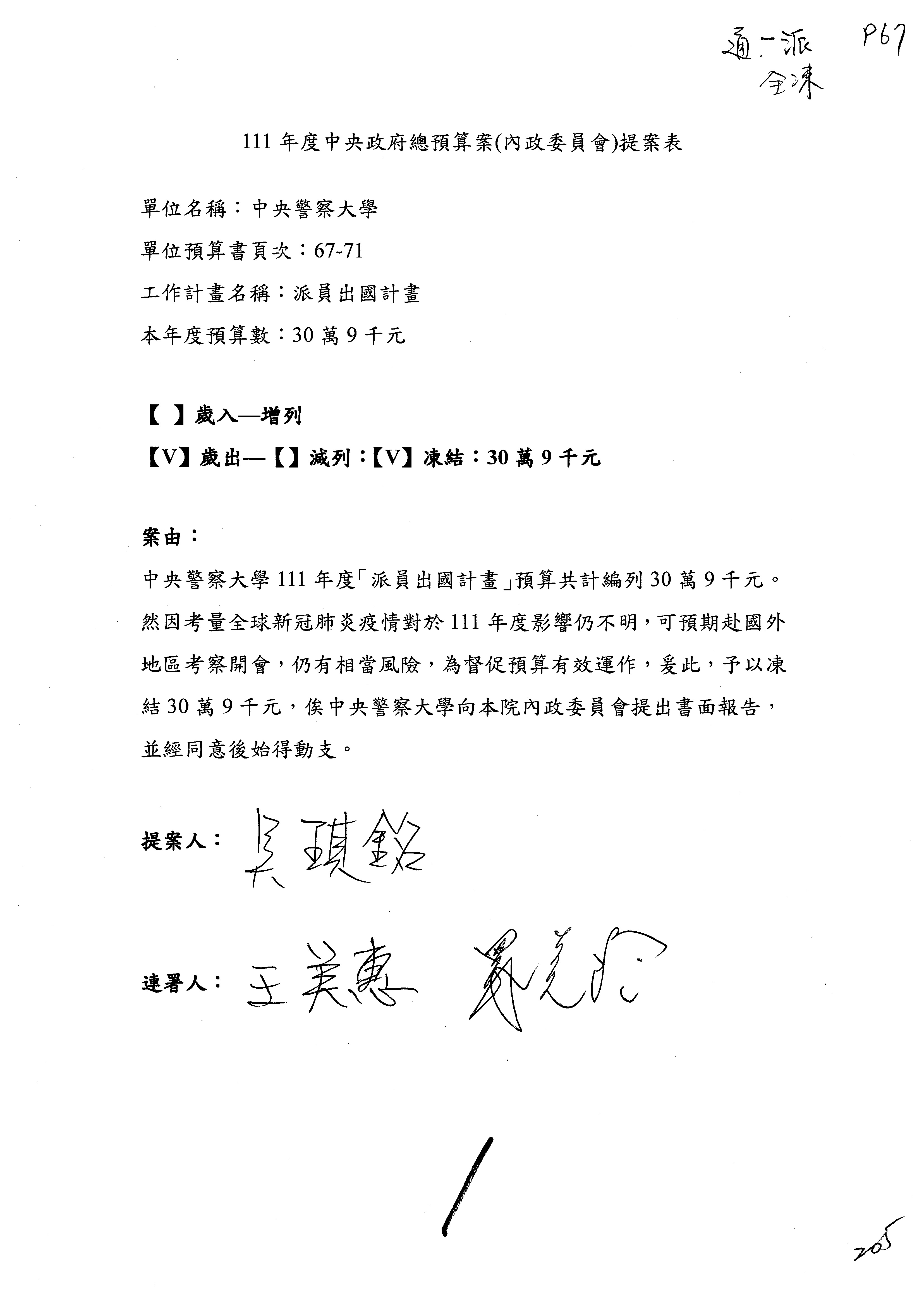 通案部分同樣是針對派員出國計畫及國外旅費的部分,第1案撤案。有關凍結的部分,相關預算總金額為30萬元,到底用不用得到都同樣有這個問題,我建議凍結5萬元、提書面報告。