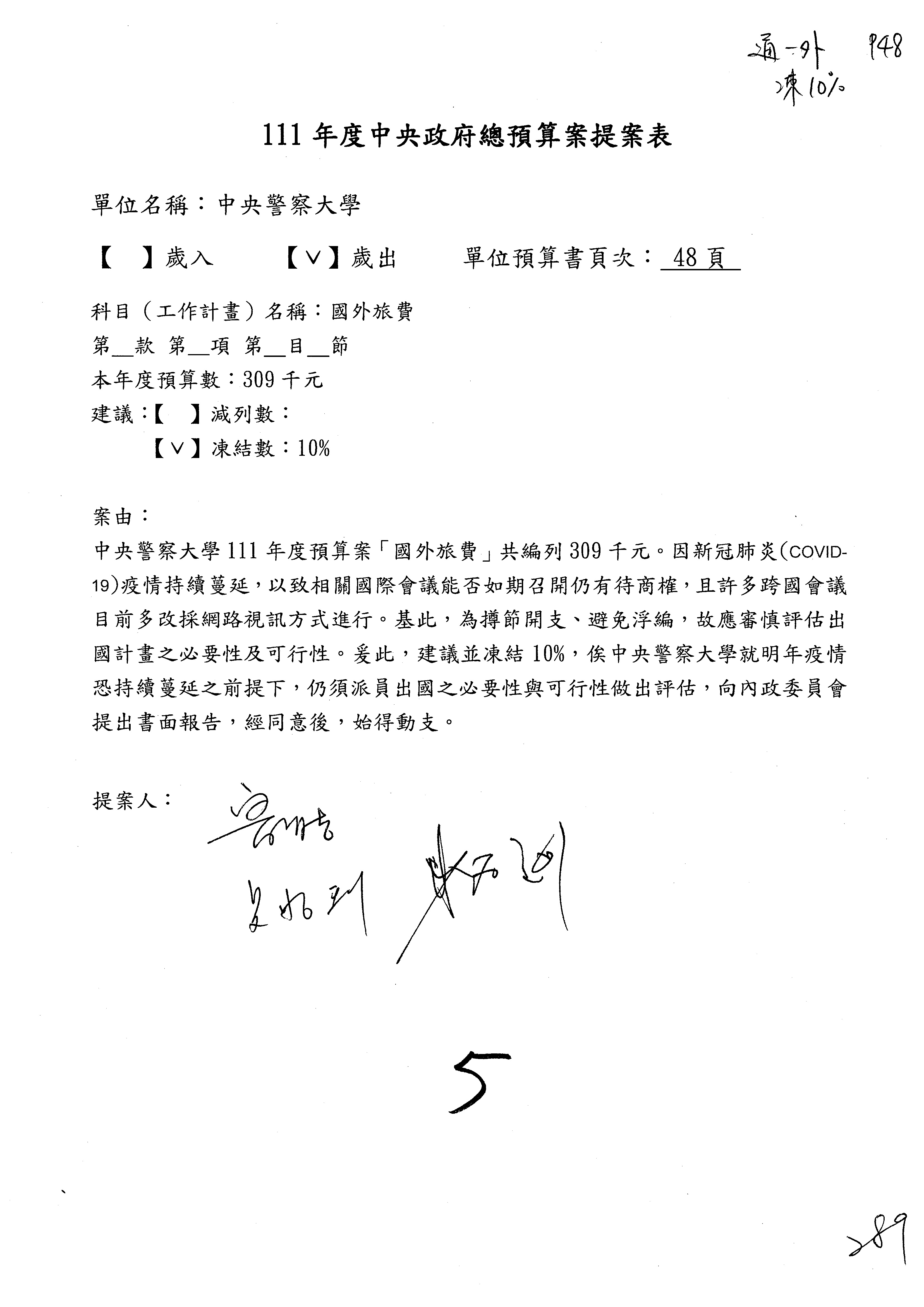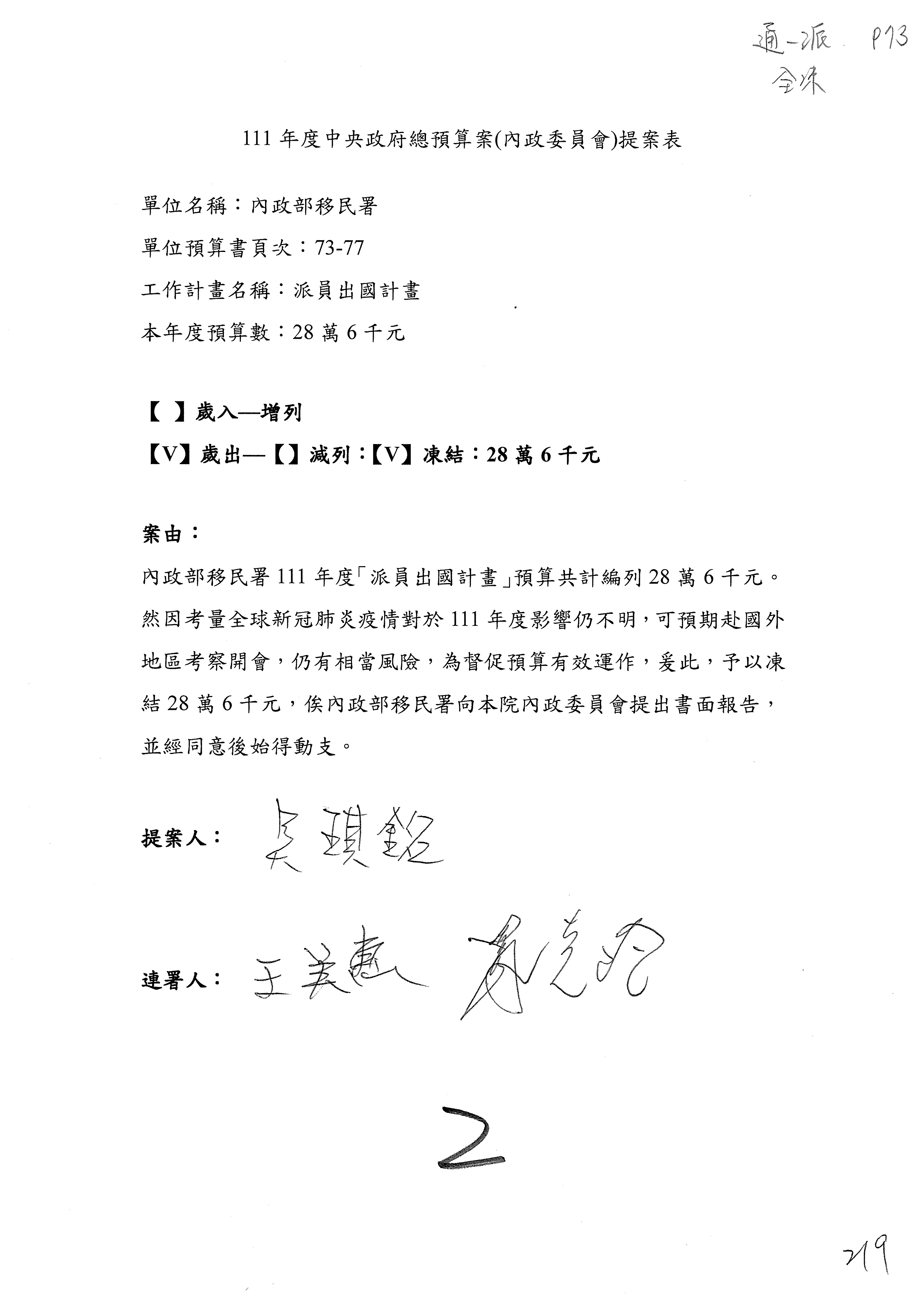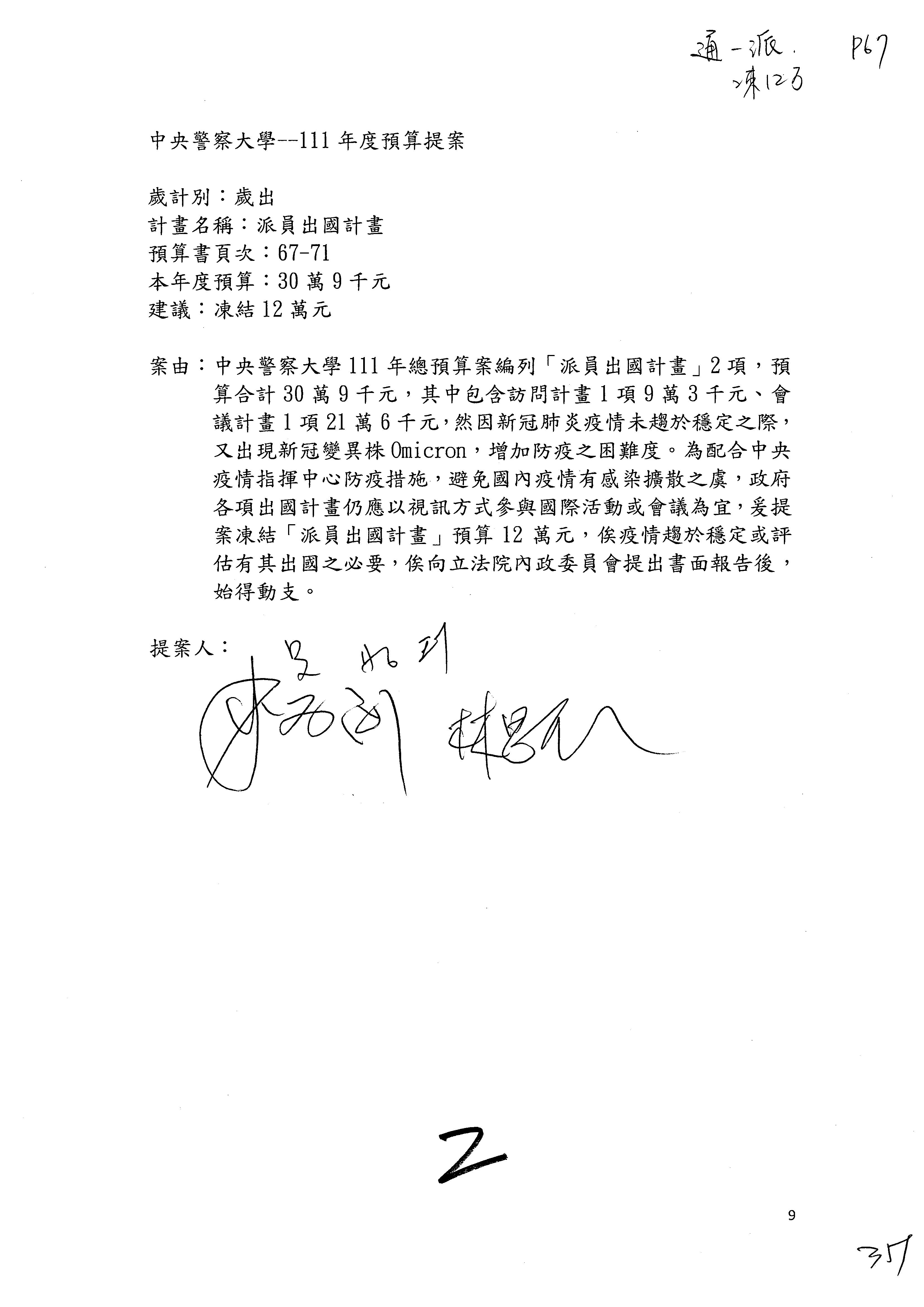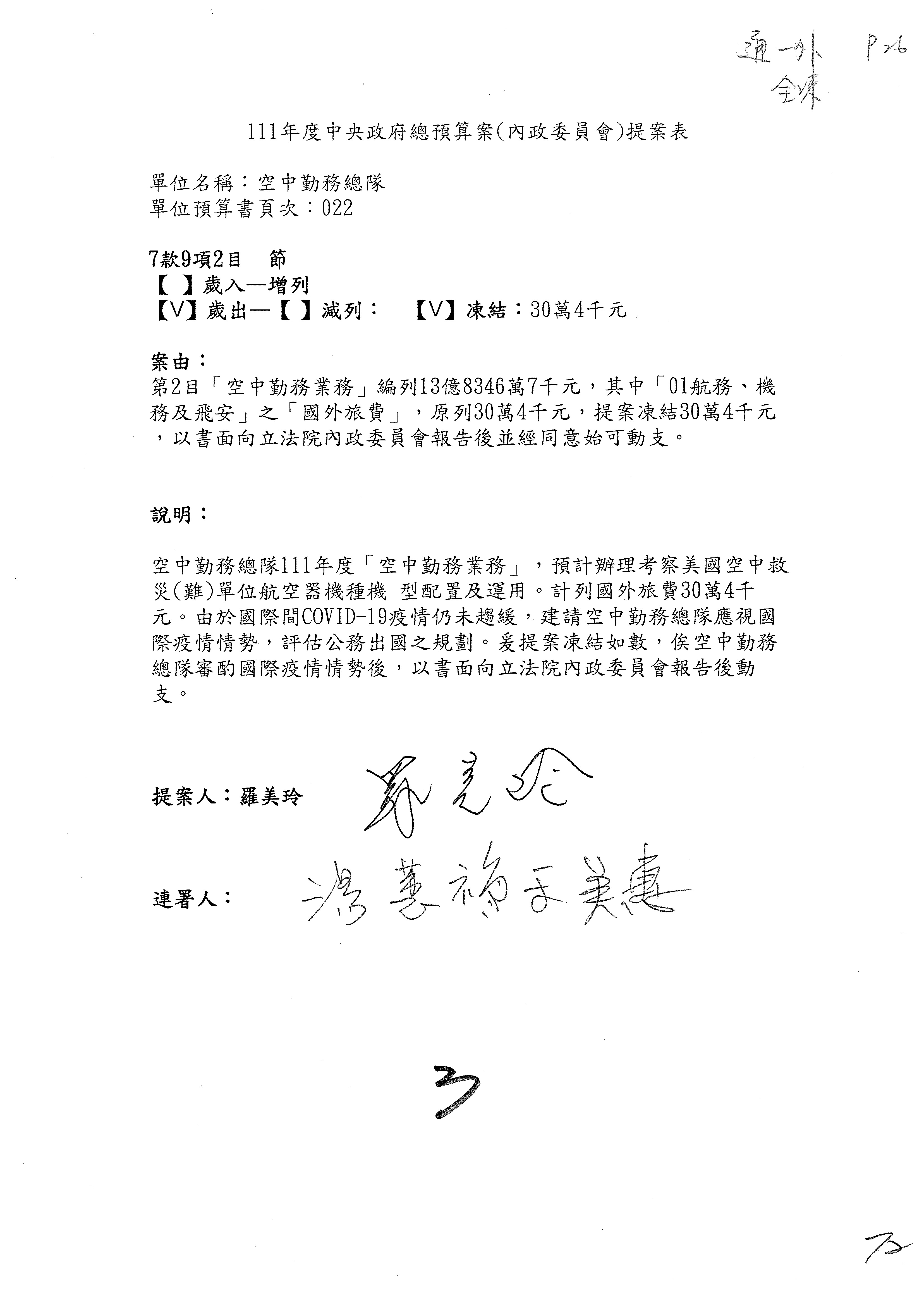 通案部分同樣是針對派員出國計畫及國外旅費的部分,第1案撤案。有關凍結的部分,相關預算總金額為30萬元,到底用不用得到都同樣有這個問題,我建議凍結5萬元、提書面報告。