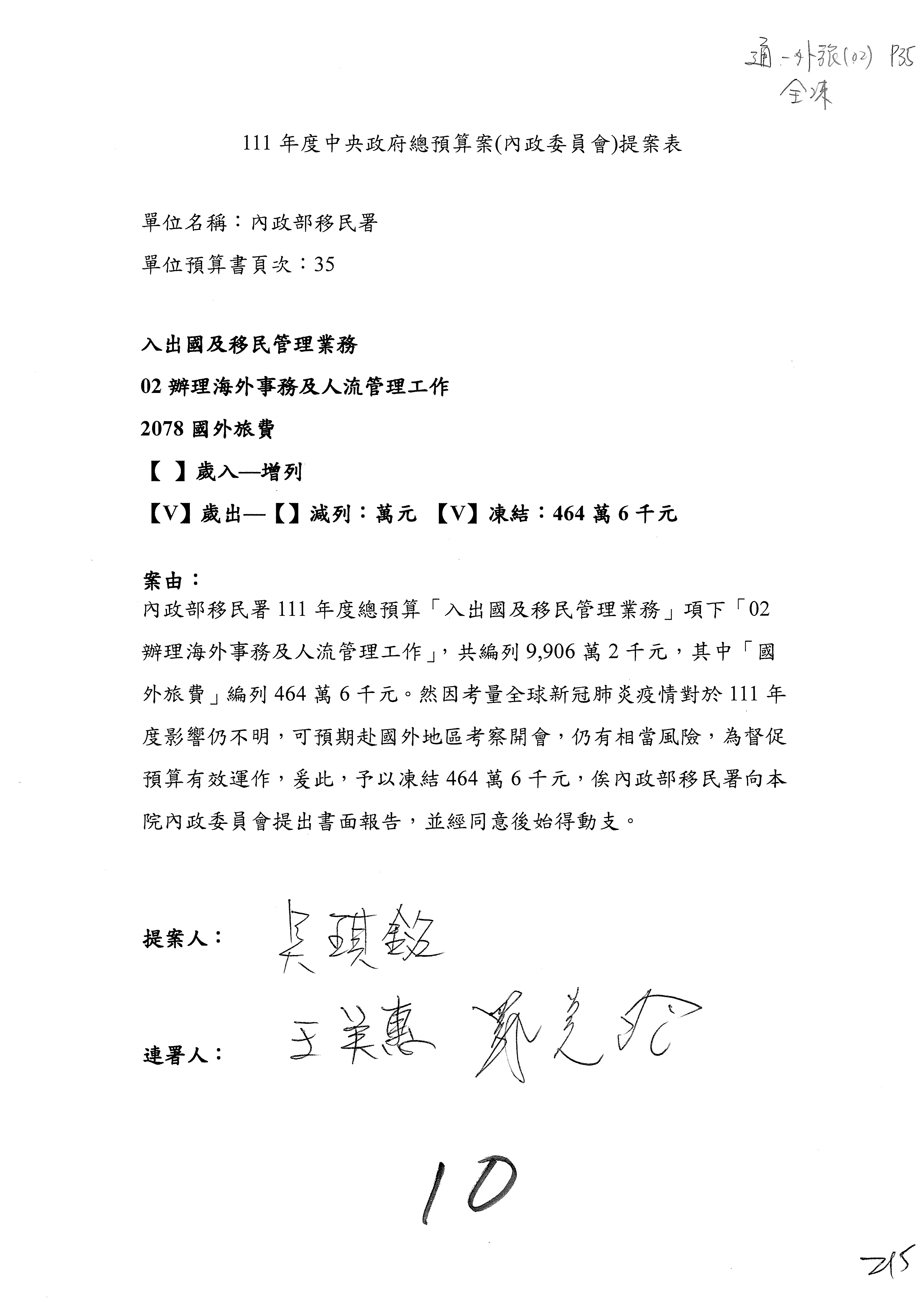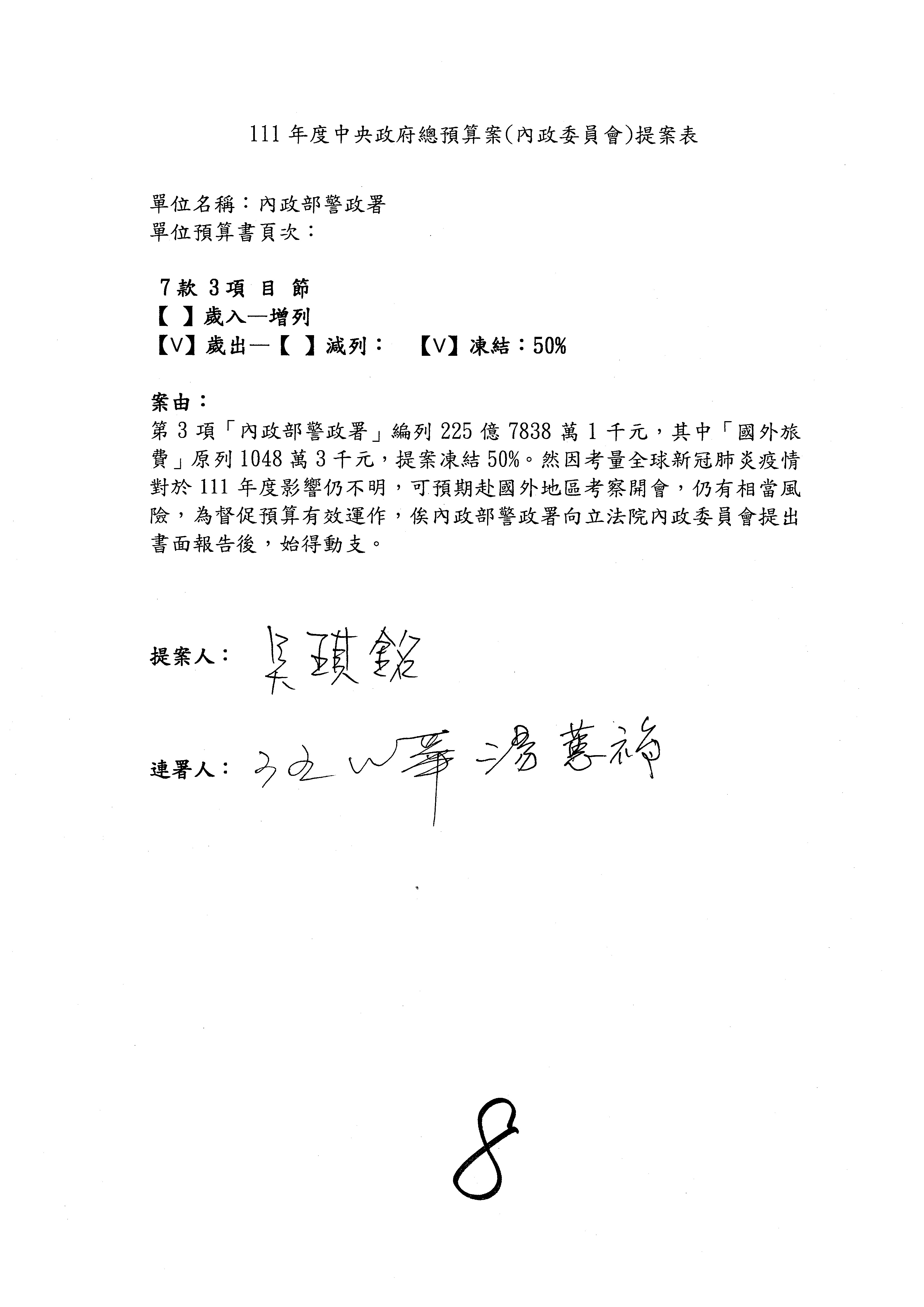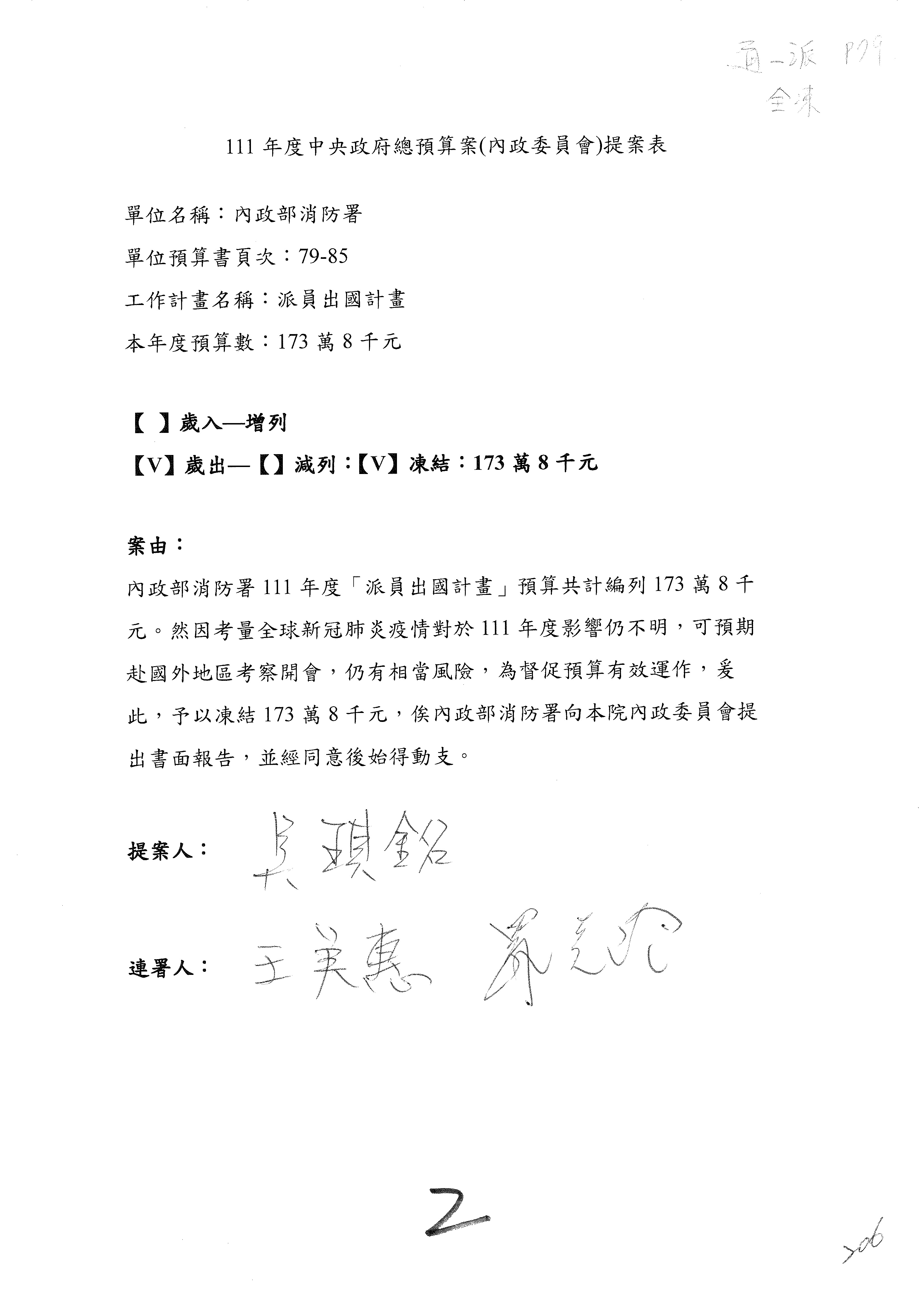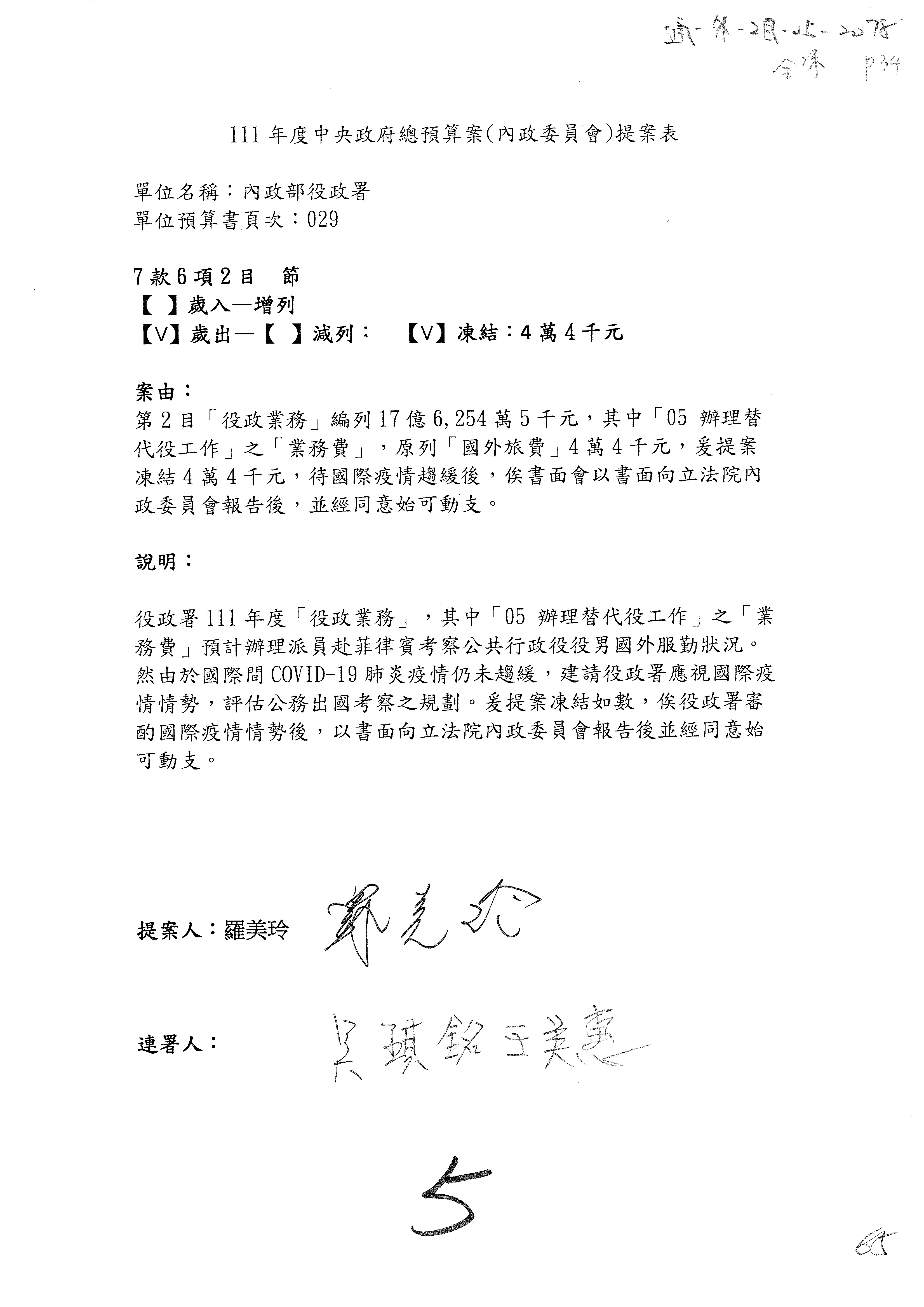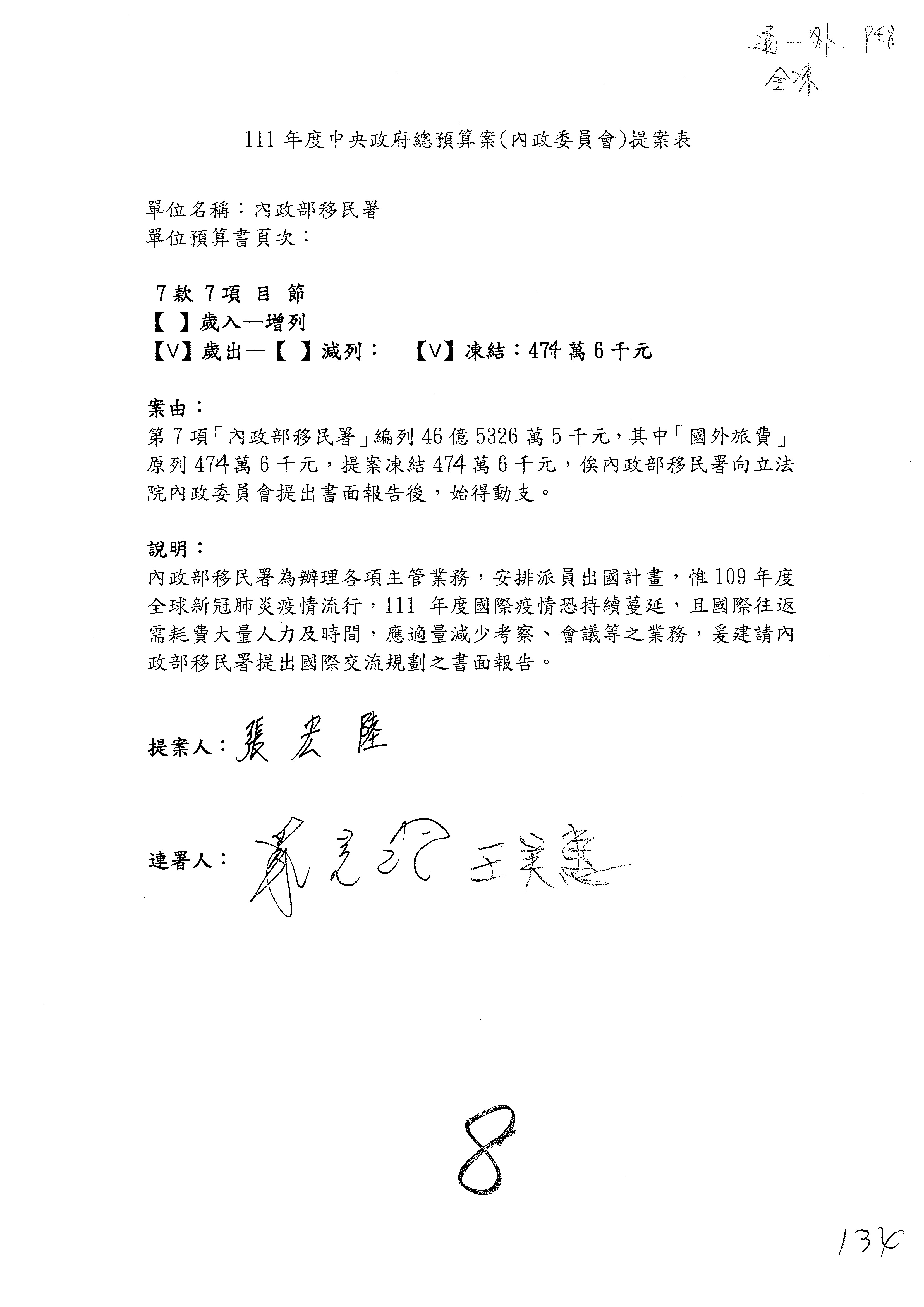 通案部分同樣是針對派員出國計畫及國外旅費的部分,第1案撤案。有關凍結的部分,相關預算總金額為30萬元,到底用不用得到都同樣有這個問題,我建議凍結5萬元、提書面報告。