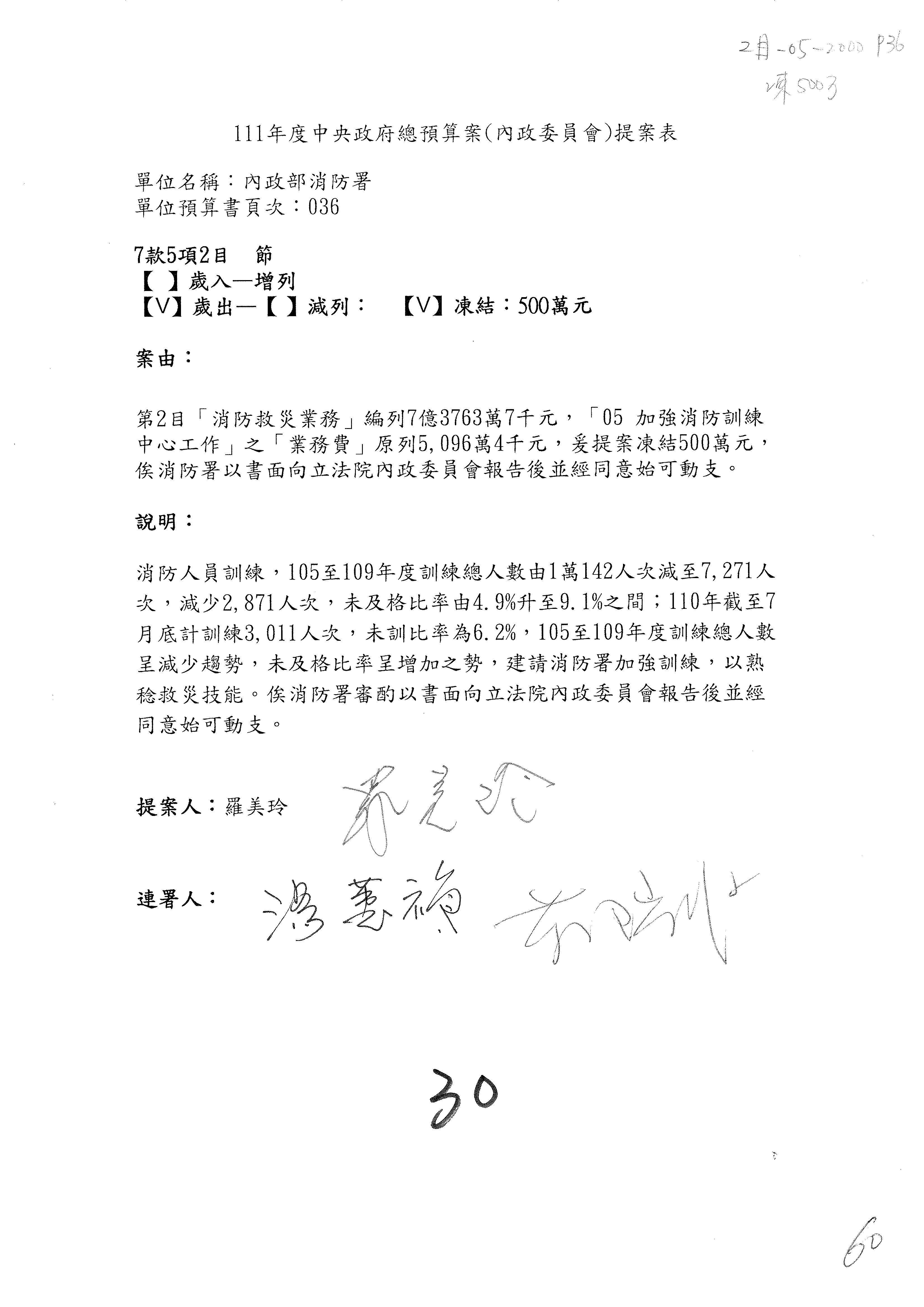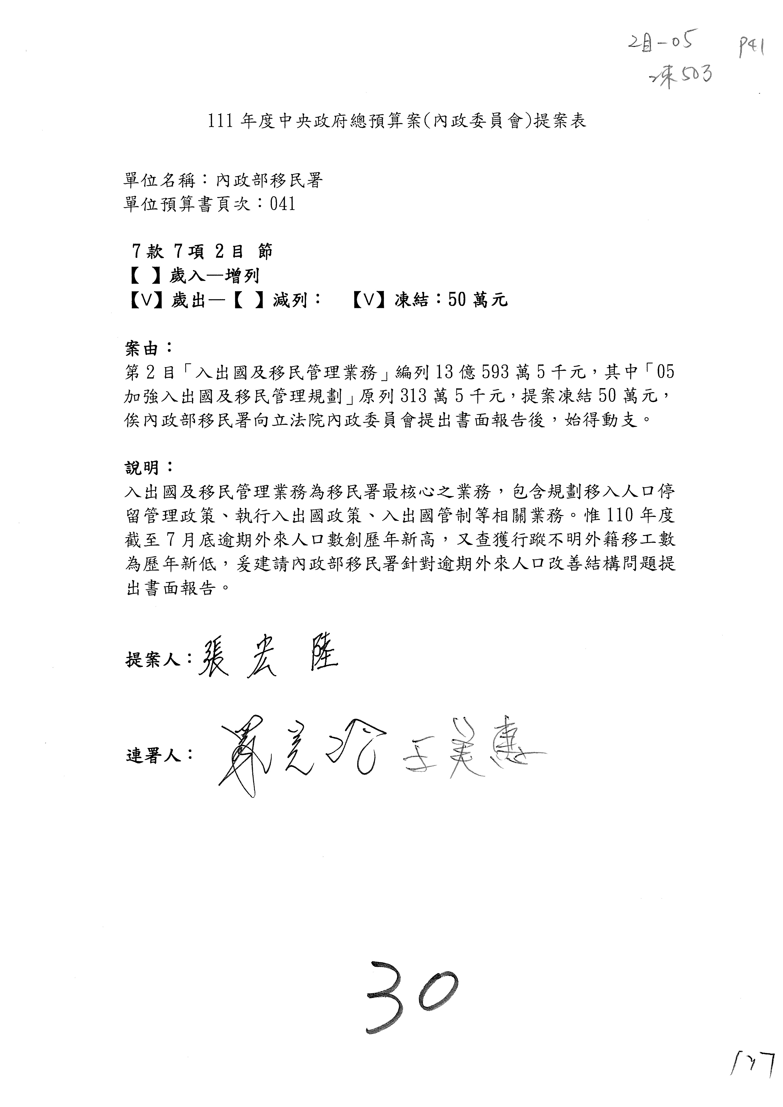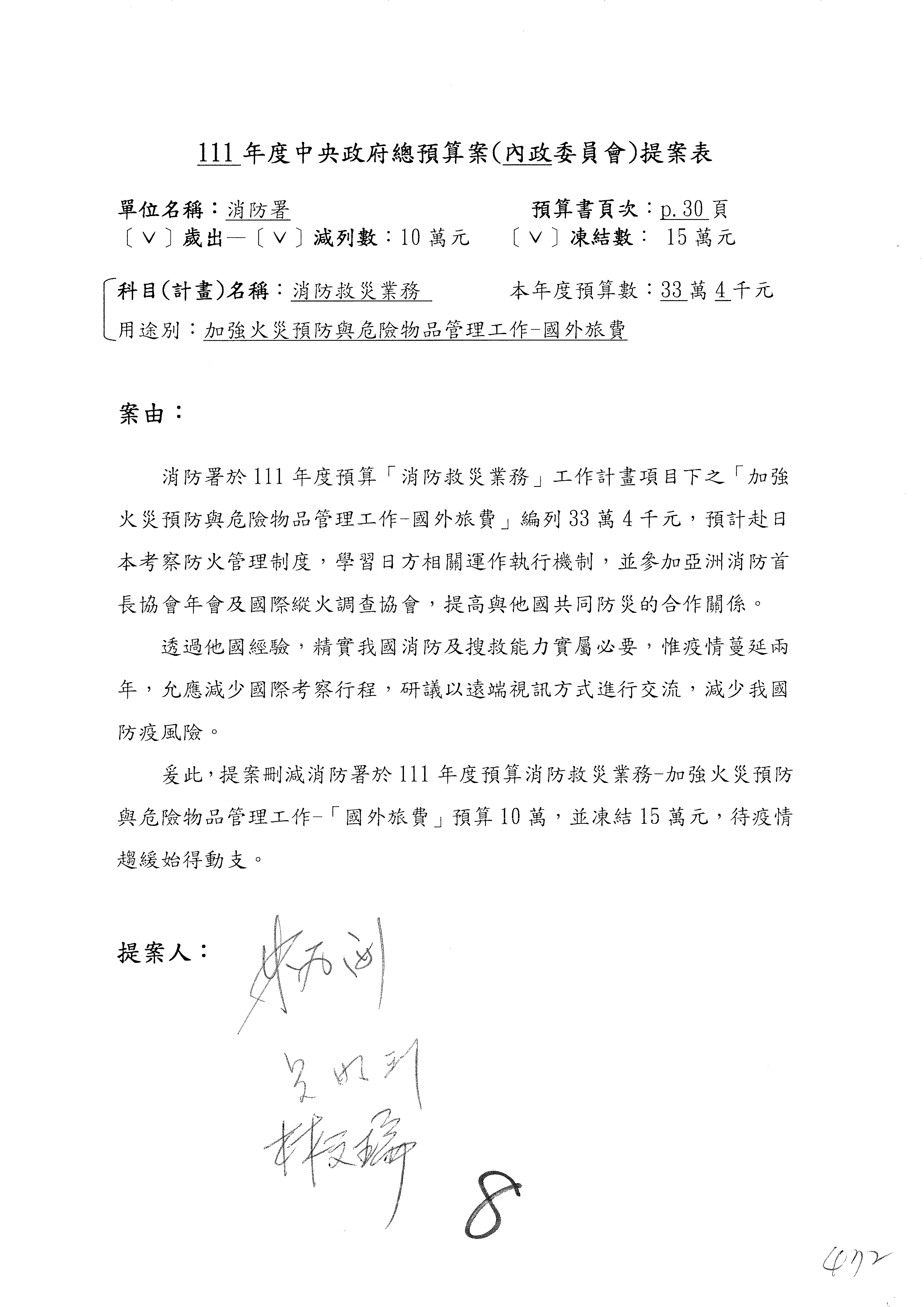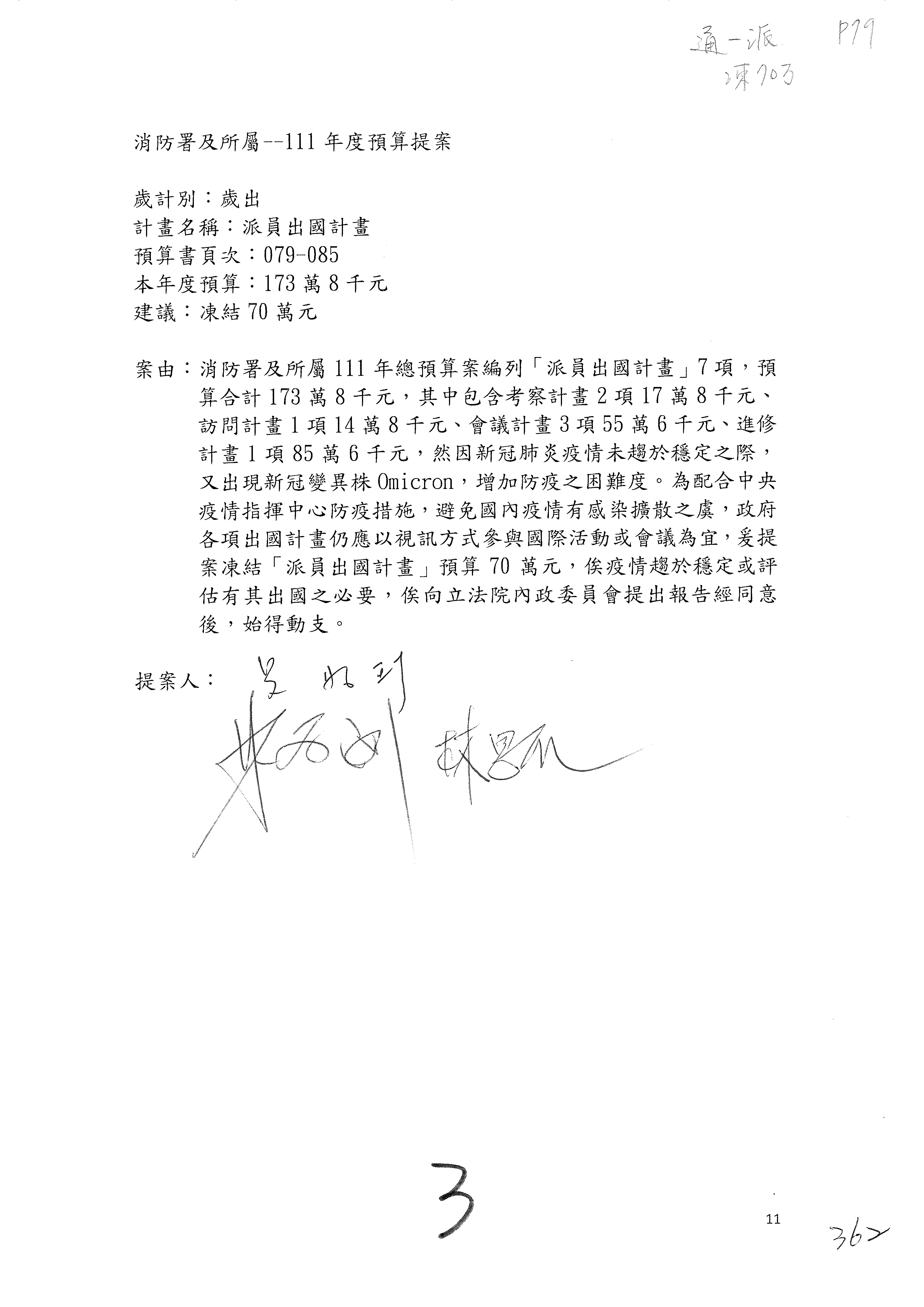 通案部分同樣是針對派員出國計畫及國外旅費的部分,第1案撤案。有關凍結的部分,相關預算總金額為30萬元,到底用不用得到都同樣有這個問題,我建議凍結5萬元、提書面報告。