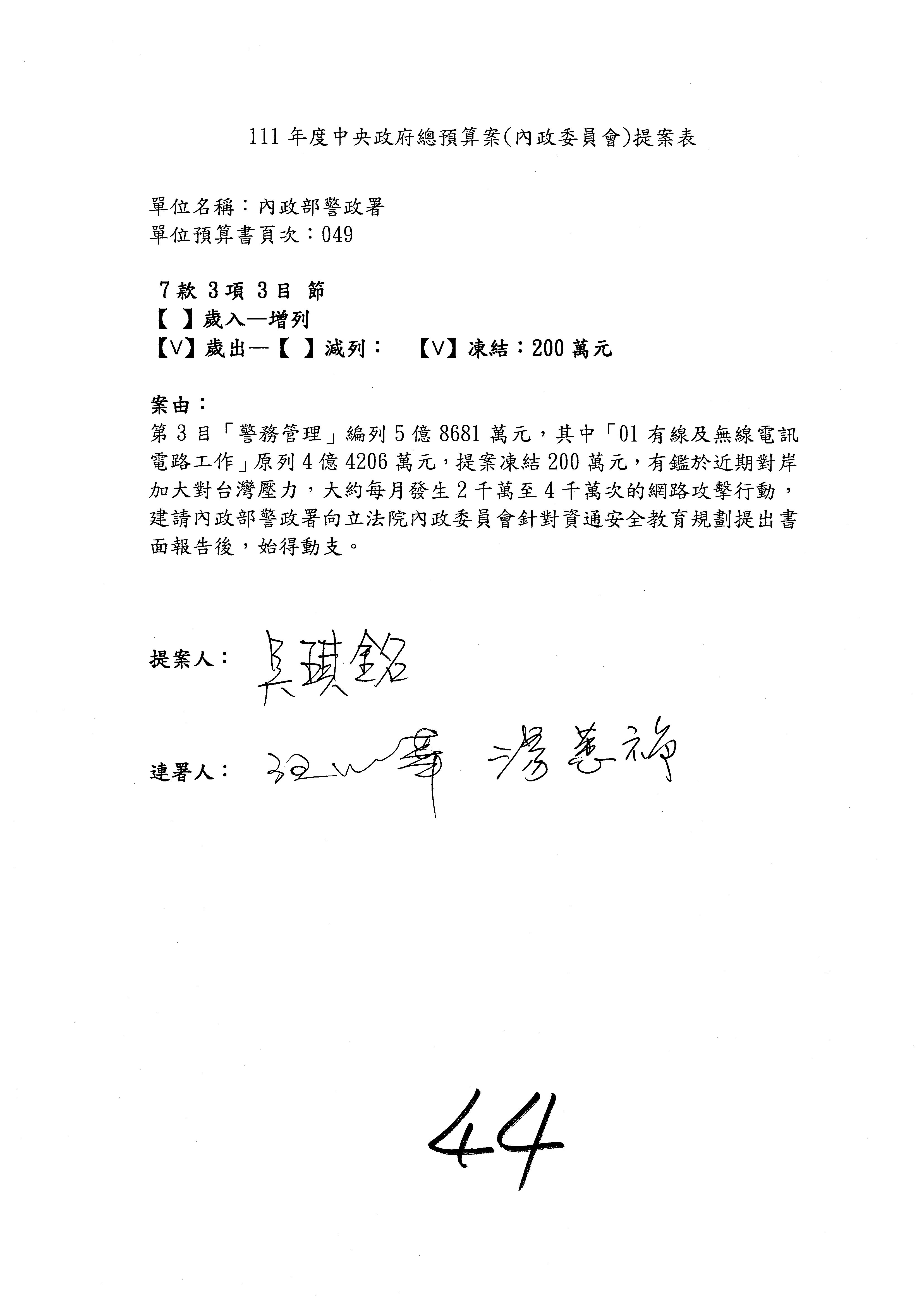 湯委員蕙禎:那麼這部分就同樣凍結200萬元。
