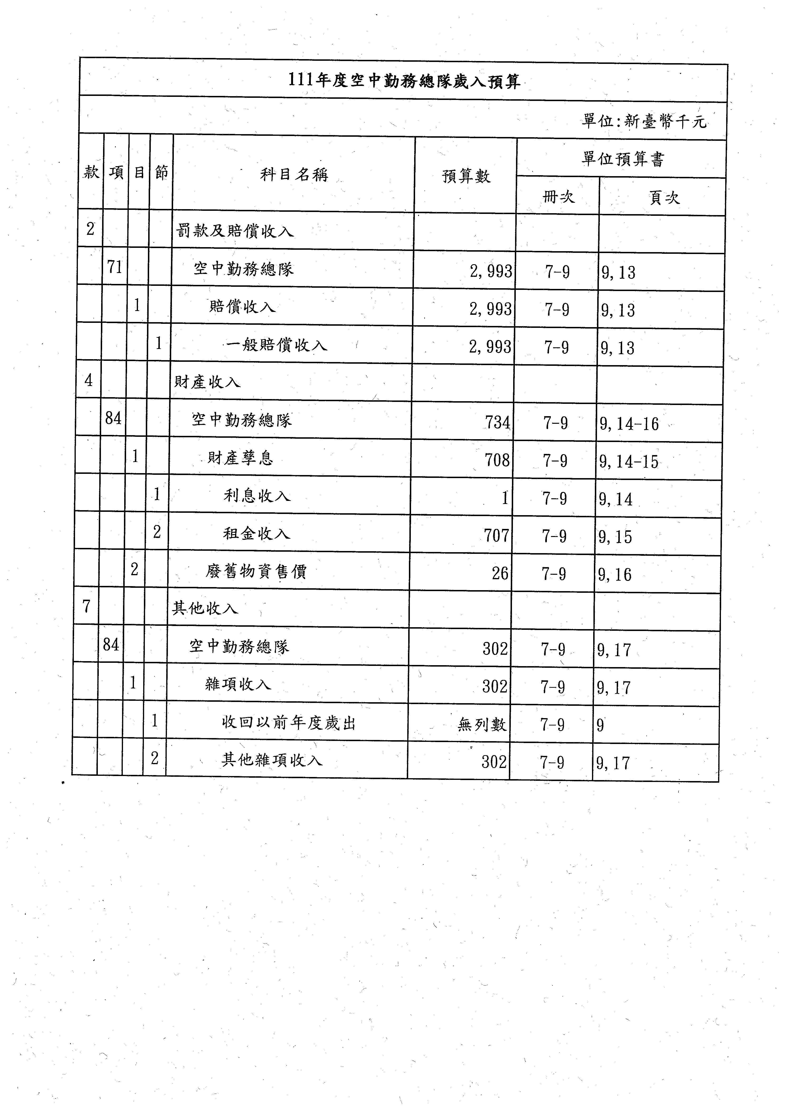 關於空中勤務總隊單位預算,歲入部分委員無相關提案,預算照列。