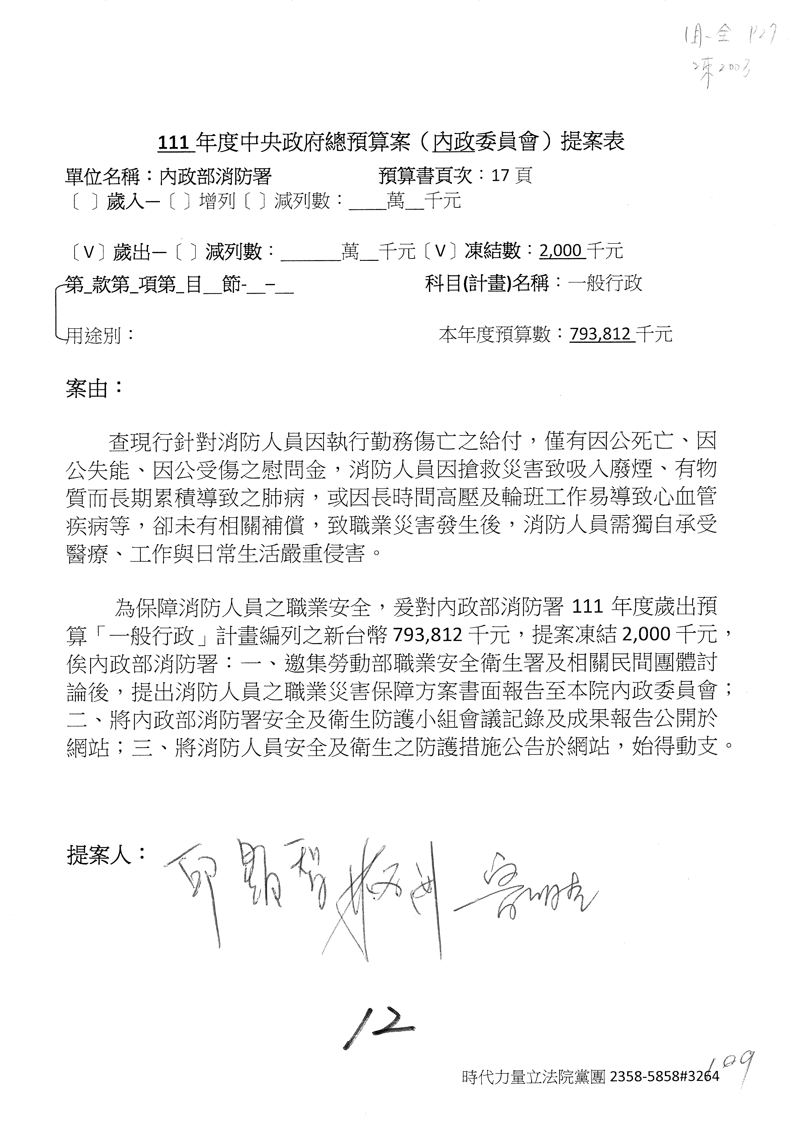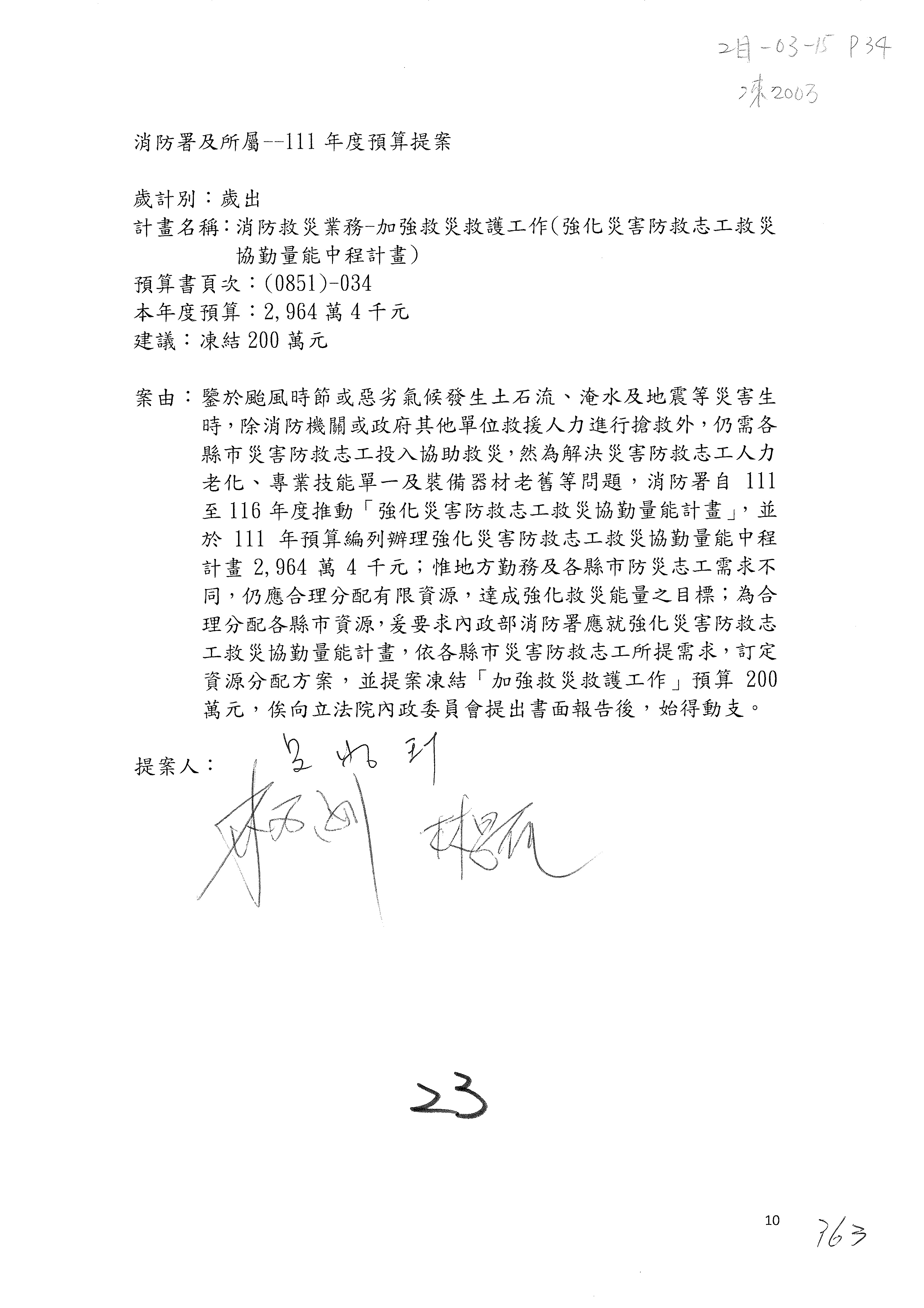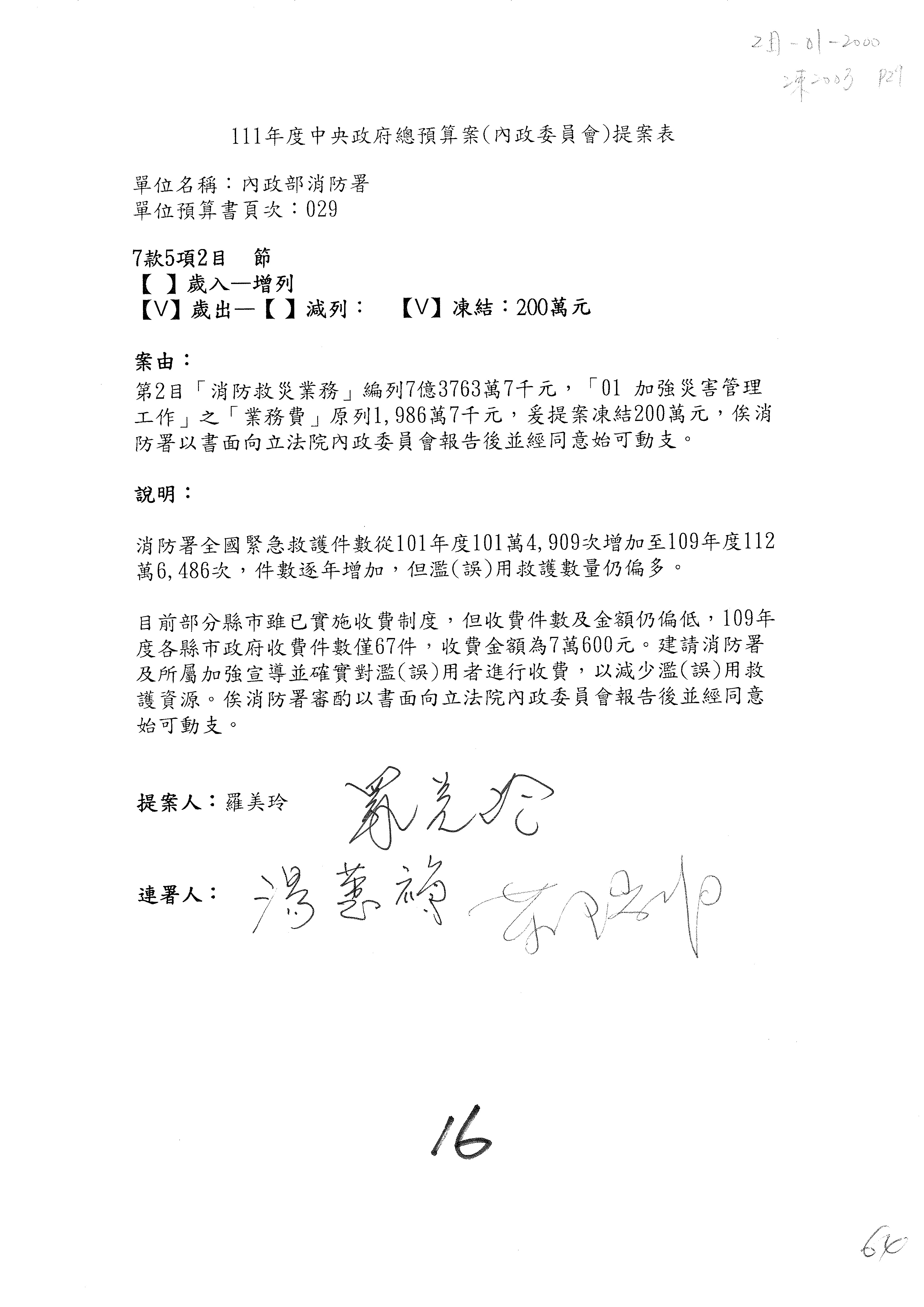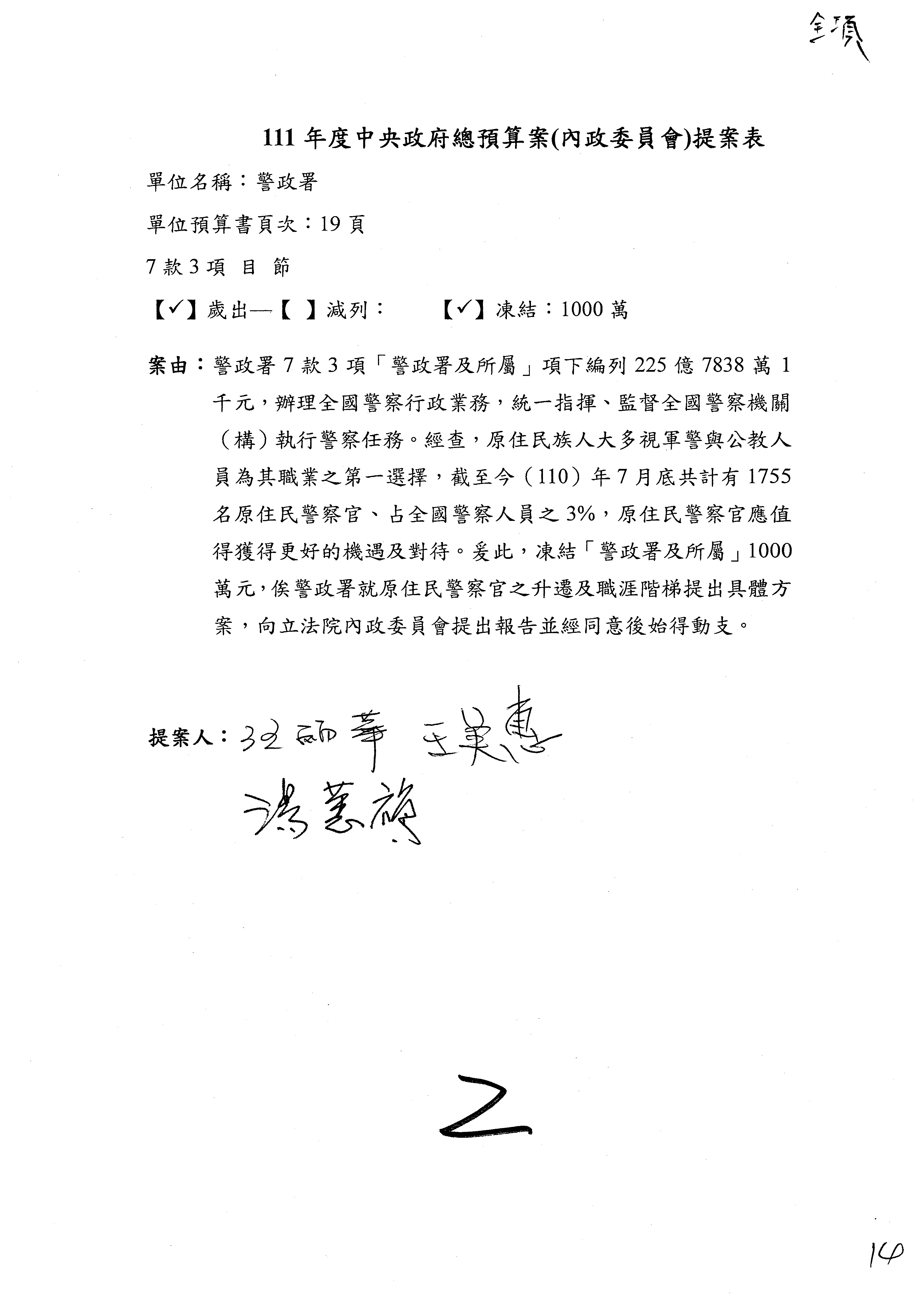主席:第2目的部分,凍結200萬元,但是個別委員提出來的問題還是要個別書面報告。