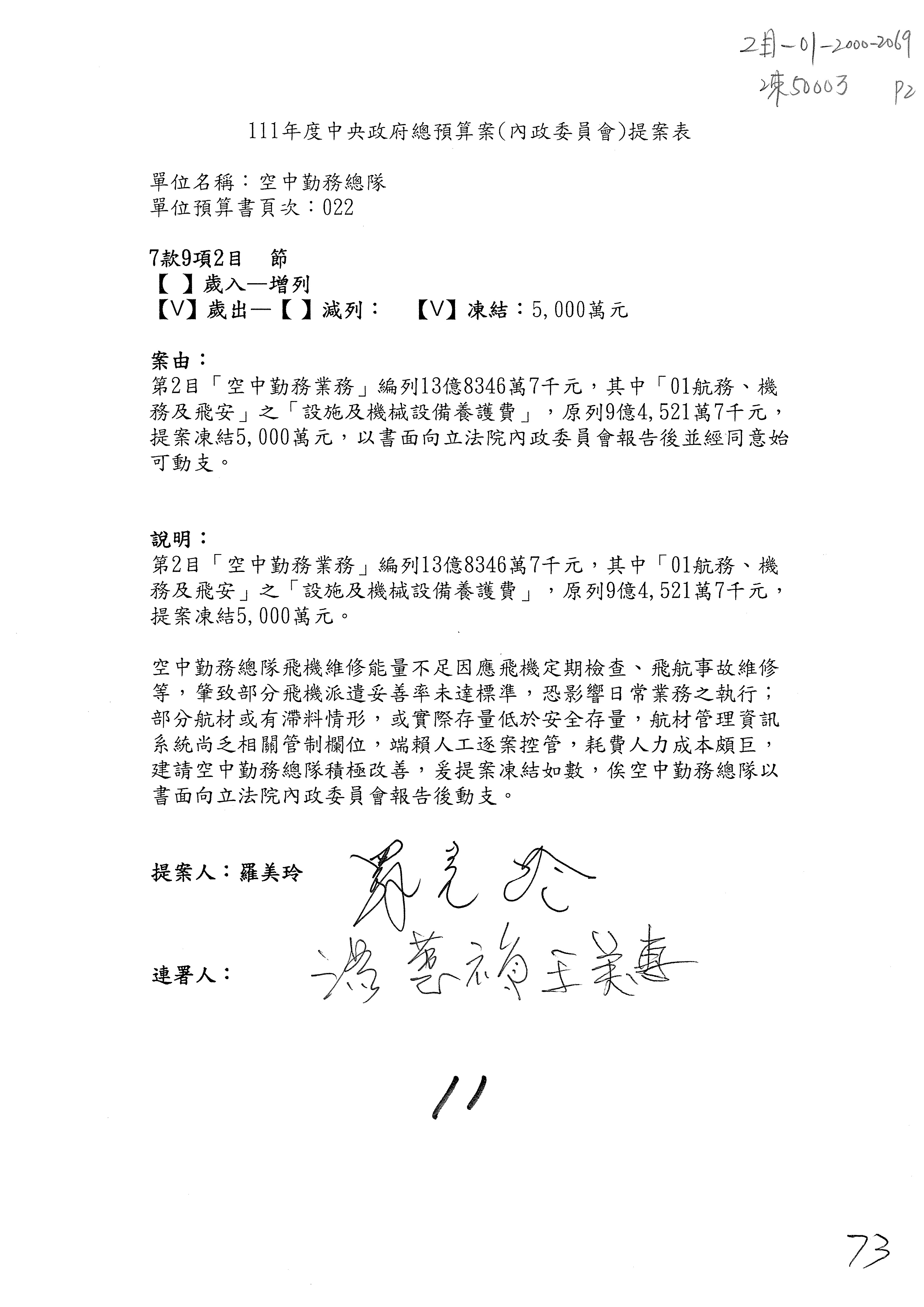 第2目「空中勤務業務」:第13案撤案;其餘第6案至第15案,除第13案外,合併處理,凍結200萬元,書面報告。