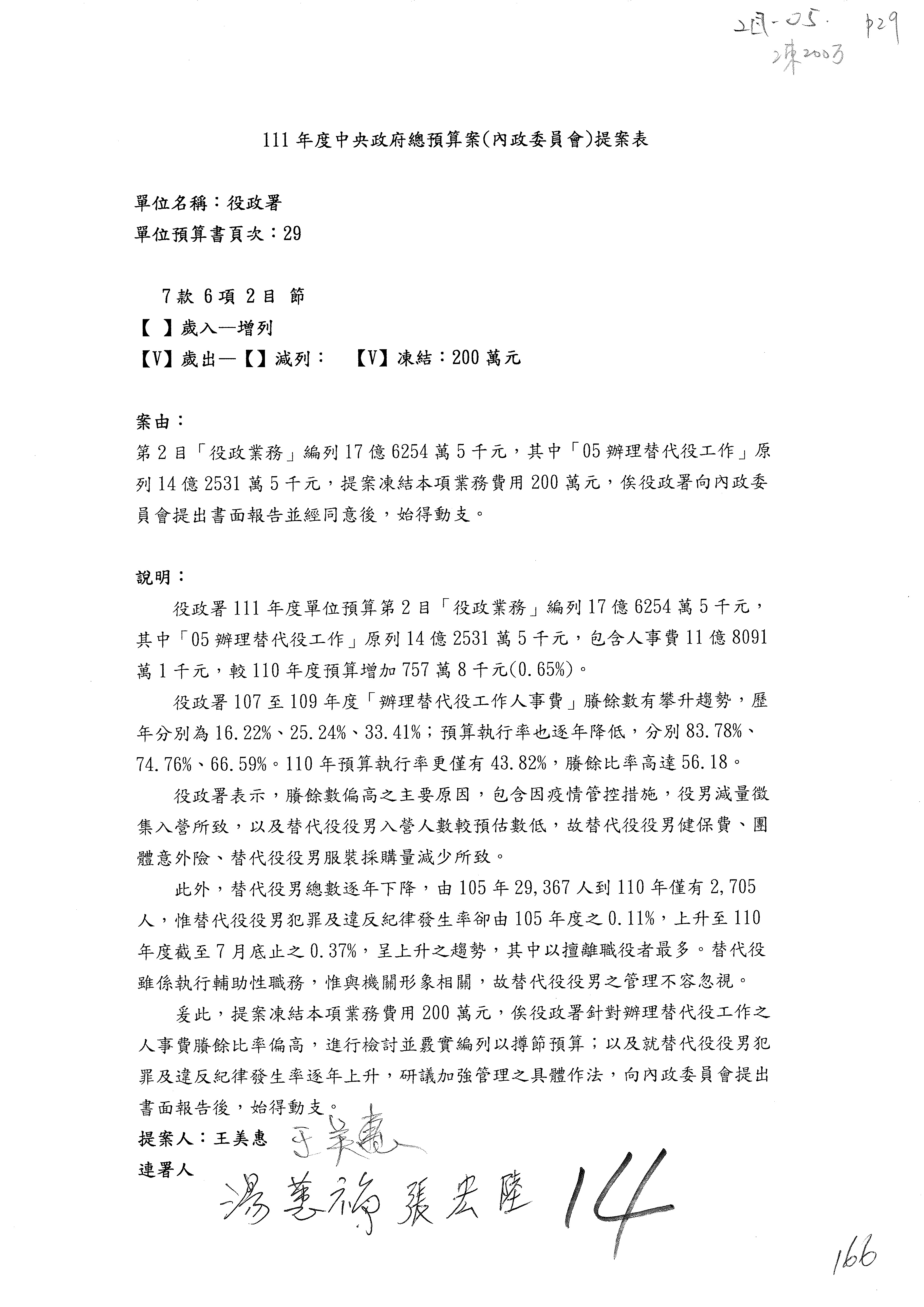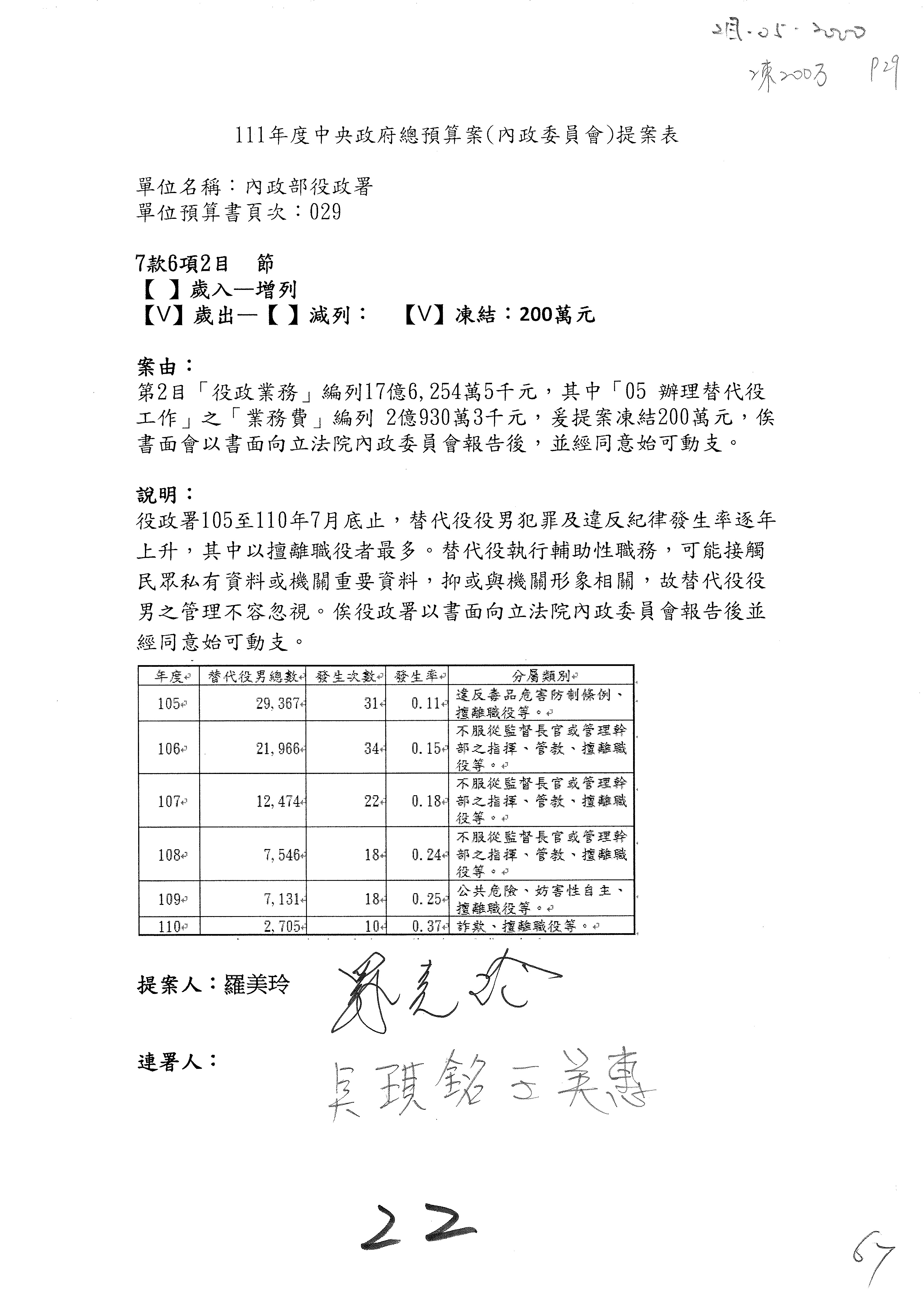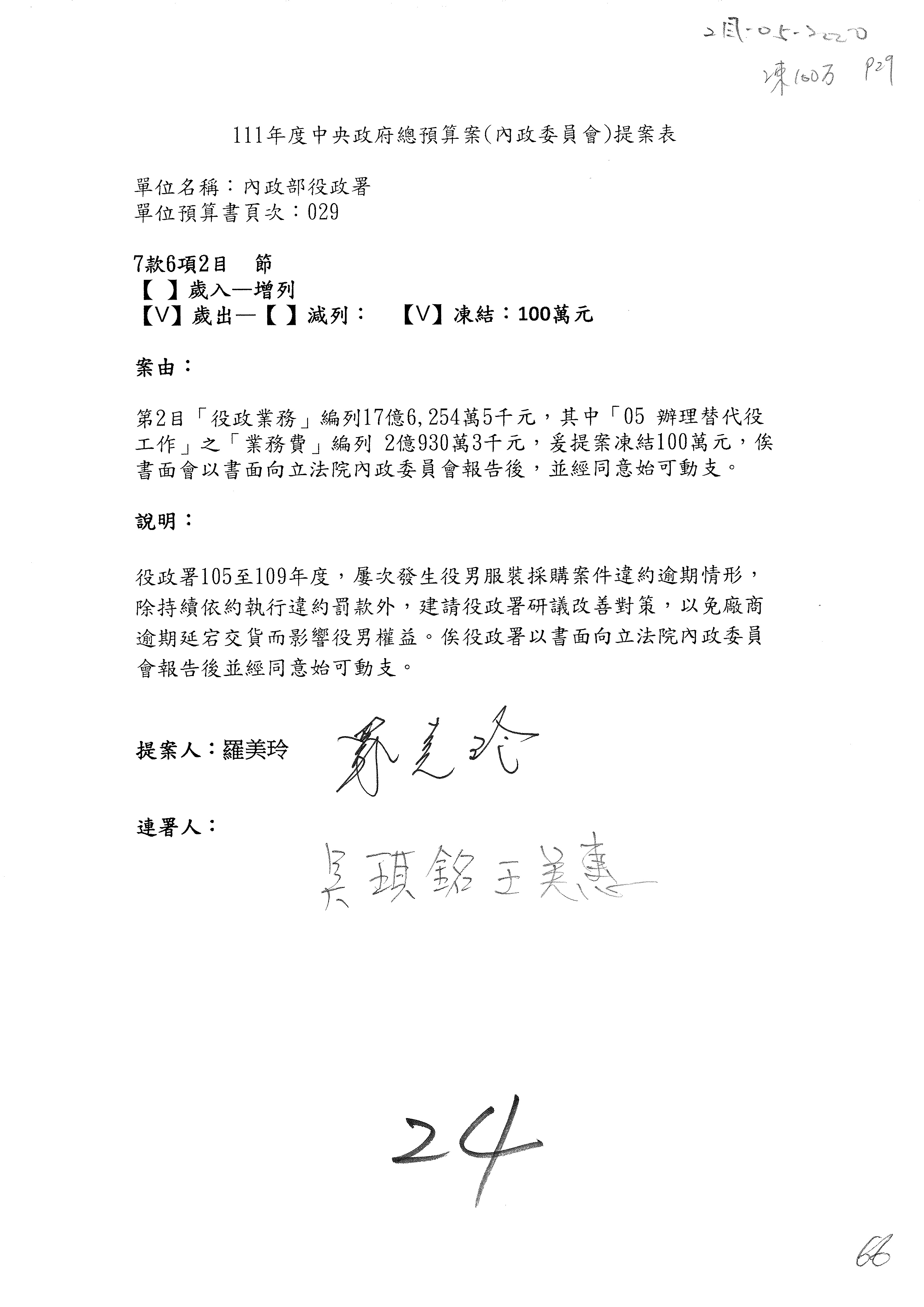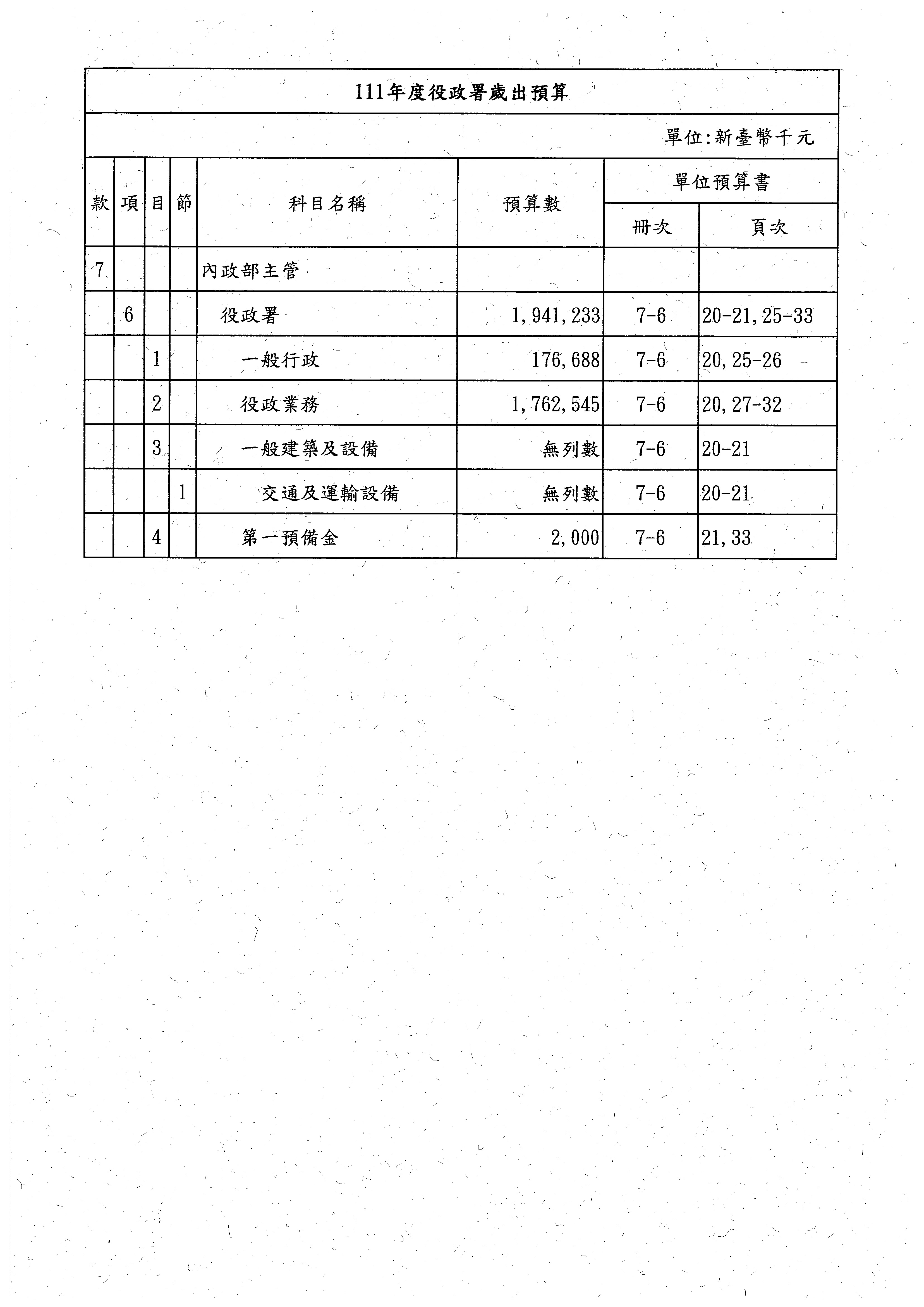 第2目「役政業務」:第8案、第9案、第10案、第11案合併處理,凍結5%、書面報告;第12案至第15案合併處理,凍結200萬元、書面報告;第16案撤案;第17案、第18案合併處理,凍結10%、書面報告;第19案撤案;第20案至第23案合併處理,凍結200萬元、書面報告;第24案凍結100萬元、書面報告;第25案凍結20萬元、書面報告。