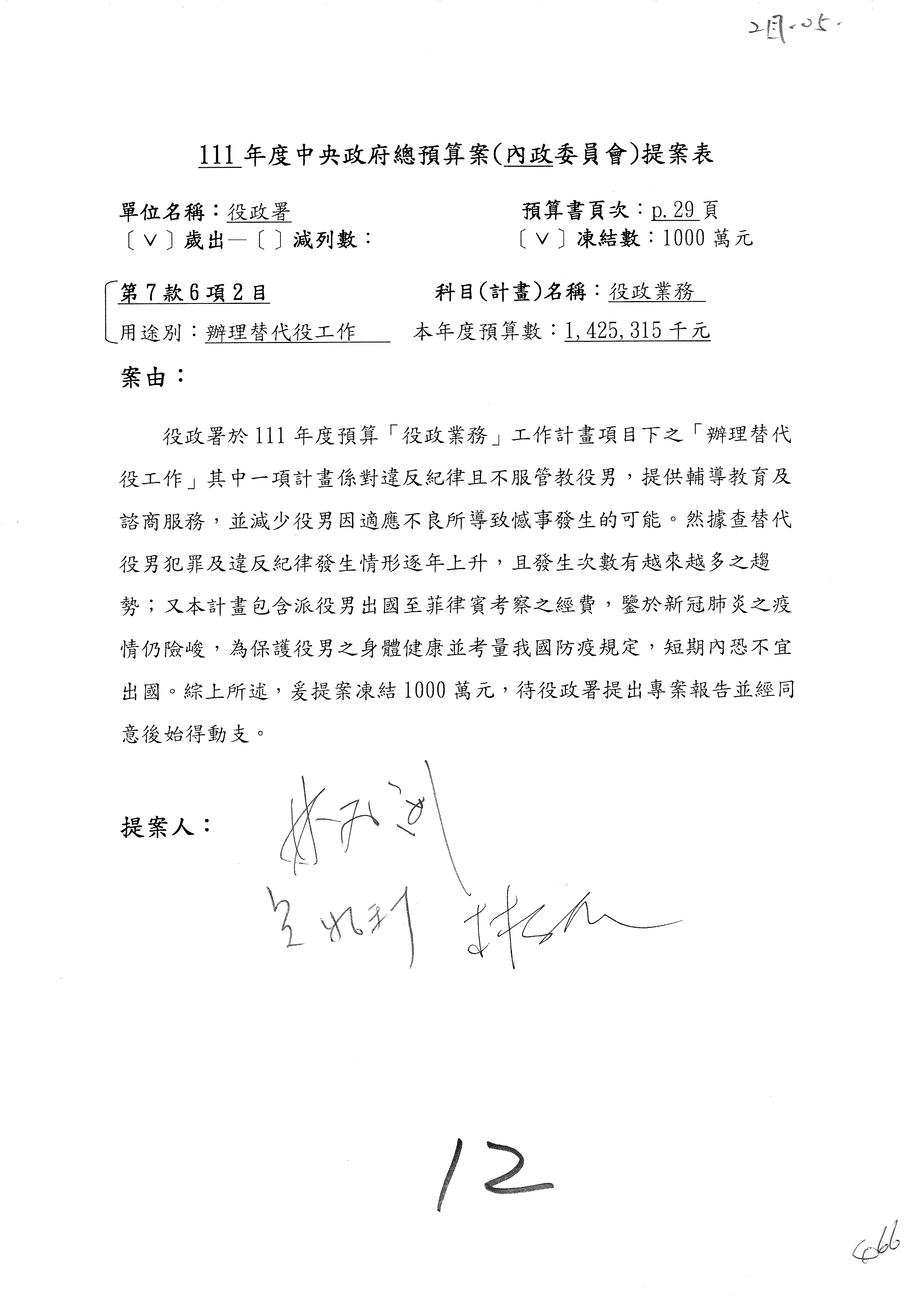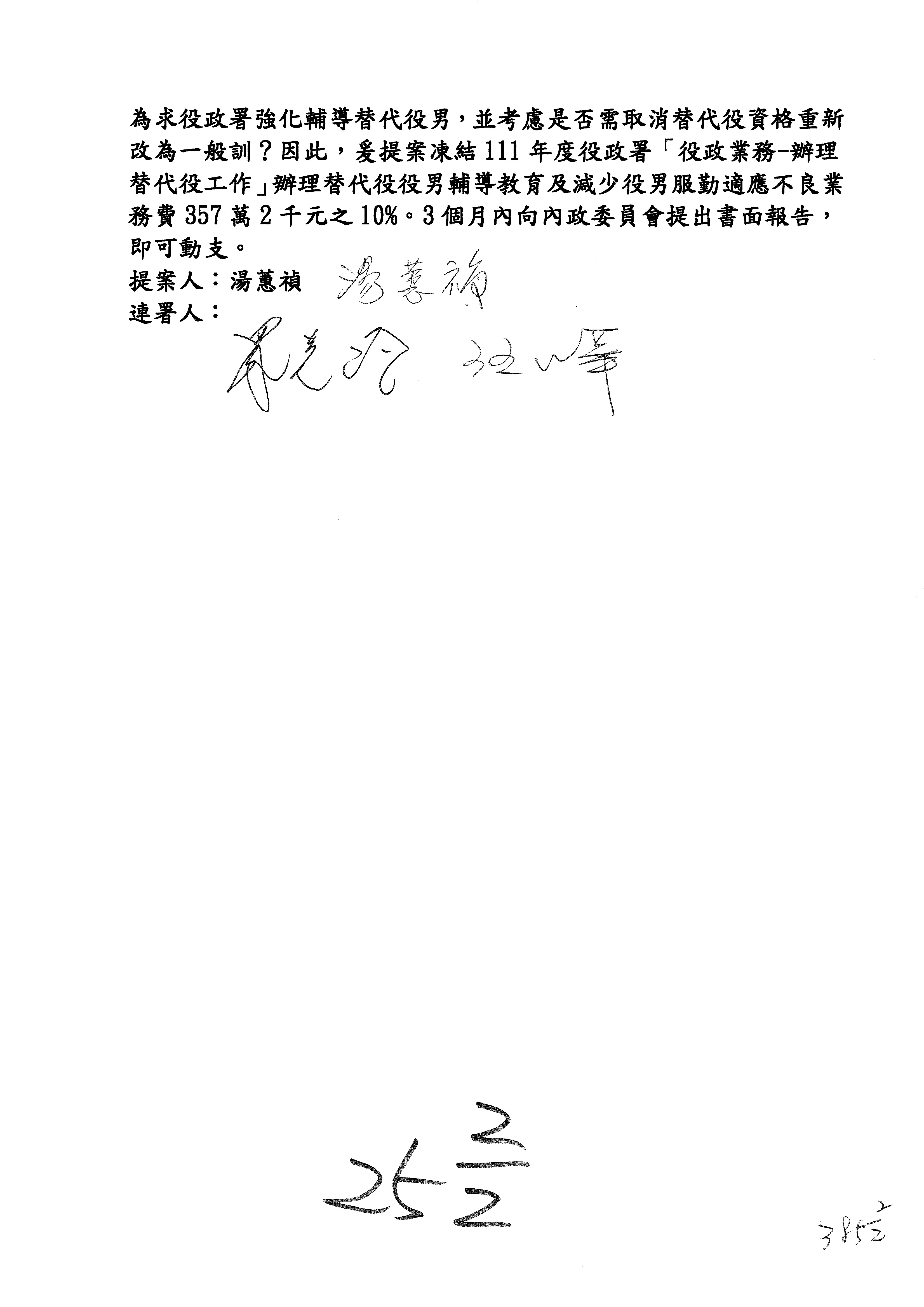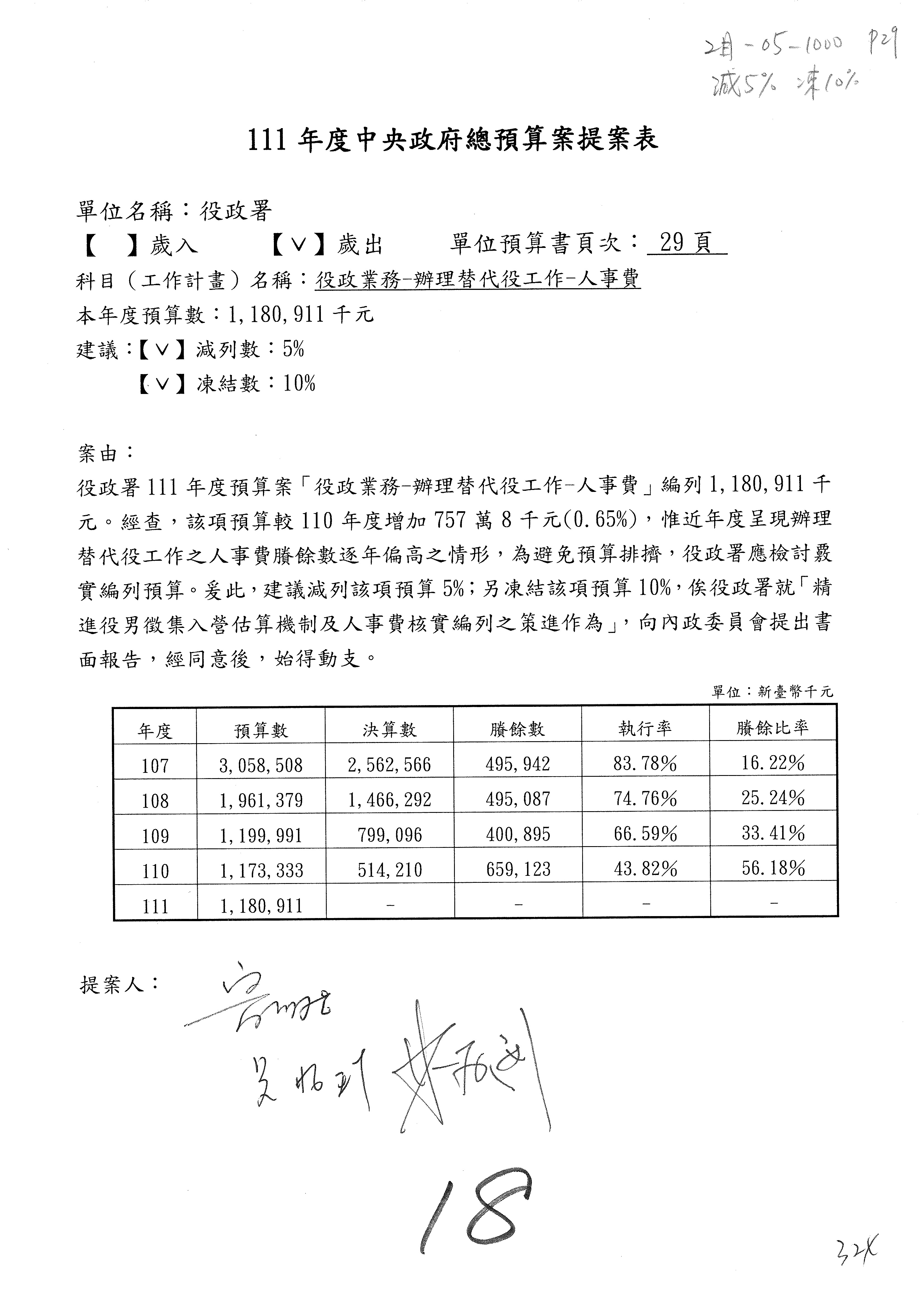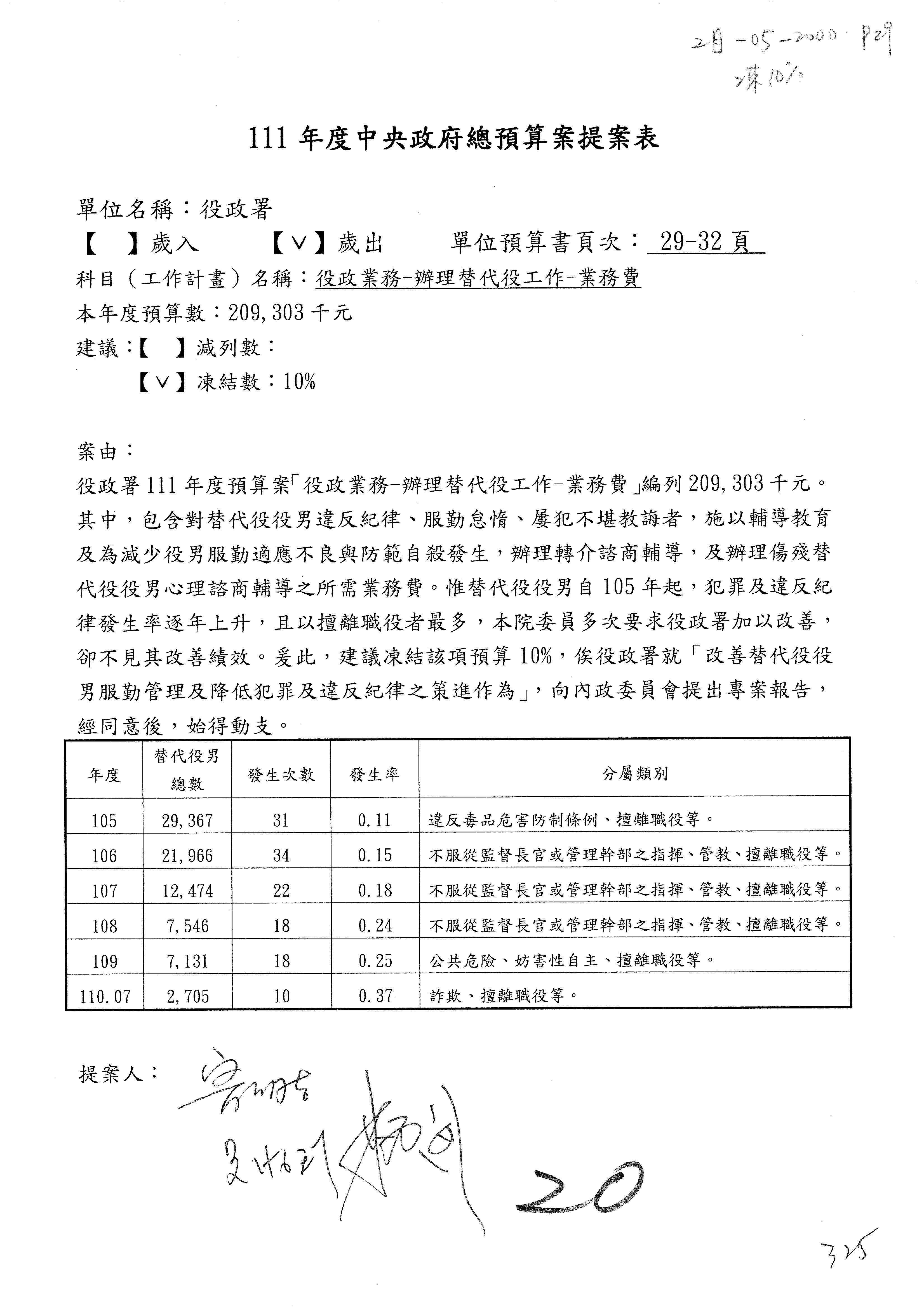 第2目「役政業務」:第8案、第9案、第10案、第11案合併處理,凍結5%、書面報告;第12案至第15案合併處理,凍結200萬元、書面報告;第16案撤案;第17案、第18案合併處理,凍結10%、書面報告;第19案撤案;第20案至第23案合併處理,凍結200萬元、書面報告;第24案凍結100萬元、書面報告;第25案凍結20萬元、書面報告。