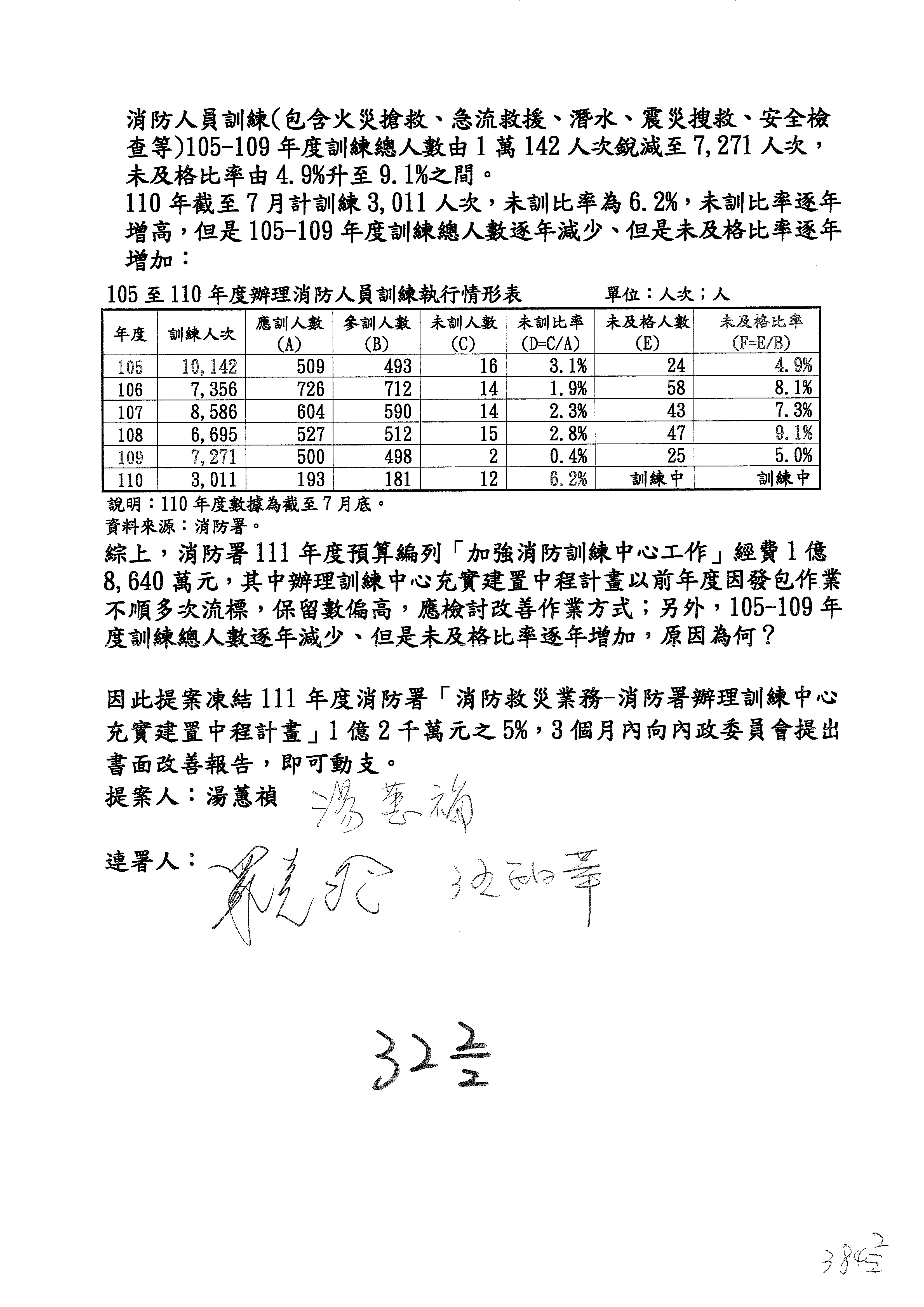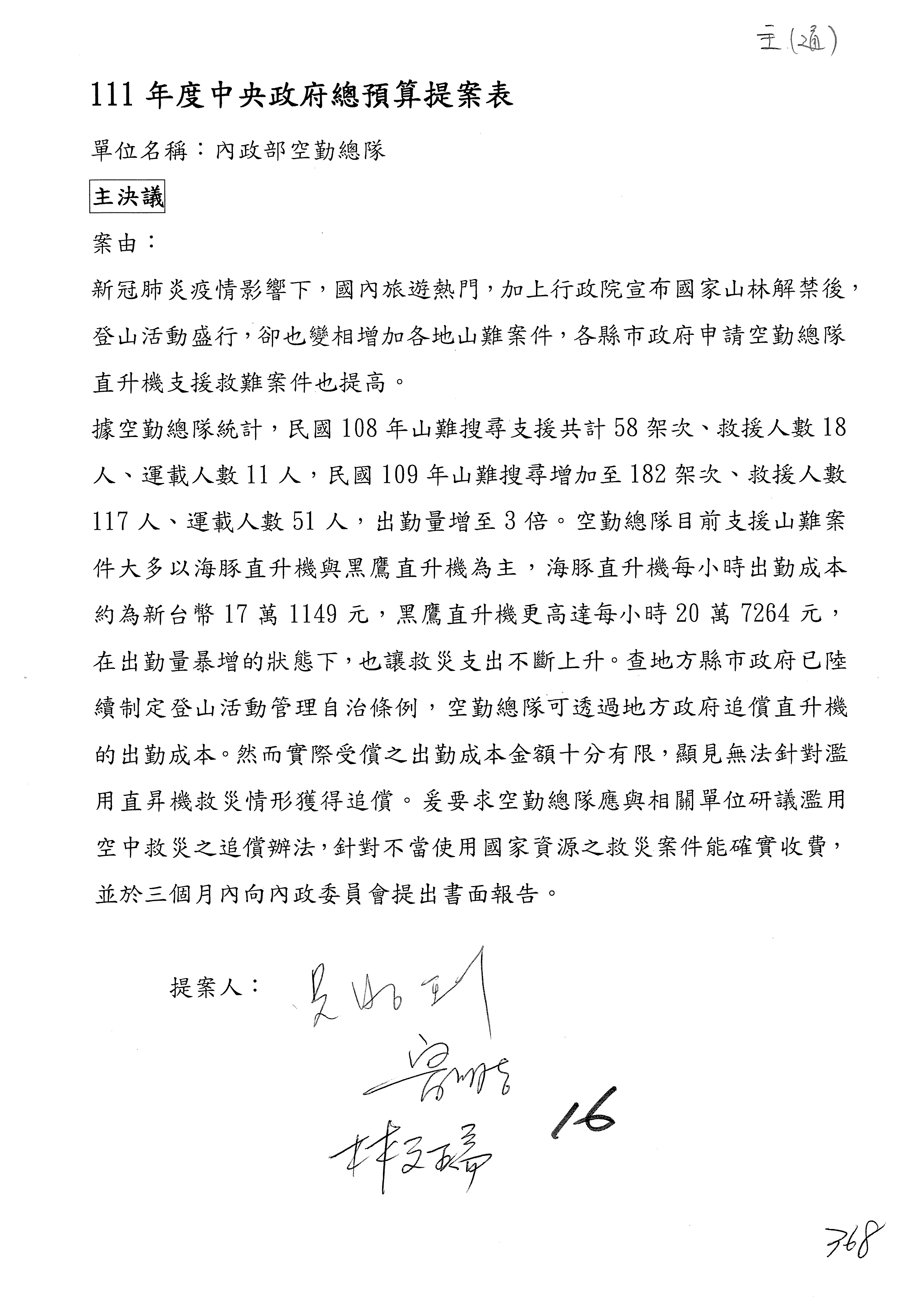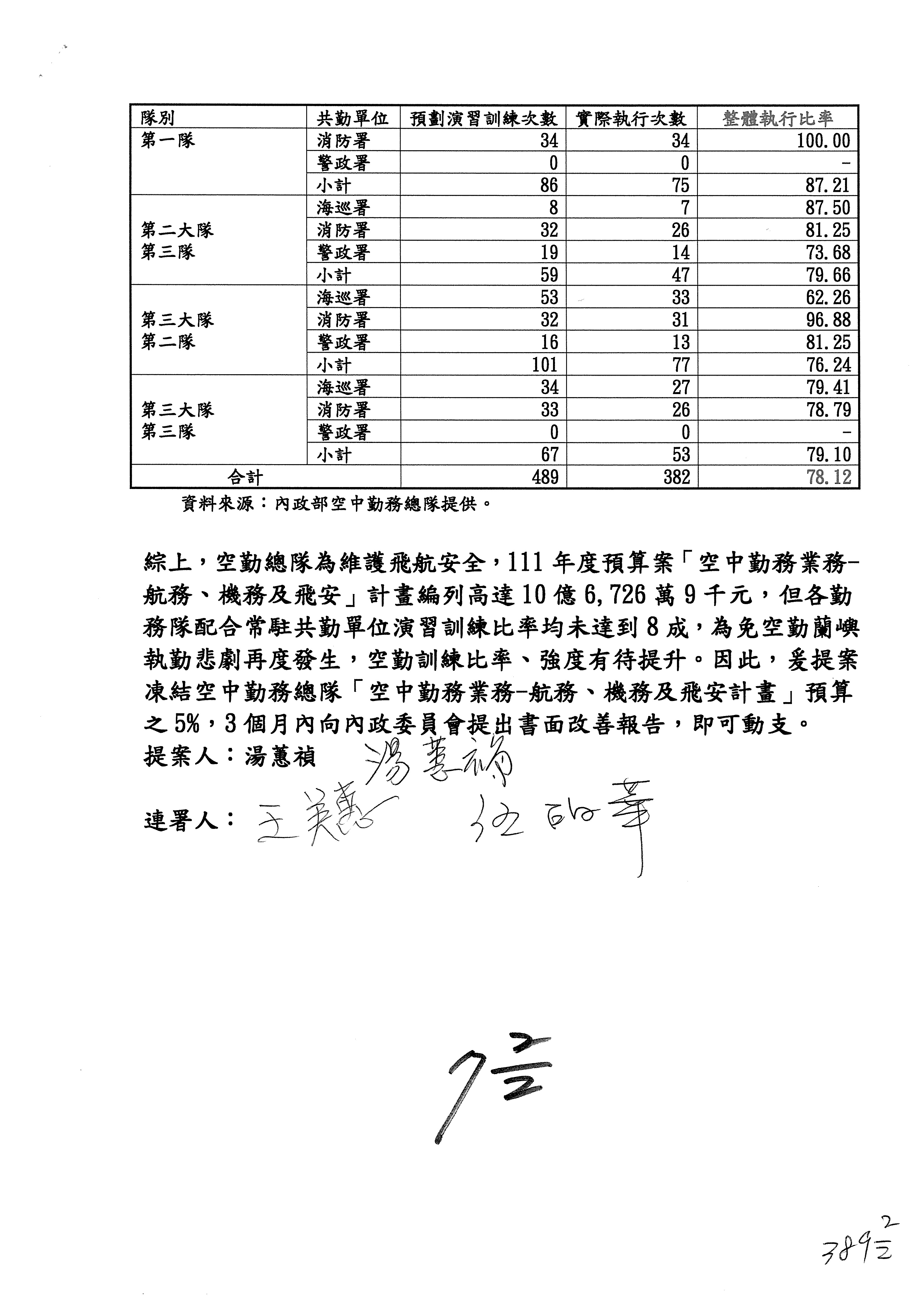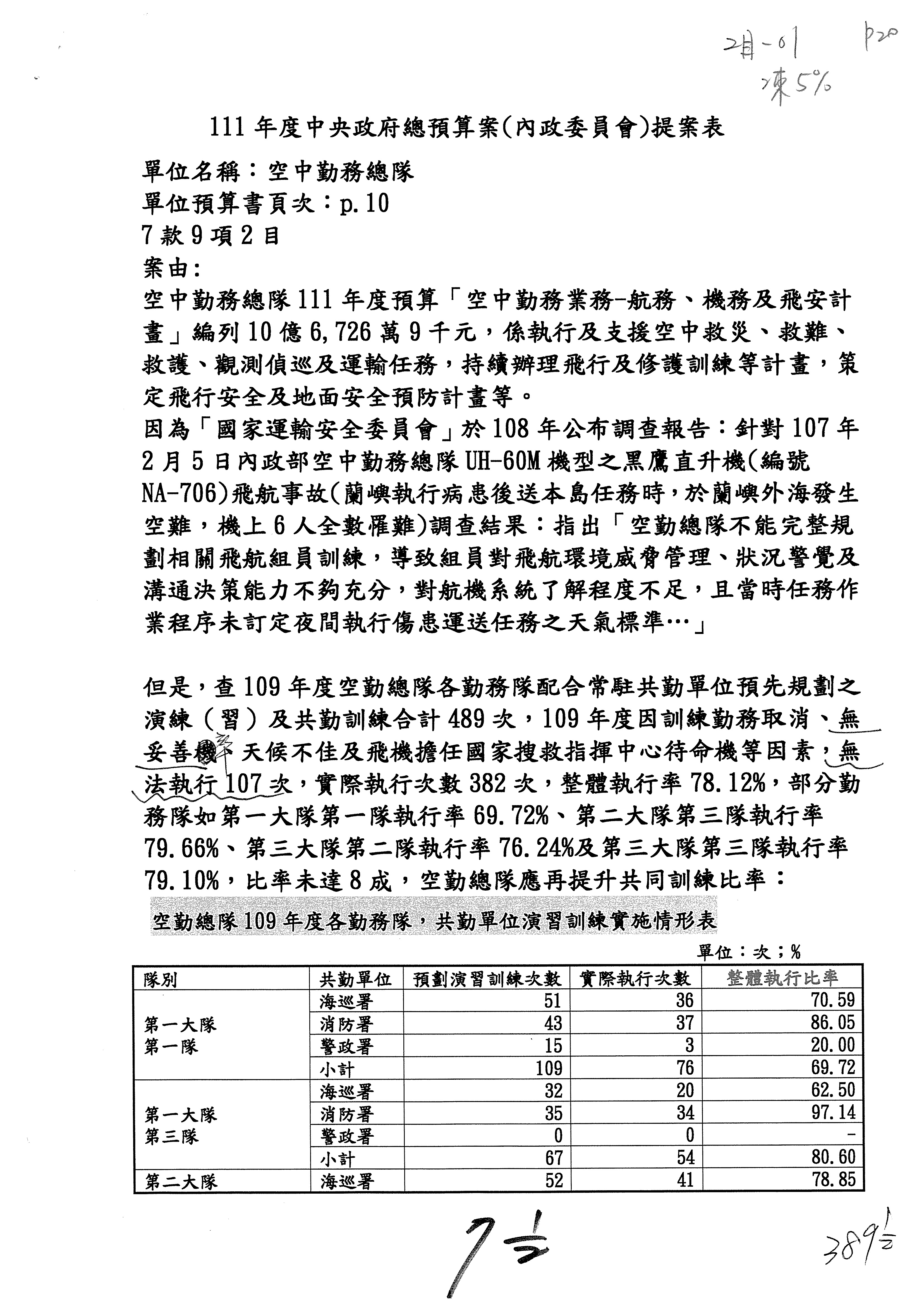 魯委員明哲:針對本席所提的第6案,因為你們都是在執行救災任務,其實非常辛苦,在此也要感謝你們的付出,尤其有些區塊執行時非常困難,也要靠你們去救災救難。不過本席發現空勤總隊與各勤務隊配合常駐協力單位之共同演訓比率不到八成,也就是說,現在雖然有個別訓練,但是共同處理救災事務的共訓比率卻不到八成,我認為這部分應該要更積極參與才對。你們初步提供的理由是你們忙著救災,加上有時天候不佳等等,但本席真的要建議一下,因為國家運輸安全調查委員會在107年空勤總隊UH-60M黑鷹直升機飛航事故調查結果當中也有提到訓練不足的問題,所以我希望你們除了自己的訓練之外,針對共訓的部分也能提升。本席的提案是凍結案,至於凍結數就尊重大家的討論。