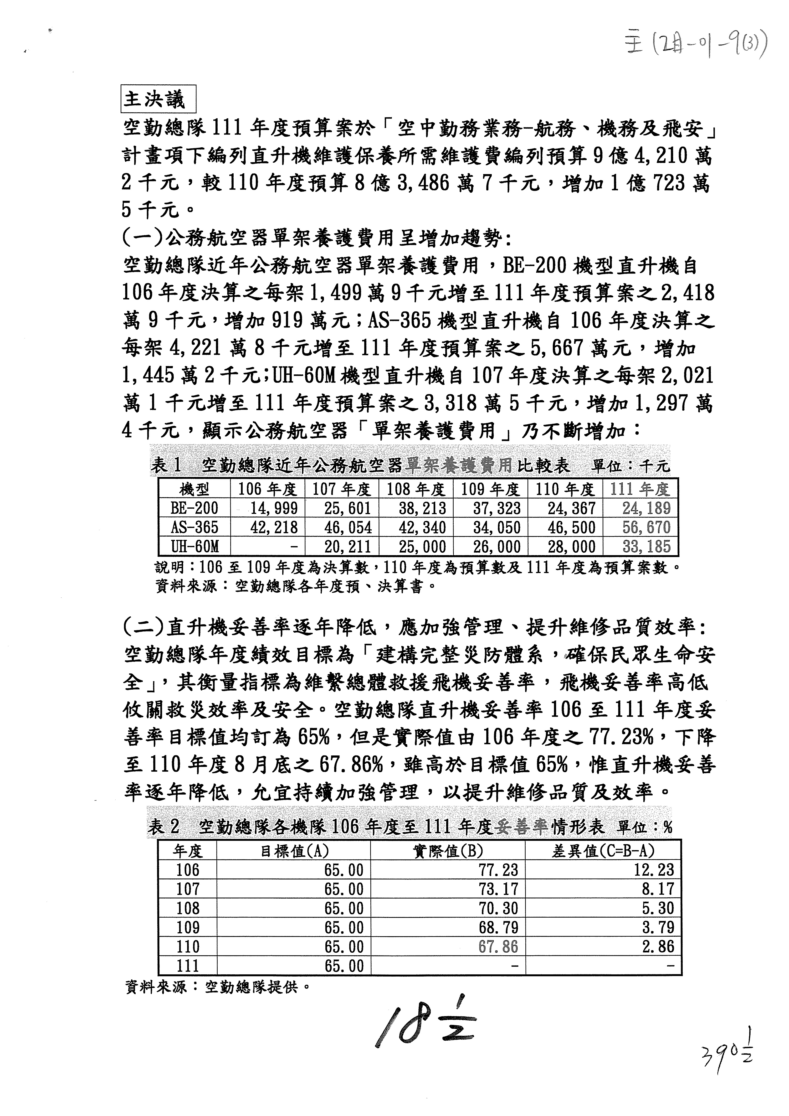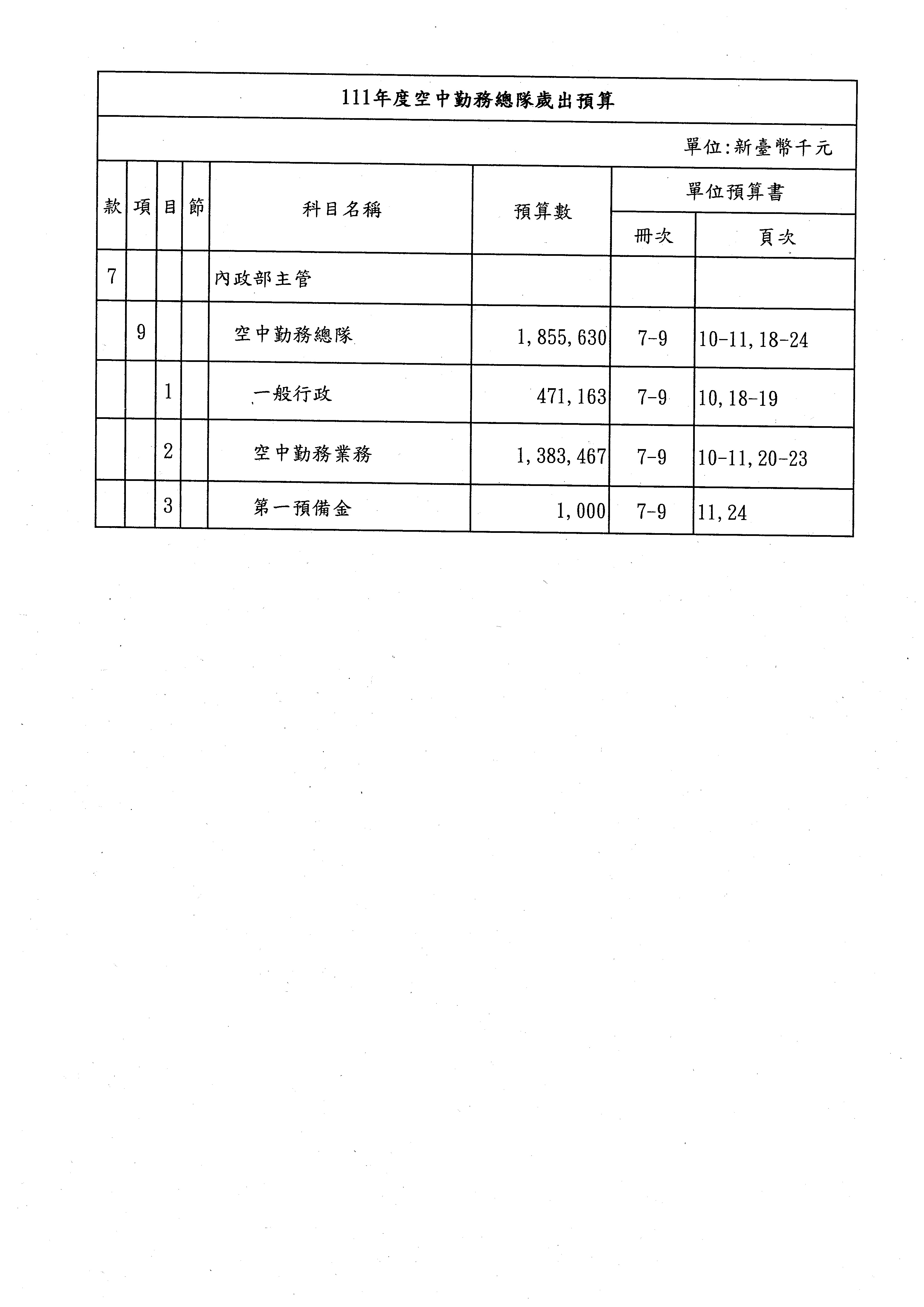 111年度中央政府總預算案空中勤務總隊單位預算部分:
