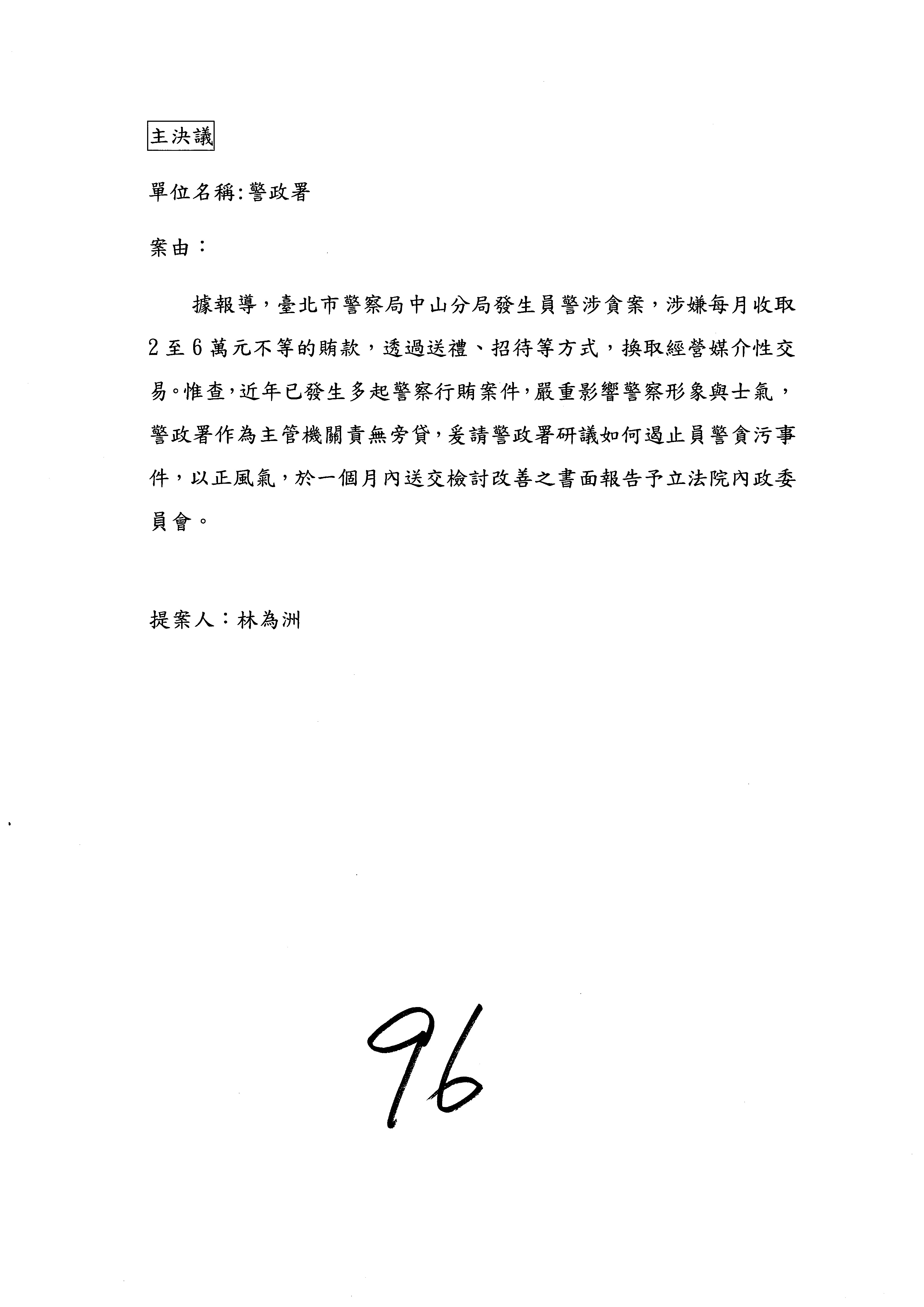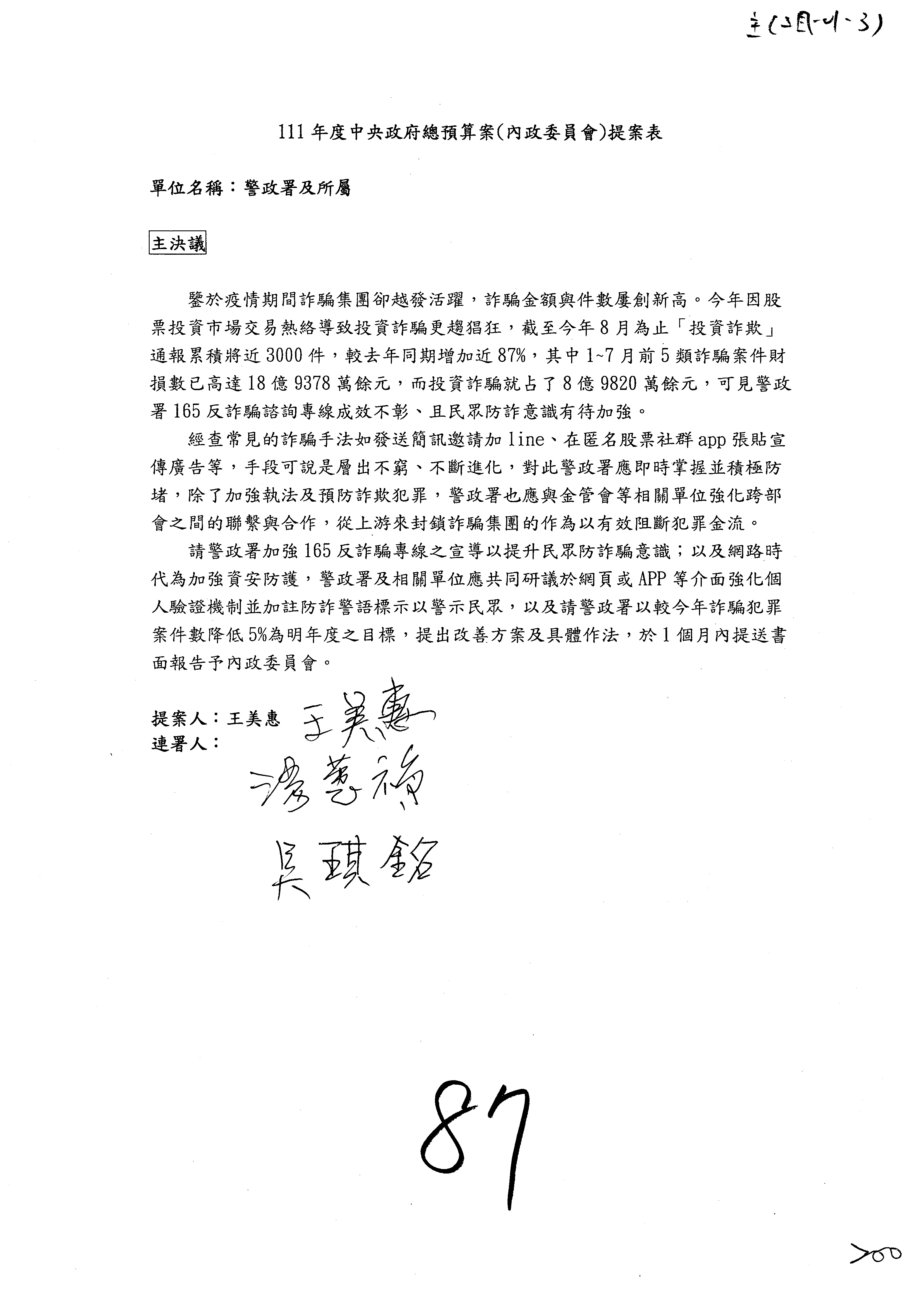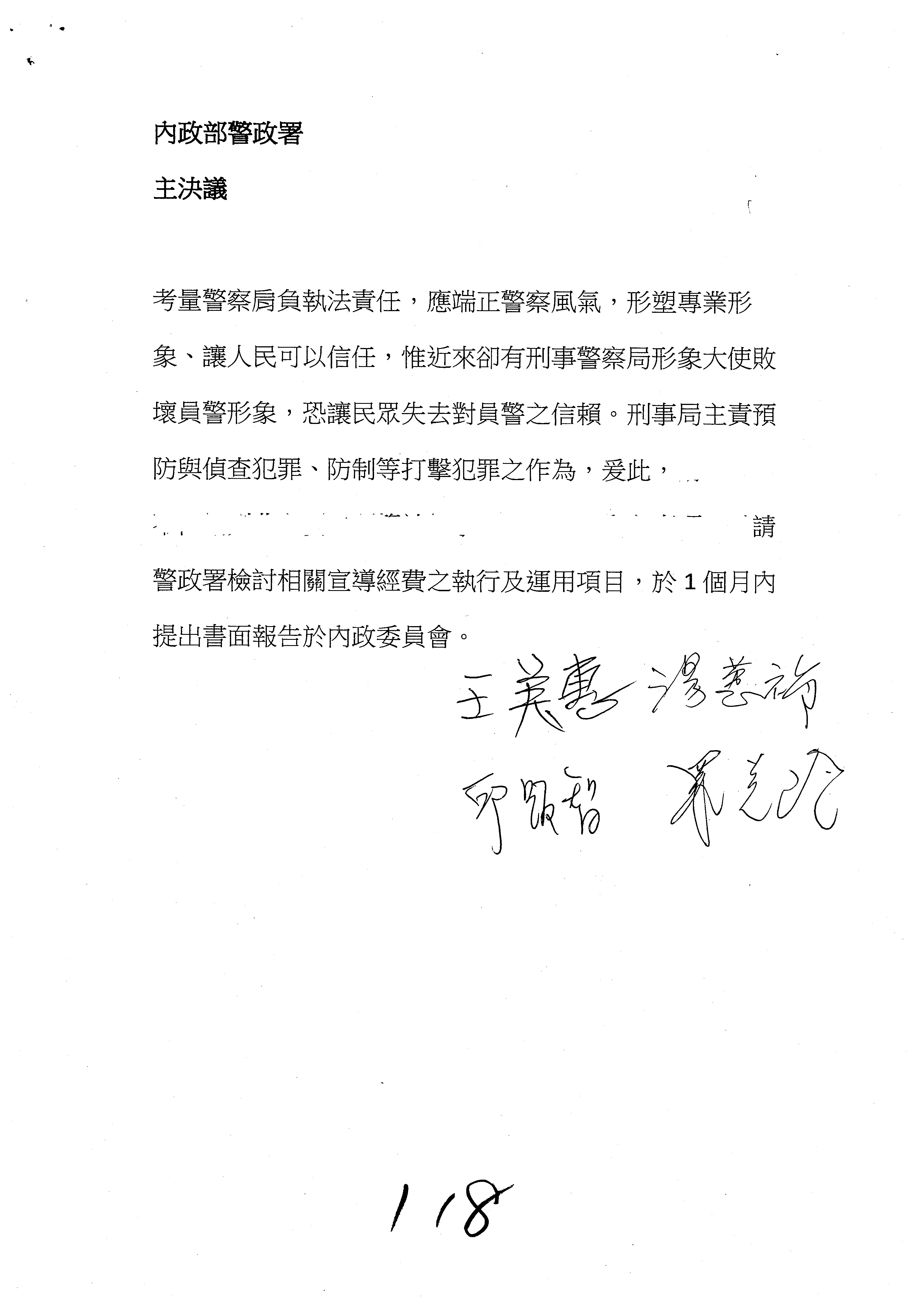 主席:好。這個列入紀錄,請警政署在報告裡面詳細說明,尤其是針對委員提出的質問,一定要實問實答,要針對問題回答,詳細說明。