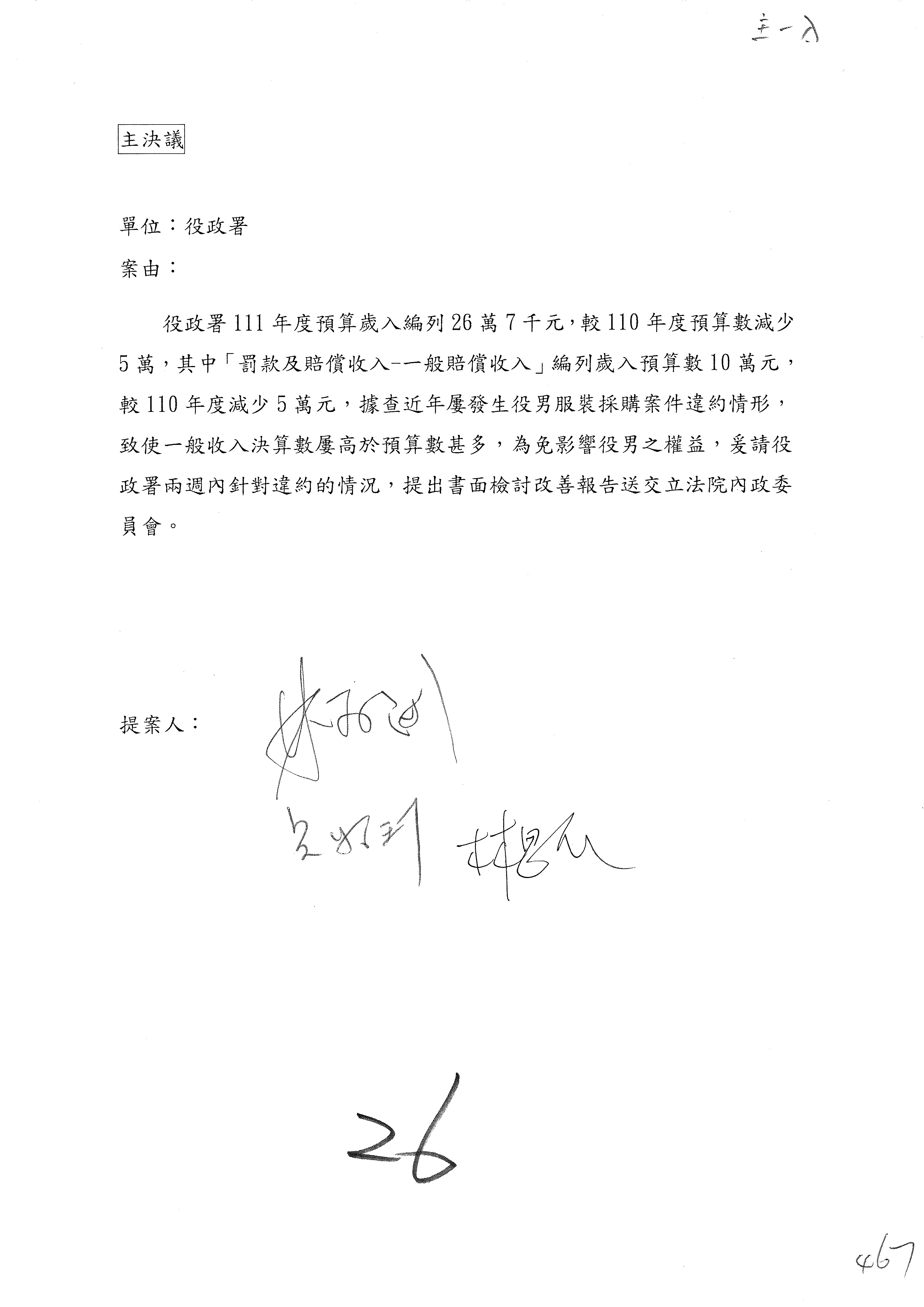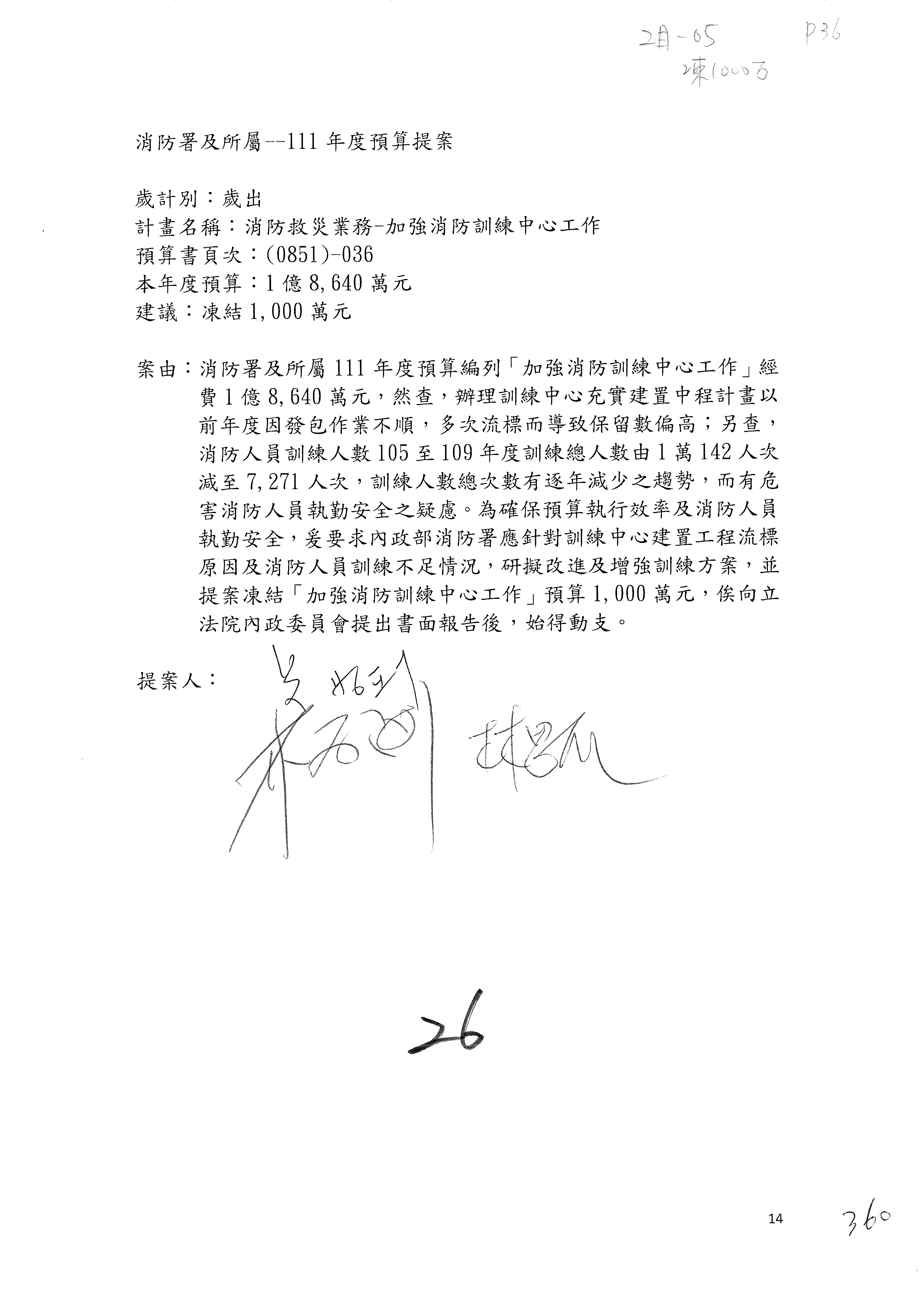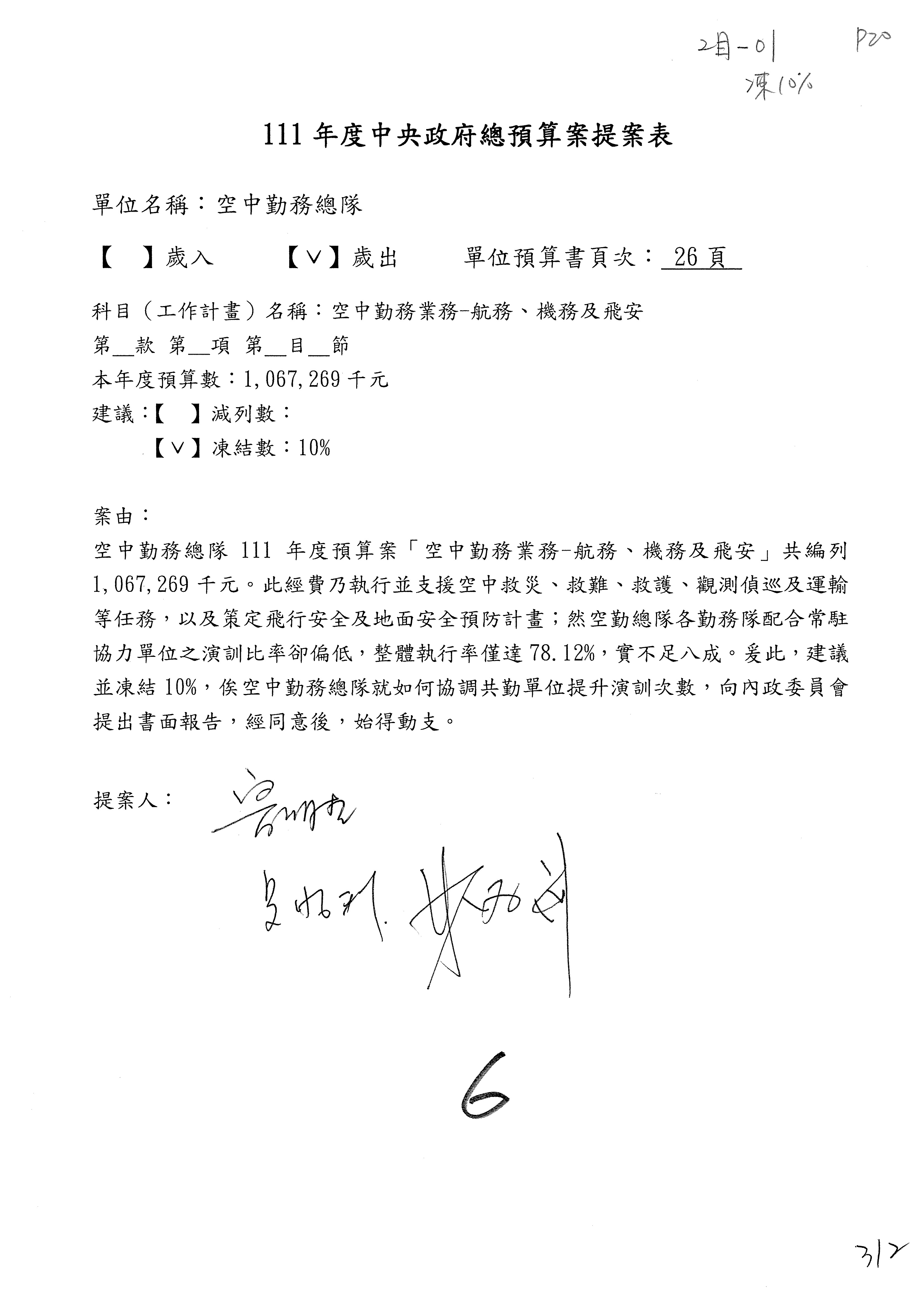 主席:現在講的是第26案,凍結十分之一,那這樣子,因為我要尊重委員的提案,如果要凍少一點的話,看其他委員是不是要幫忙他們講話,我沒有辦法替他們講話。