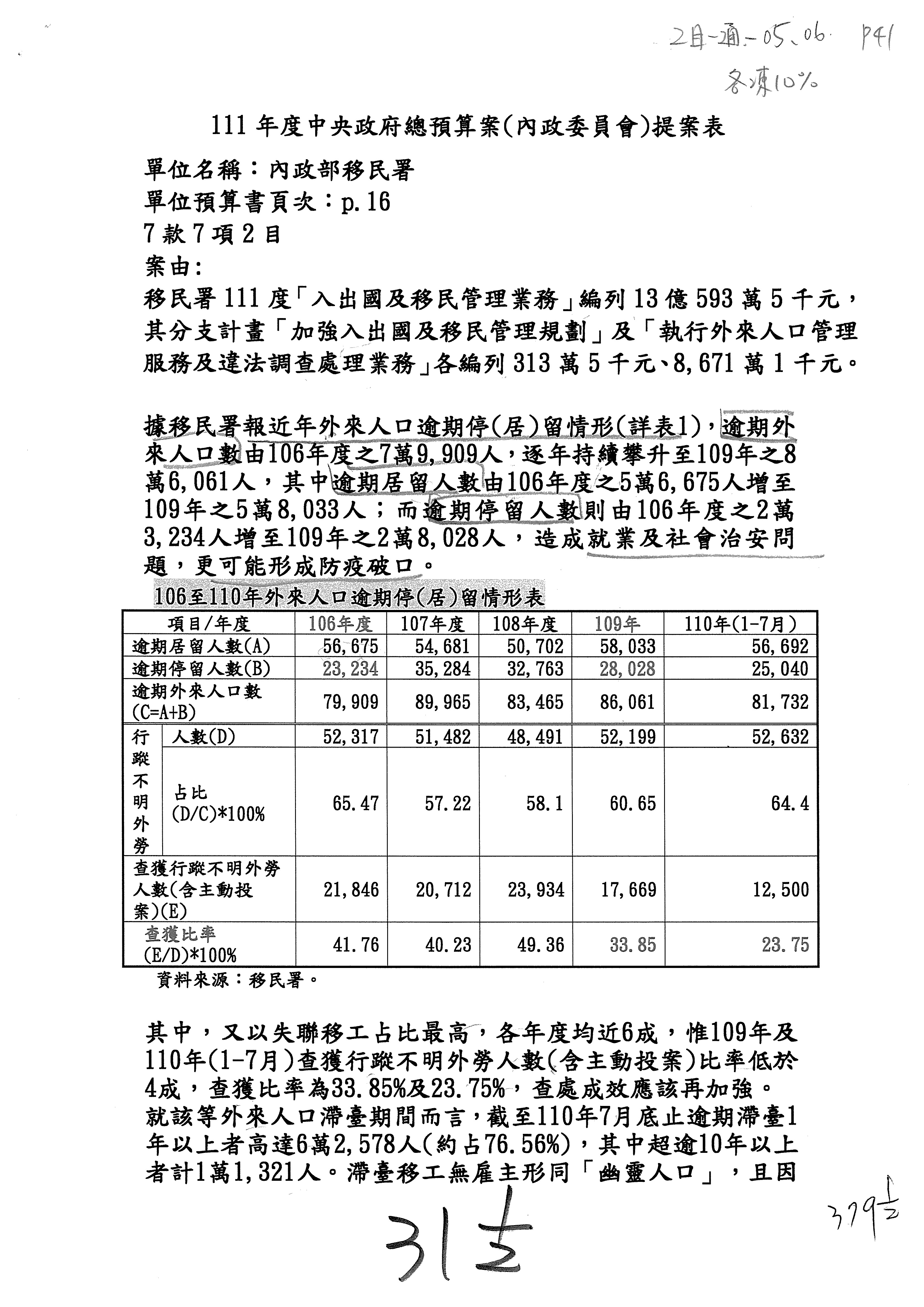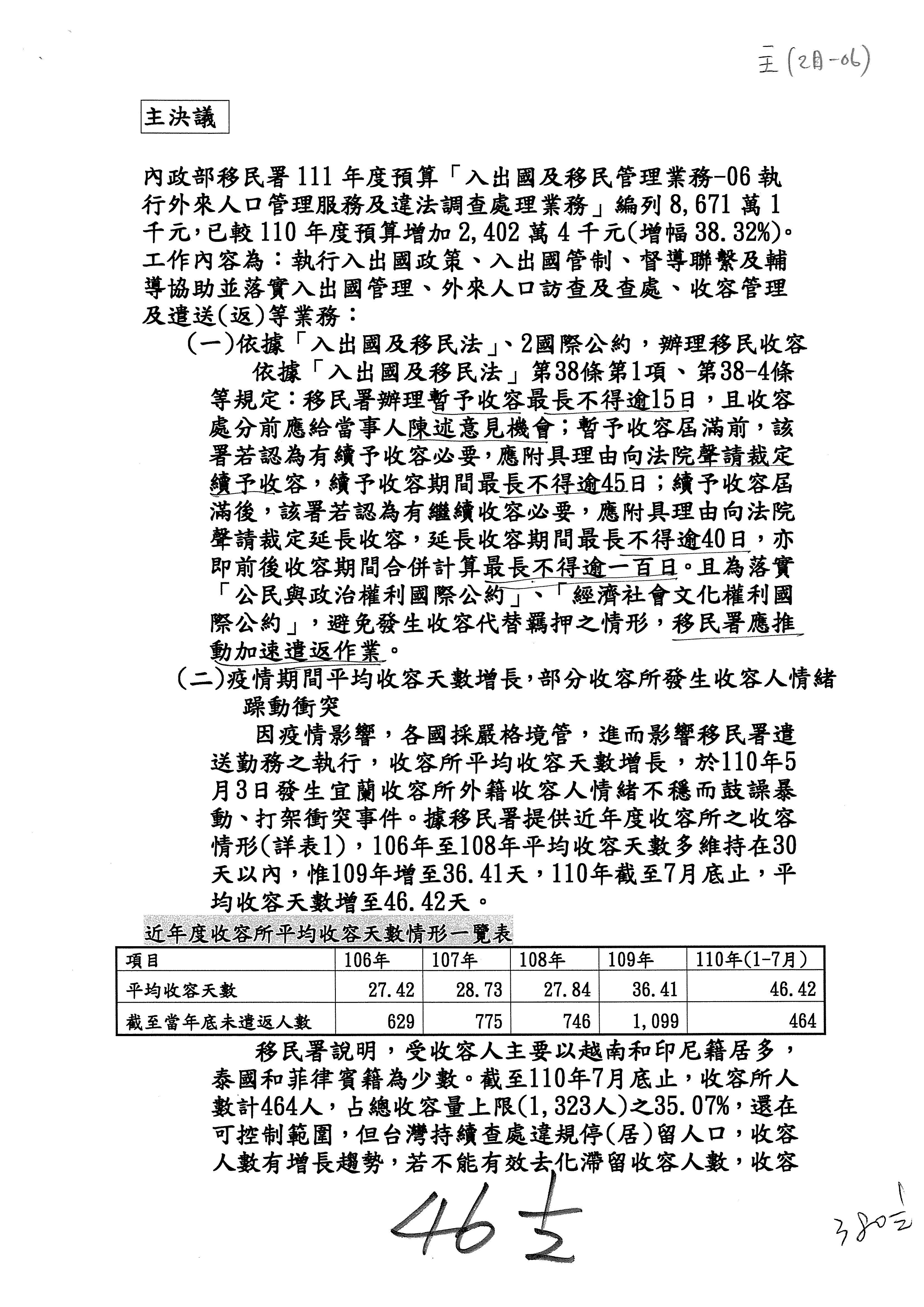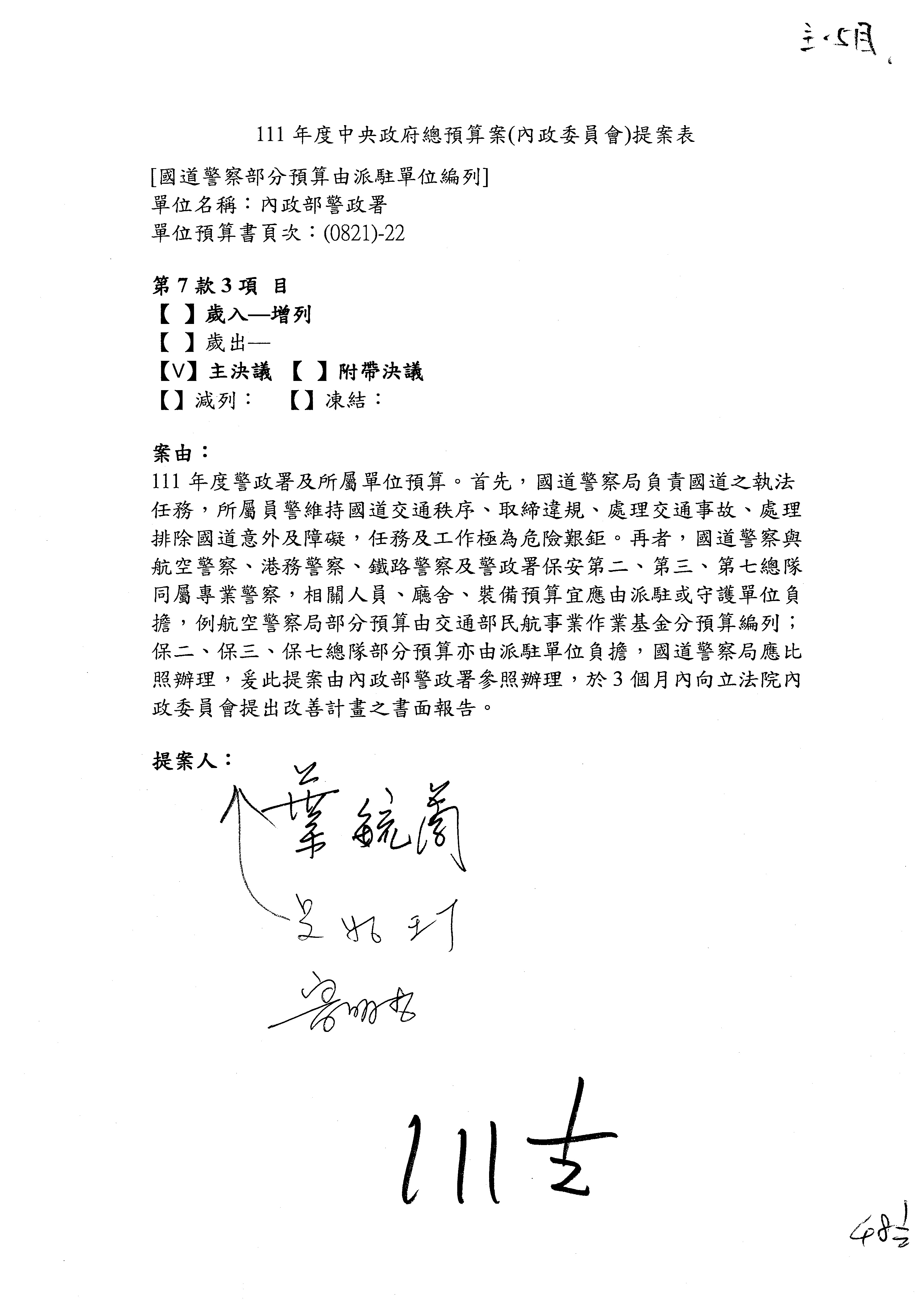 繼續審查111年度中央政府總預算案關於內政部、營建署及所屬、警政署及所屬、中央警察大學、消防署及所屬、役政署、移民署、建築研究所、空中勤務總隊部分。