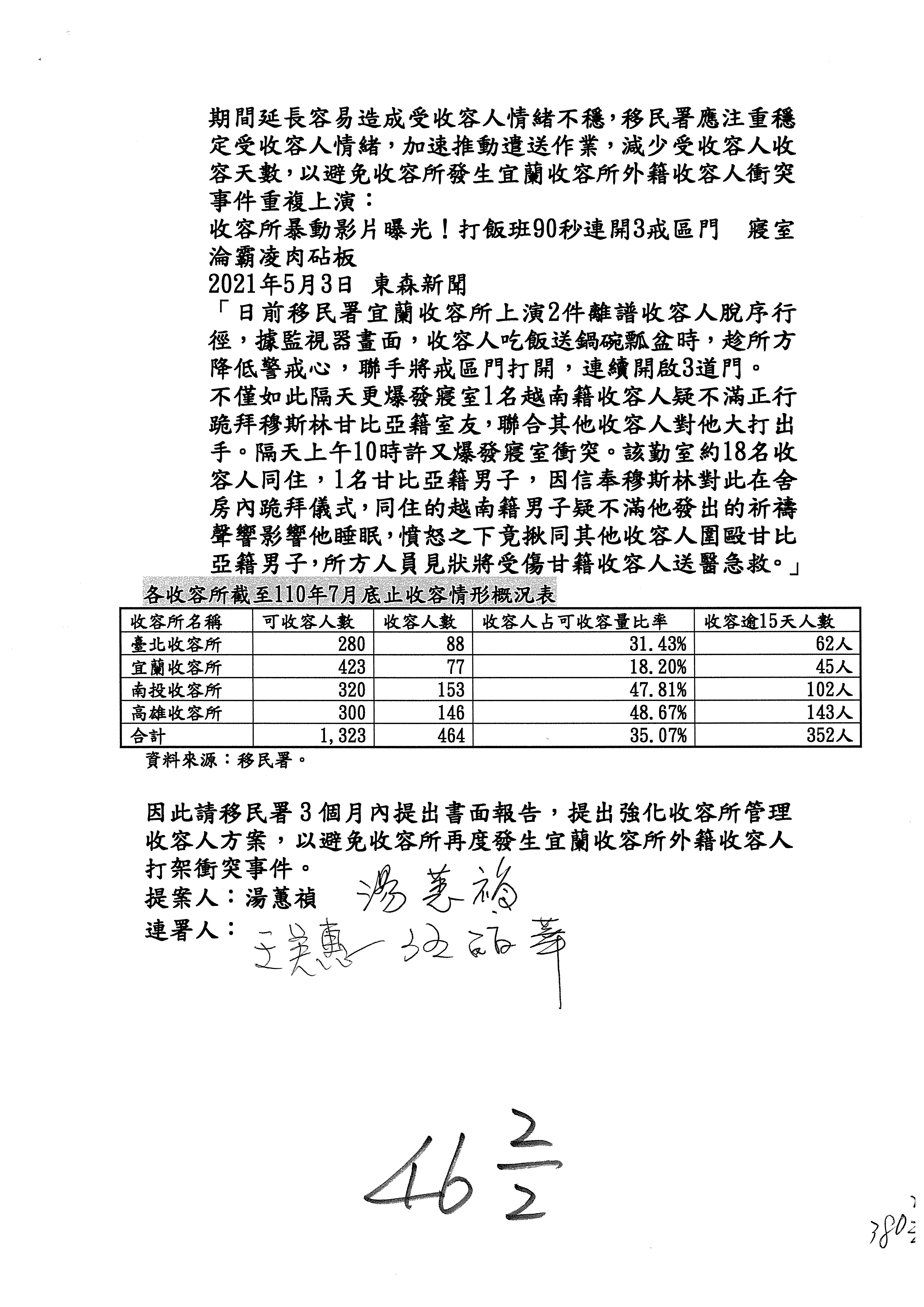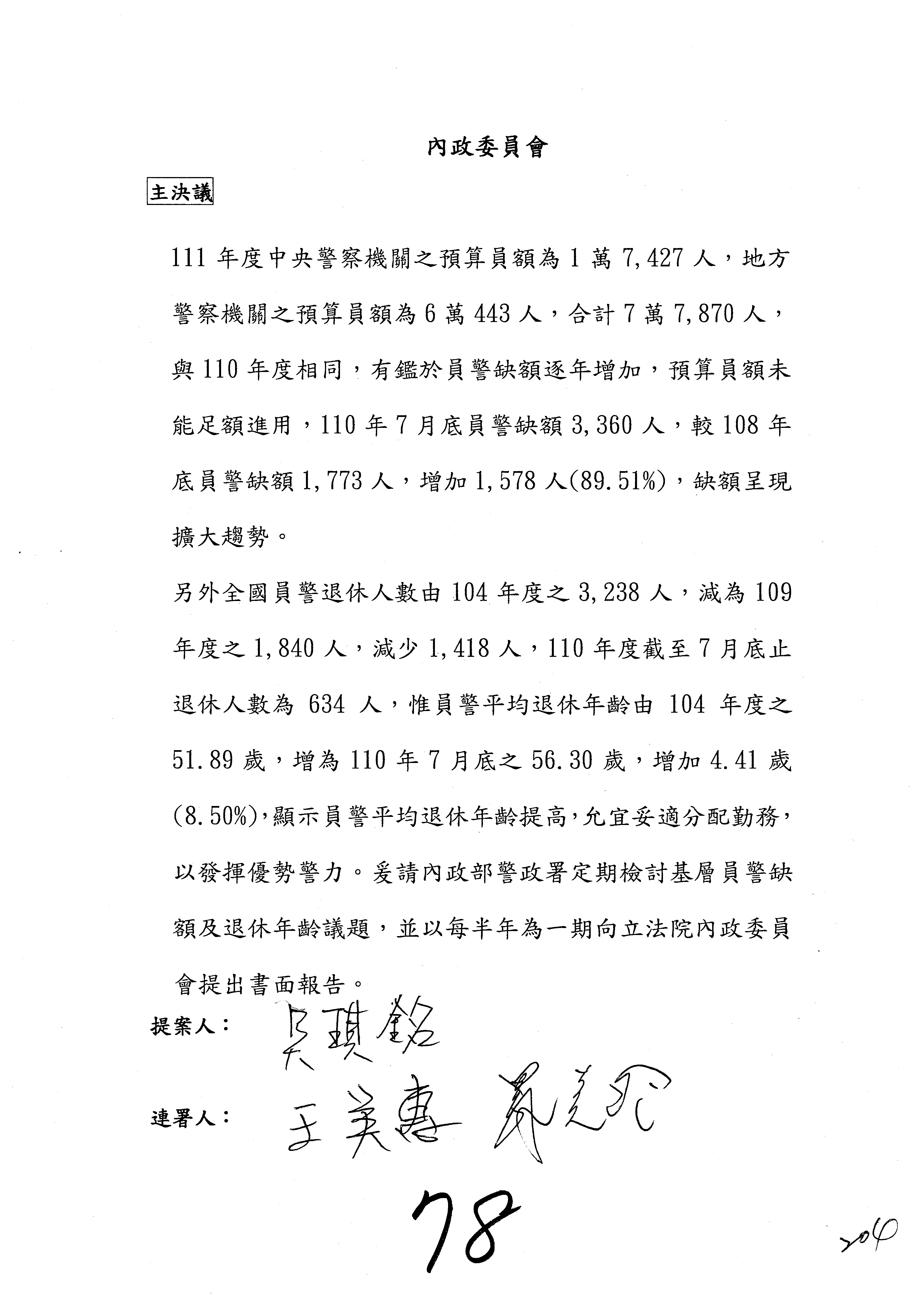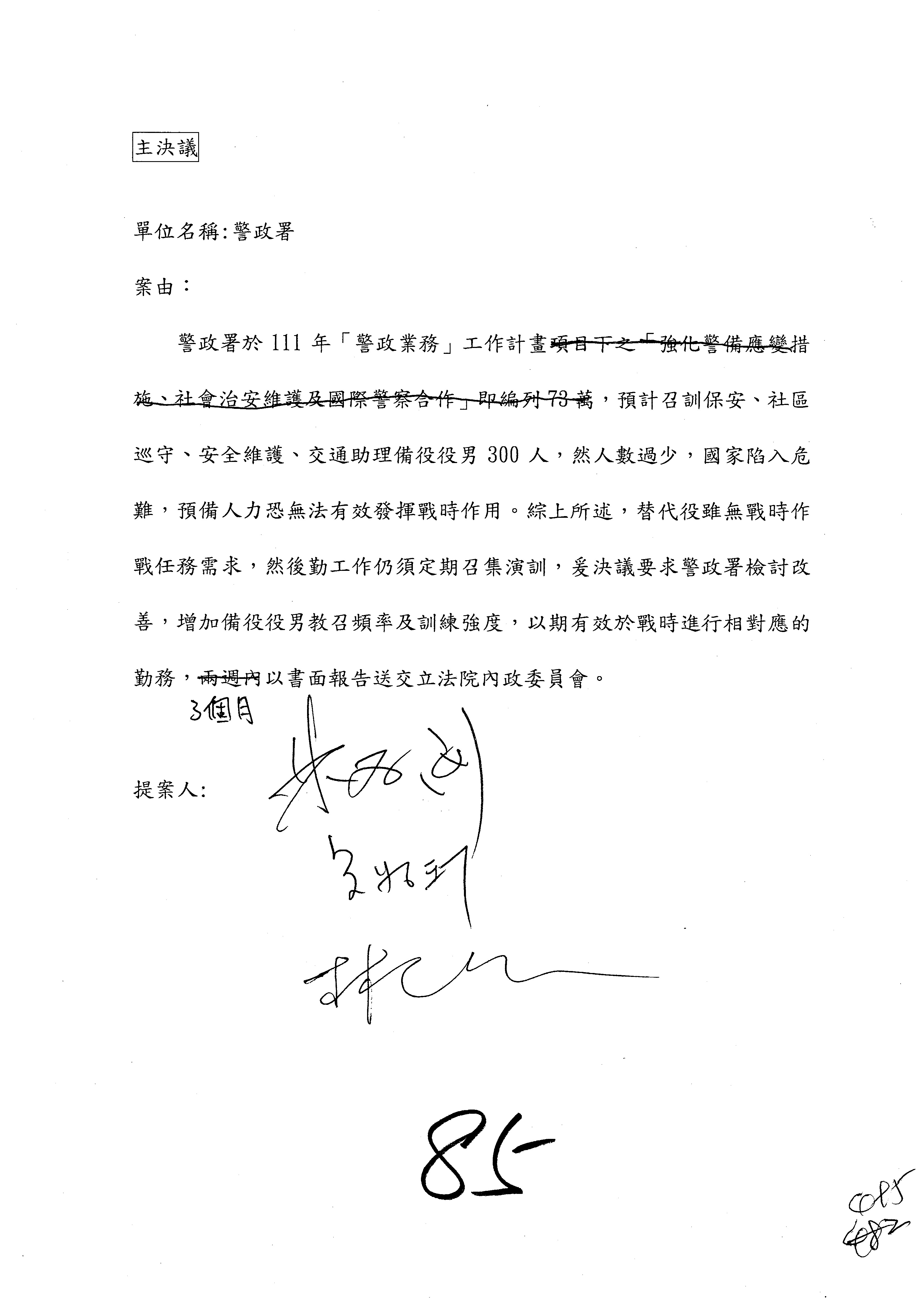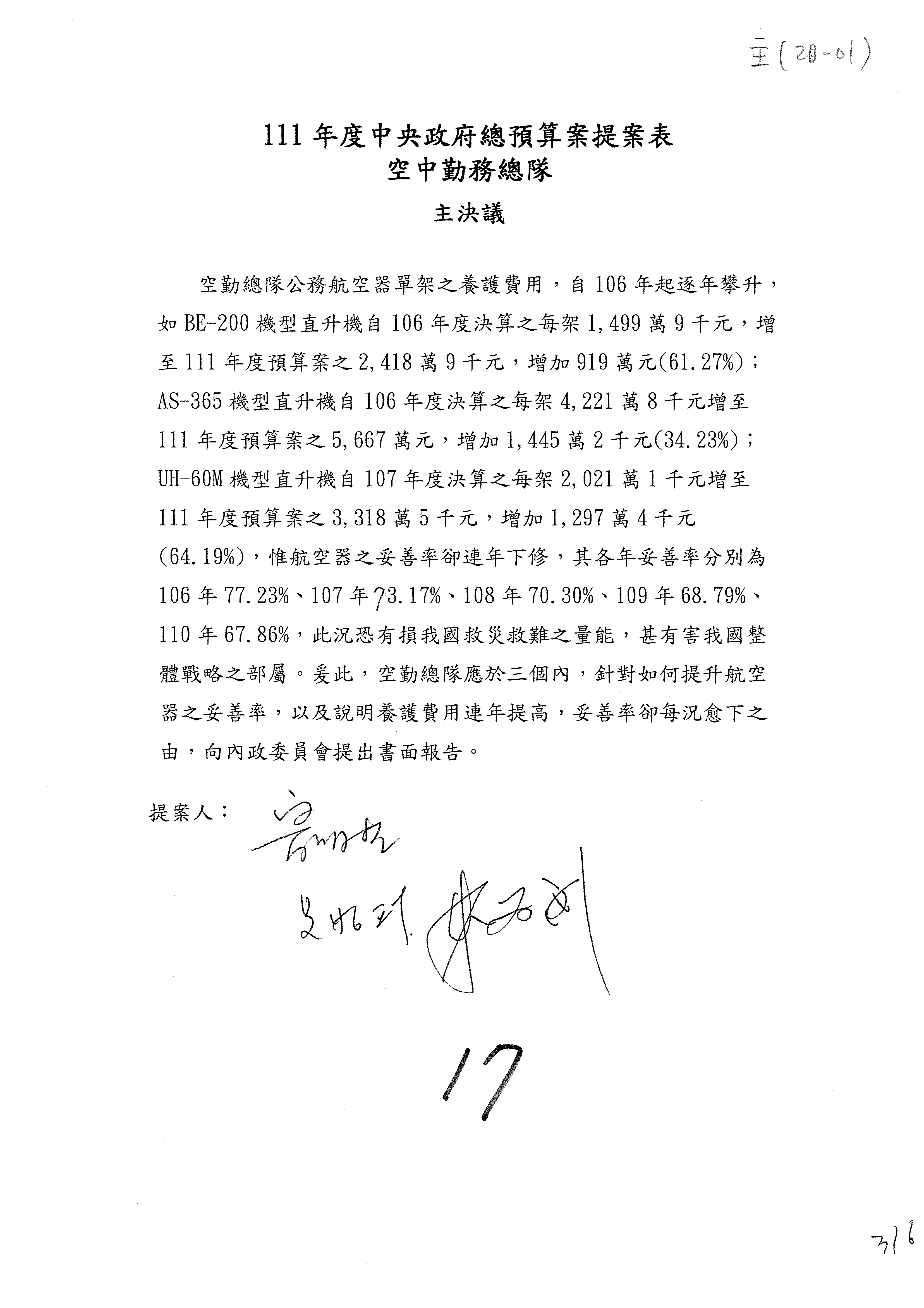 主決議部分:第16案照案通過;第17案句末修正為「107年73.17%、108年70.30%、109年68.79%、110年67.86%,其中109年、110年因適逢十年大檢,致妥善率下降,為維持救援能量,空勤總隊應於三個月內,針對如何調整飛機進場維修時程,以提升航空器之妥善率,以及說明養護費用連年提高,如何維持妥善率,向內政委員會提出書面報告。」,其餘文字照案通過;第18案照案通過;第19案提案中「為保戰略及」等字修正為「及」,其餘文字照案通過。