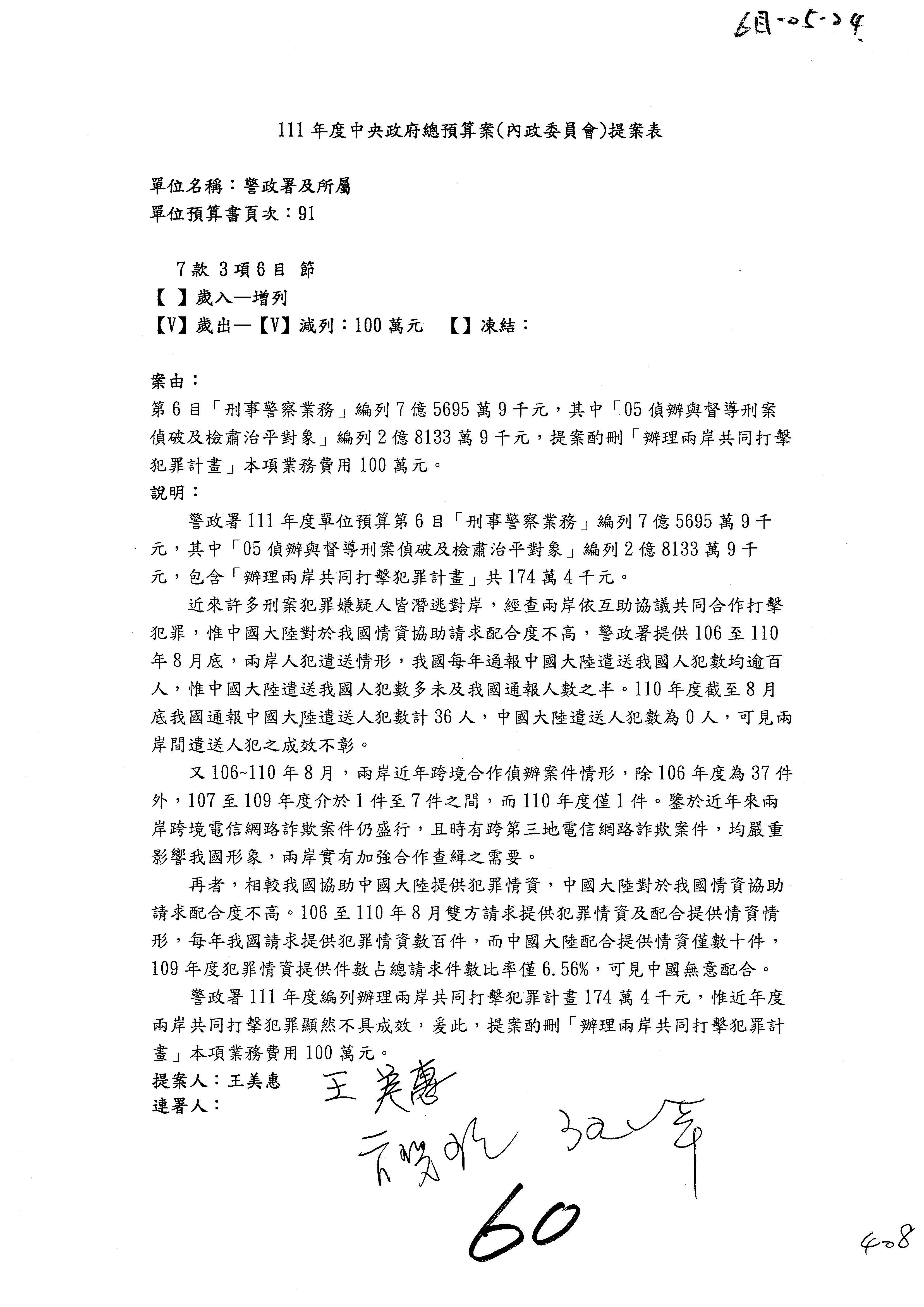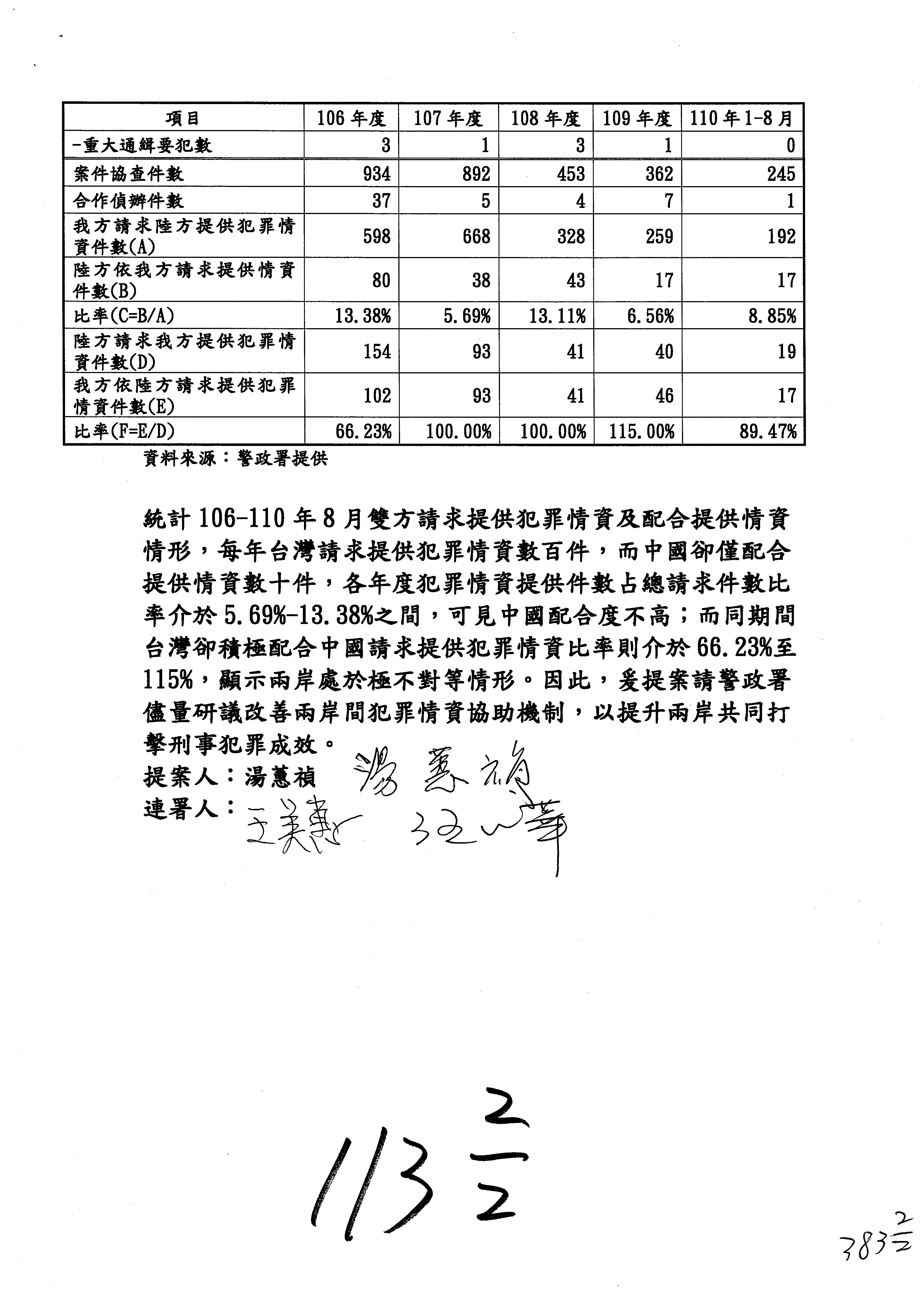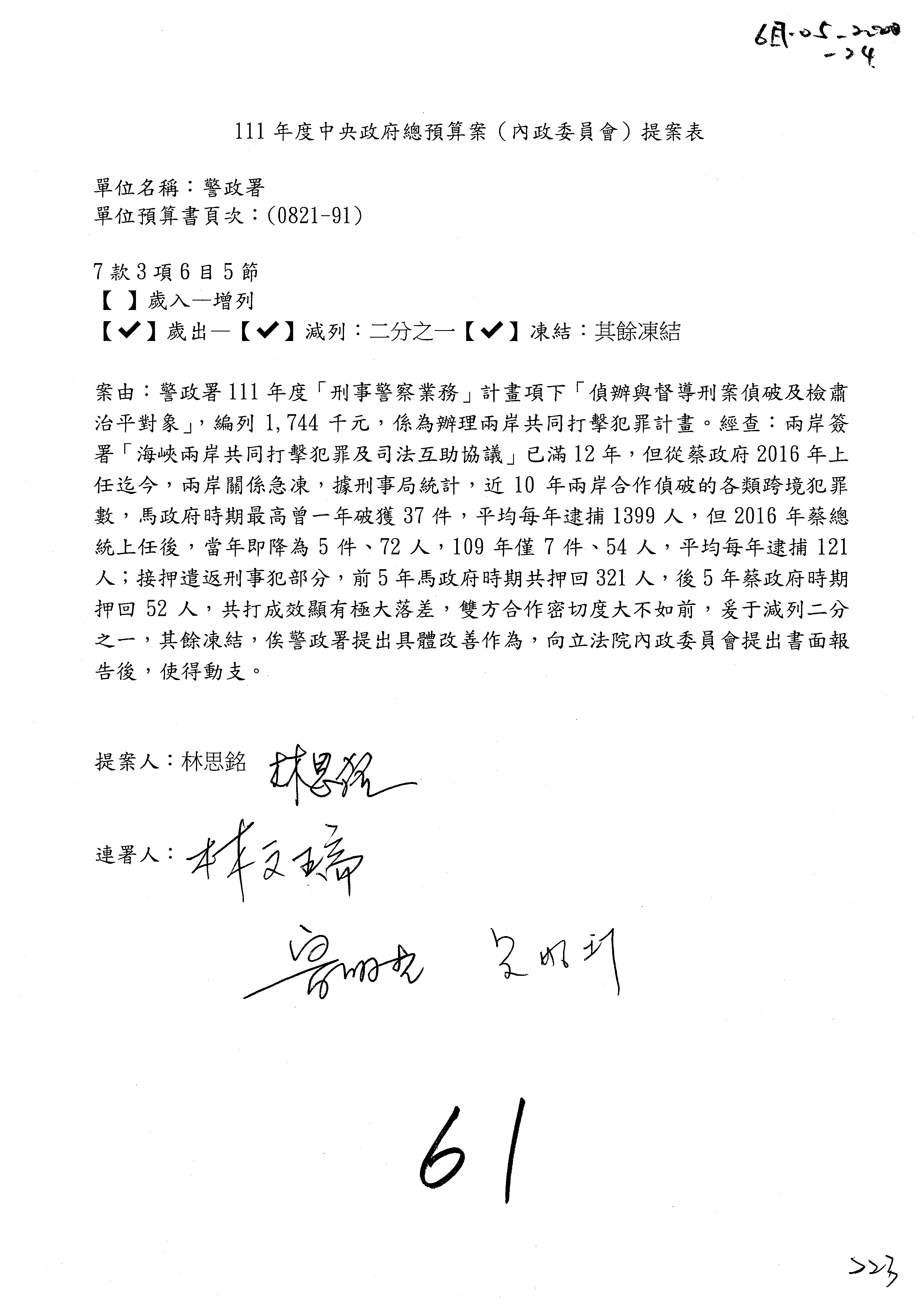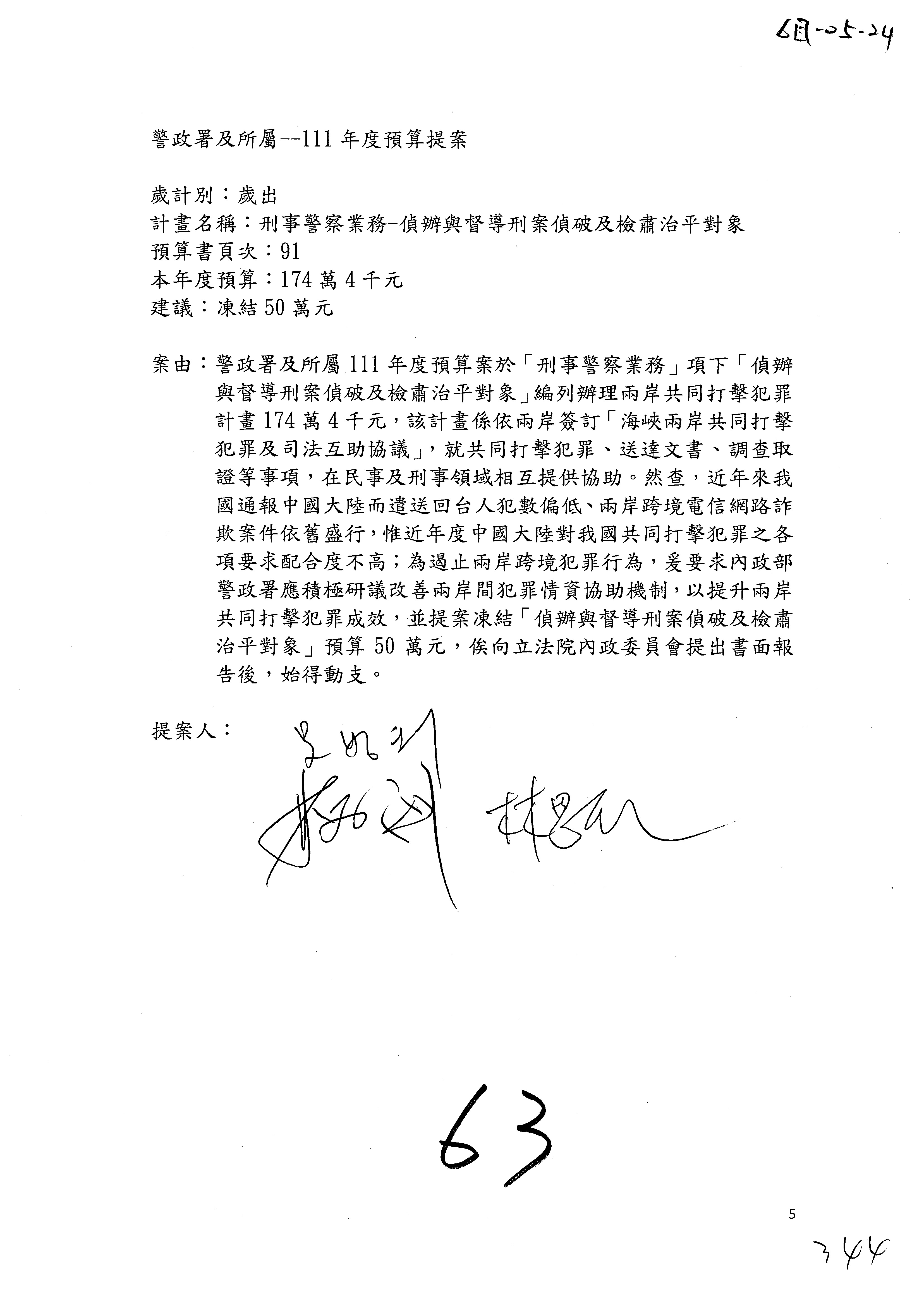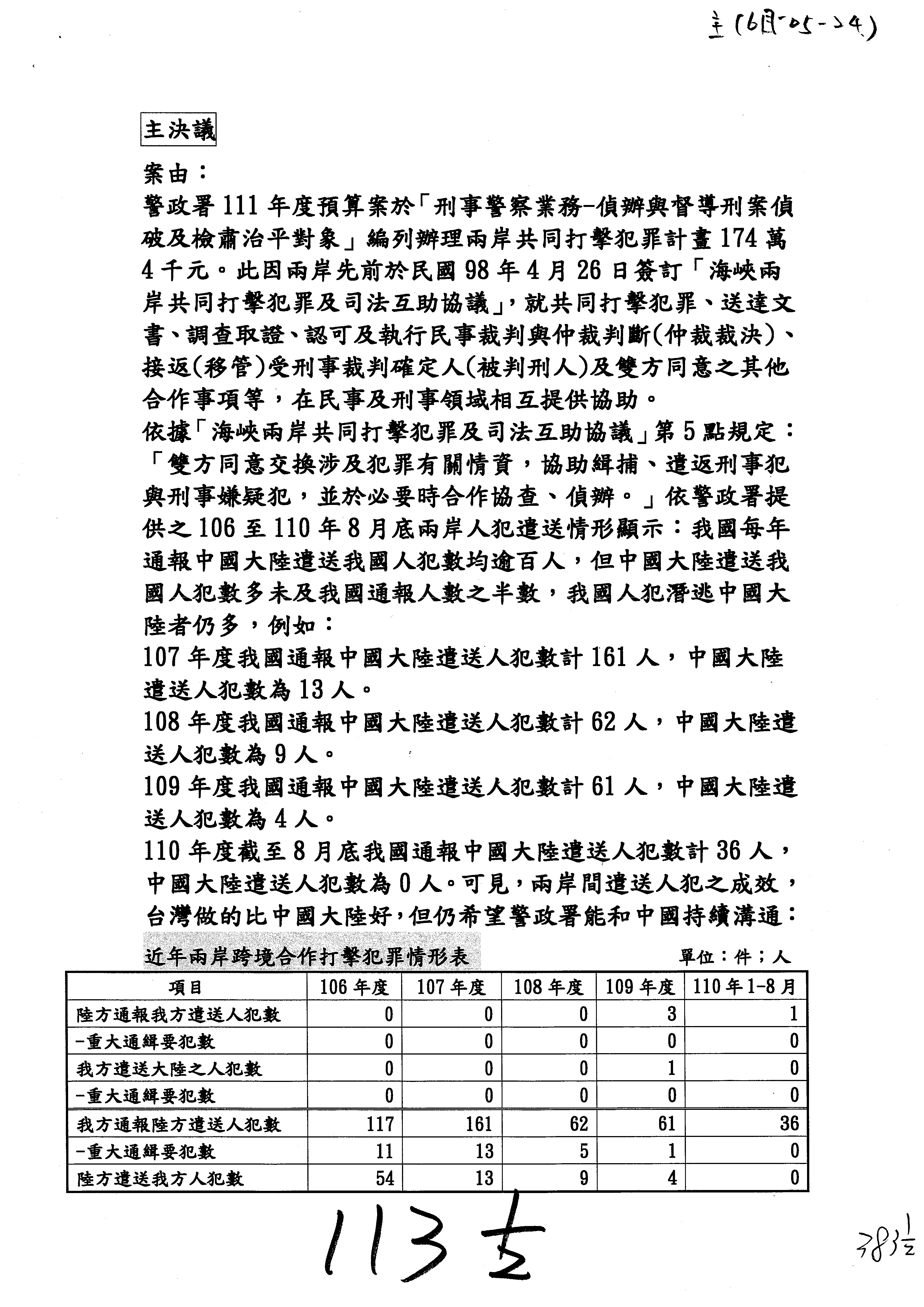 黃局長嘉祿:跟召委、各位委員報告,現在兩岸其實還是有在共同打擊犯罪,最近年底我們大概做了兩波,這兩波大概花了將近40萬,其實有一些案件像重大毒品案件,我們還是有在交流,他們也有提供我們從某個地區進來的毒品,我們在沿海有抓到嫌犯,提供我們相關的涉嫌人,我們現在都報請檢察官在指揮偵辦。相關很多的情資案件也都持續在辦。另外,雖然沒有出國去辦,但兩岸的一些學術交流及研討,我們還是有持續在辦,這個錢不多,早期我在當副局長的時候,大概將近1,000萬元,現在只剩下一百多萬元,我們希望這個部分不要凍結,因為我們還有一些重要的逃犯要去抓。