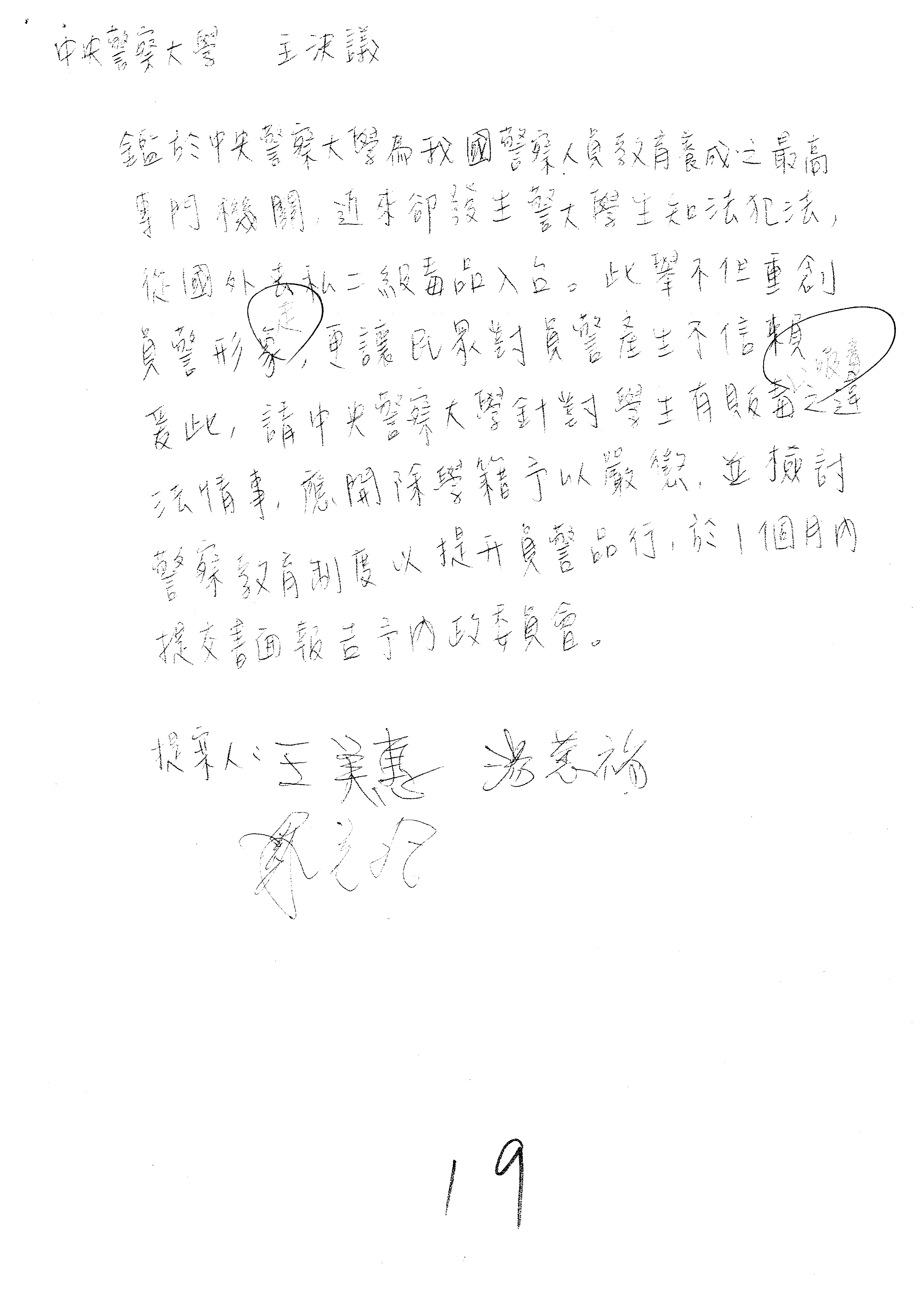 接著處理第1目一般行政,第19案已經改為主決議,經過邱顯智委員同意。