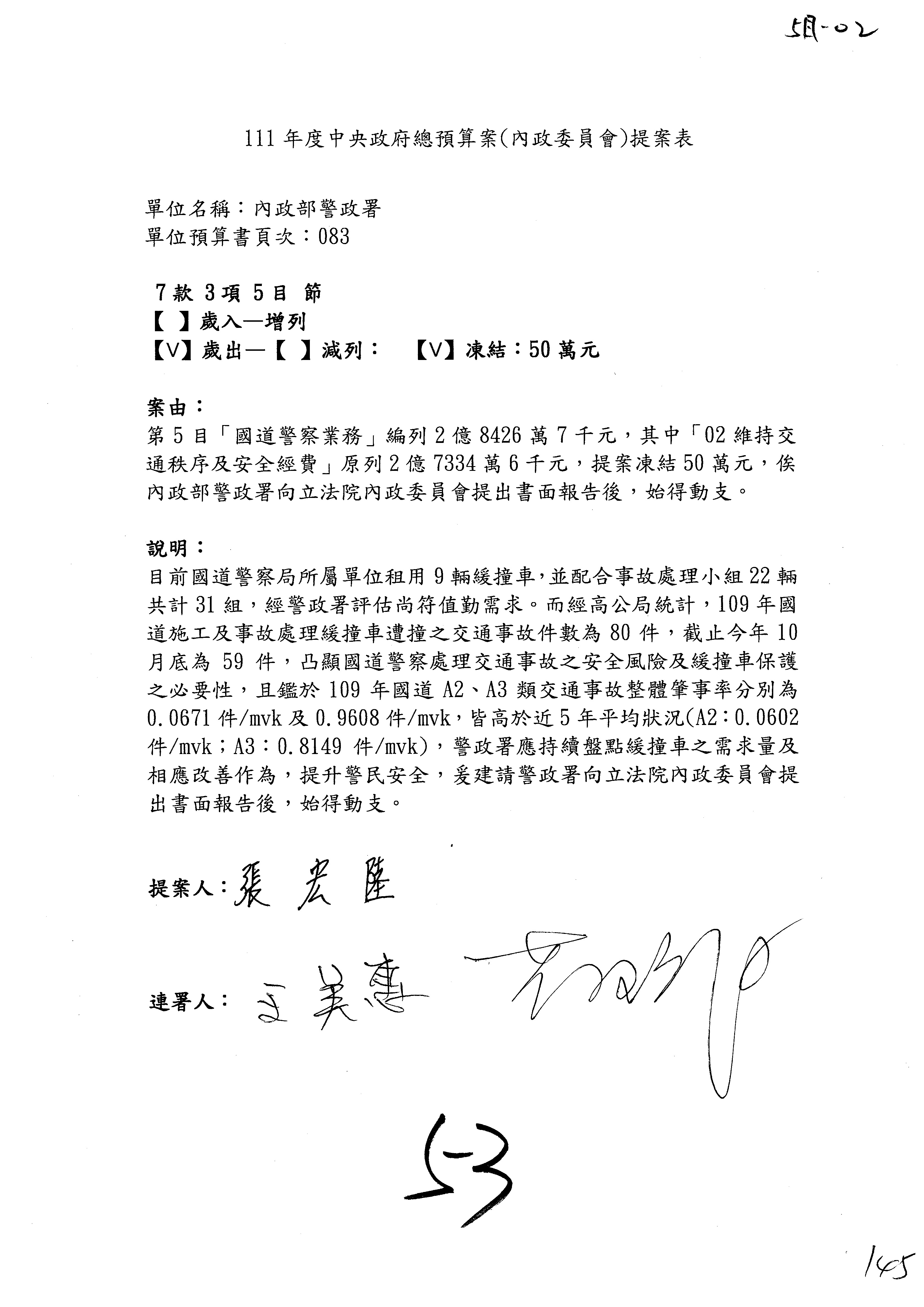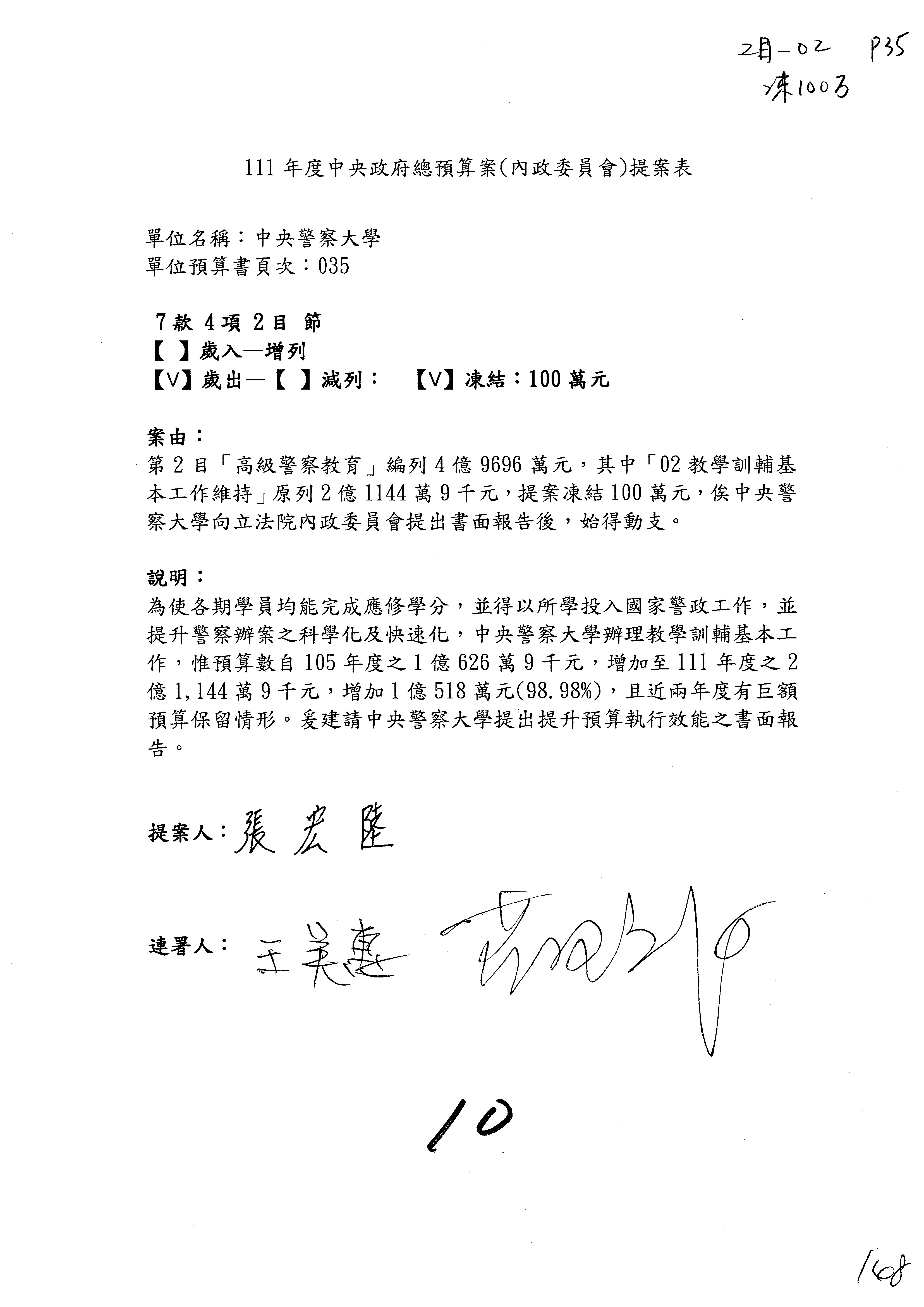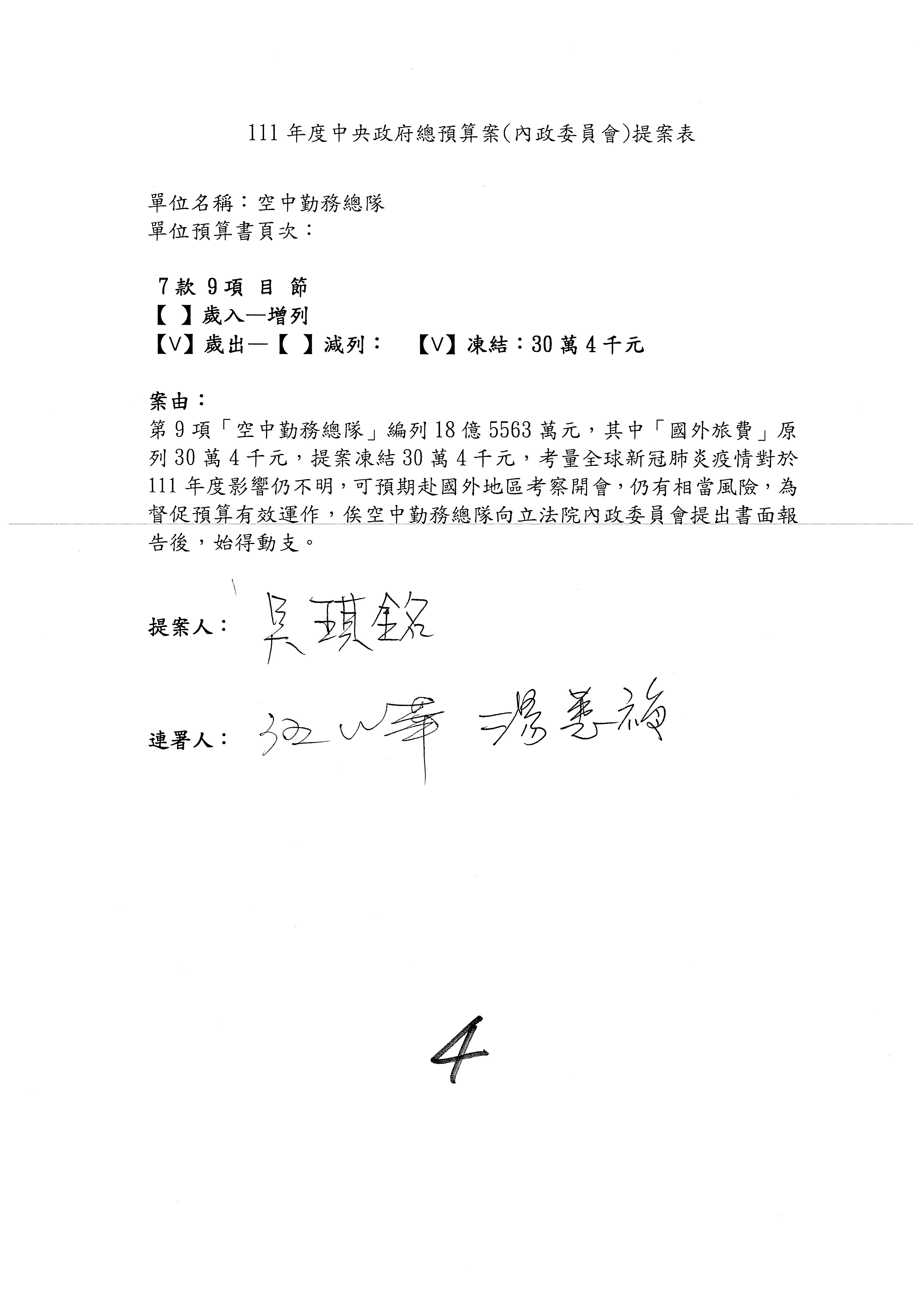 主席:剩下凍結1,000萬元,然後提書面報告。第4案修正通過。