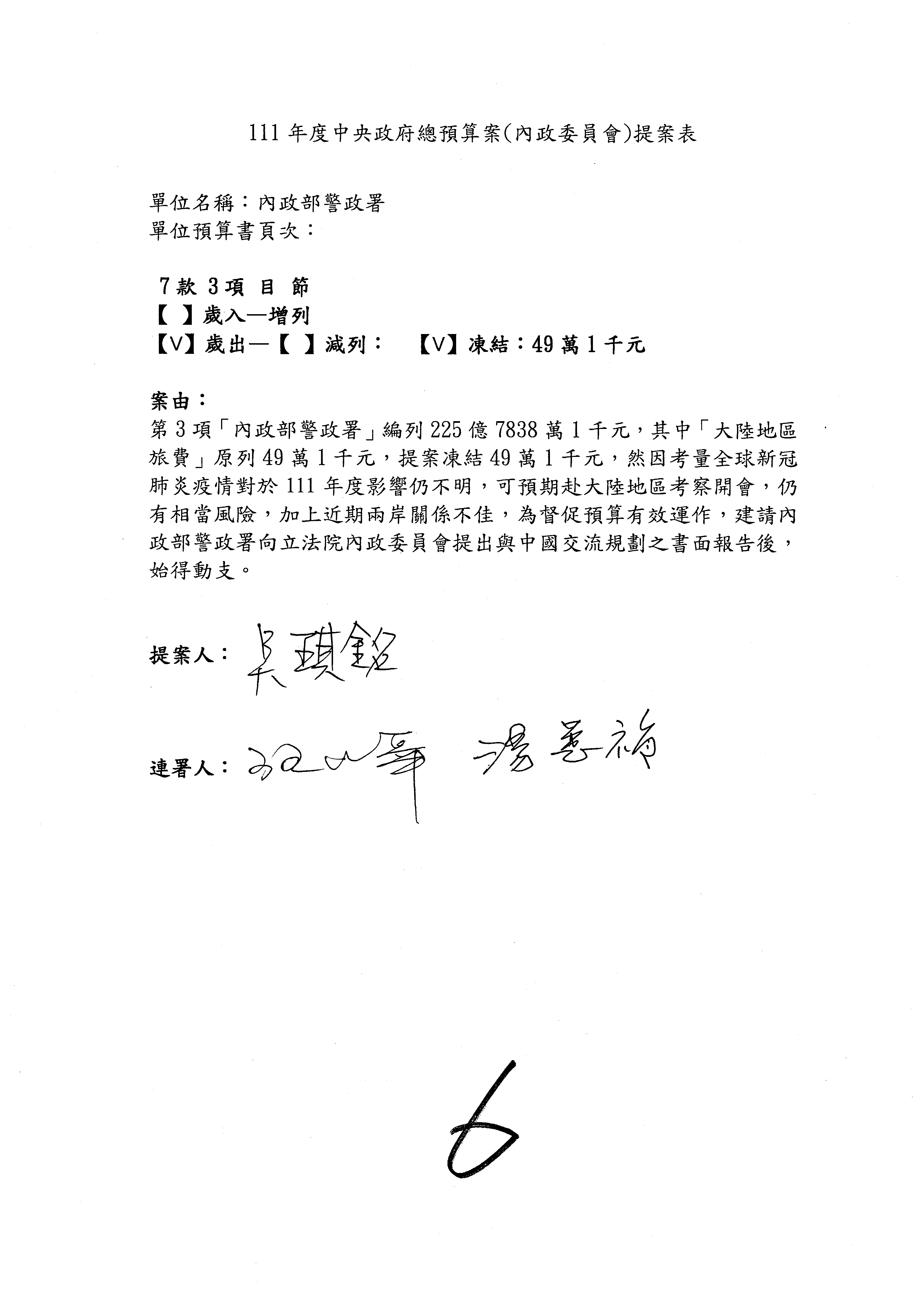 第5案是旅費部分,還有第6、第7、第8、第9、第10案。我們先處理大陸地區的,大陸地區相關的是第5案及第6案,全數凍結啦!到底能不能去,請警政署來說明一下,好不好?到底能不能去?先針對大陸旅費的部分,請說明。