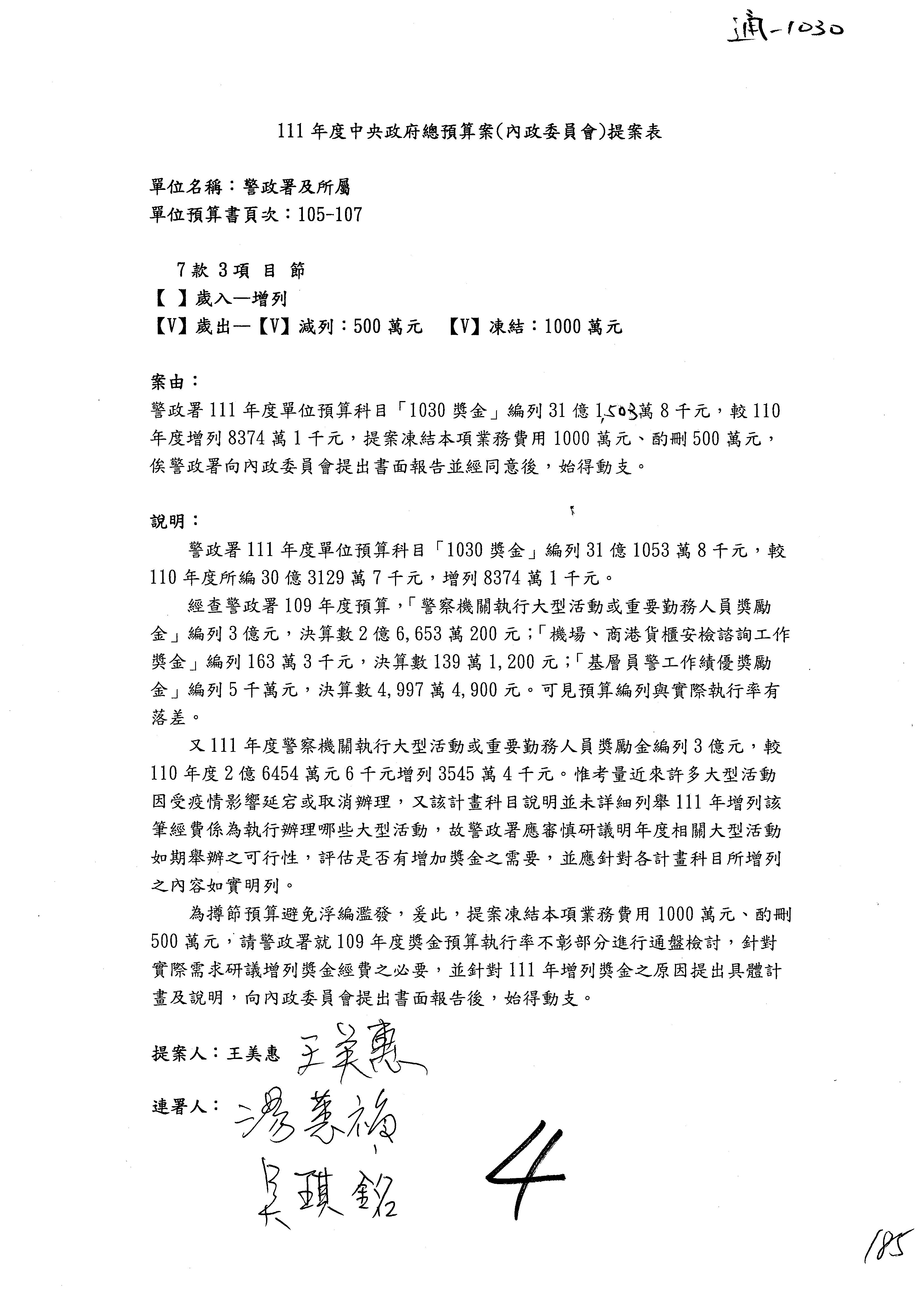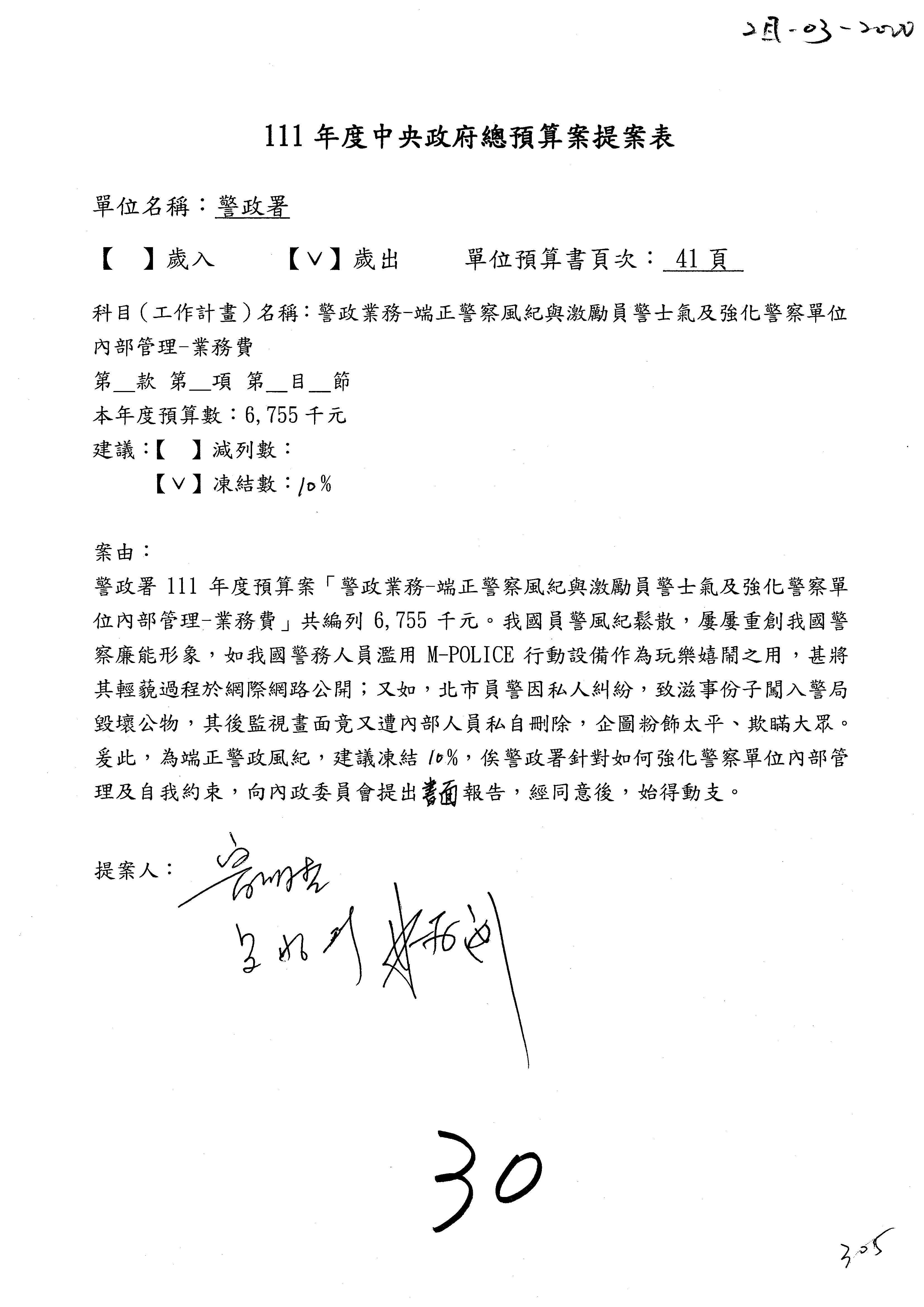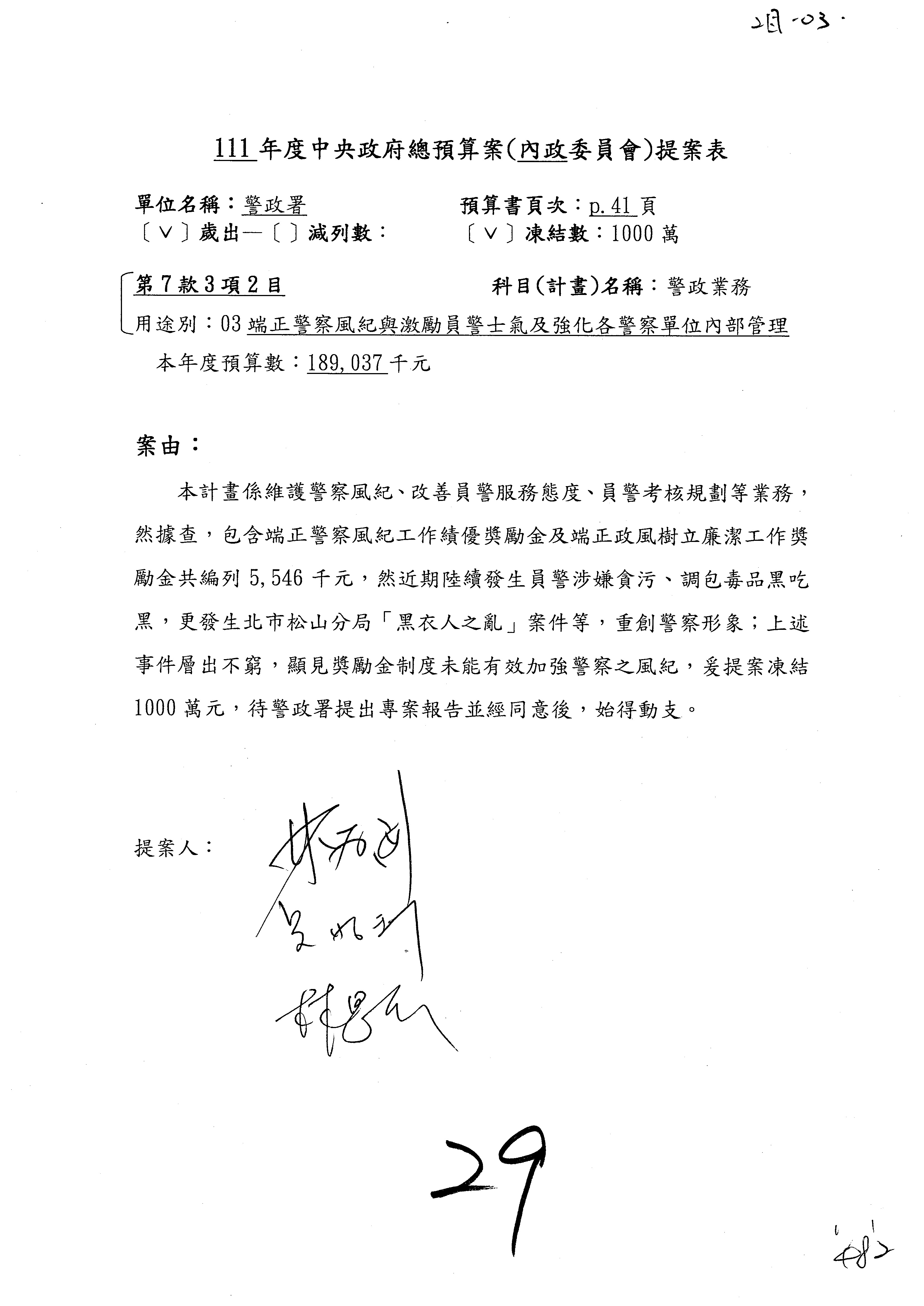 第29案,端正警察風紀與激勵員警士氣及強化警察單位內部管理,這個跟第30案有關,我是提凍結1,000萬元,提出報告後,始得動支,有沒有問題?