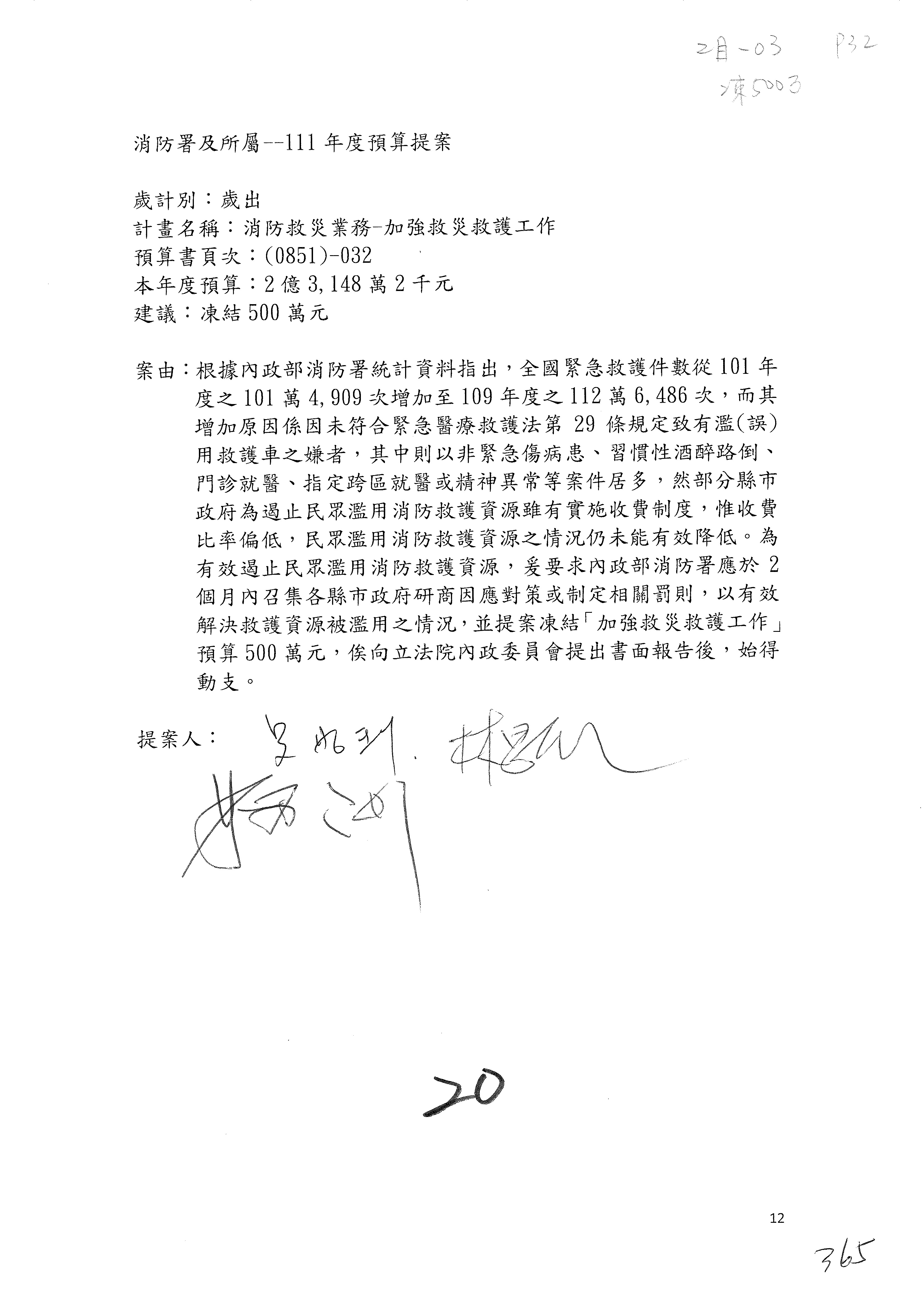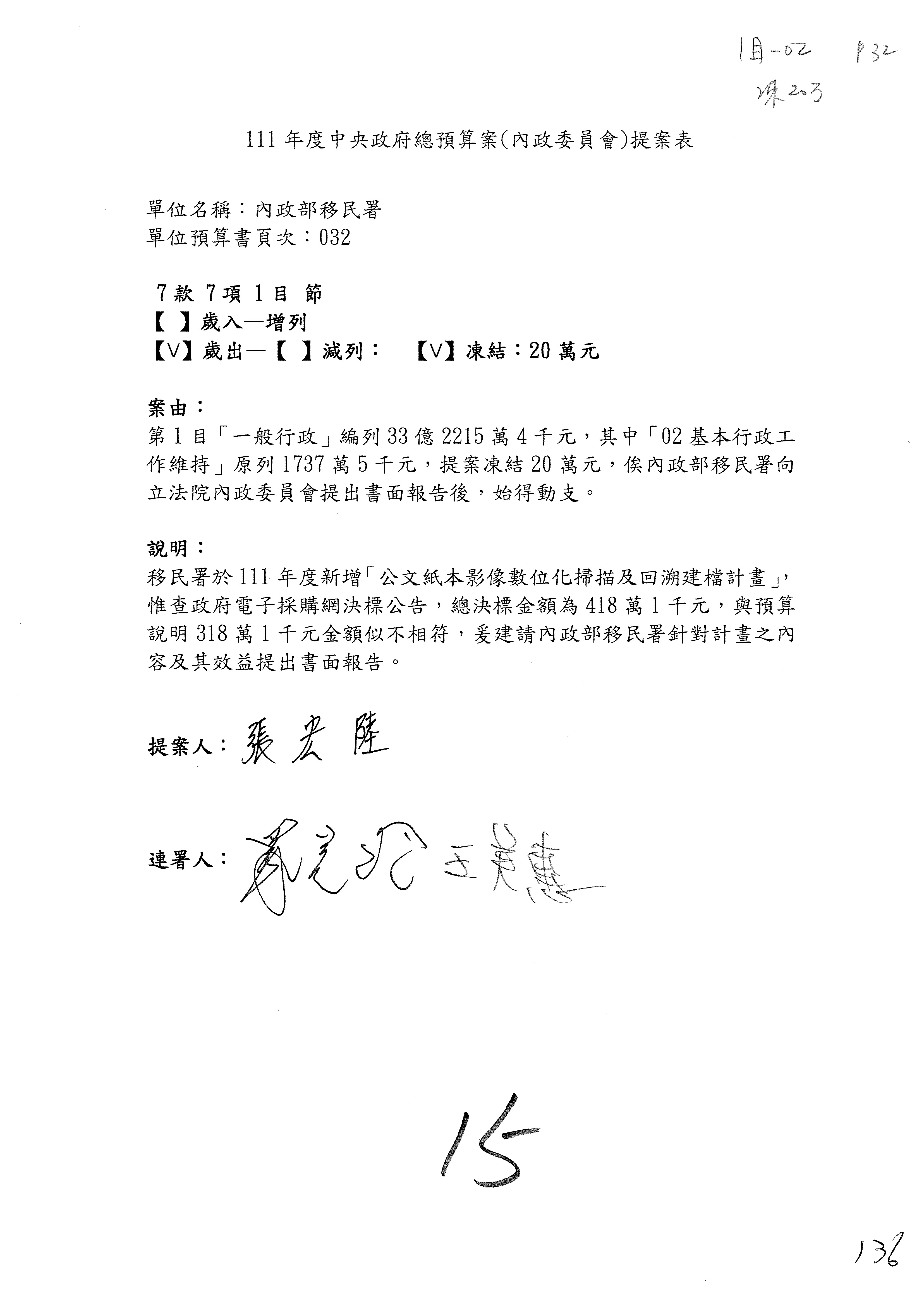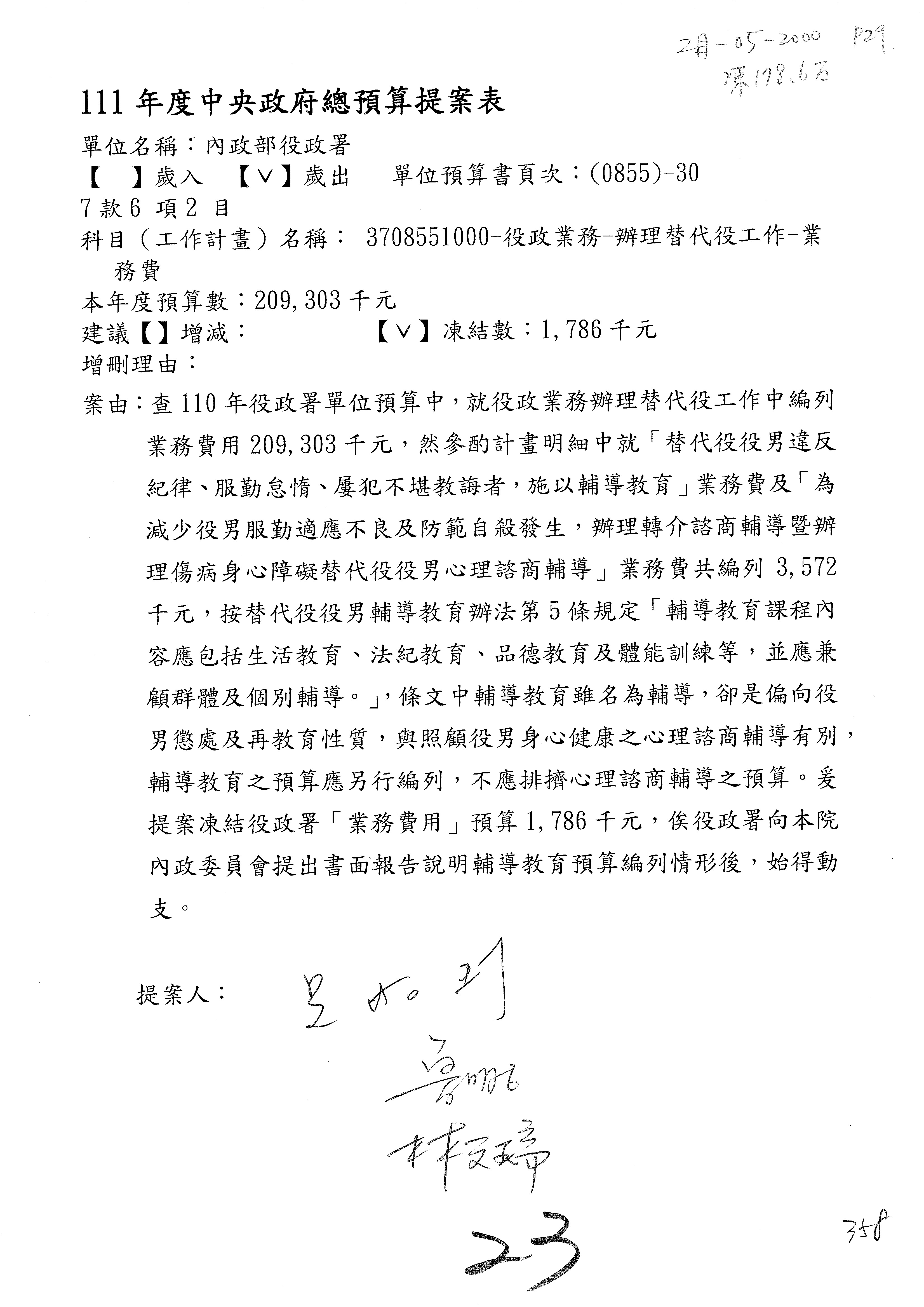 徐部長國勇:這部分的預算才357萬元,如果凍結200萬元的話,他們就沒辦法做事了,凍結20萬元好不好?