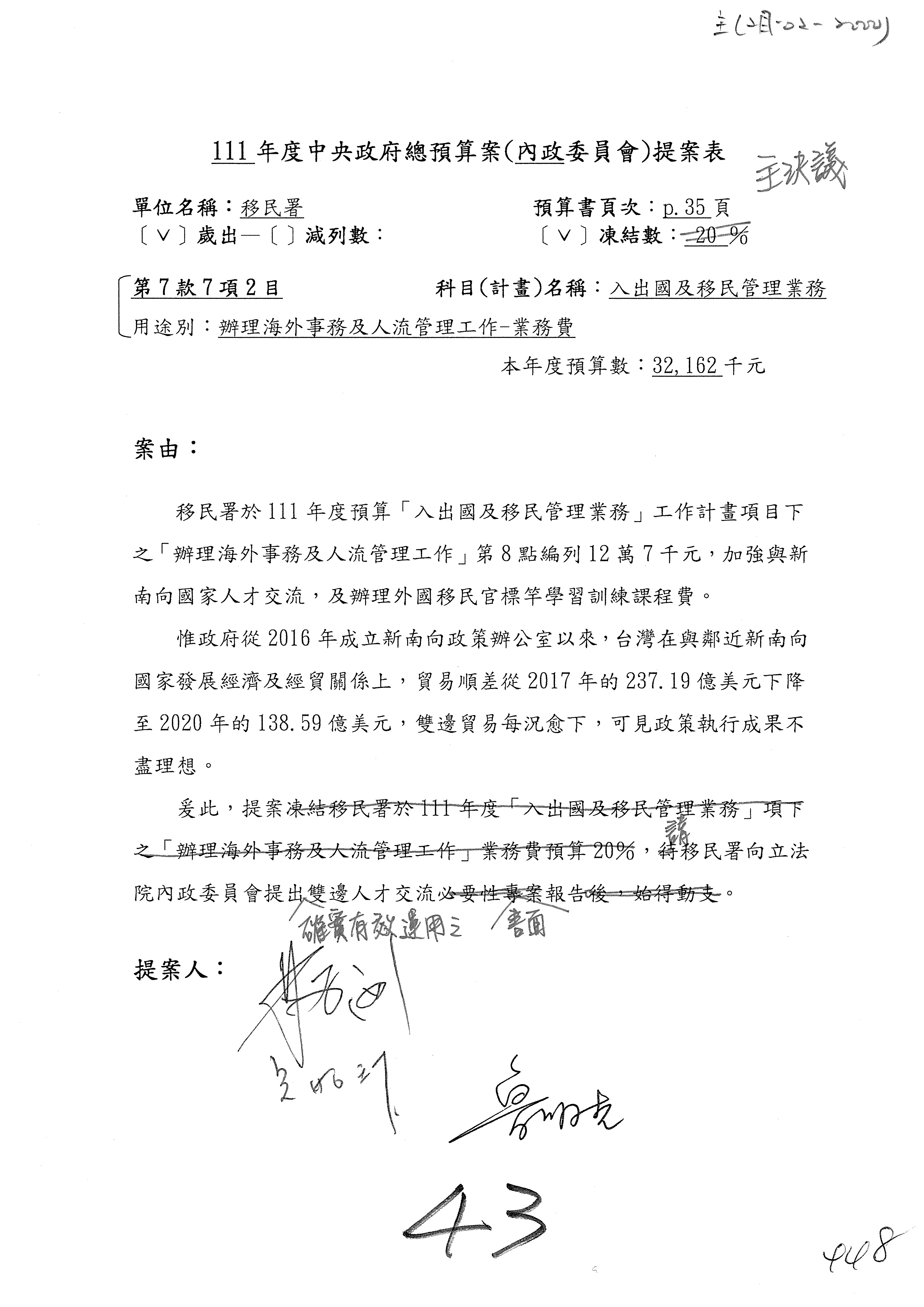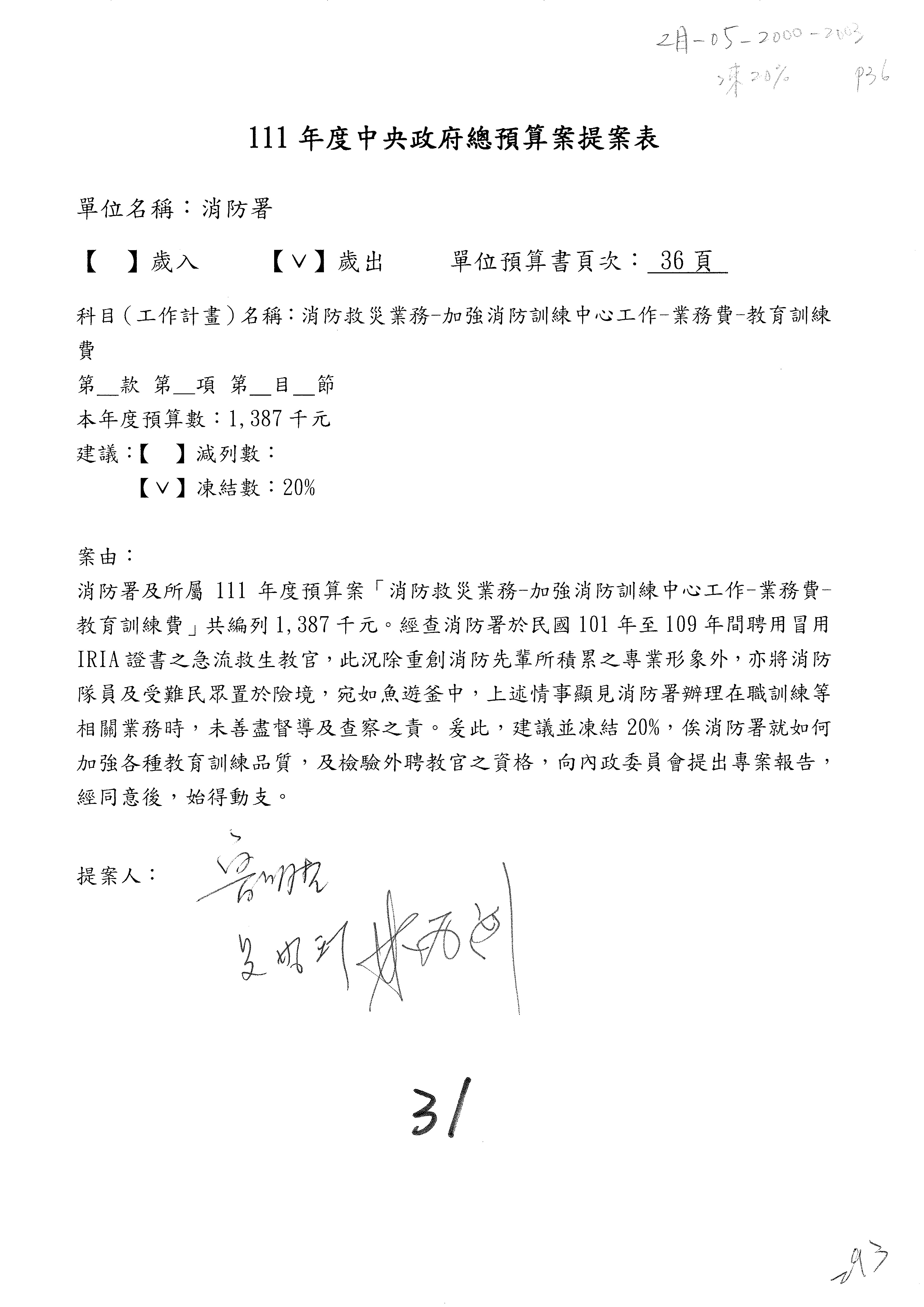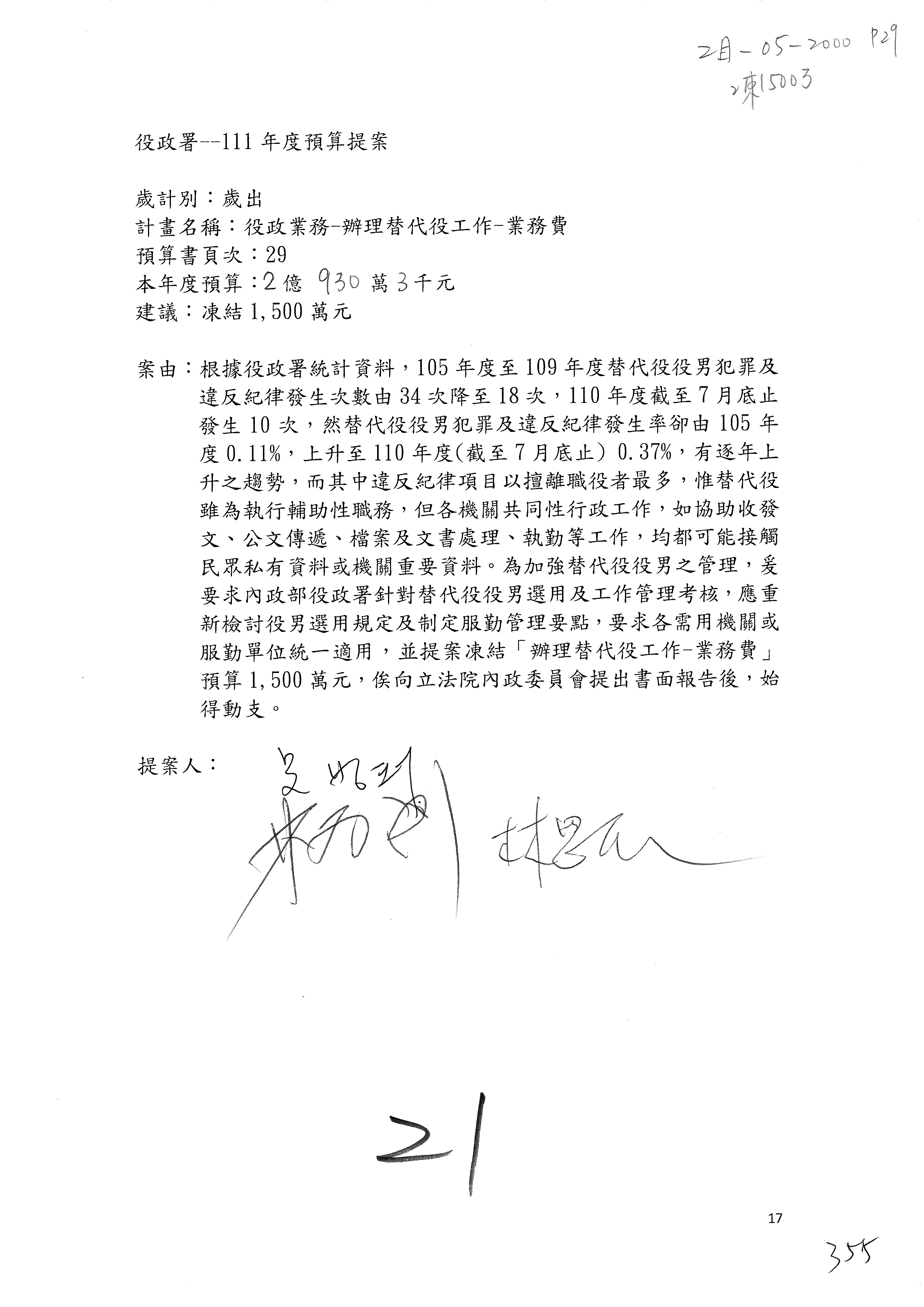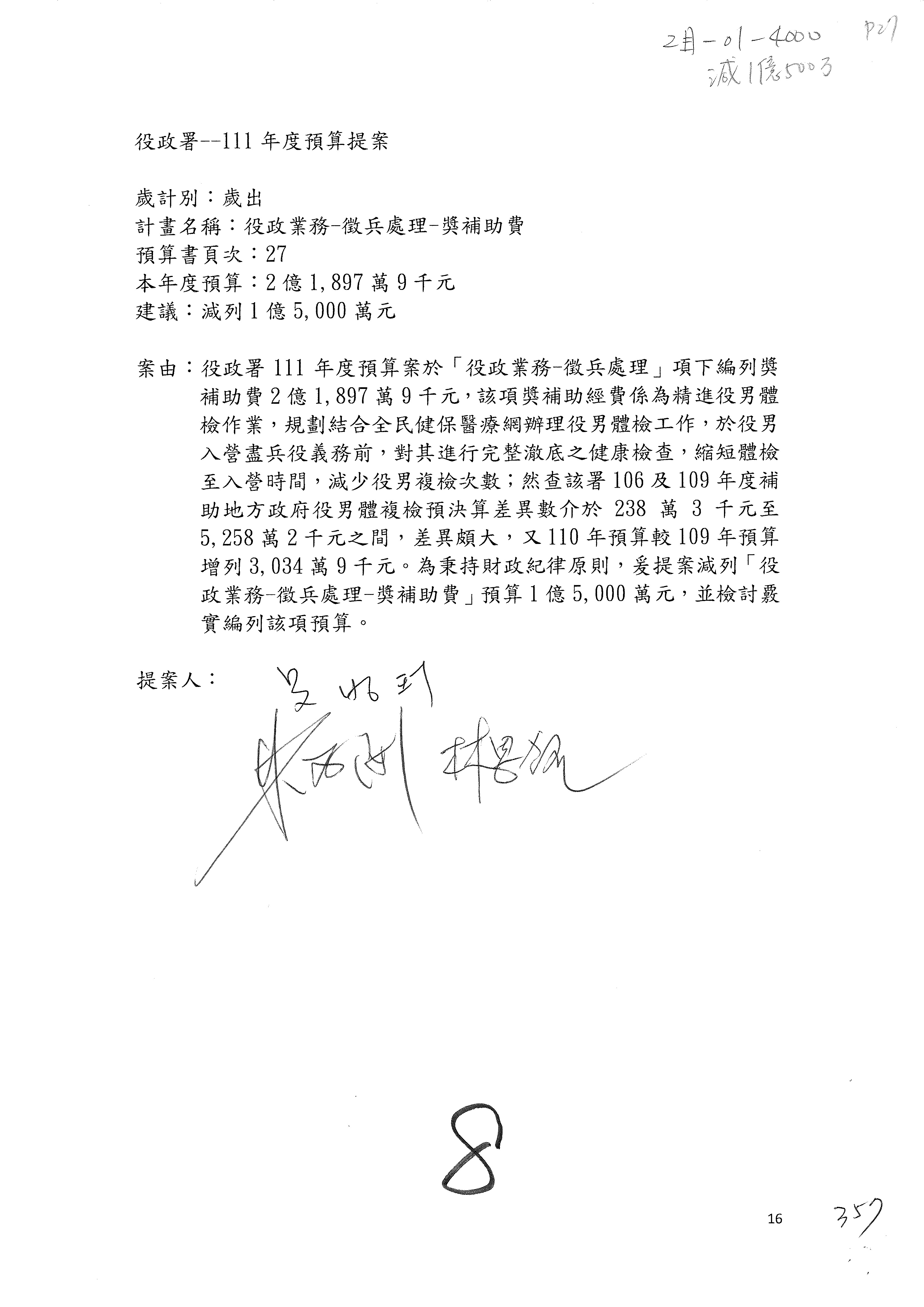 徐部長國勇:這部分的預算才357萬元,如果凍結200萬元的話,他們就沒辦法做事了,凍結20萬元好不好?