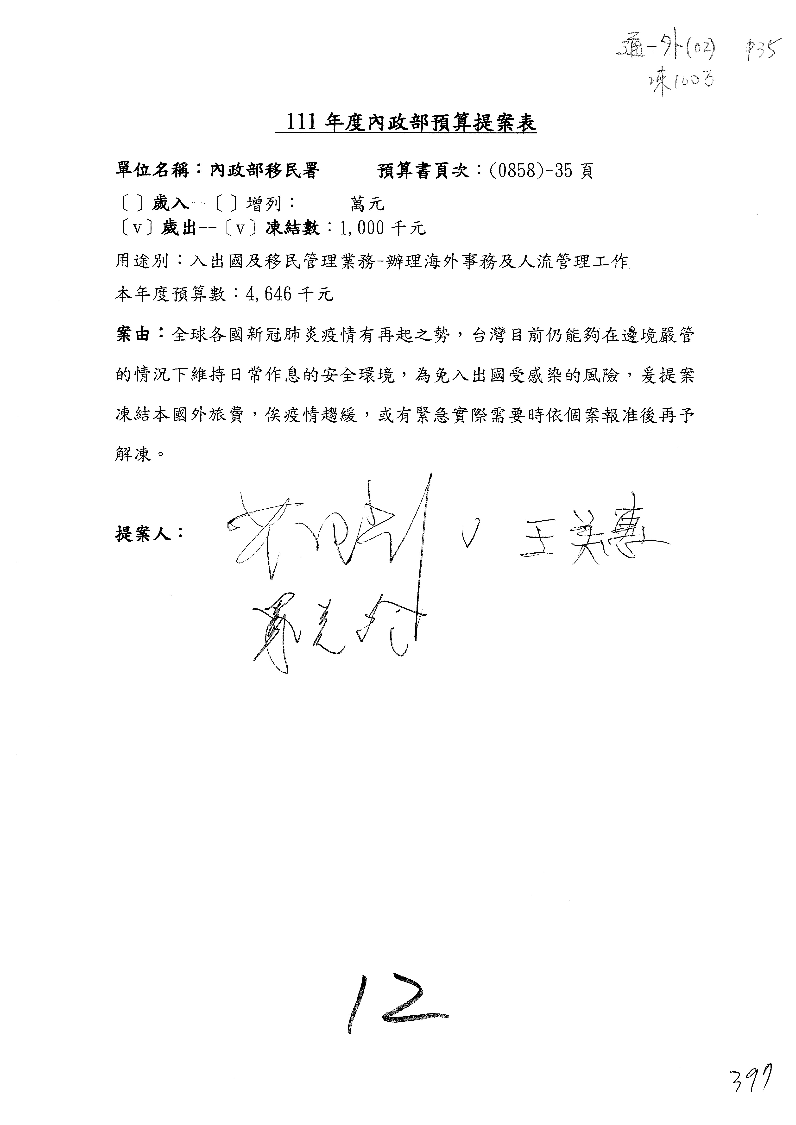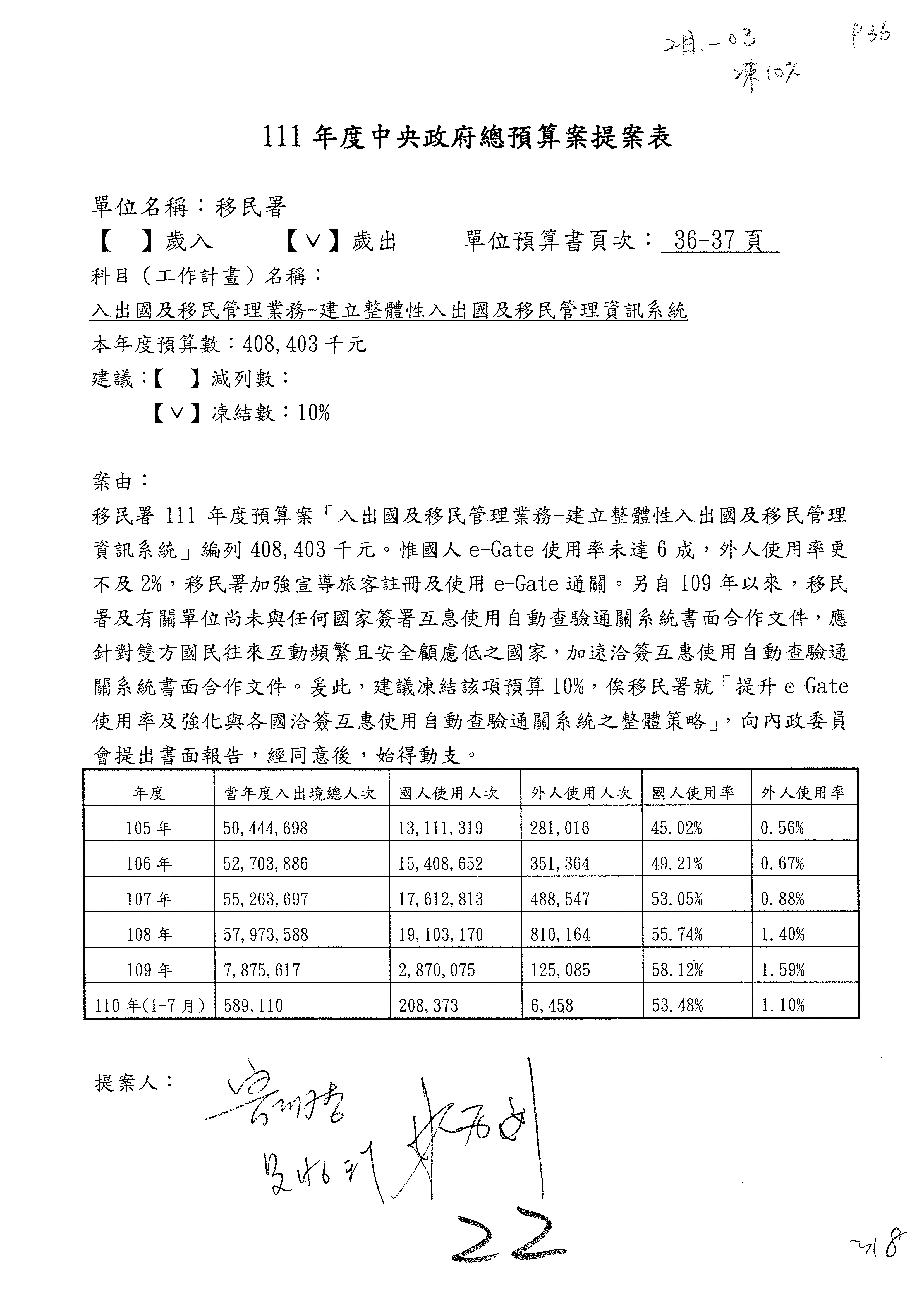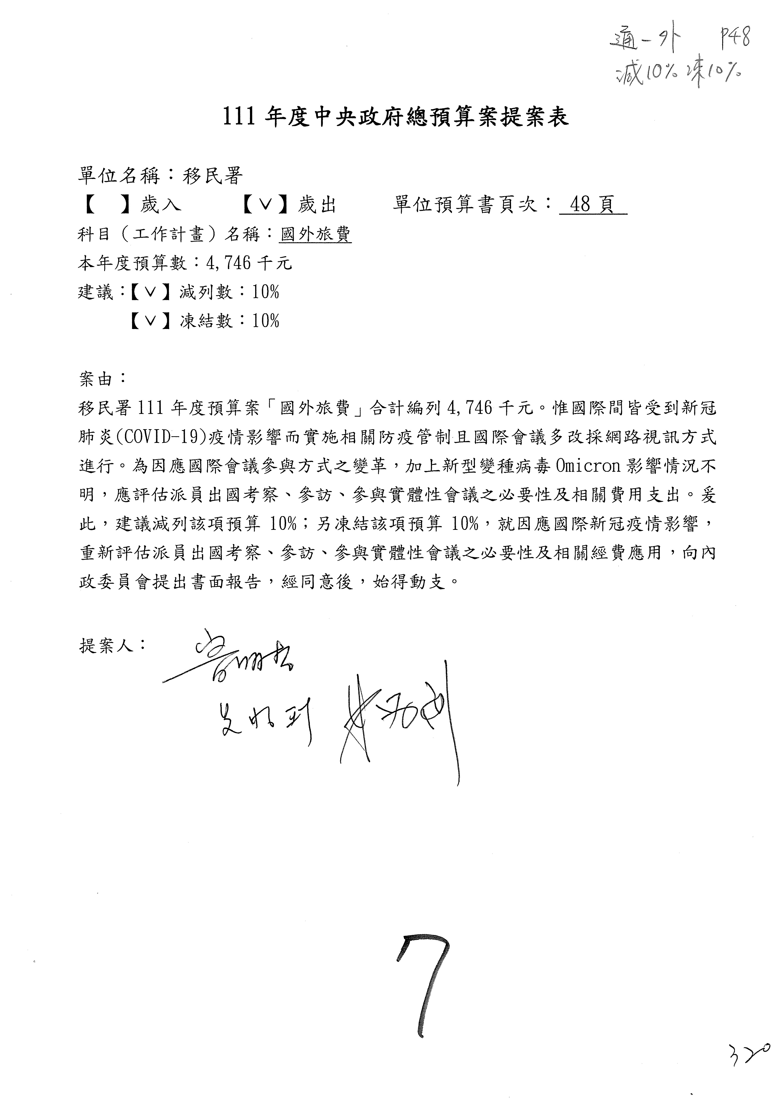 主席:其實我們審查預算也是要真的知道實際狀況,如果他們用得到,我們一定給他們用,所以等一下還是告訴我們今年的使用狀況,其實今年是最嚴重的,我預測明年的疫情應該會比今年稍緩。今年到底用了多少?一千多萬的出國旅費,你用了多少,我們大概也會知道說明年大概可以使用多少,你把今年用多少的數字給我們,我們再來衡量要凍結多少,就會比較清楚。好,這個案子我們就先凍結20%,提書面報告後,始得動支。但是你今年使用國外旅費(含大陸旅費)的使用率是多少,即編列多少、使用多少,等一下提供數字給我們,讓大家知道。否則,老實講,用得到、用不到,我們也真的不知道。等一下提供資料。