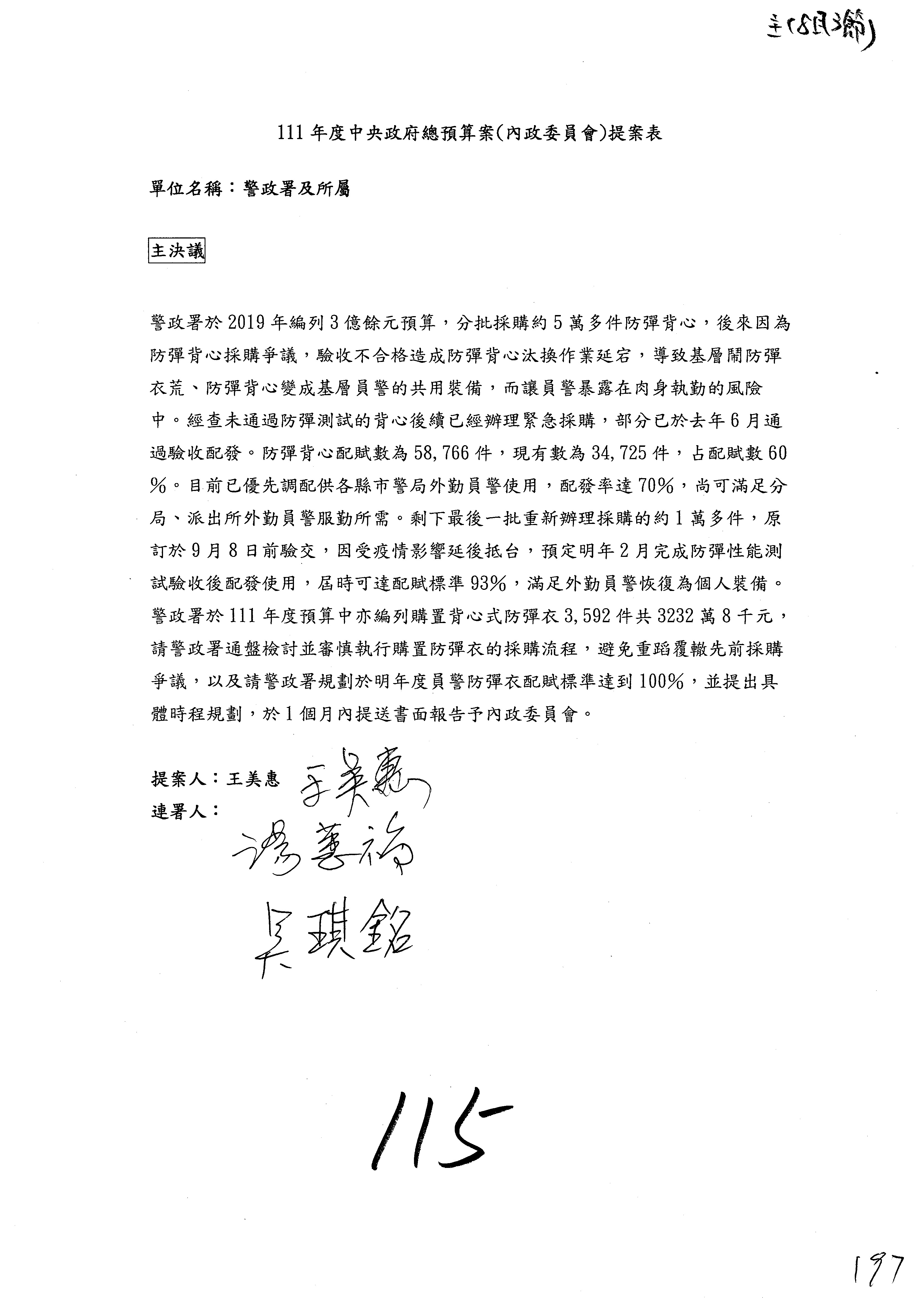邱委員顯智:主席,我覺得警政署要特別重視這一案,這是有關基層員警執勤安全的問題,剛剛聽警政署的報告,要到明年配賦率才能達到94%,這是個人的裝備,一個派出所裡面假設有30位員警,應該是每一個人都要有一件,而且是要經過美國國家司法協會的IIIA級防彈標準。再者,日後採購也應該要分批採購,而不是整批到期才做採購,否則當驗不過的時候,問題就大了。