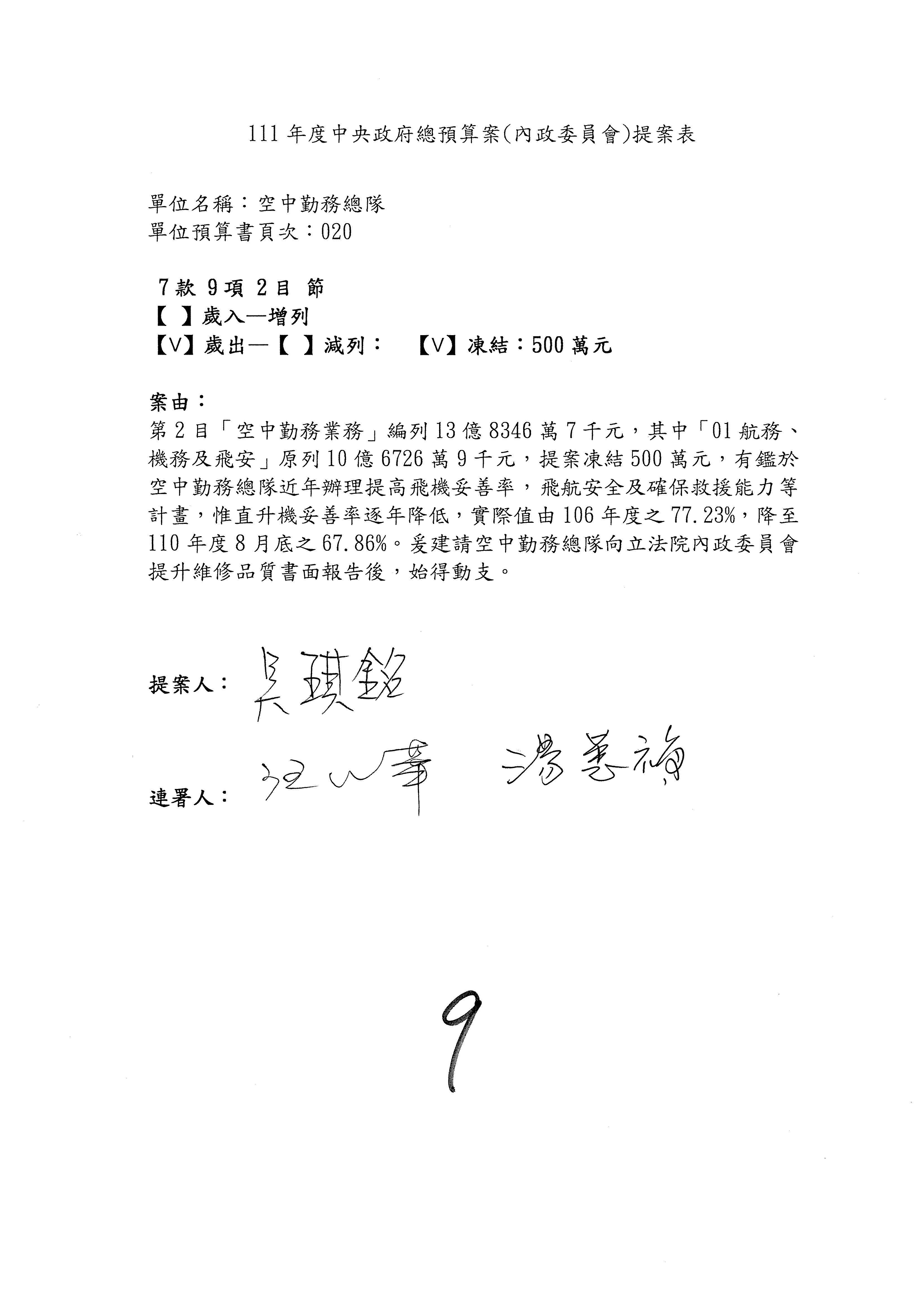 吳委員琪銘:好的,那麼本席瞭解了,希望你們能夠重視裝備的安全,畢竟救難工作都是由空勤總隊在執行,所以還是必須注意飛機的安全性。原本本席是提案凍結500萬元,等一下我會把這個案子撤回。