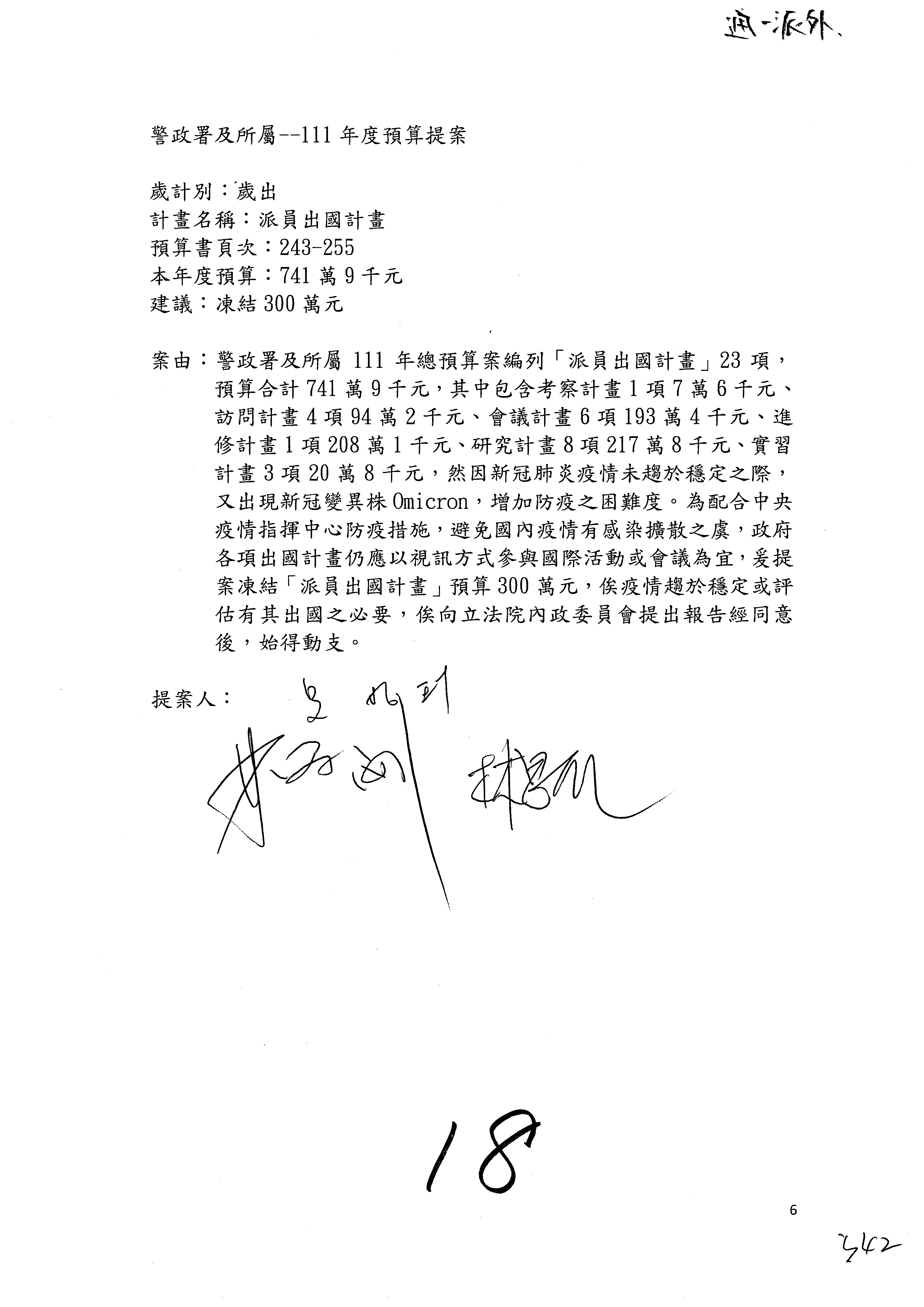 再來處理國外旅費,這部分不是什麼一百多萬元,而是一千多萬元,這是什麼情形?說明一下國外旅費到底是多少,針對第7、第8、第9、第10、第11、第12、第13、第14、第15、第16、第17、第18案,都是派員出國跟國外旅費,其實它裡面包含刑事警察、初級警察、警務管理、警政業務項下加強警察教育訓練,很多的項目裡面都有國外旅費,所以我們就全部統一處理。