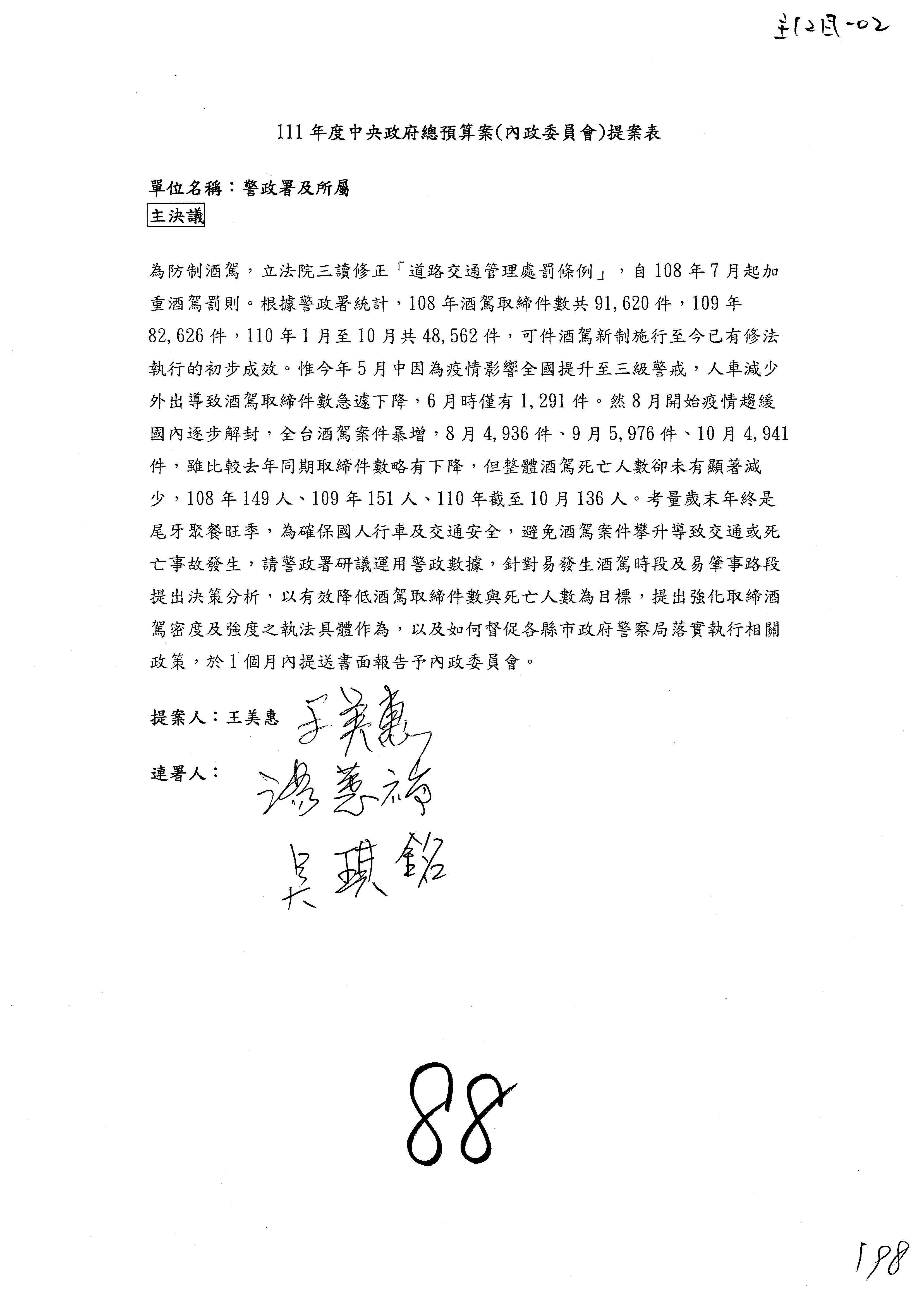 繼續我再講一下第27案。警方處理交通事故時,不管是酒駕或是其他類型,都有一個道路交通事故調查報告表,必須做彙整。其實基層員警在處理交通事故的時候,藉由這個表就能夠知道臺灣的交通事故每年死亡3,000人,受傷將近50萬人,這是非常、非常嚴重的。而這個調查報告表的欄位是蠻多的,如果仍然以手動登載的話,可能會非常不利於統計分析,其實這個欄位有非常多調整的地方。比如我跟署長講過,安全帽只有兩種,就是有戴跟沒有戴,如果能夠再把它細分,比如說有戴的部分,再細分是戴瓜皮帽、四分之三罩或全罩,這樣就可以再進一步分析,搞不好我們會認為在政策上是不是應該要做調整。比如針對戴瓜皮帽來講,像王美惠委員經常騎摩托車,戴瓜皮帽是不是不夠安全或是怎麼樣……