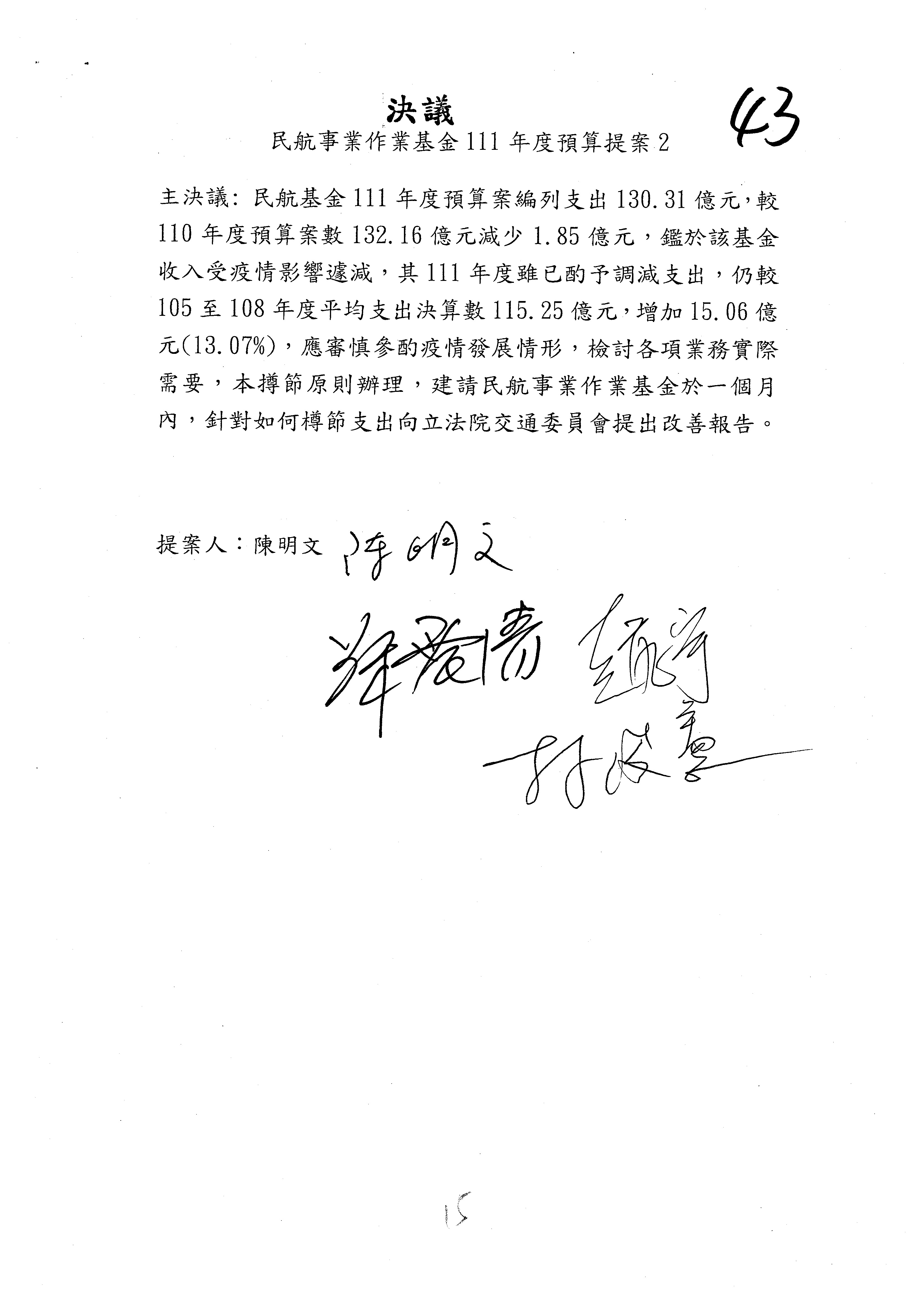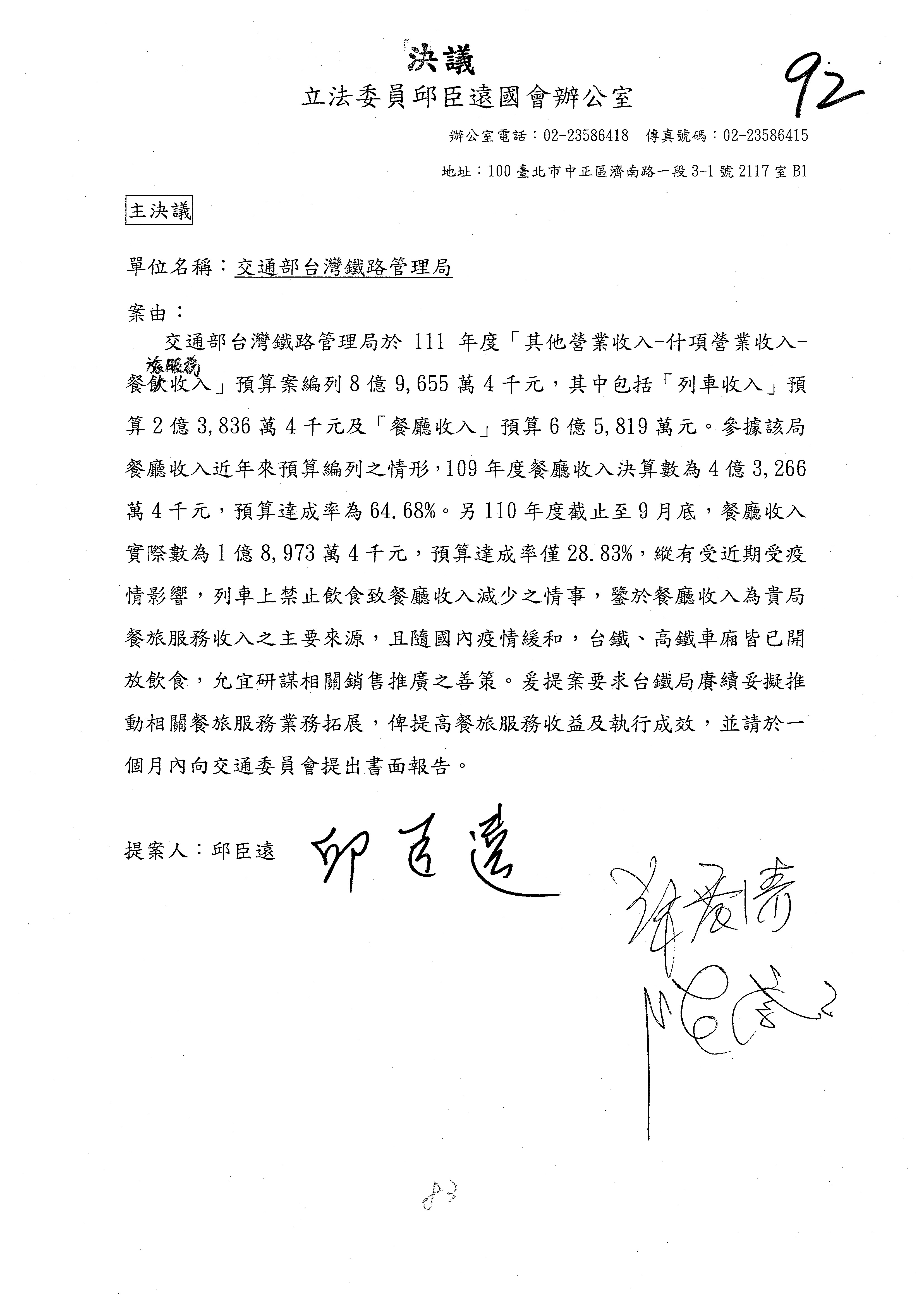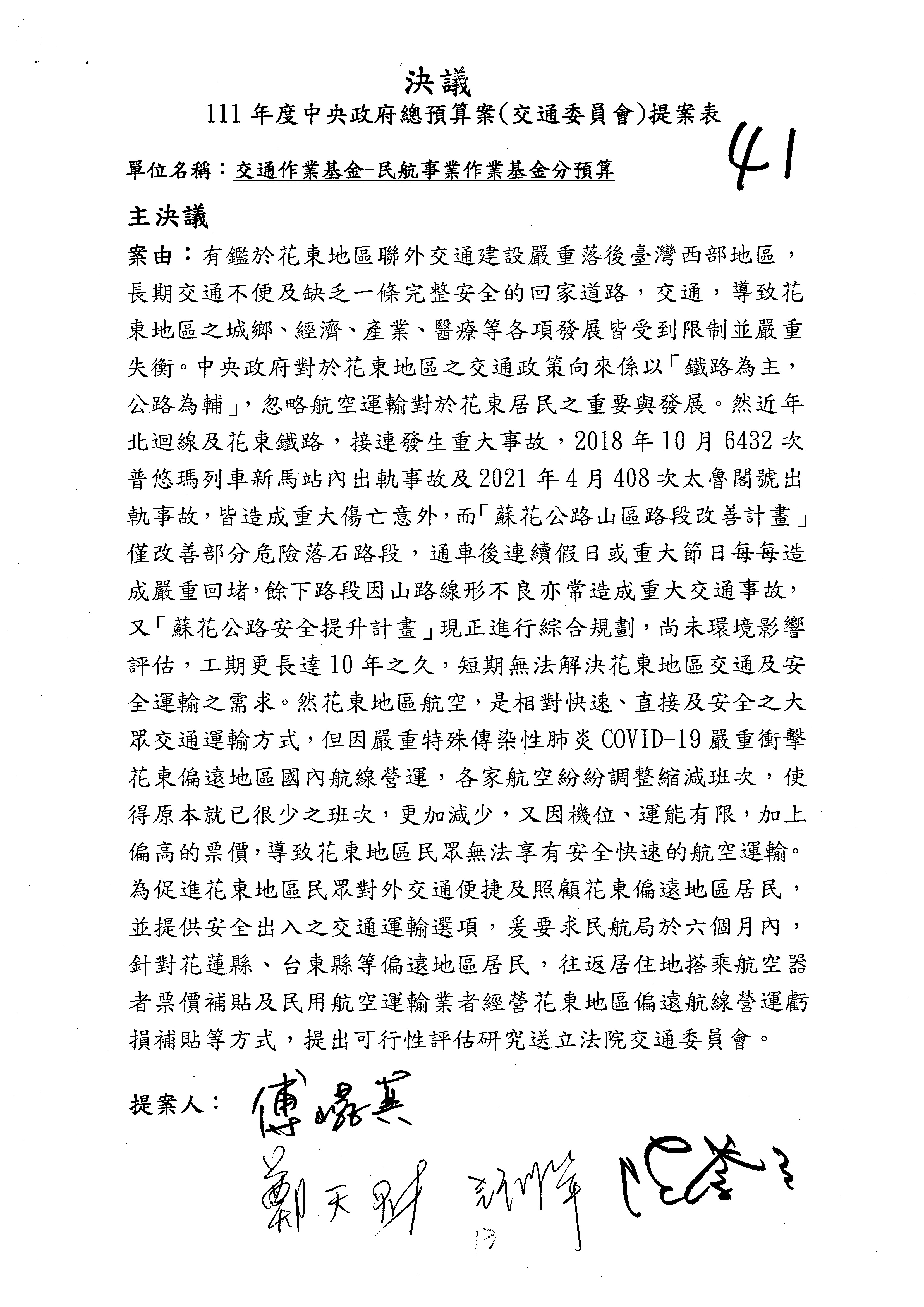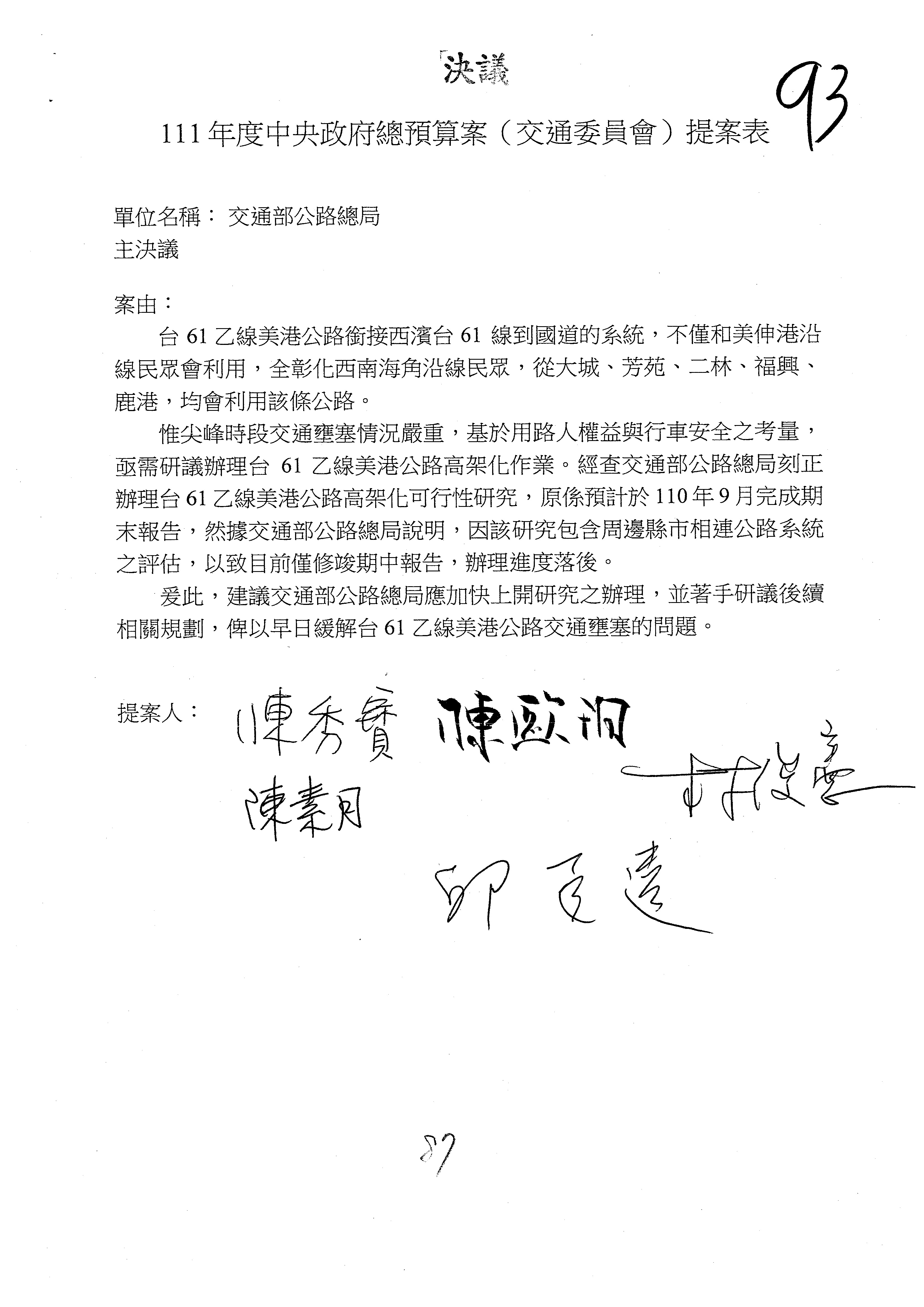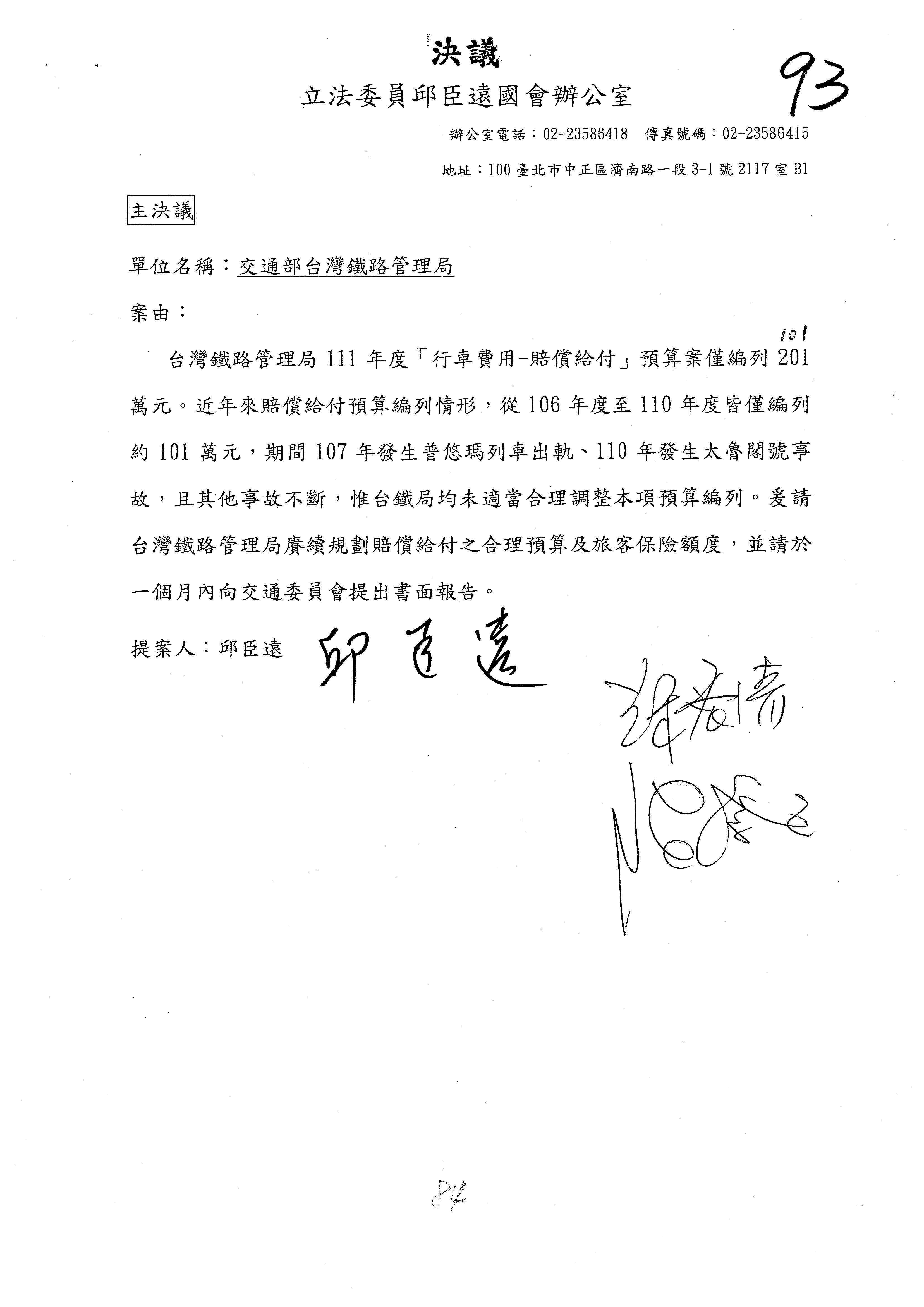 杜局長微:不好意思,報告召委,第93案有一個修正建議,就是倒數第2行有「合理預算及旅客保險額度……」能不能修成「合理預算及研議旅客保險……」?