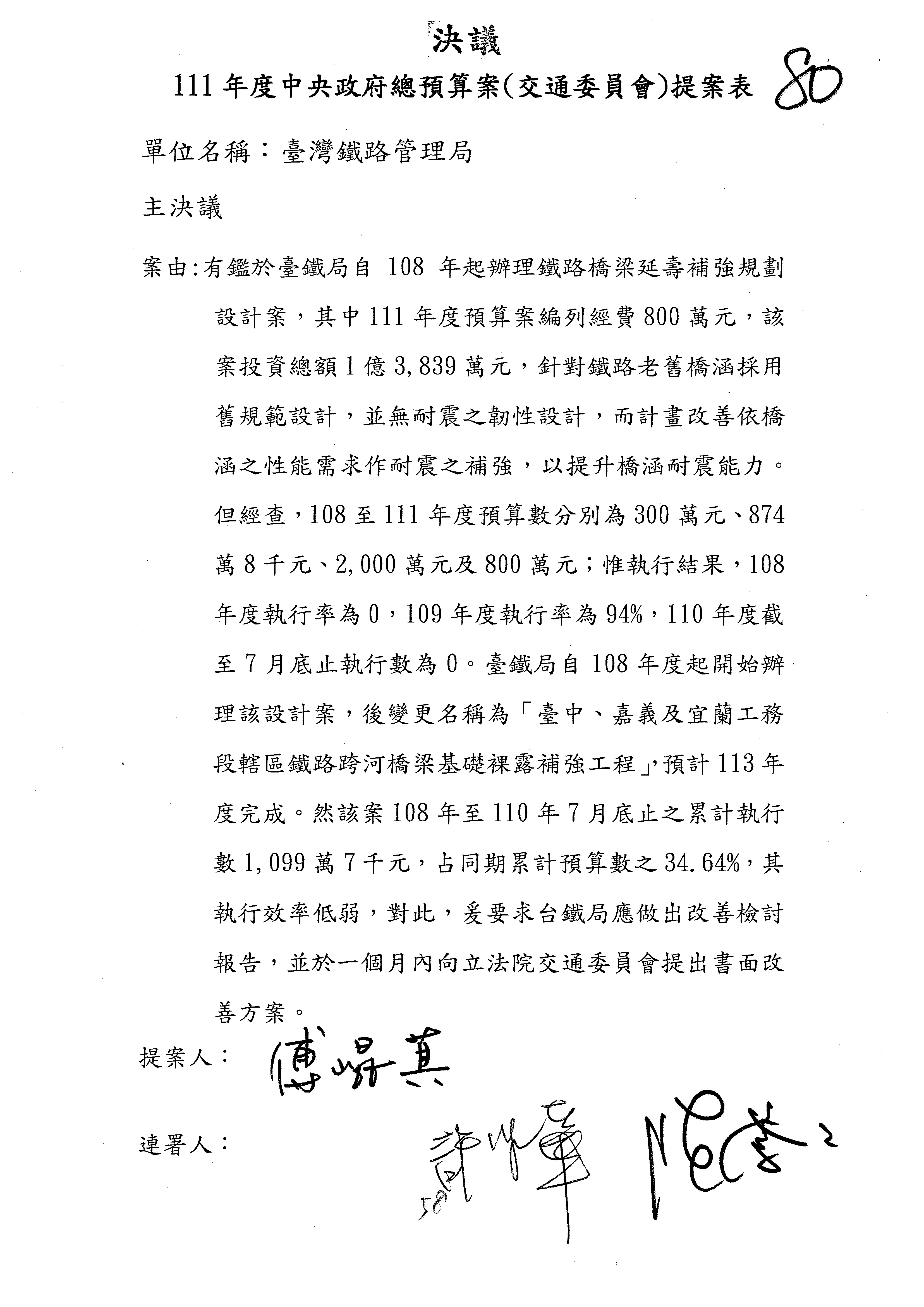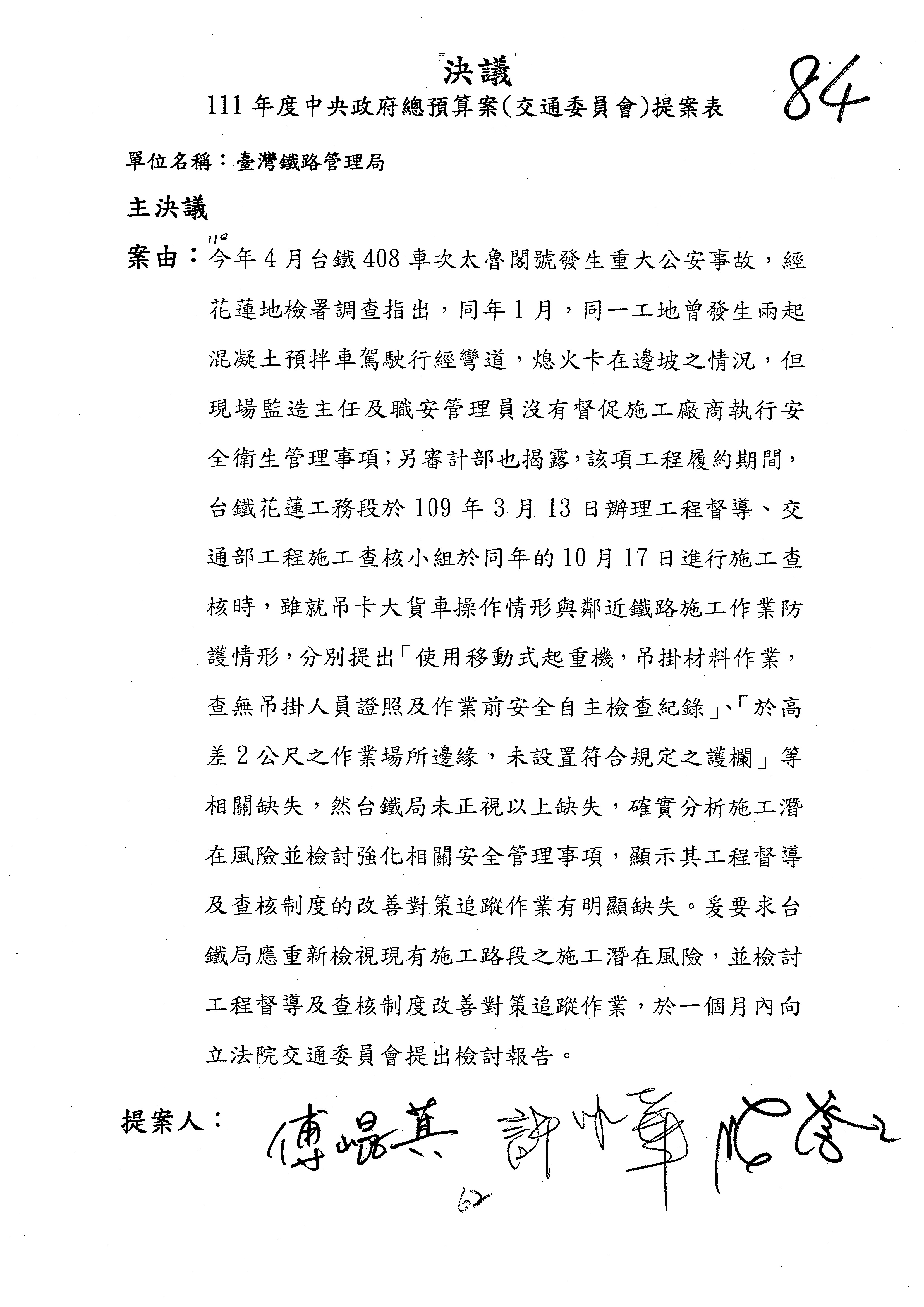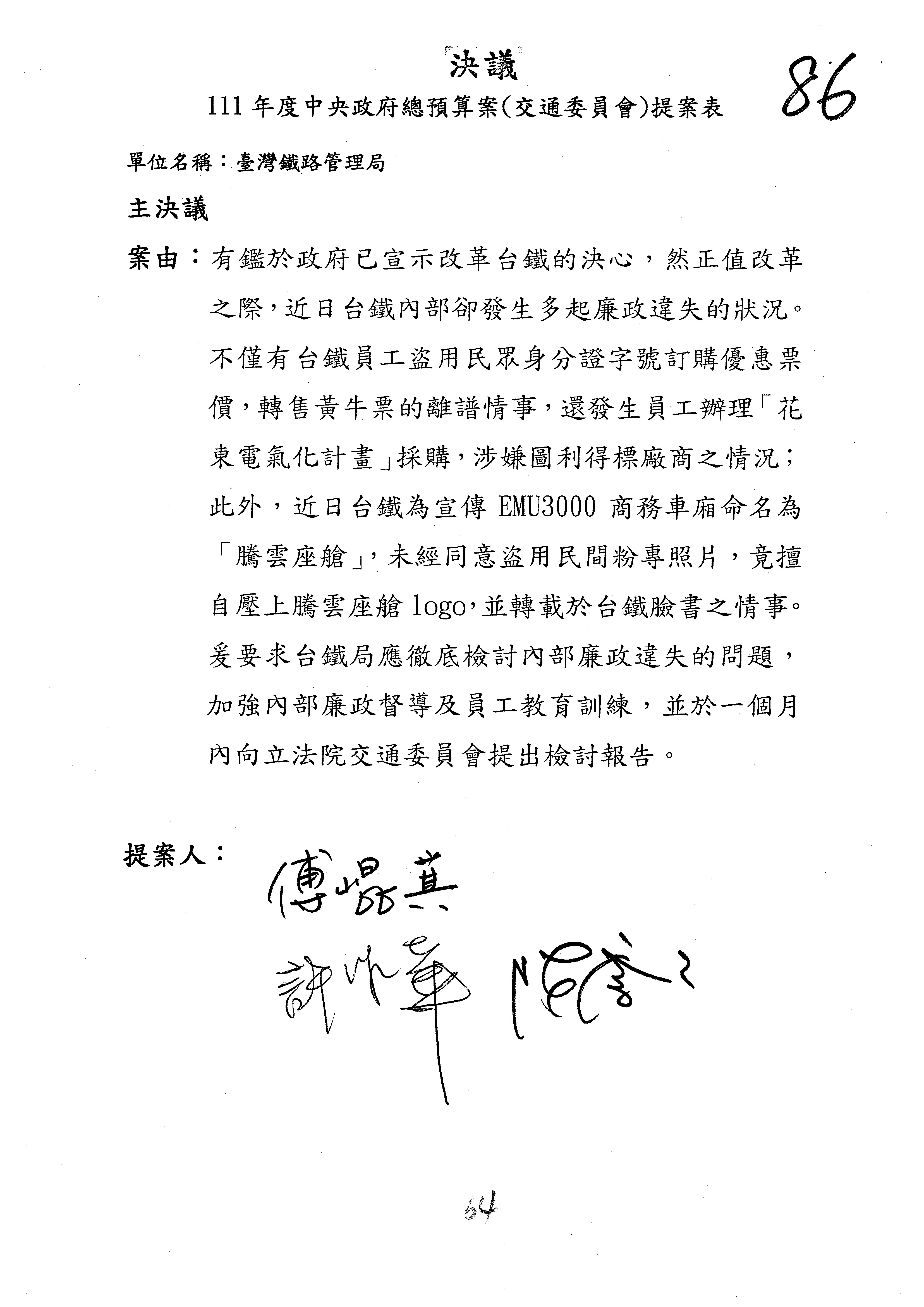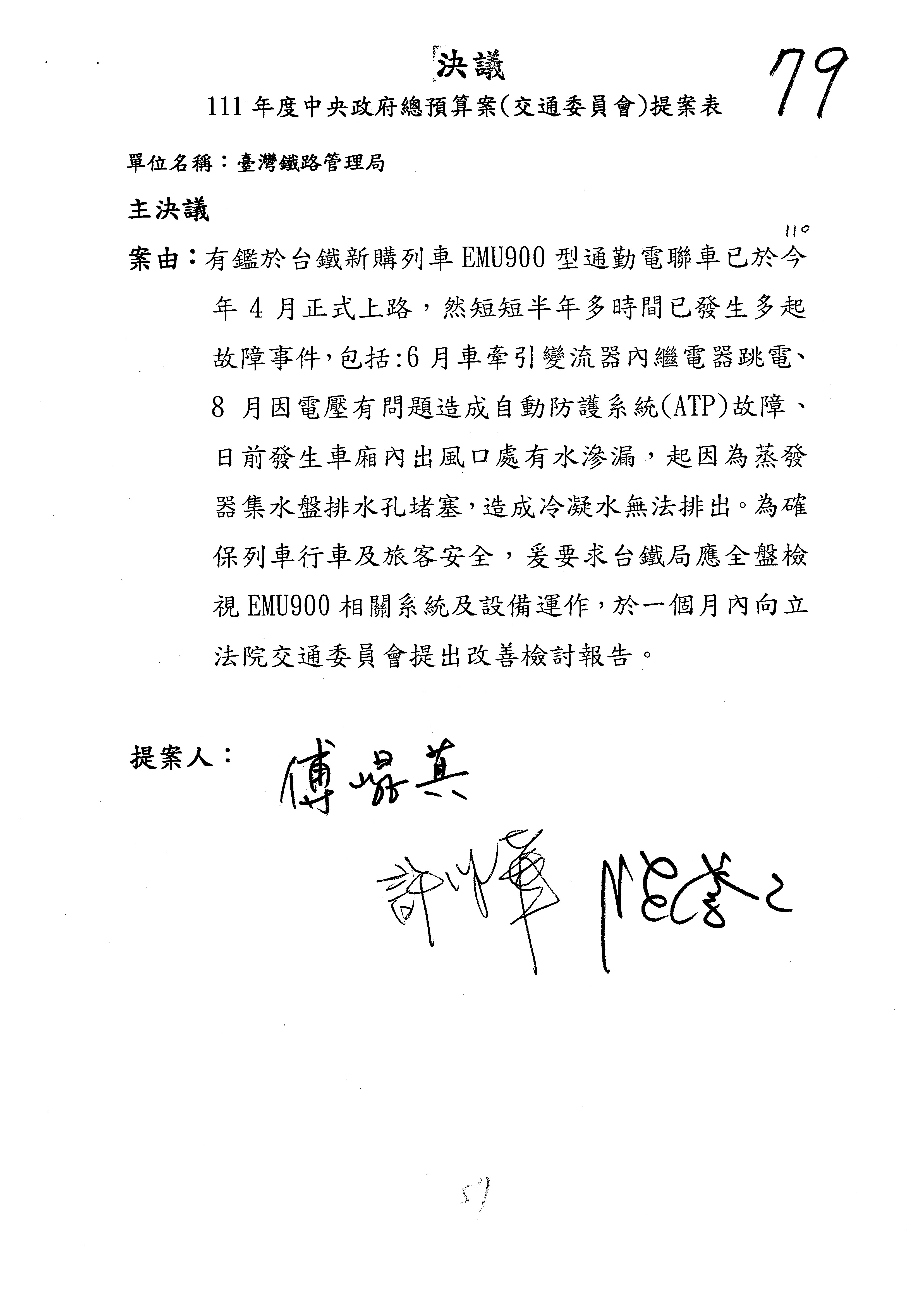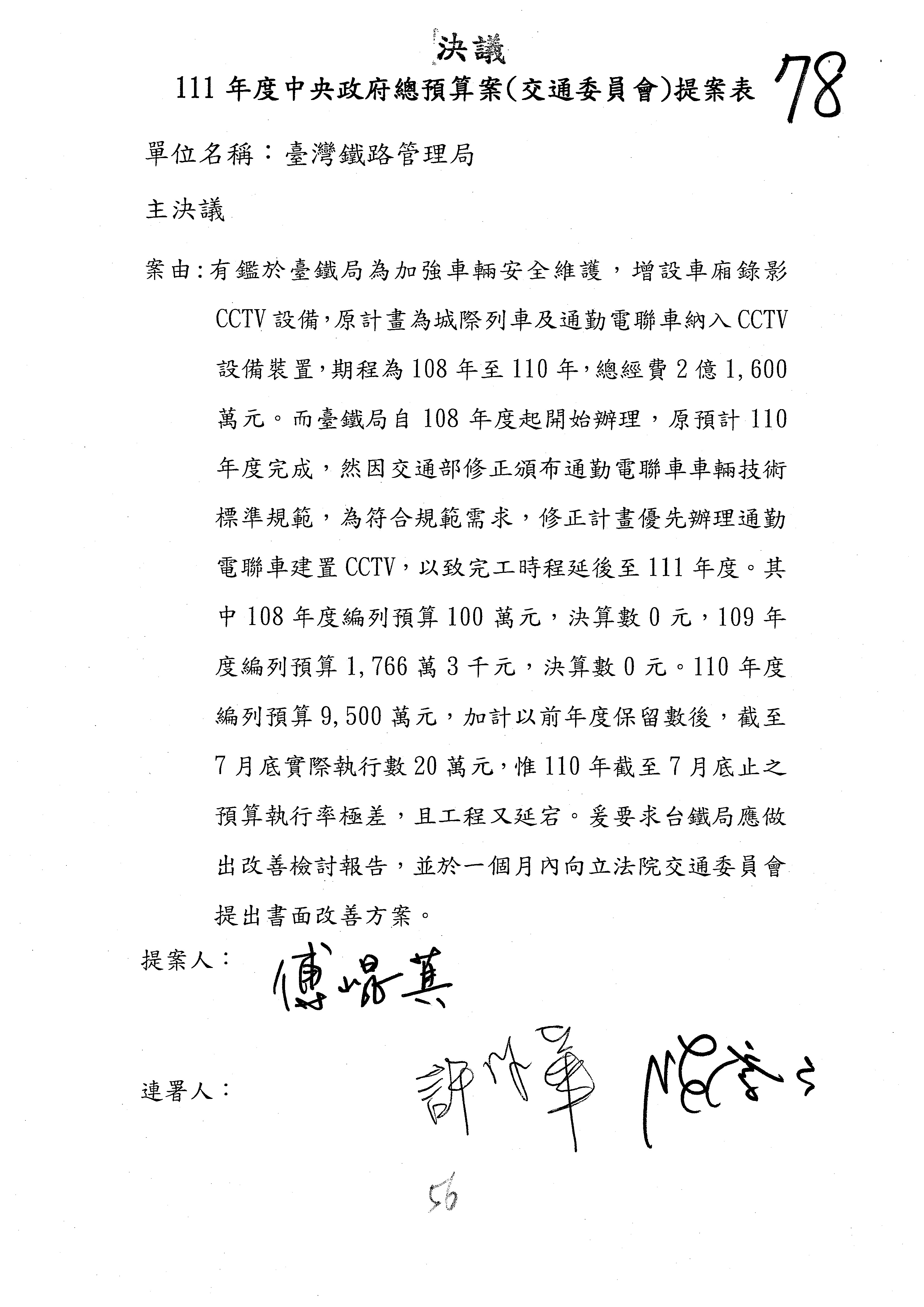 杜局長微:第78案建議倒數第3行的最後兩個字開始「應做出改善檢討報告……」,後面「並」刪掉,直接改為「爰要求臺鐵局於一個月內向立法院交通委員會提出書面改善檢討報告」。