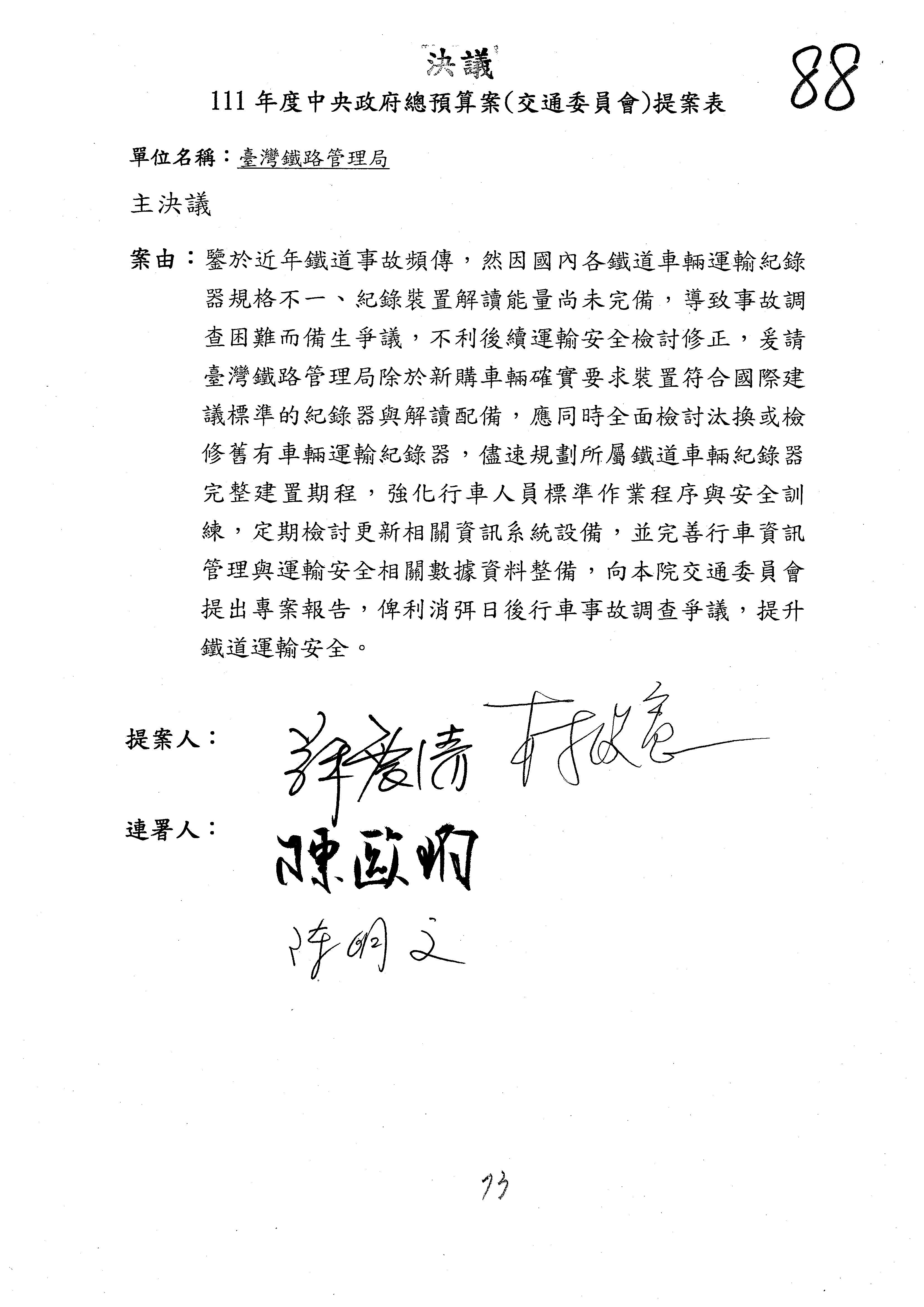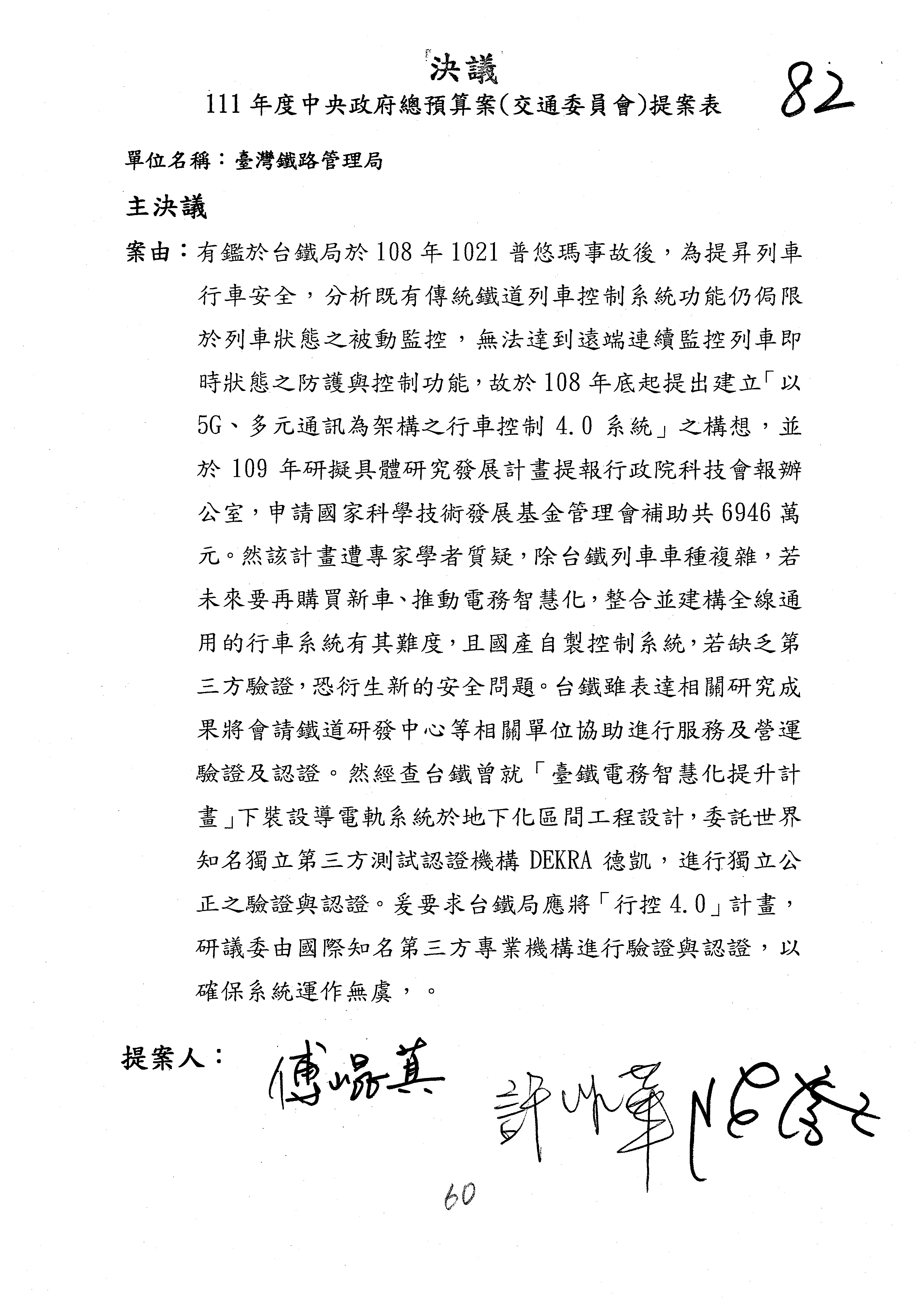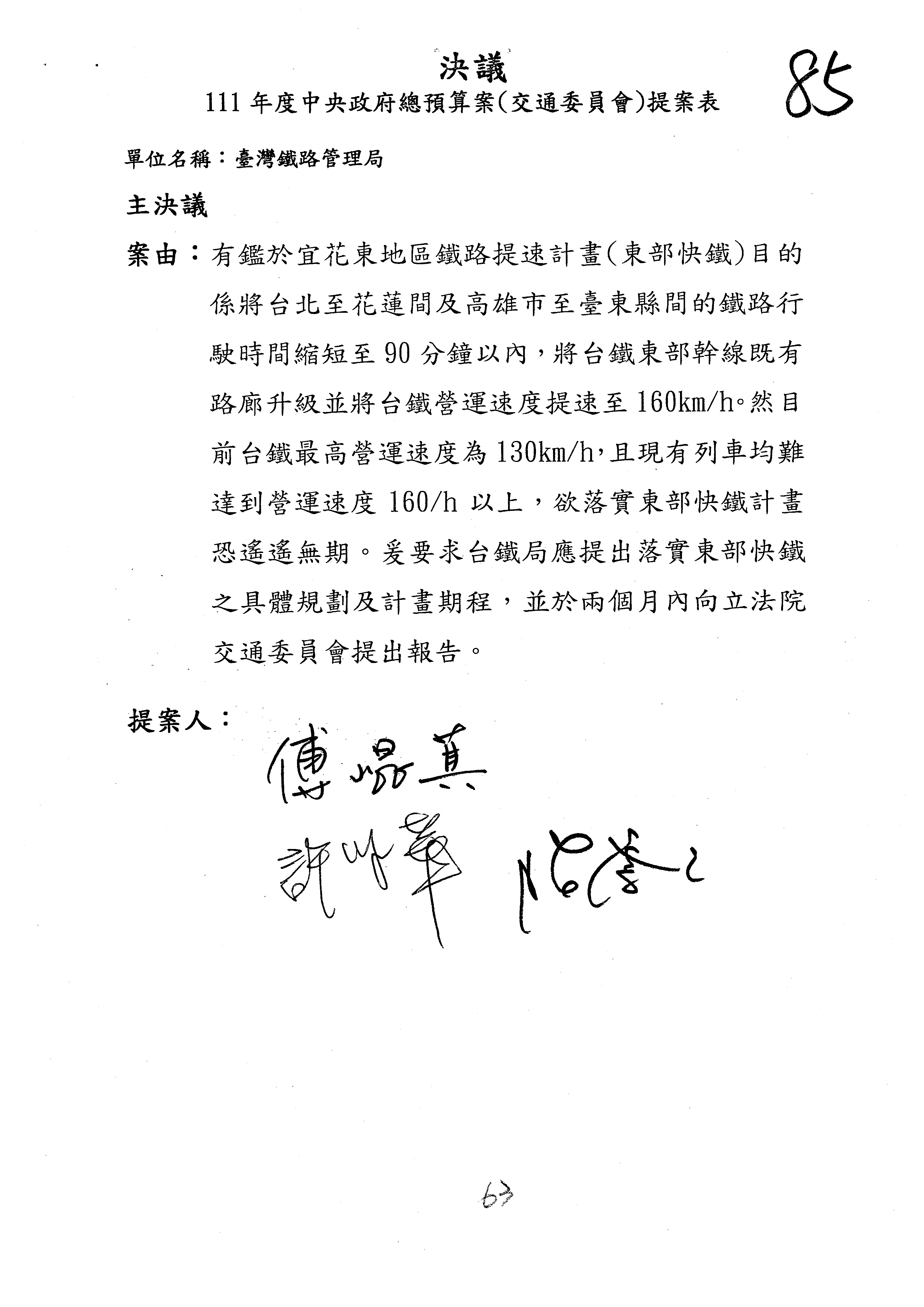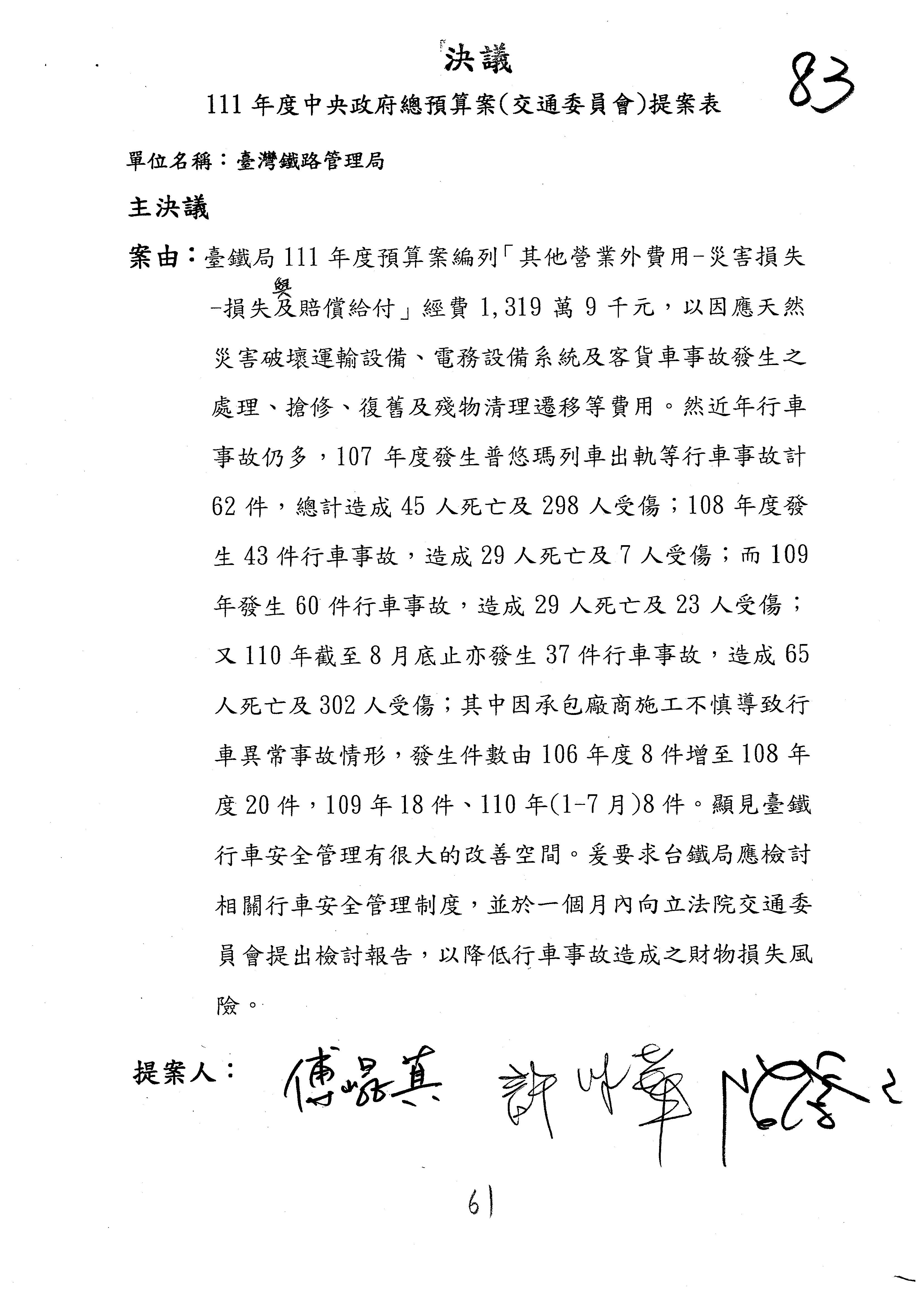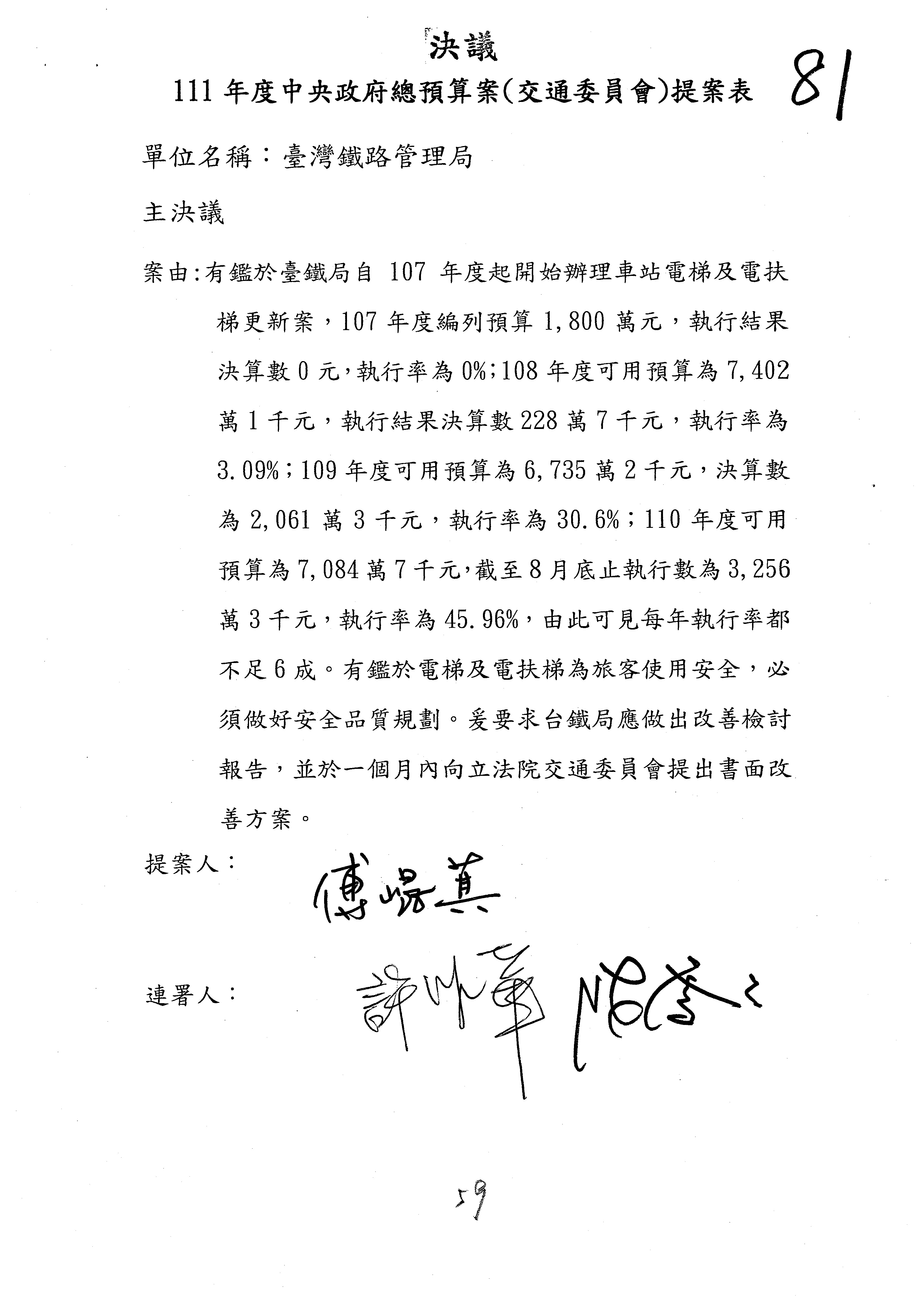 杜局長微:第78案建議倒數第3行的最後兩個字開始「應做出改善檢討報告……」,後面「並」刪掉,直接改為「爰要求臺鐵局於一個月內向立法院交通委員會提出書面改善檢討報告」。