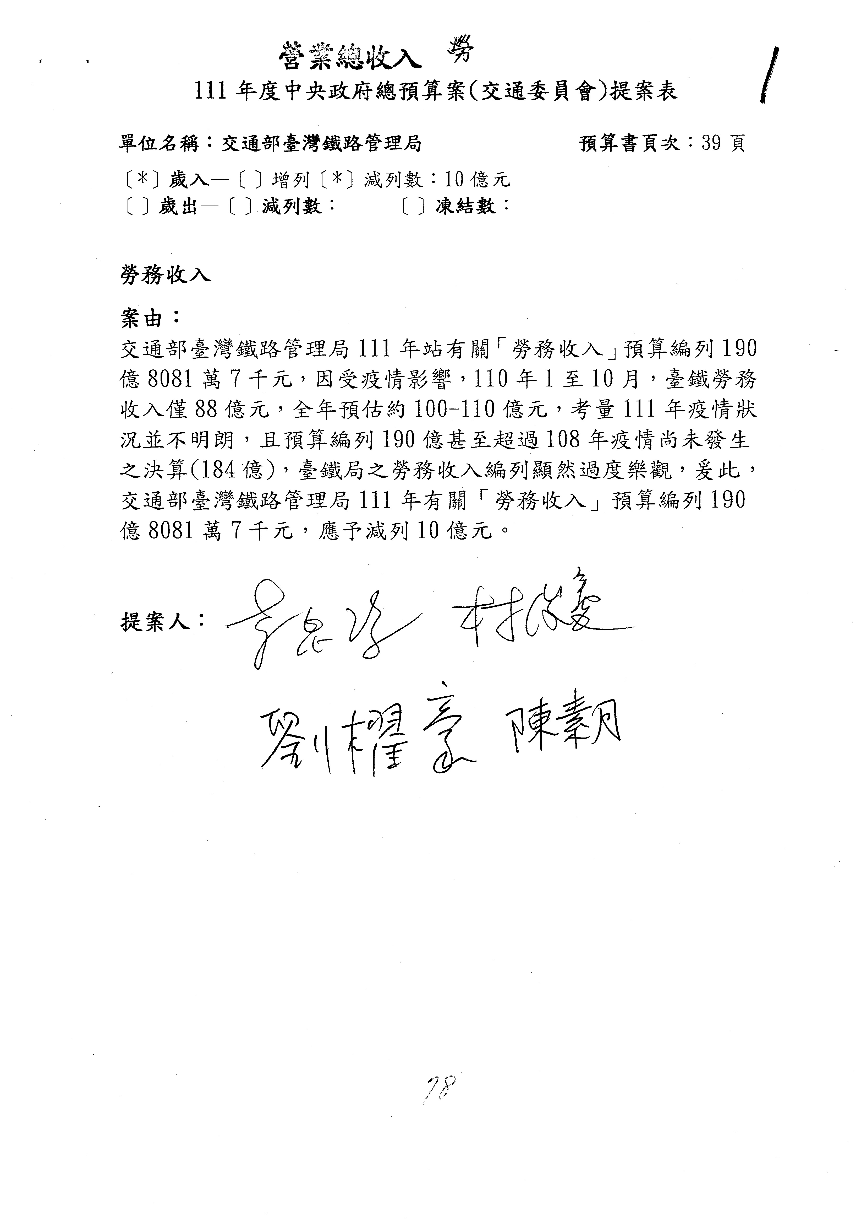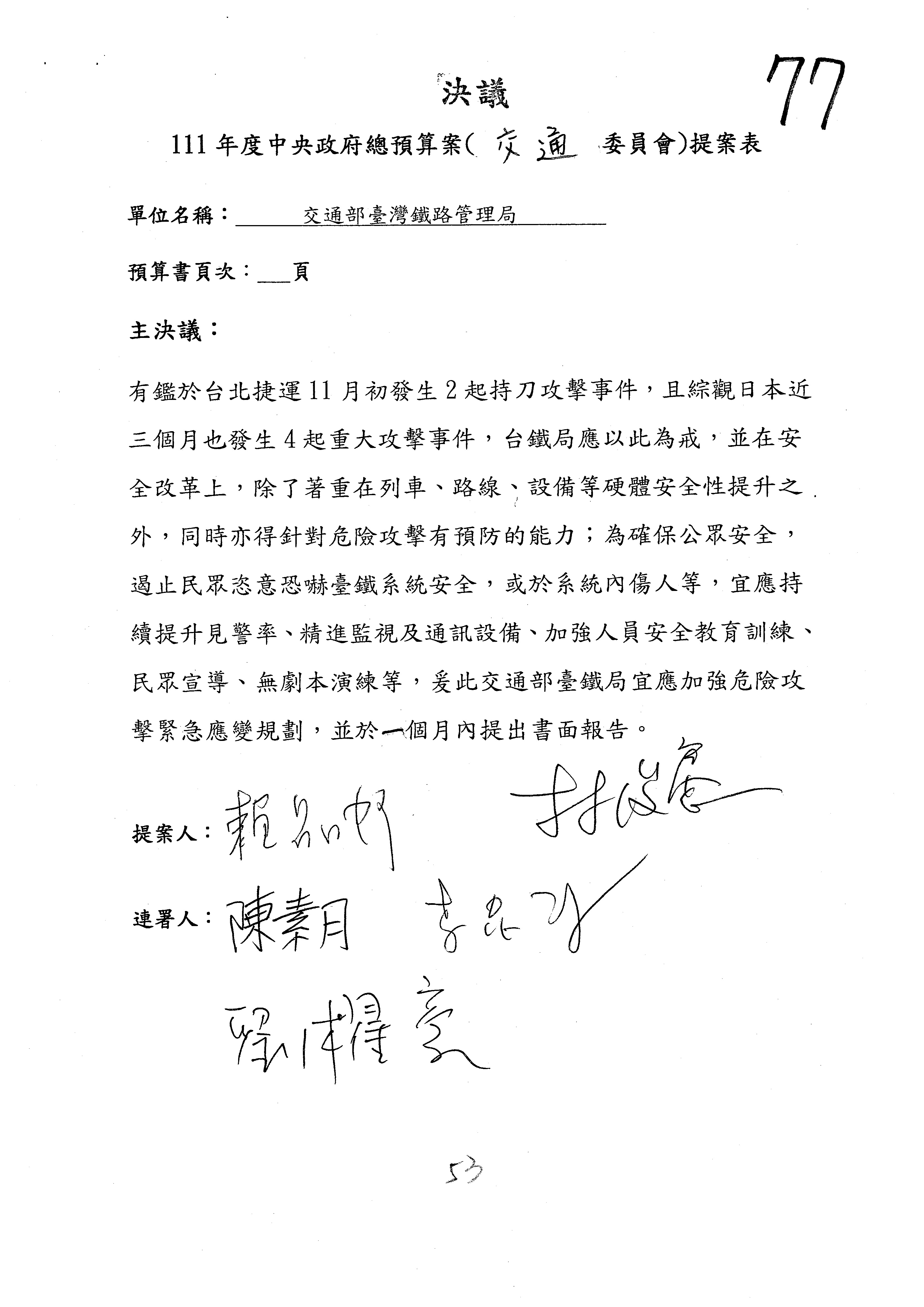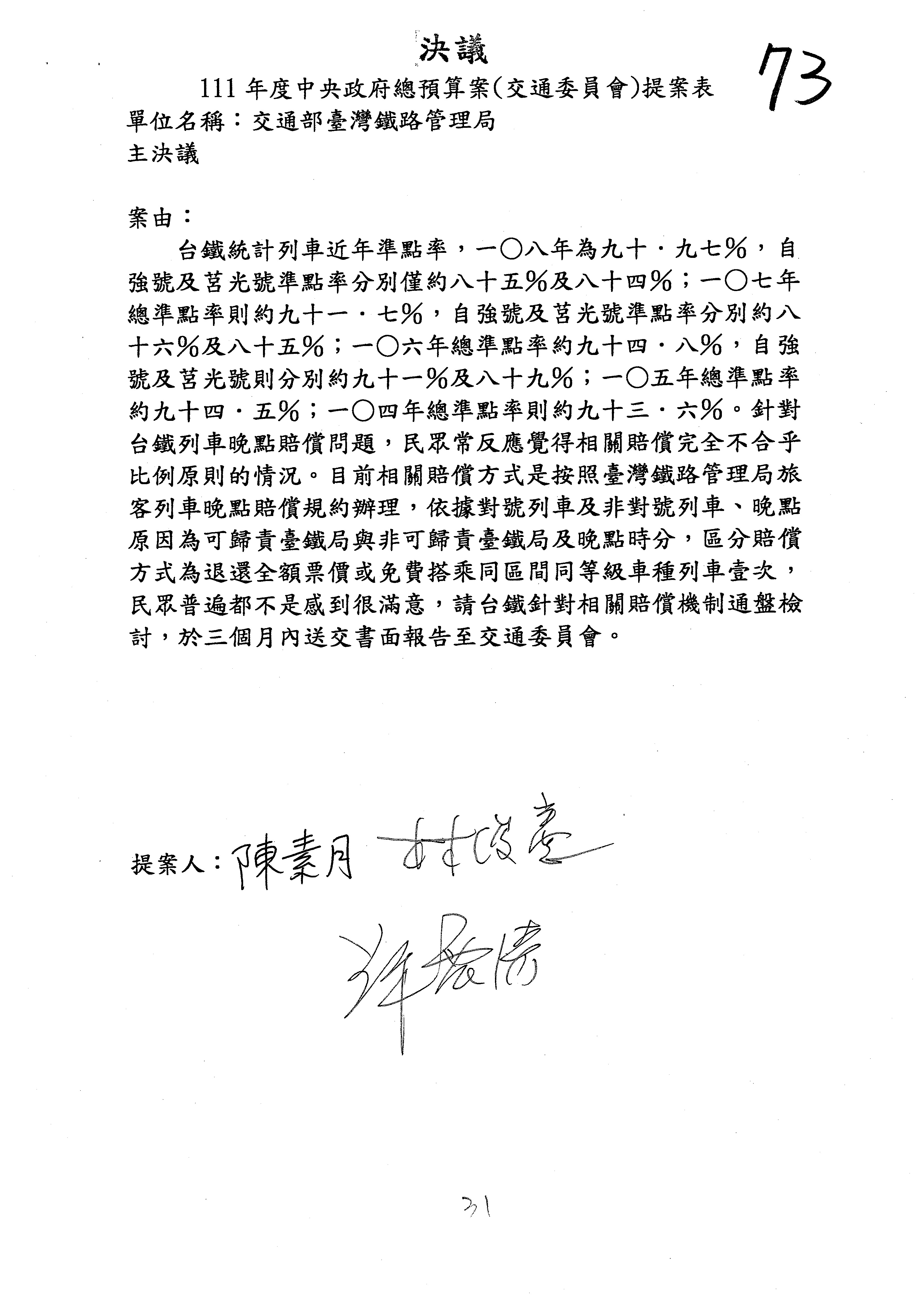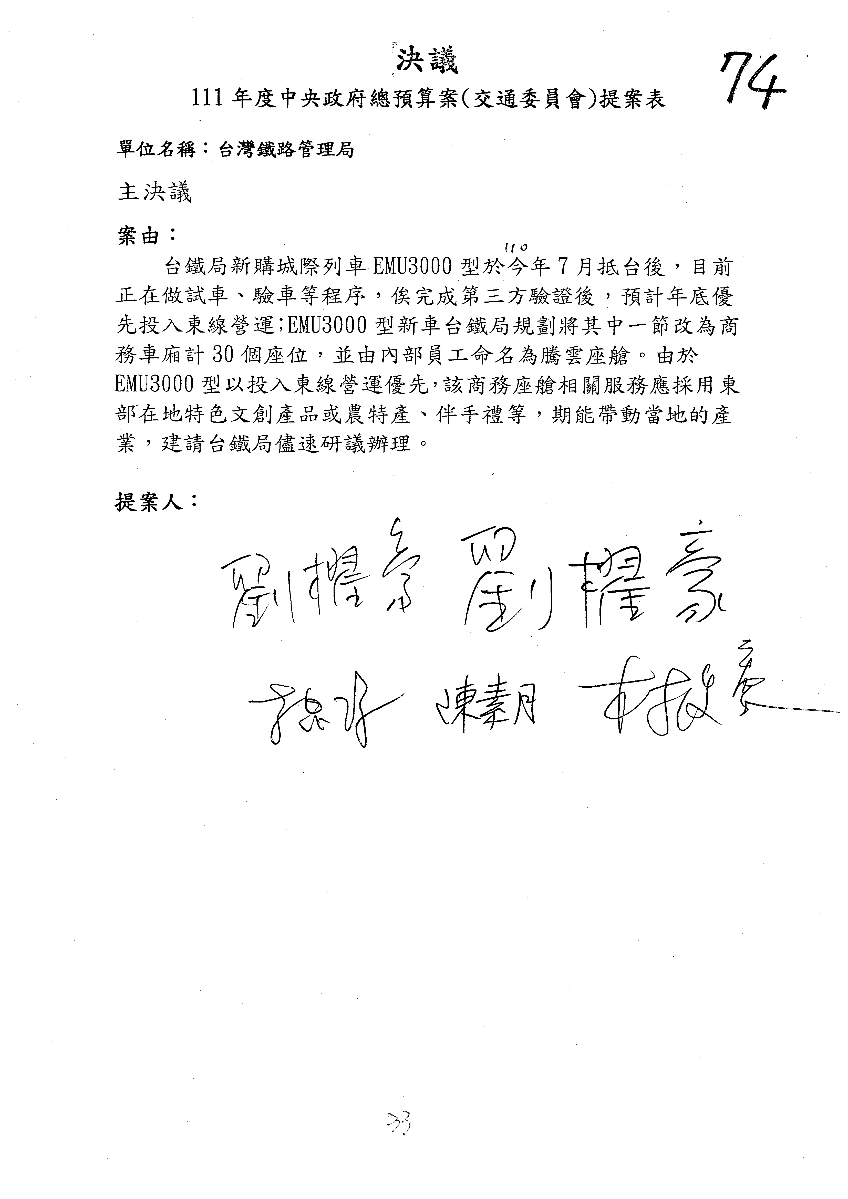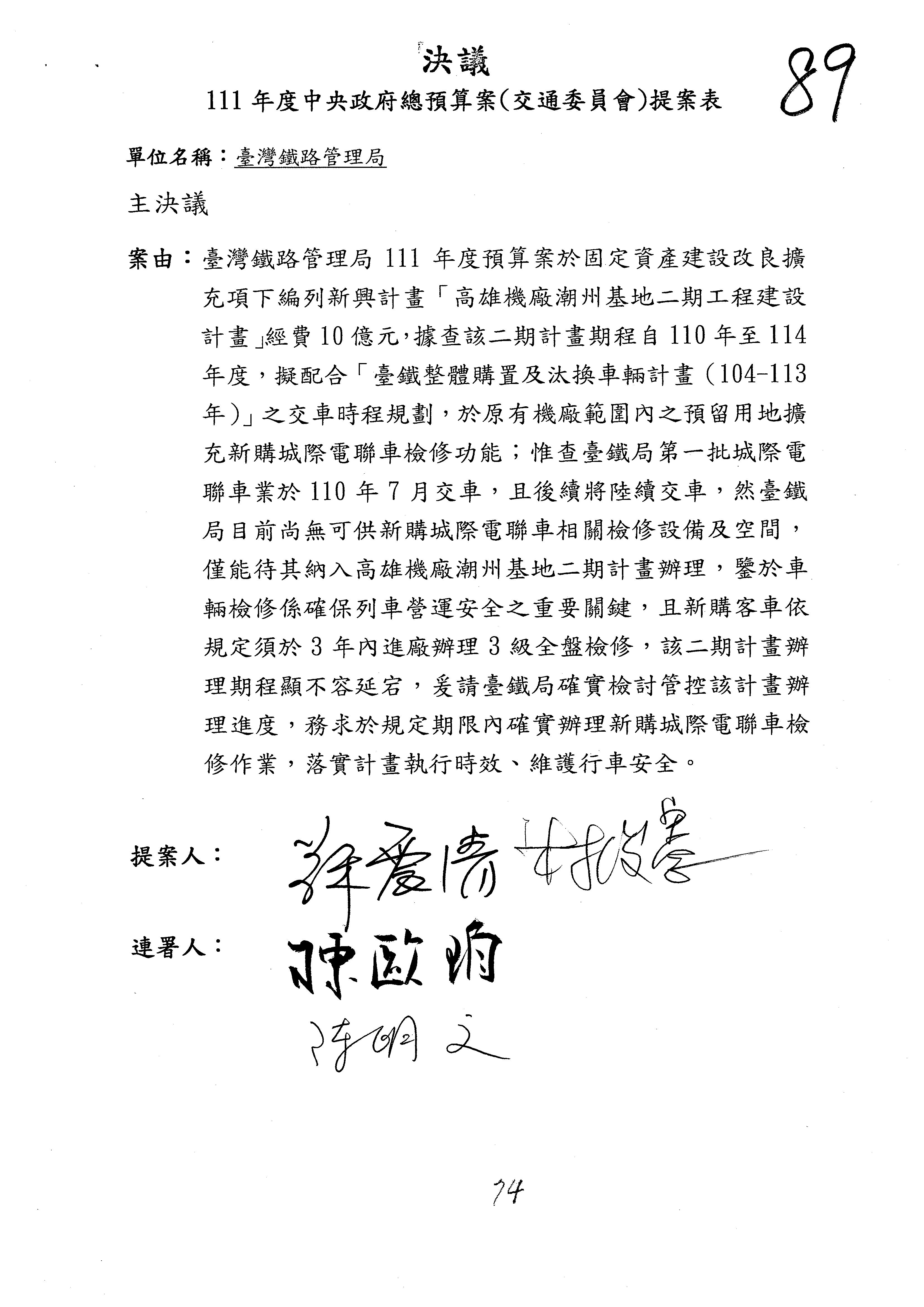 杜局長微:第78案建議倒數第3行的最後兩個字開始「應做出改善檢討報告……」,後面「並」刪掉,直接改為「爰要求臺鐵局於一個月內向立法院交通委員會提出書面改善檢討報告」。
