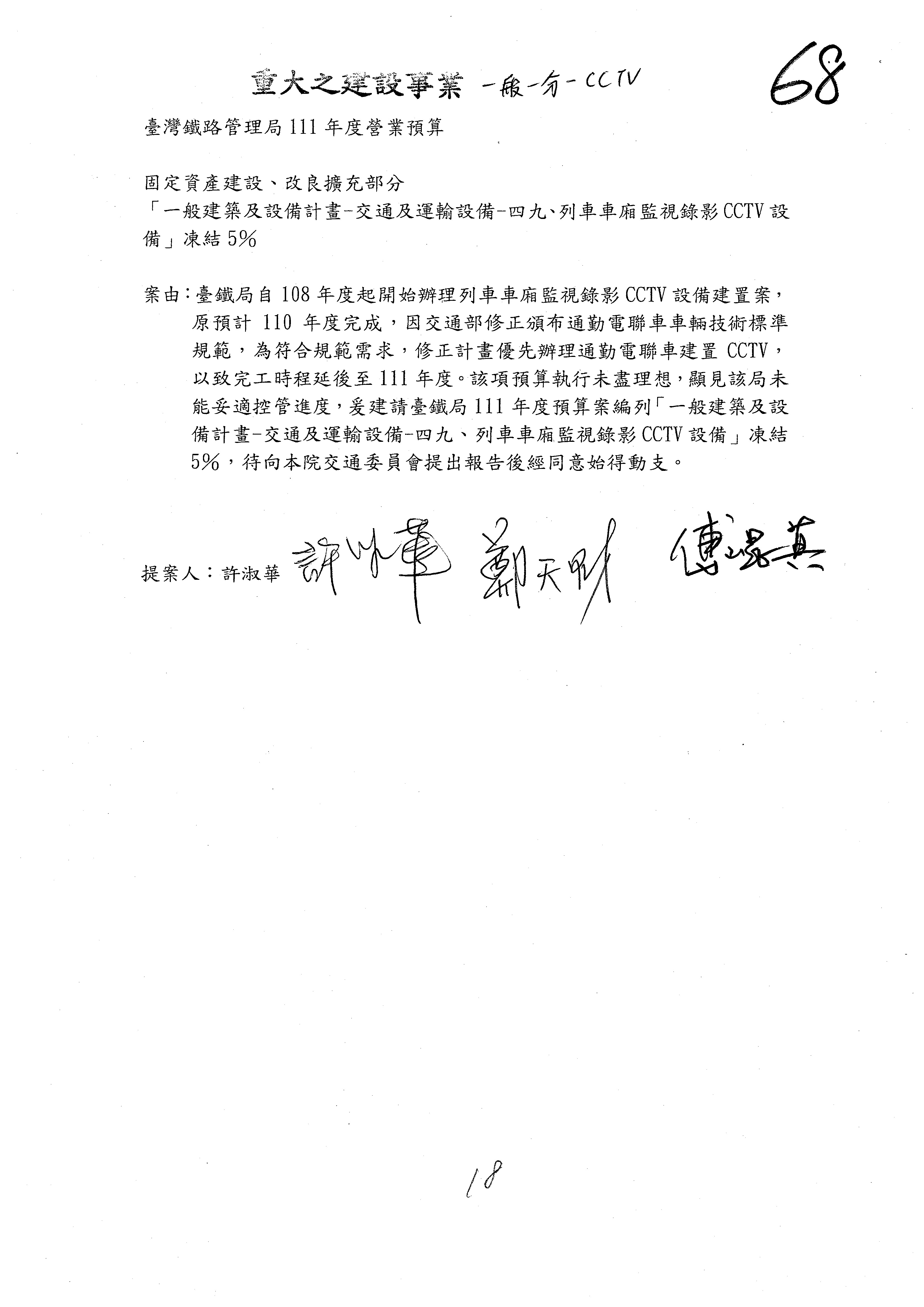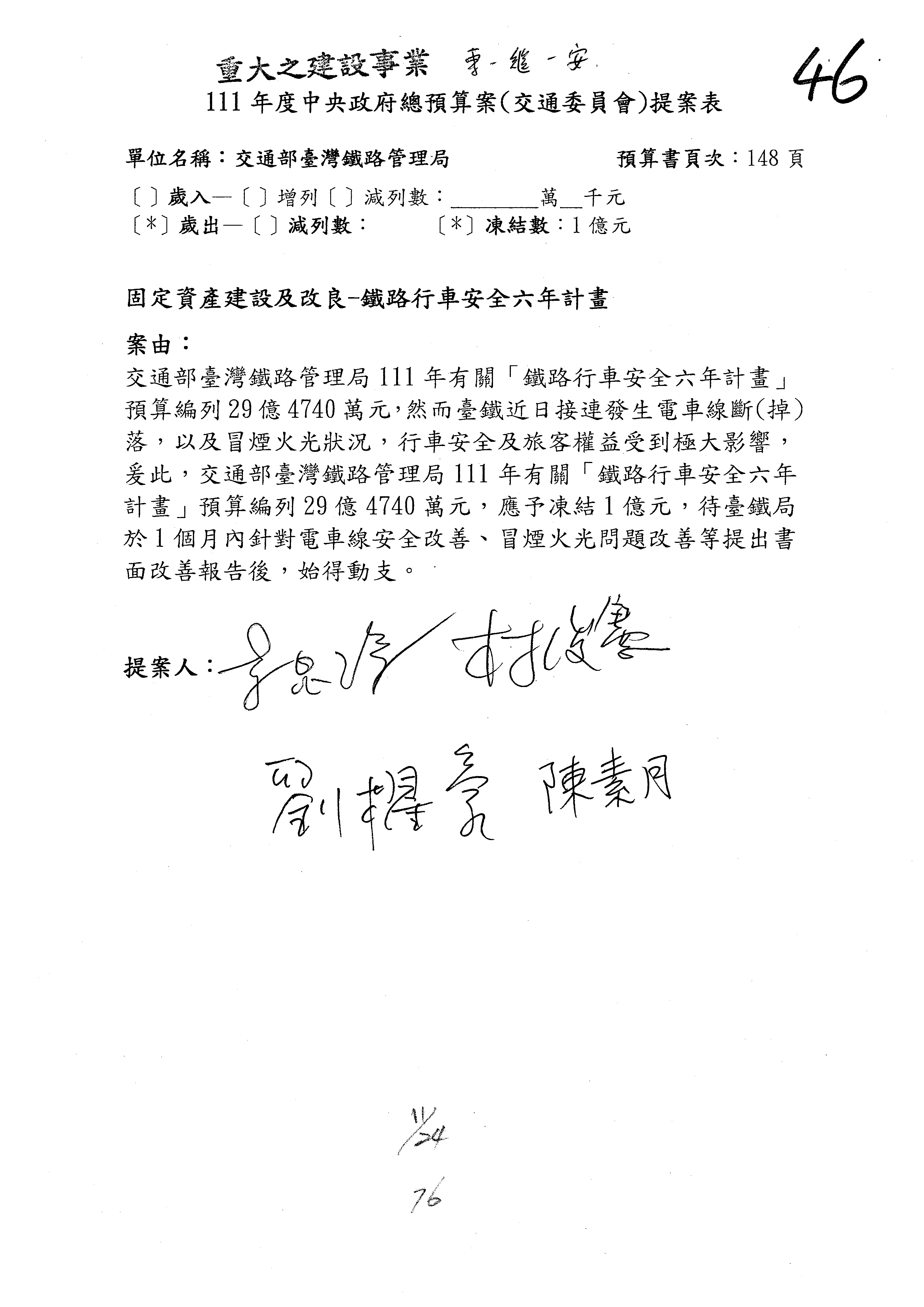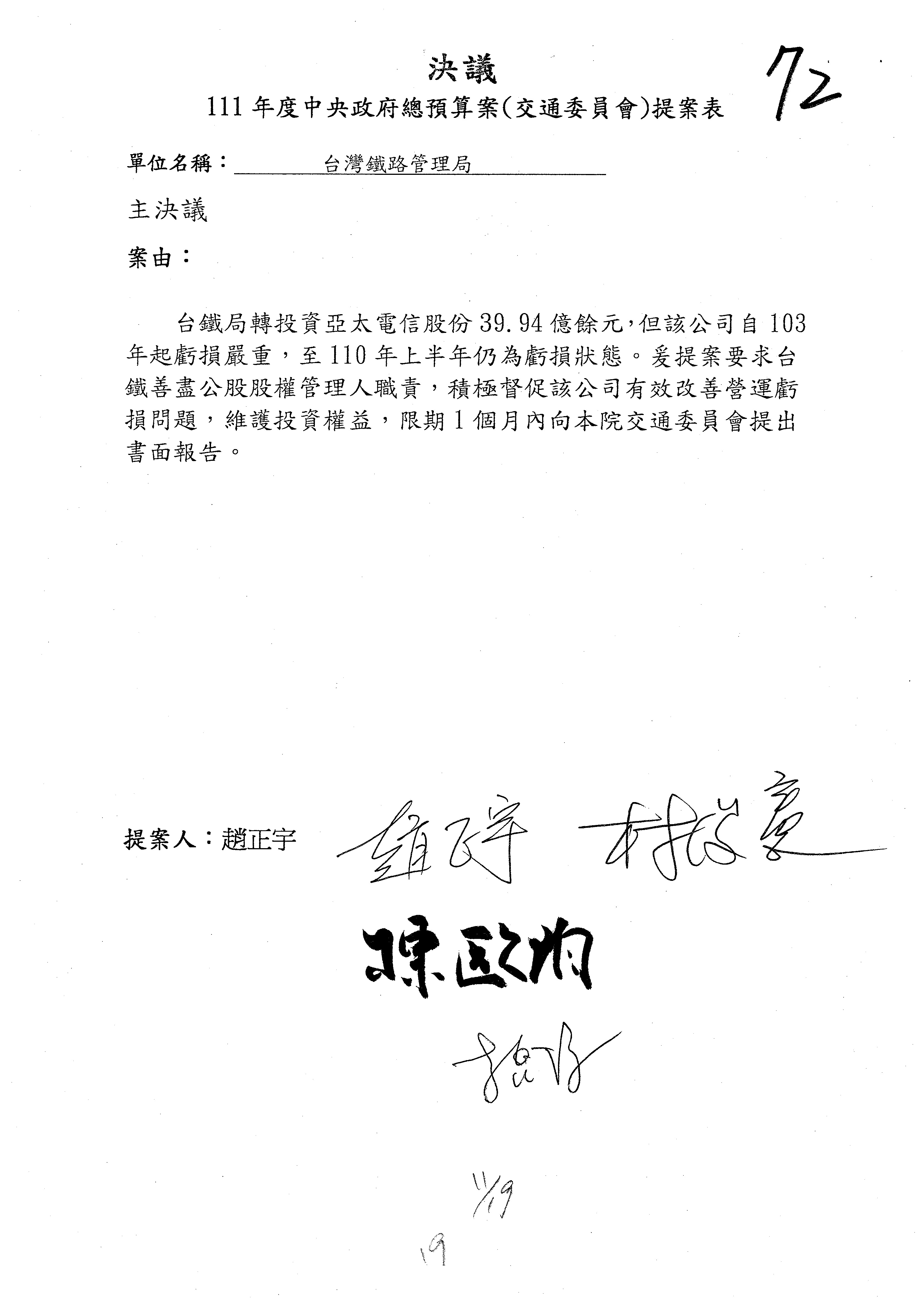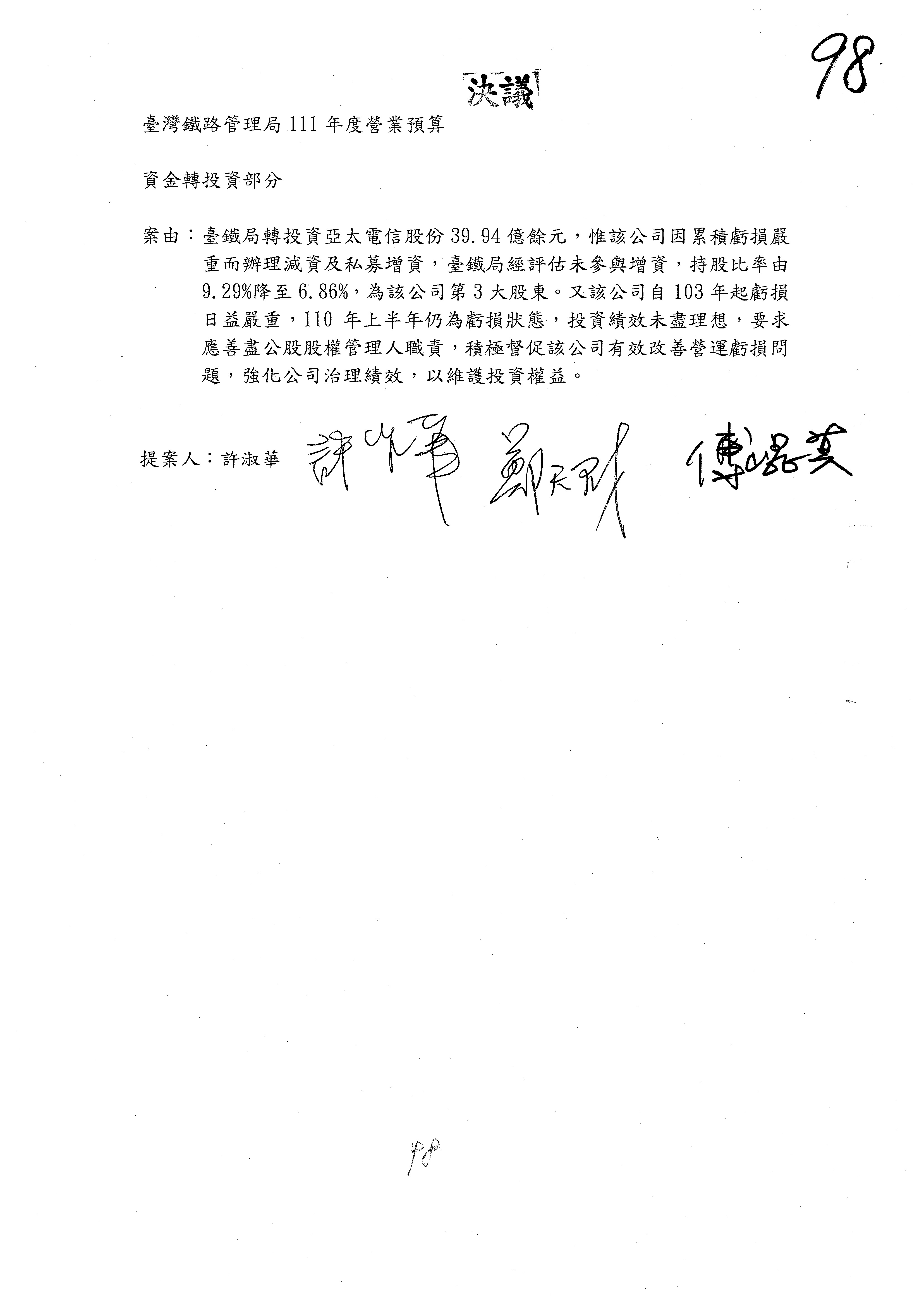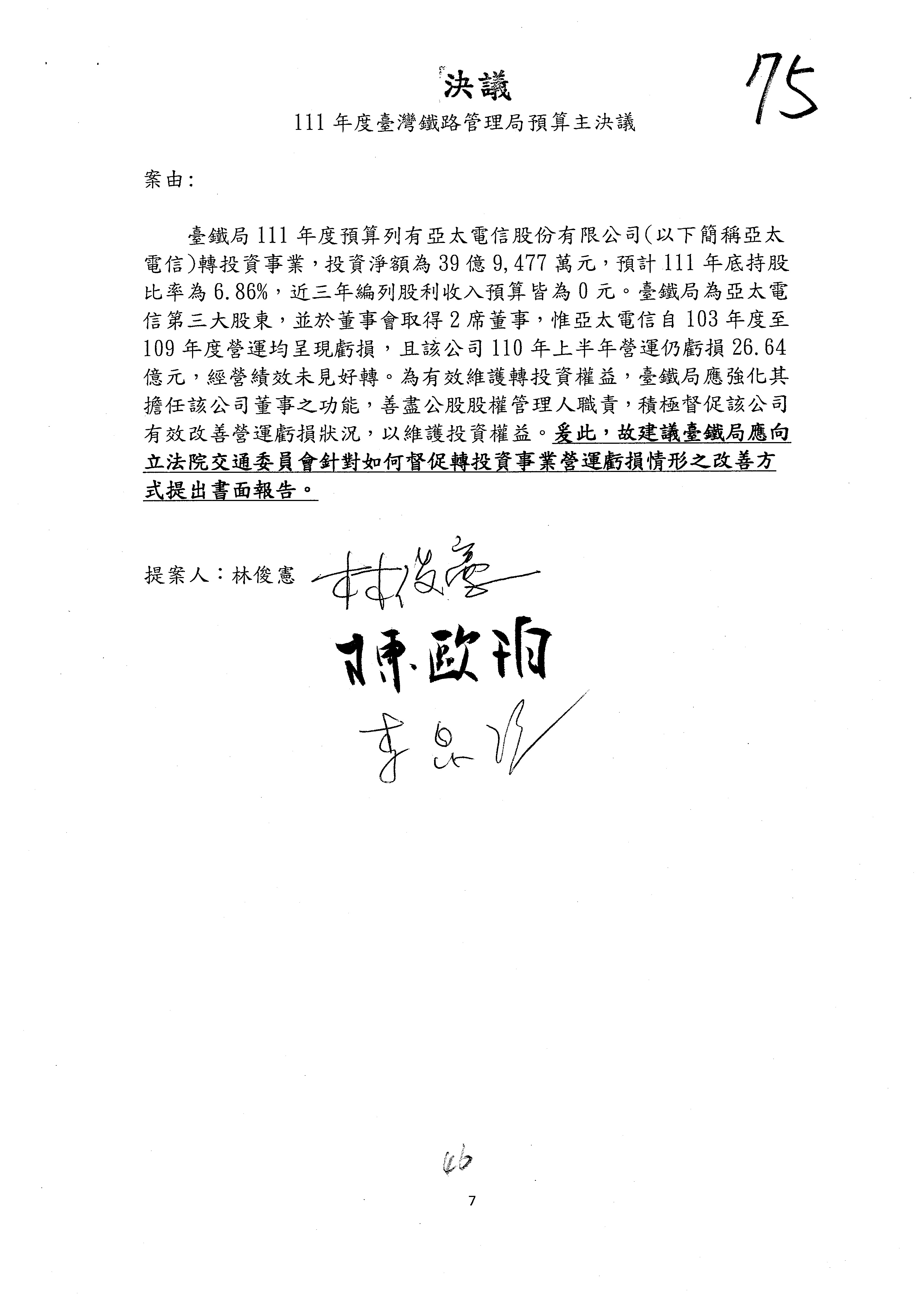 杜局長微:第78案建議倒數第3行的最後兩個字開始「應做出改善檢討報告……」,後面「並」刪掉,直接改為「爰要求臺鐵局於一個月內向立法院交通委員會提出書面改善檢討報告」。
