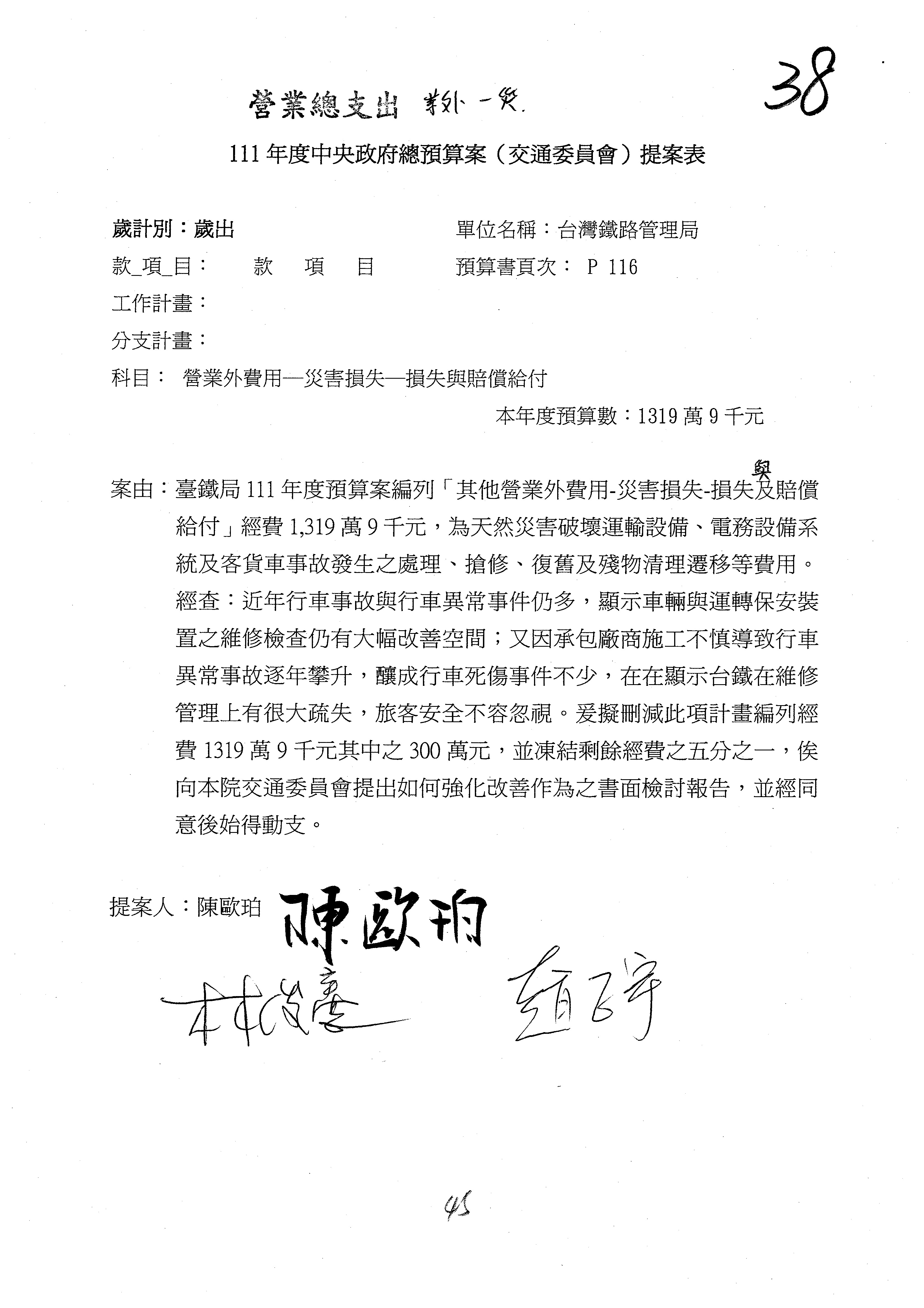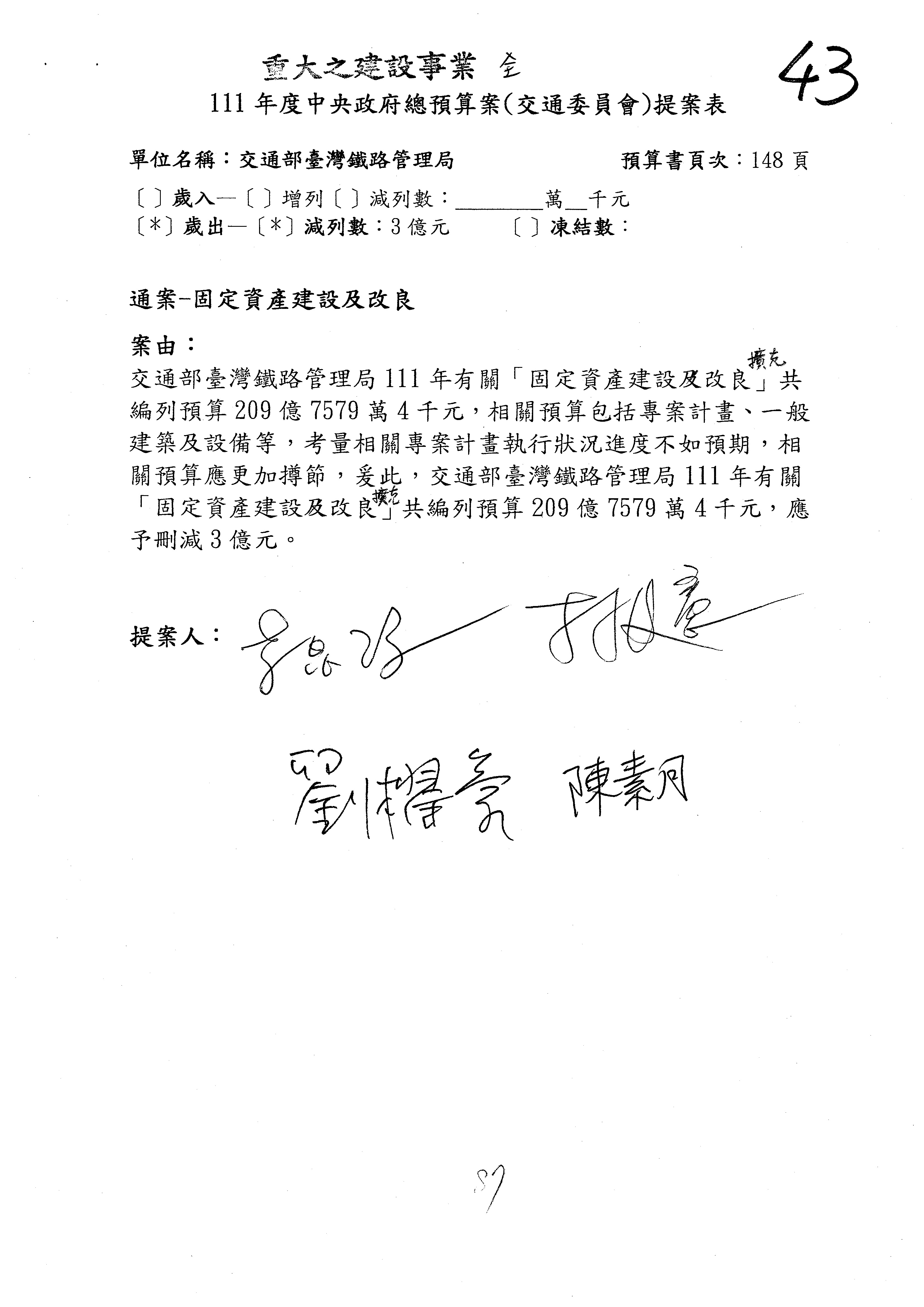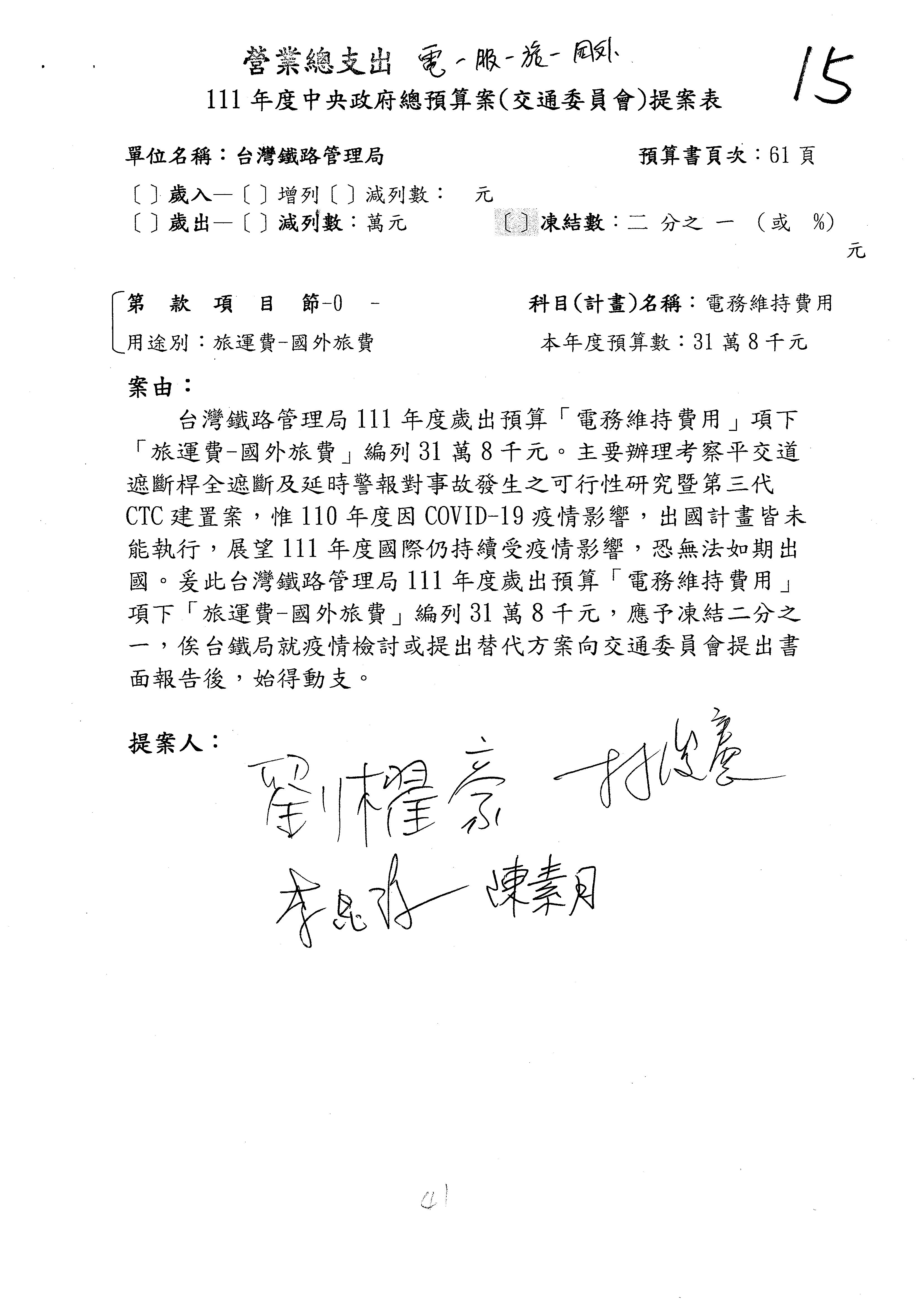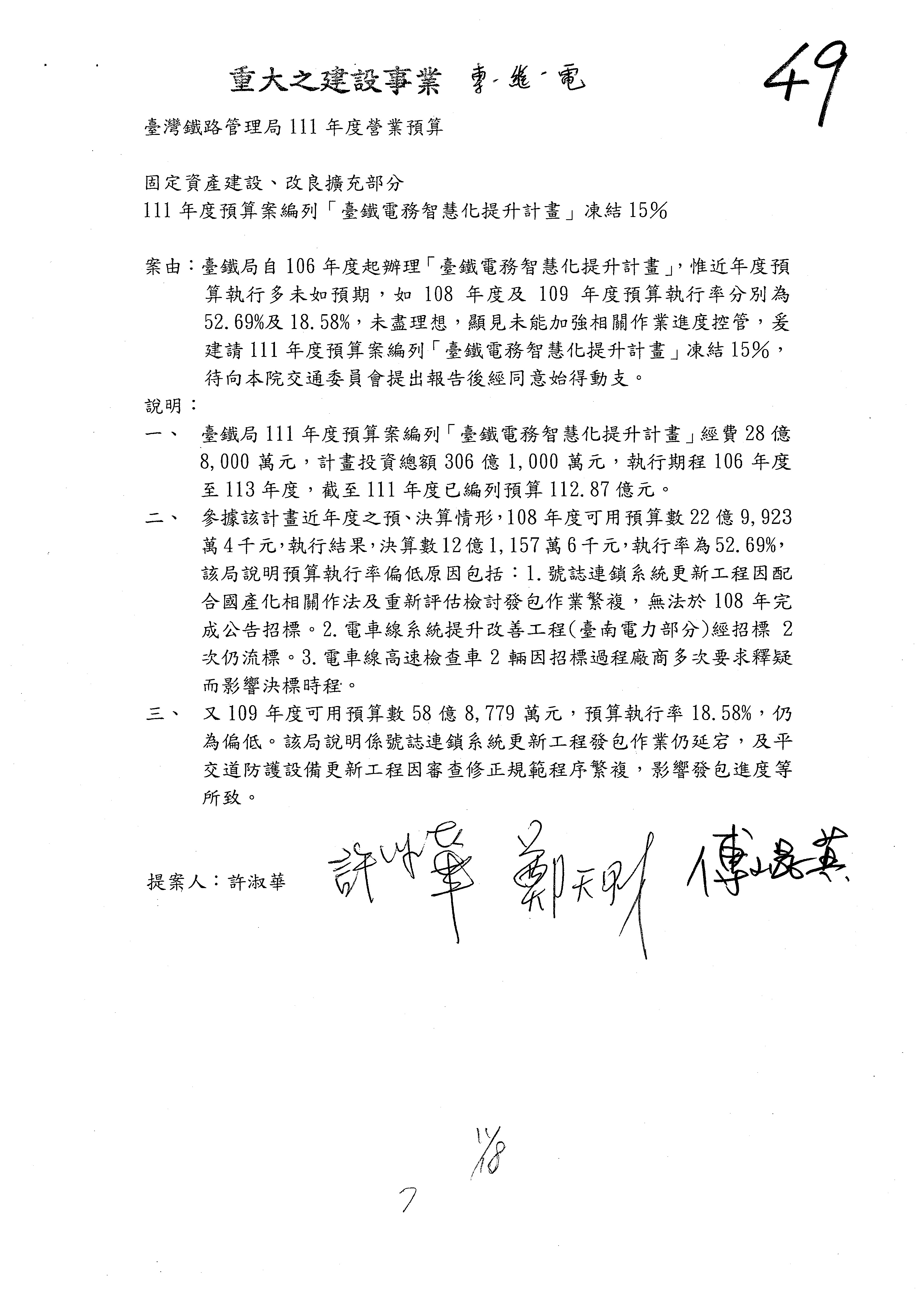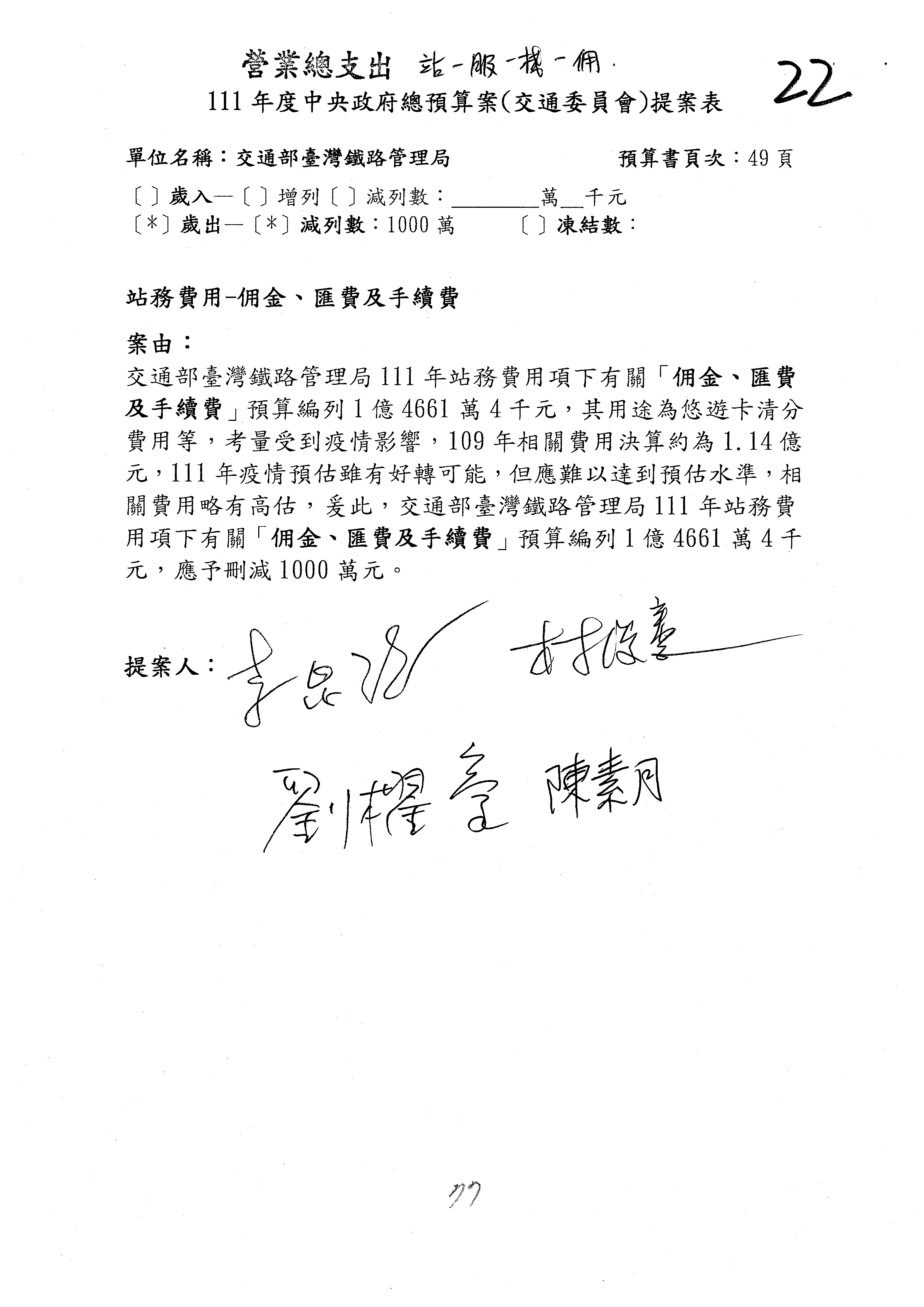 杜局長微:第78案建議倒數第3行的最後兩個字開始「應做出改善檢討報告……」,後面「並」刪掉,直接改為「爰要求臺鐵局於一個月內向立法院交通委員會提出書面改善檢討報告」。