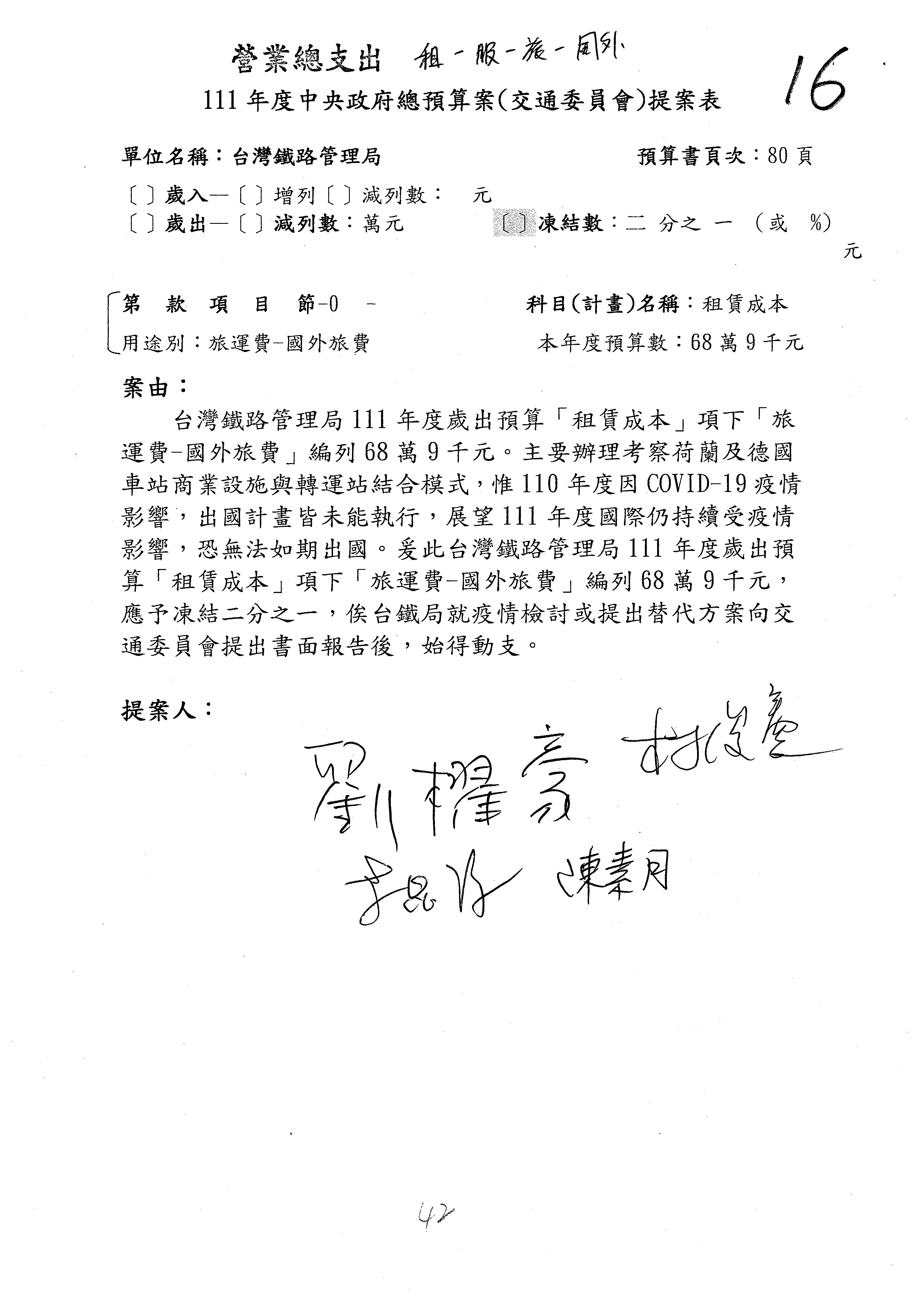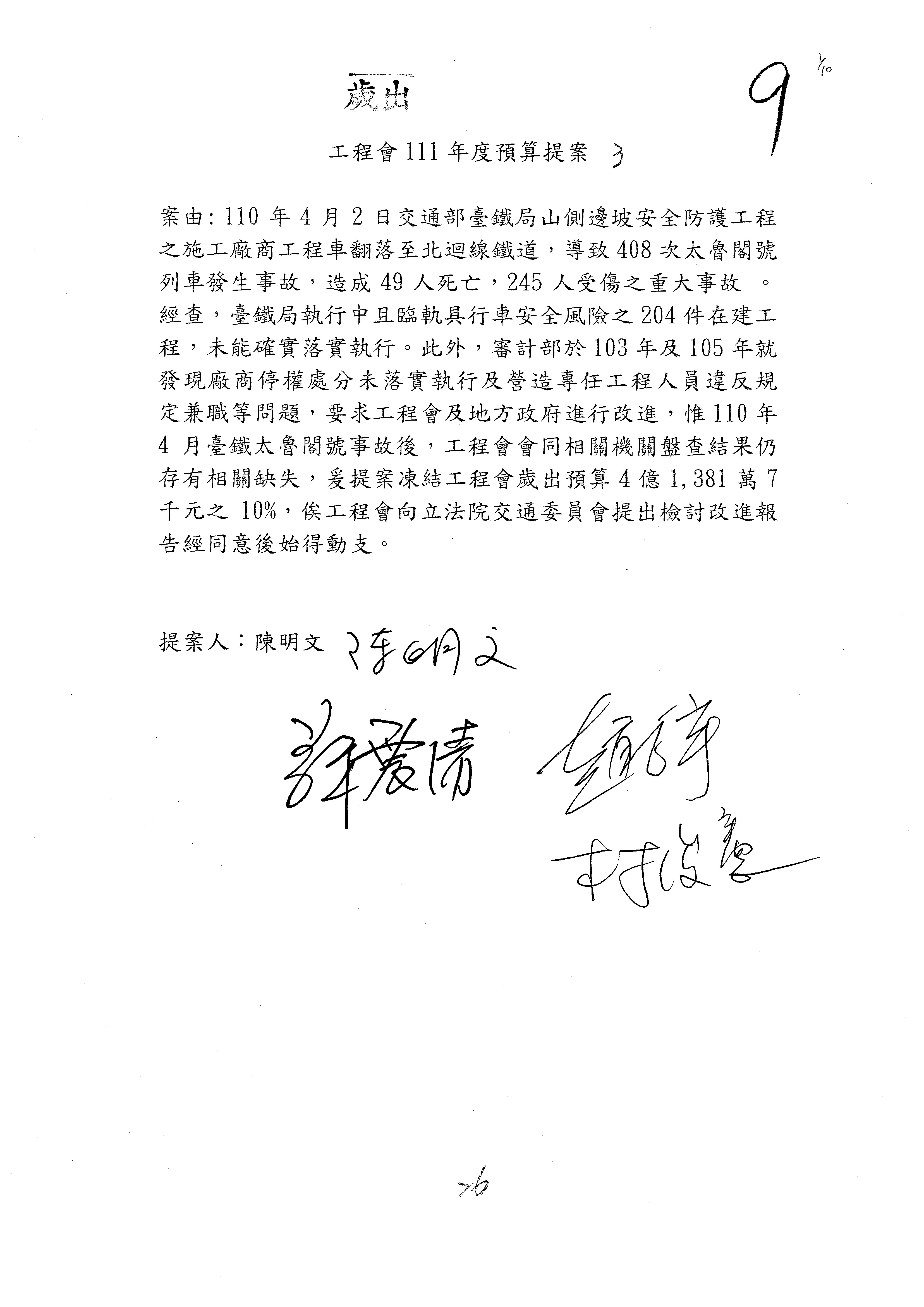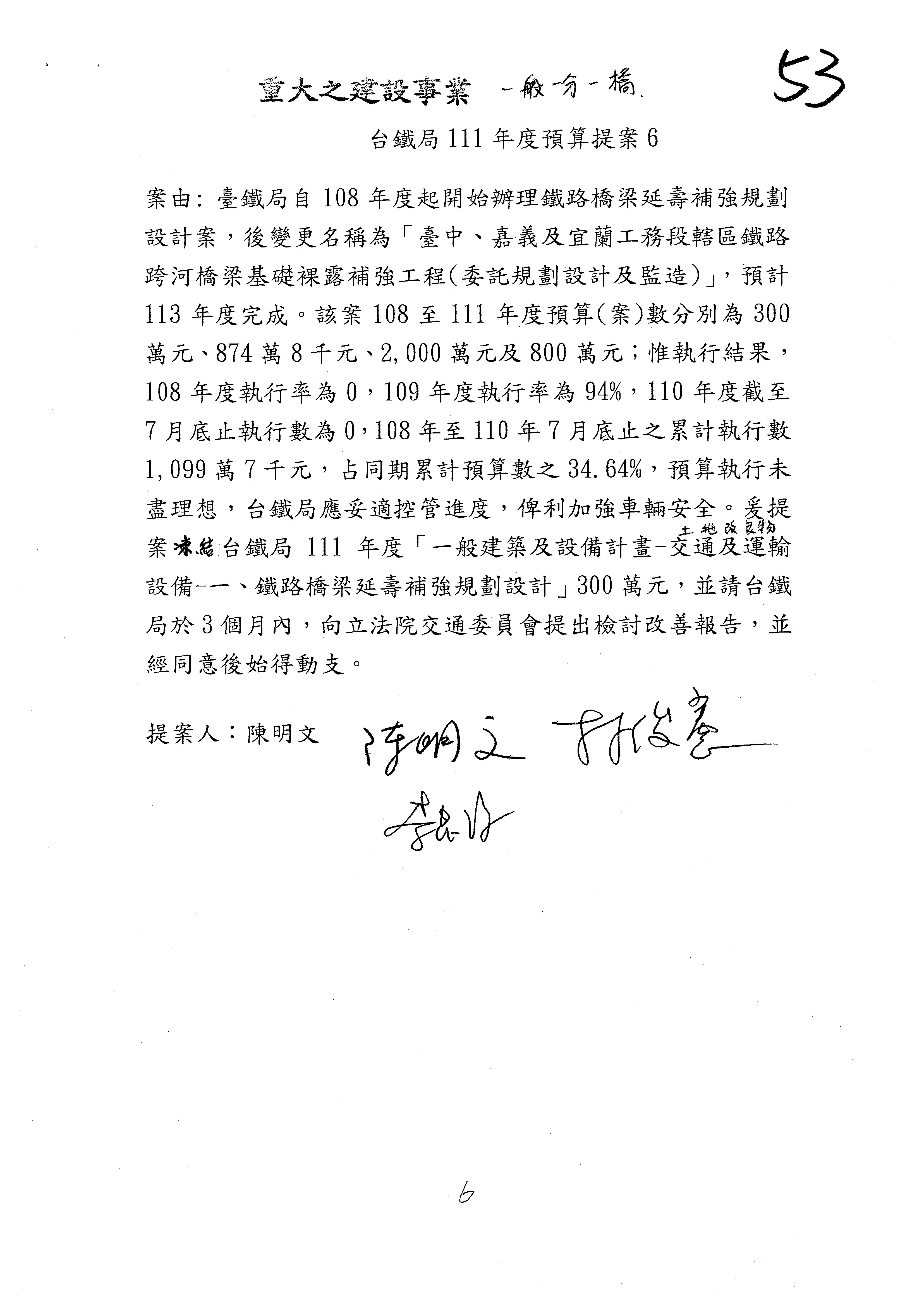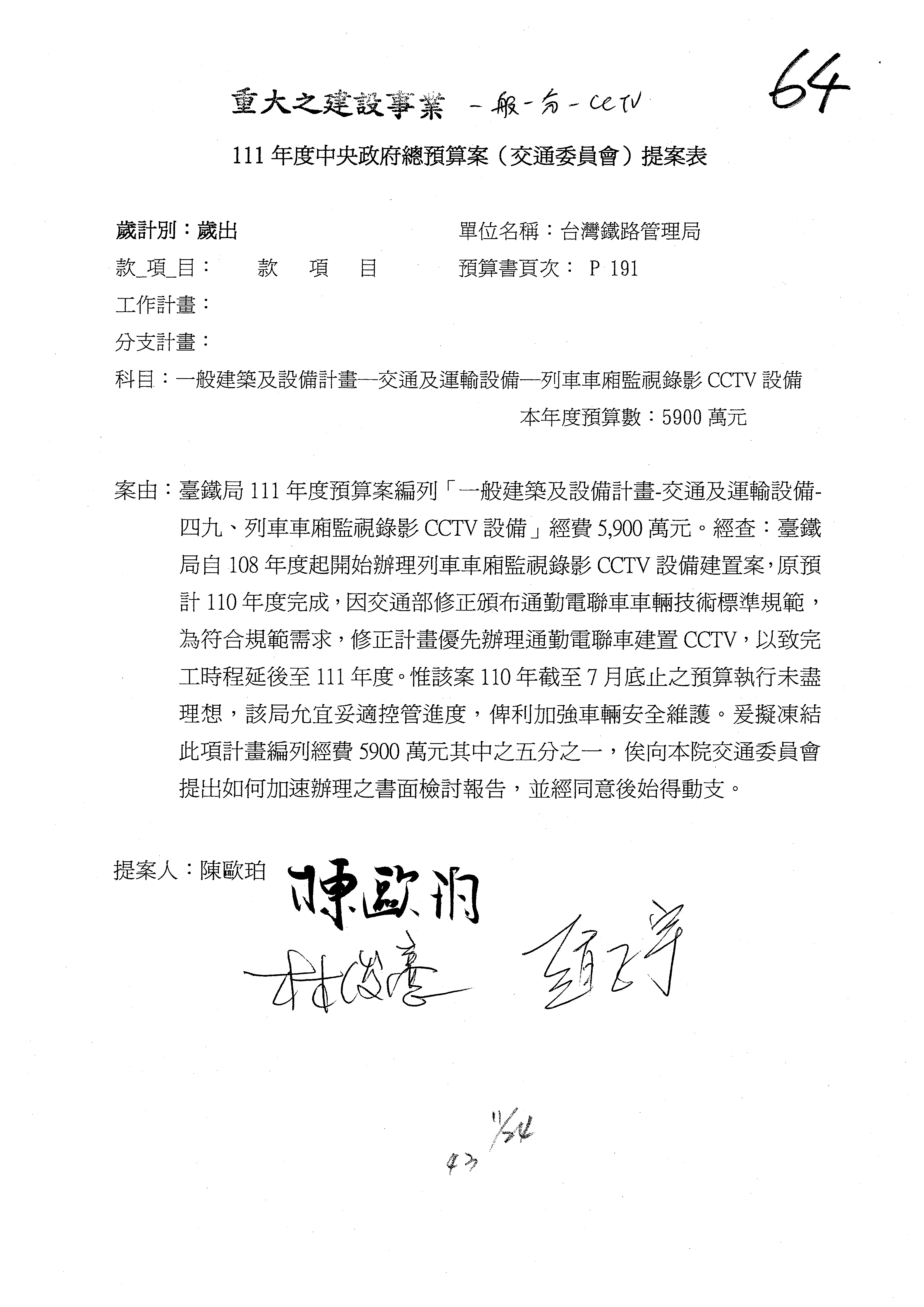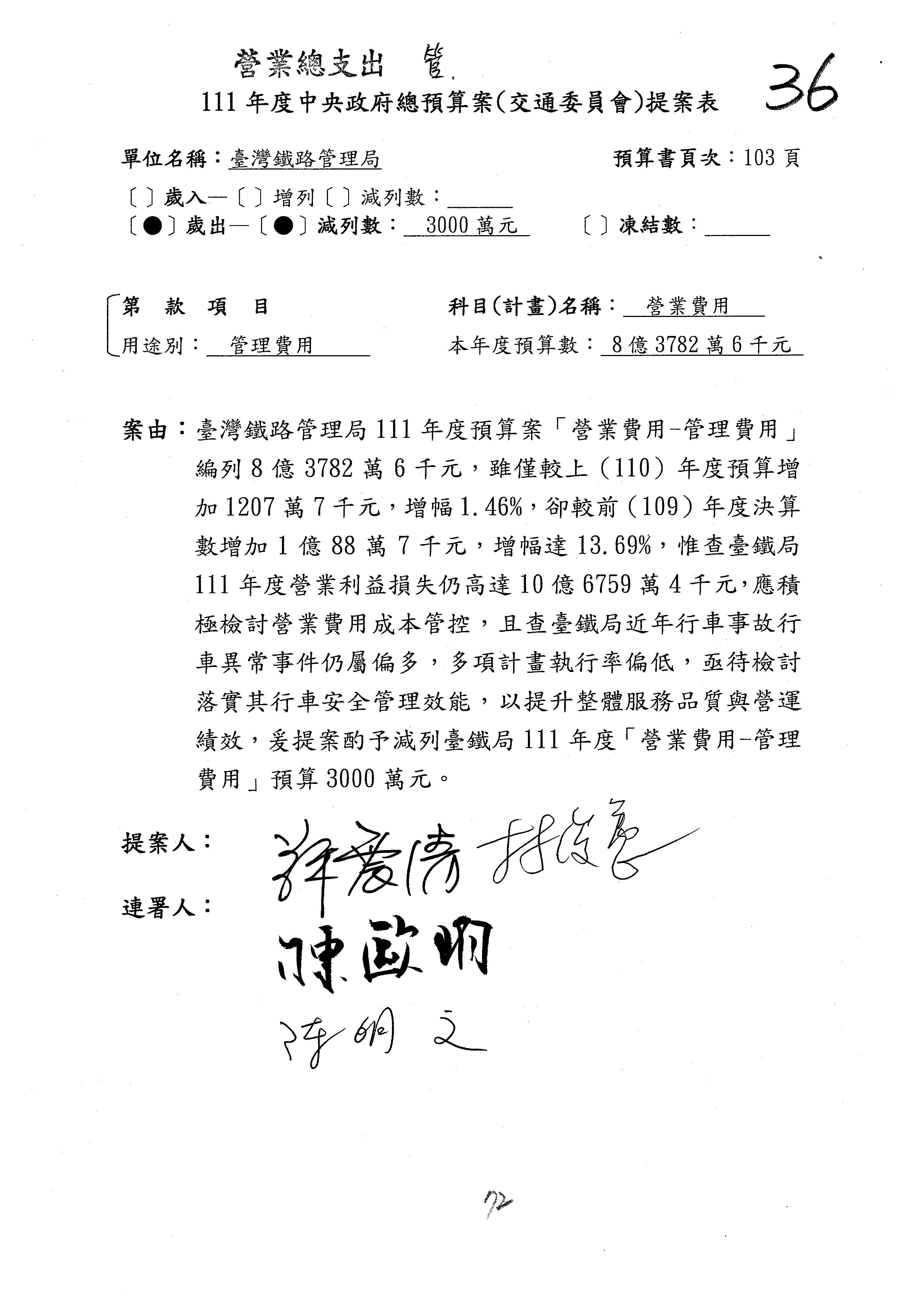 杜局長微:第78案建議倒數第3行的最後兩個字開始「應做出改善檢討報告……」,後面「並」刪掉,直接改為「爰要求臺鐵局於一個月內向立法院交通委員會提出書面改善檢討報告」。