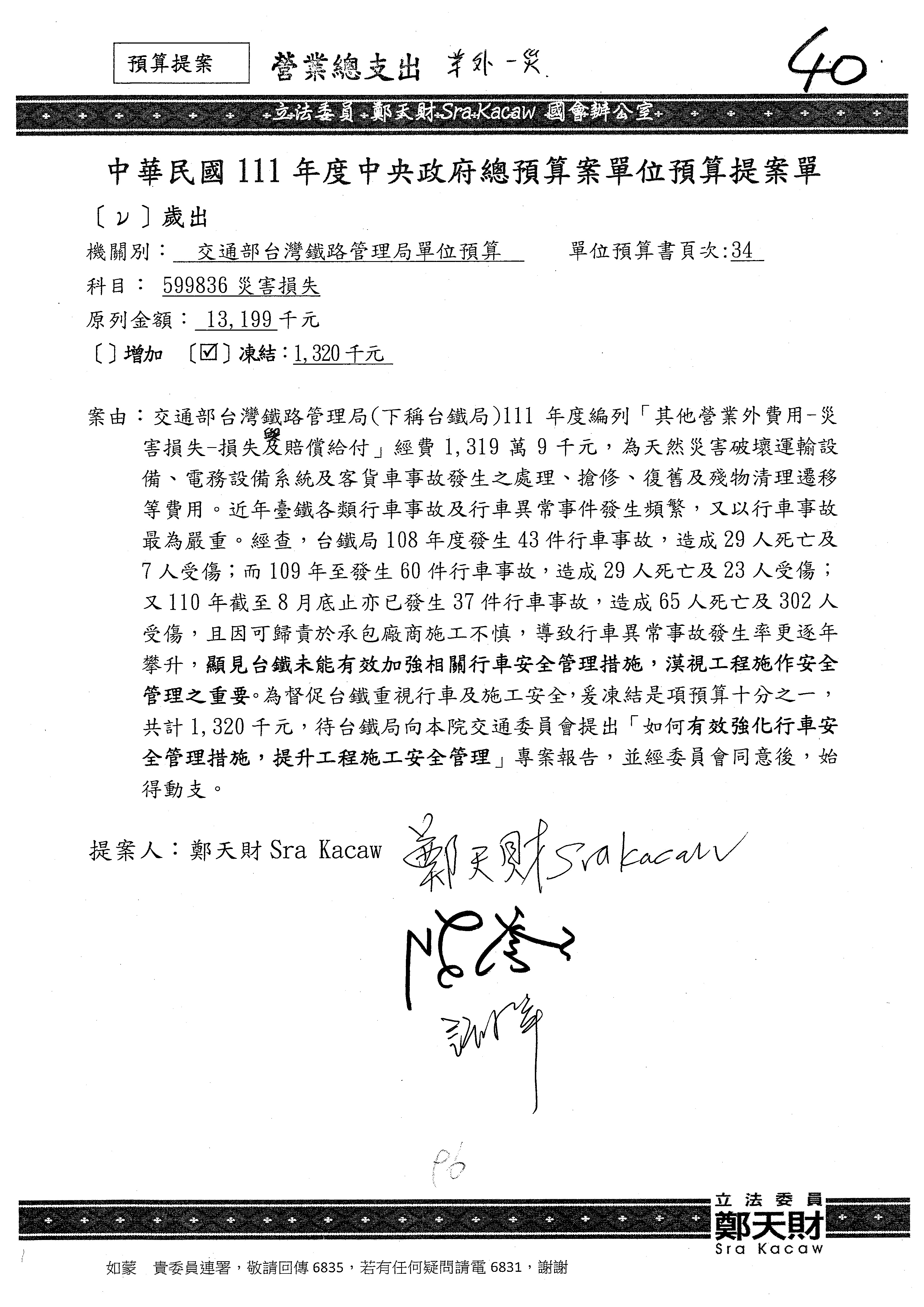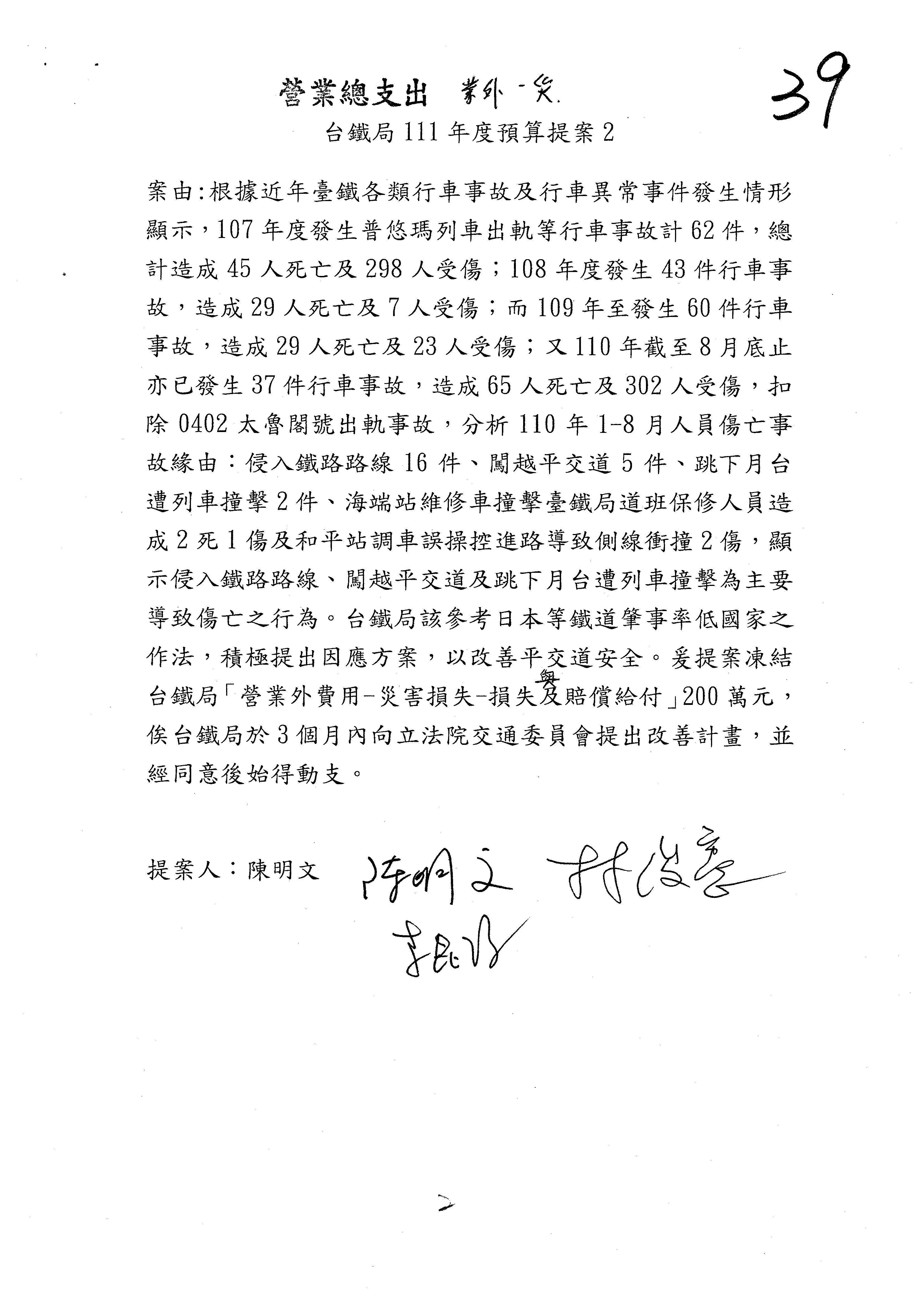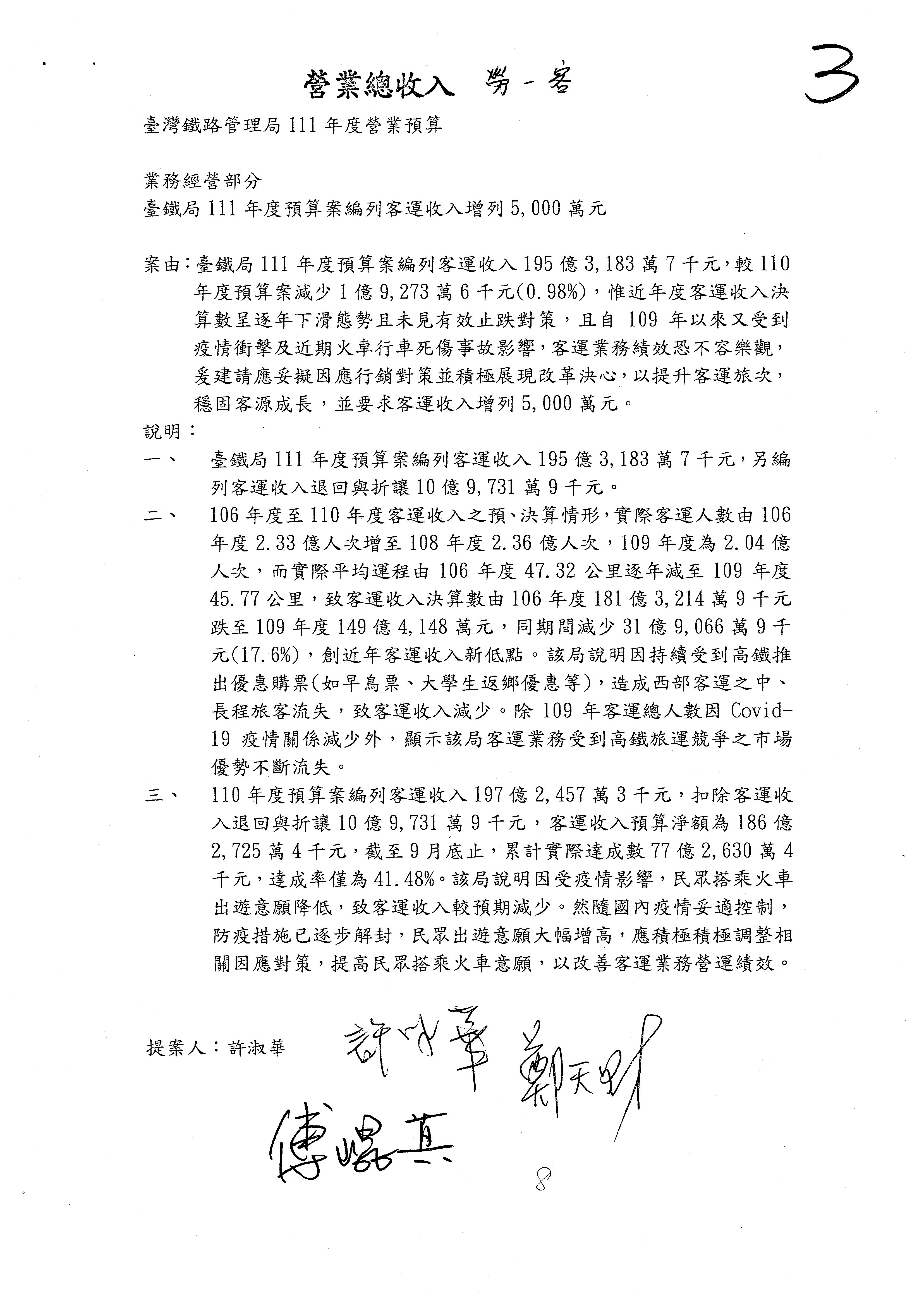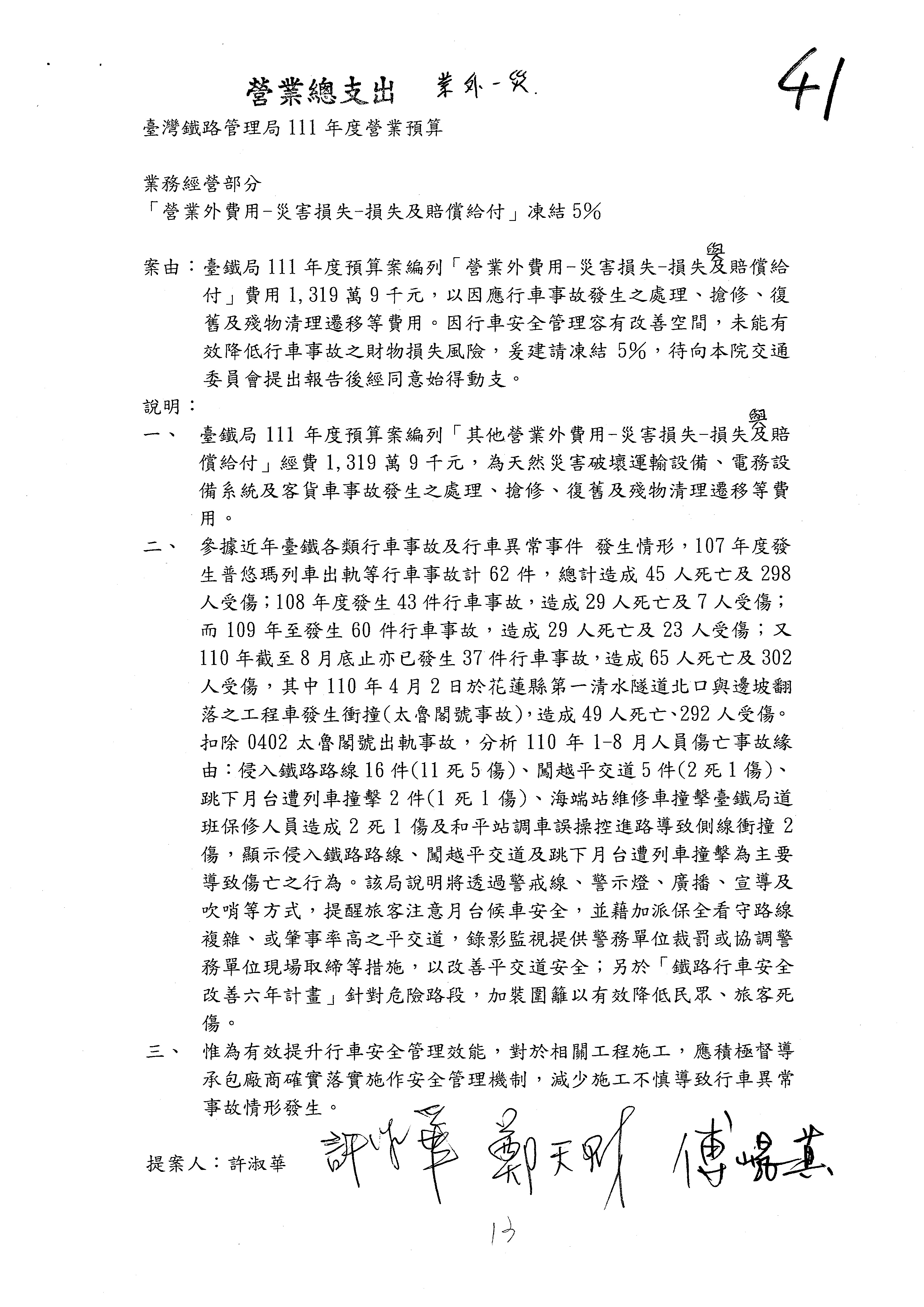 杜局長微:許淑華委員的提案,案由是鑑於107年10月間發生普悠瑪列車出軌事故,該局於編列109、110年……