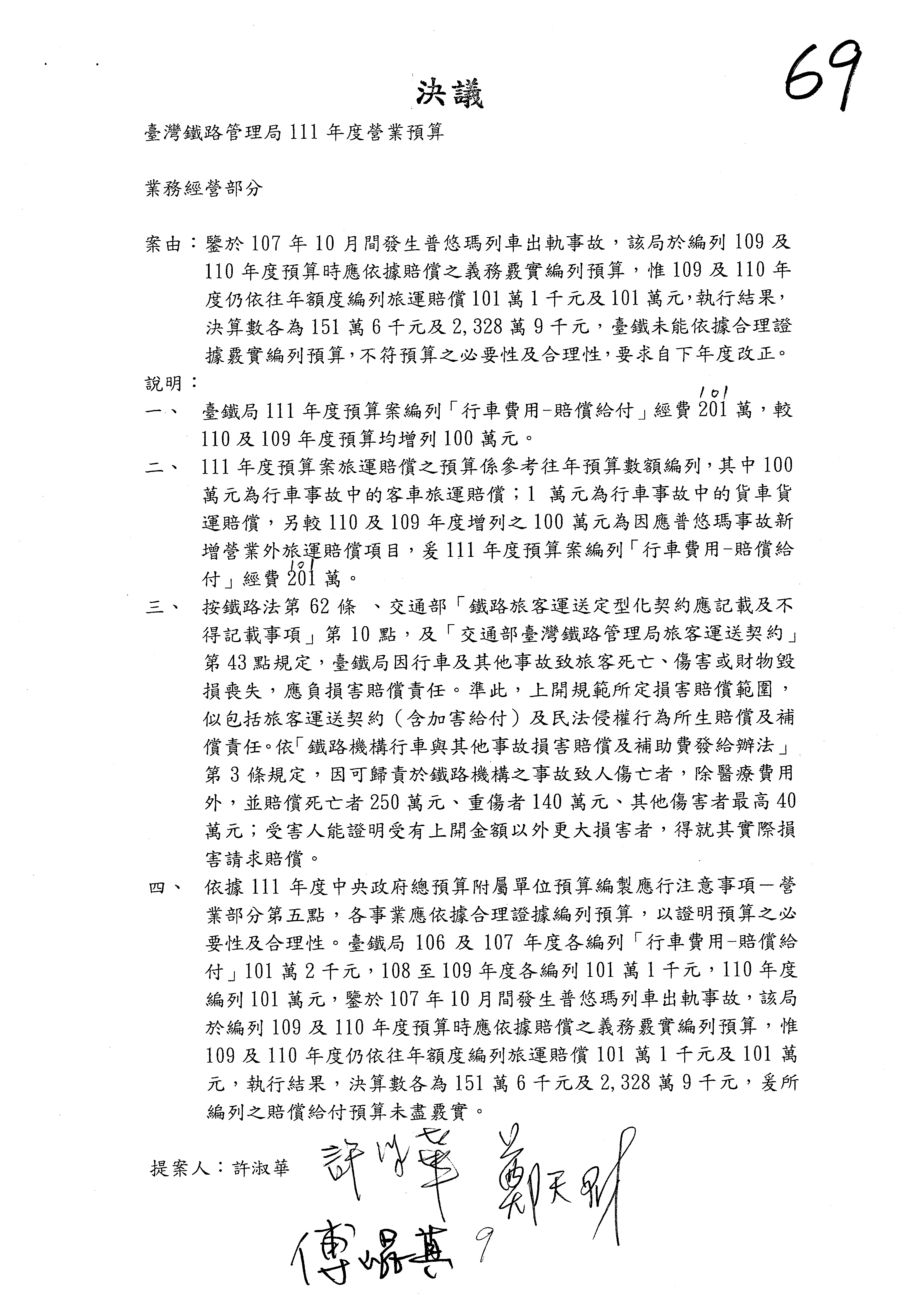 處理第69案,許淑華委員的提案,請臺鐵局說明。
