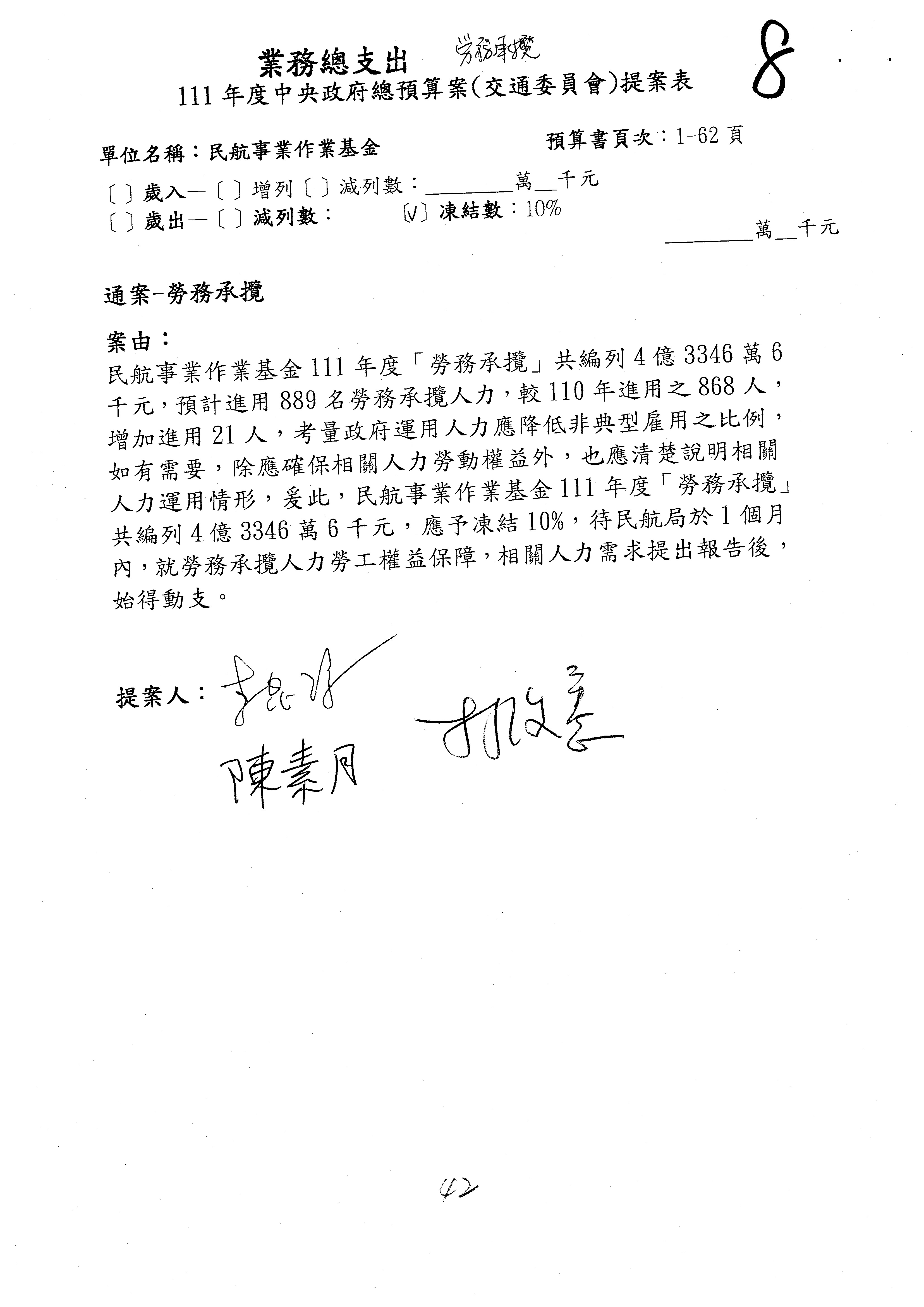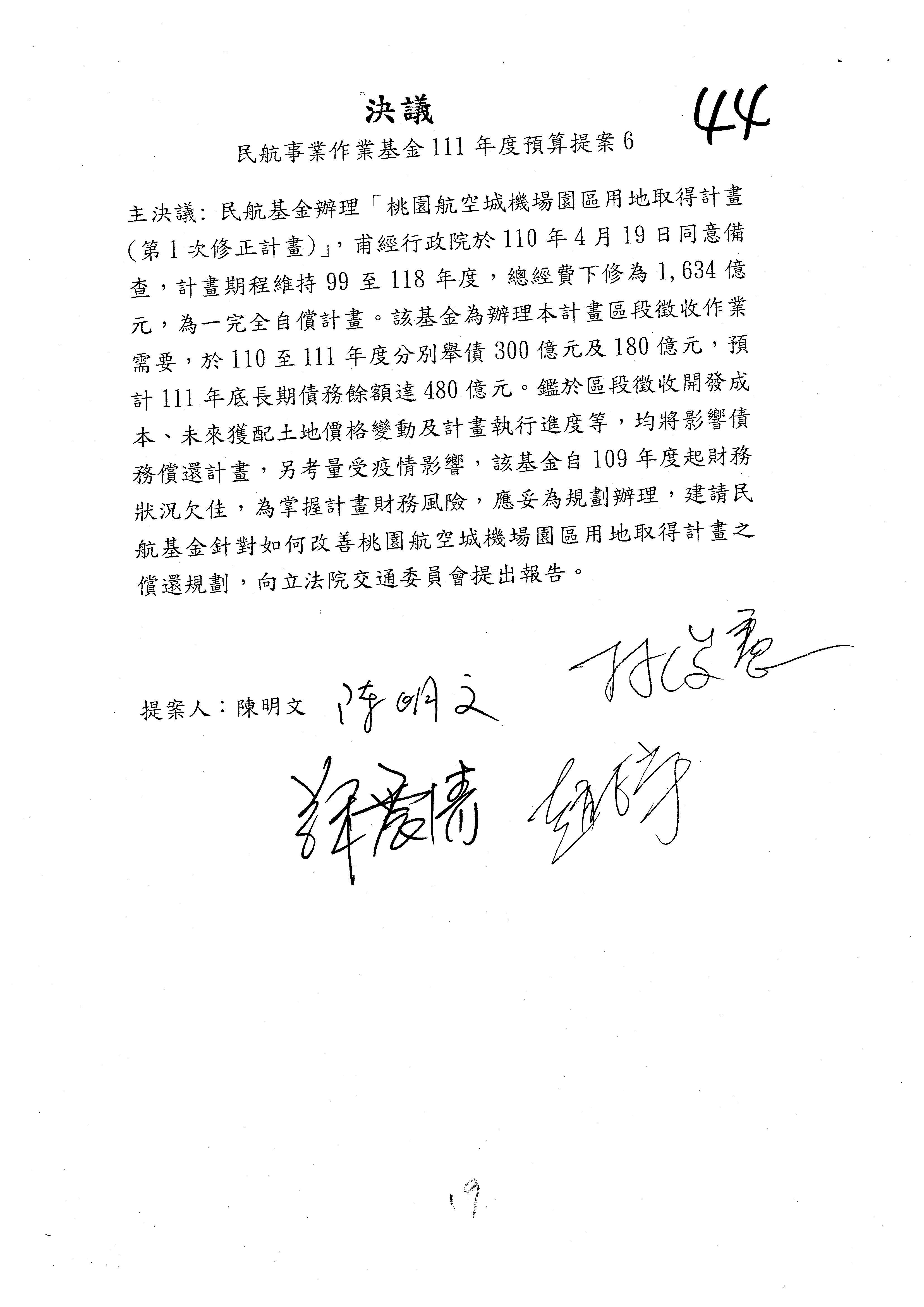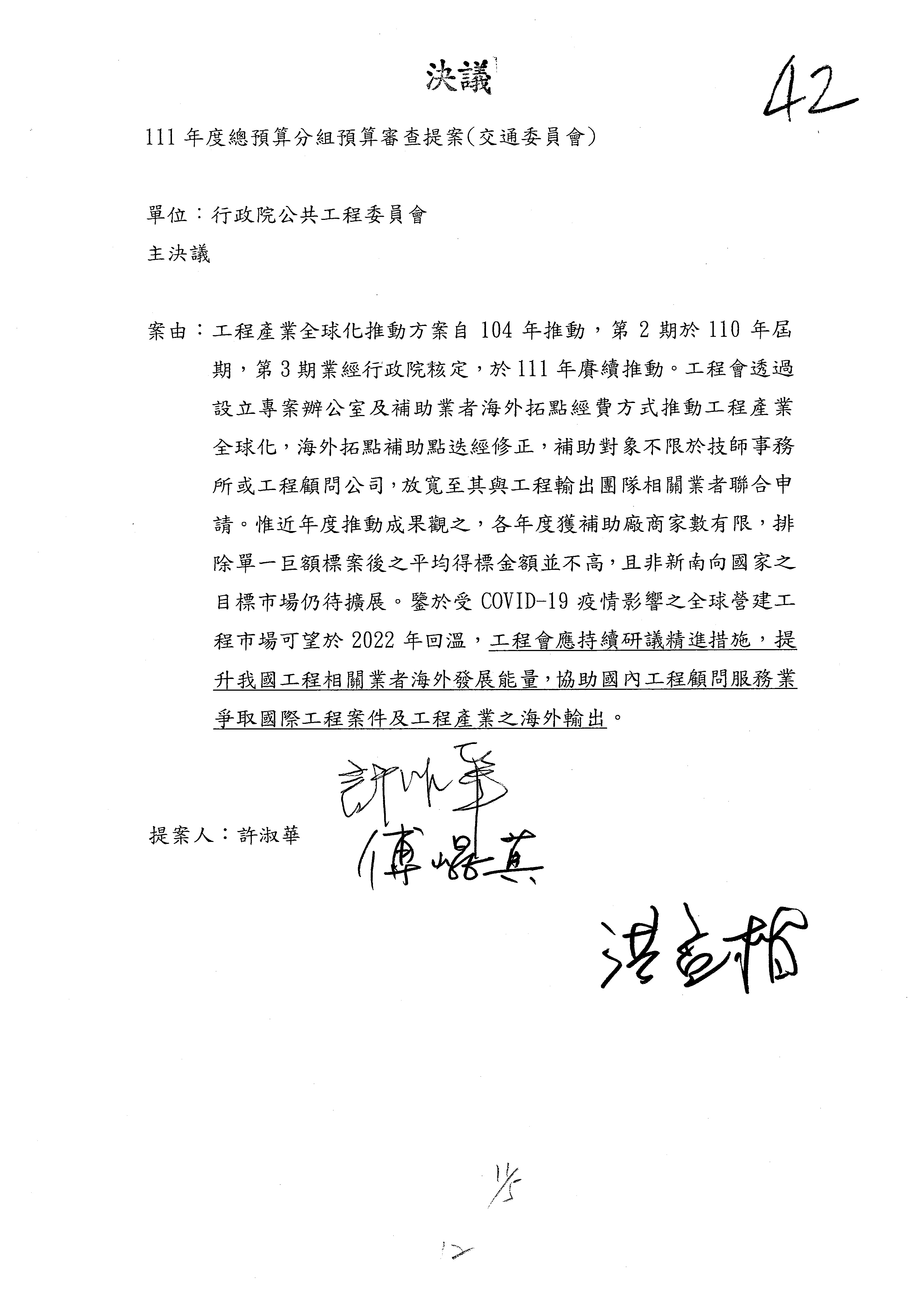 三、111年度交通部國道公路建設管理基金非營業預算審查完畢,內容如審查結果。