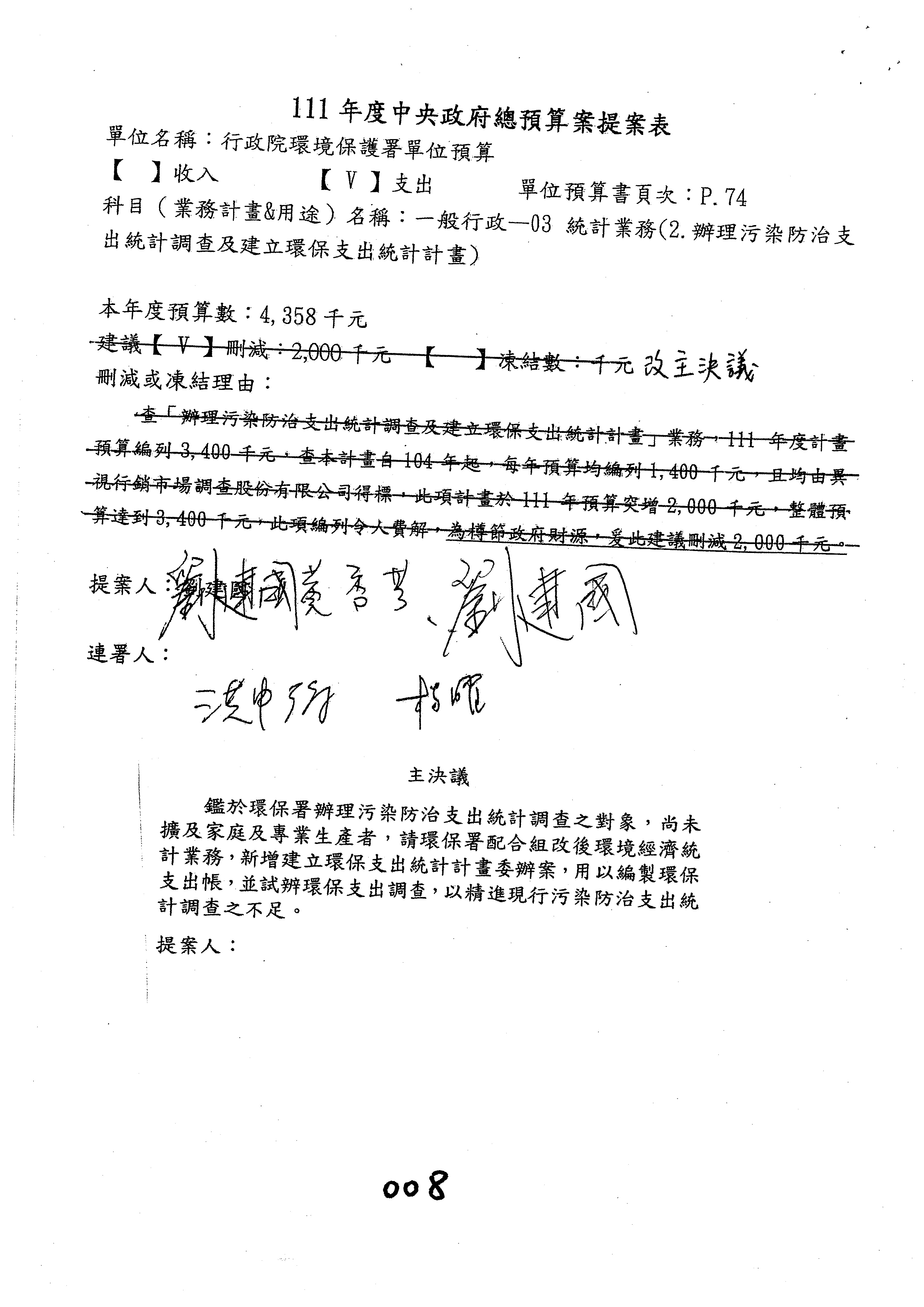 劉處長宗勇:綜合計畫處處長劉宗勇報告,第73案,徐委員辦公室已簽名同意,改減列環境教育計畫45萬元,科目自行調整,同意併案;第74案是一樣的,已經跟主席辦公室協調過,也簽名同意,改減列環境教育計畫45萬元,科目自行調整,同意併案,所以這兩案可以併案處理。