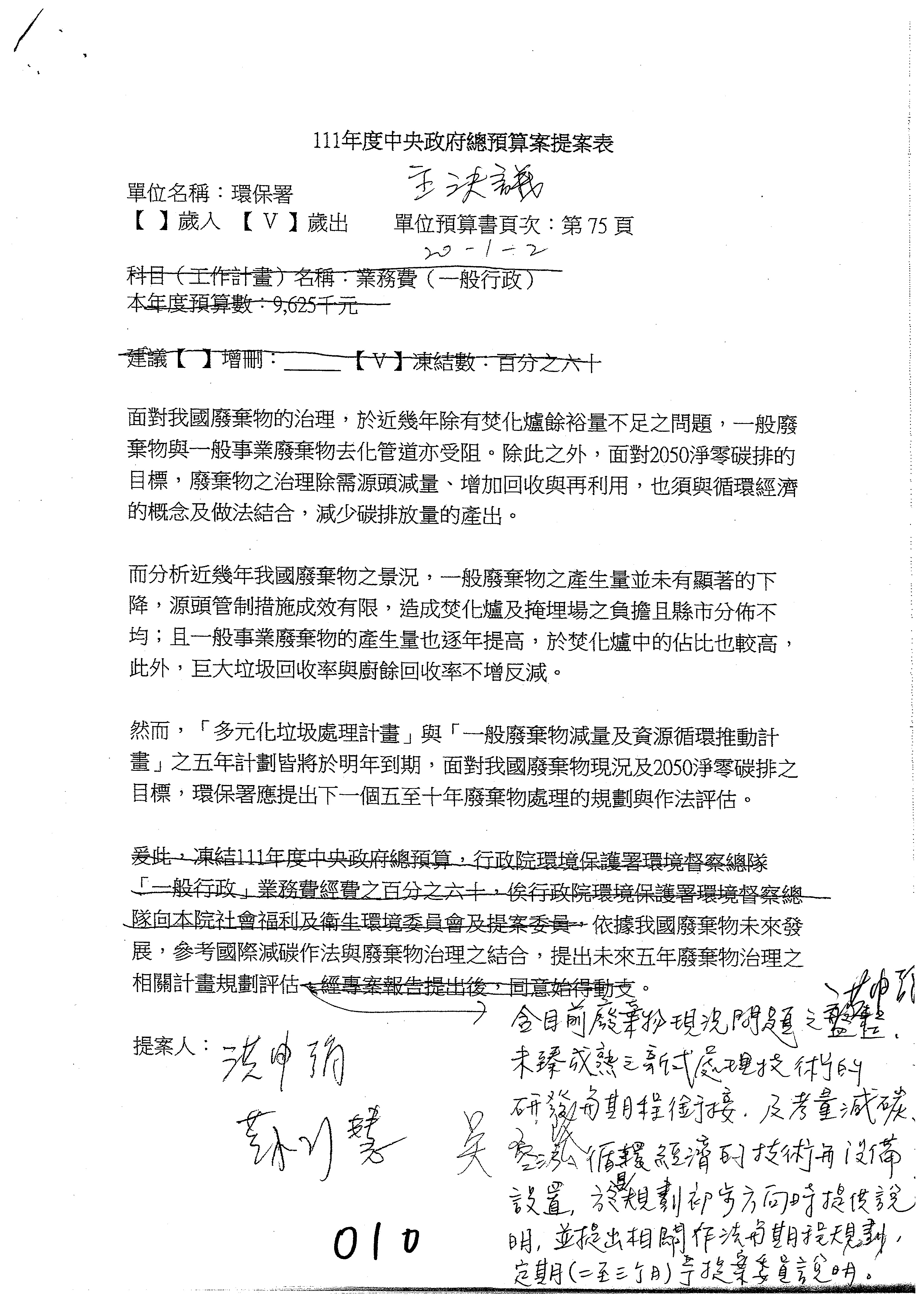 劉處長宗勇:第12案有跟委員辦公室說明跟溝通過,改凍結100萬元,可以併案凍結,科目自行調整,解凍文字我們也修改了。倒數第2行修改「俟行政院環境保護署提出書面報告分析直播錄影方式及對審查之影響,並檢討行政院環境保護署環境影響評估審查旁聽要點,始得動支。」。以上說明。