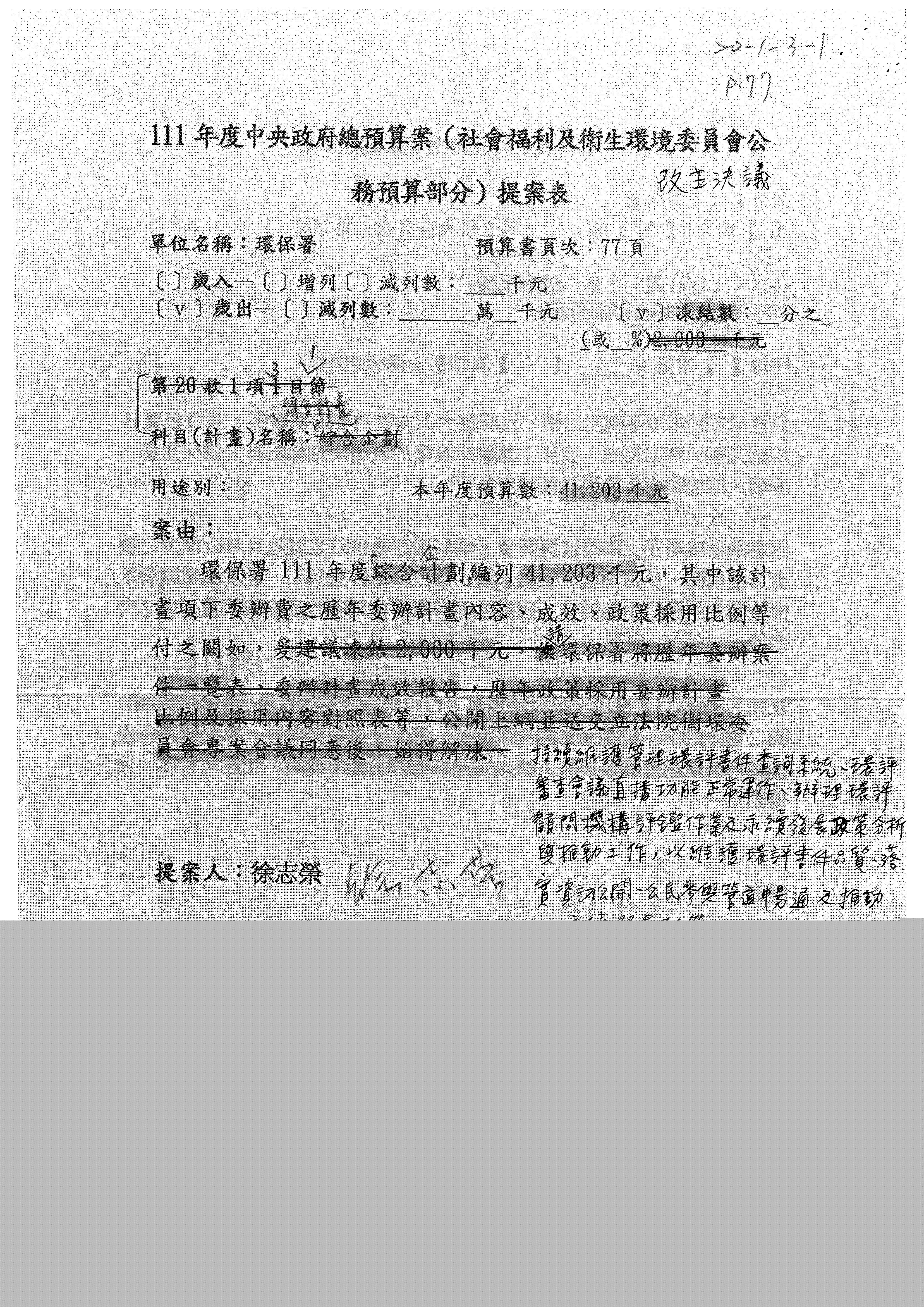 蔡處長玲儀:有關第77案,洪申翰委員也簽名同意,改凍結300萬元,可併案,提書面報告。