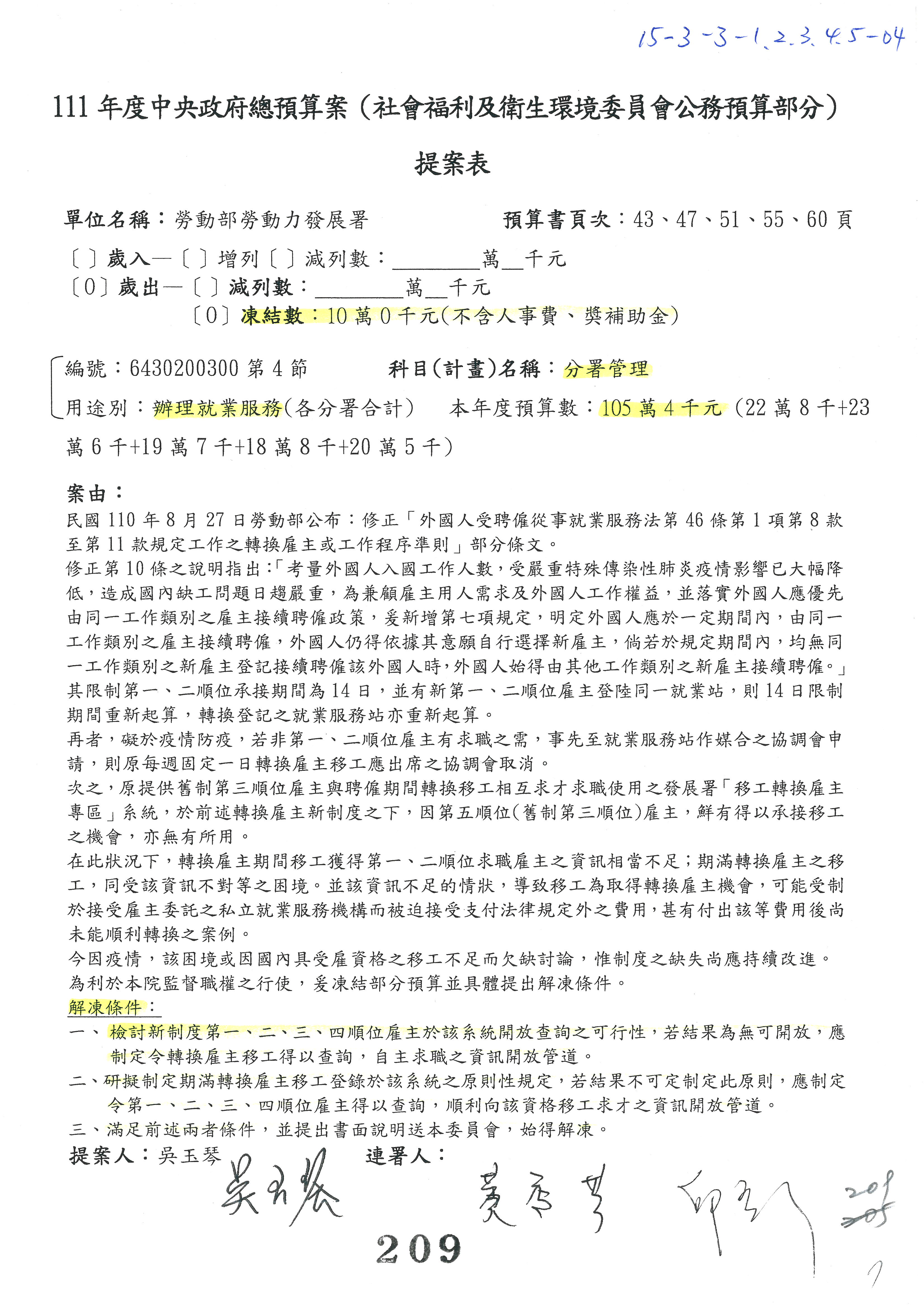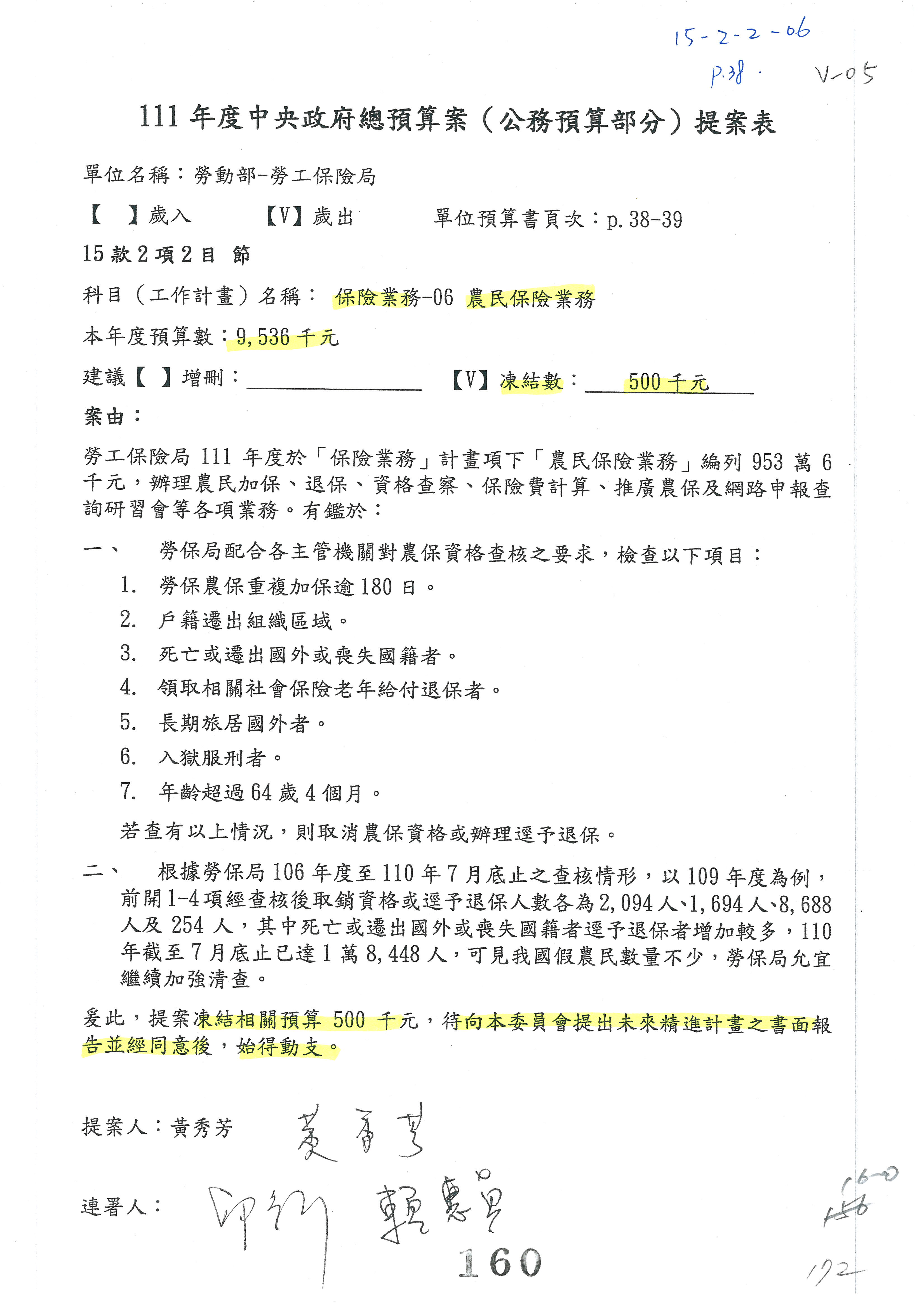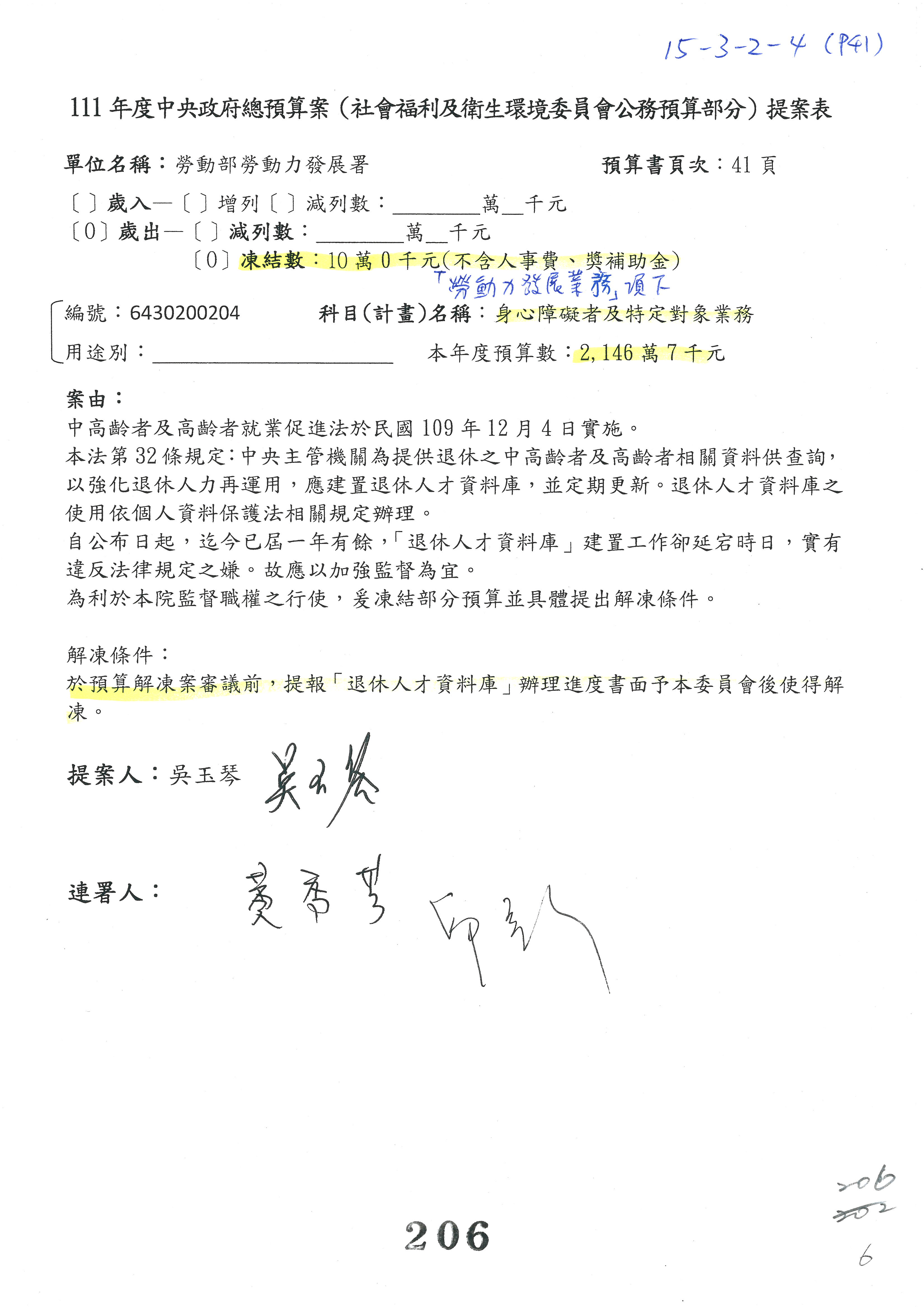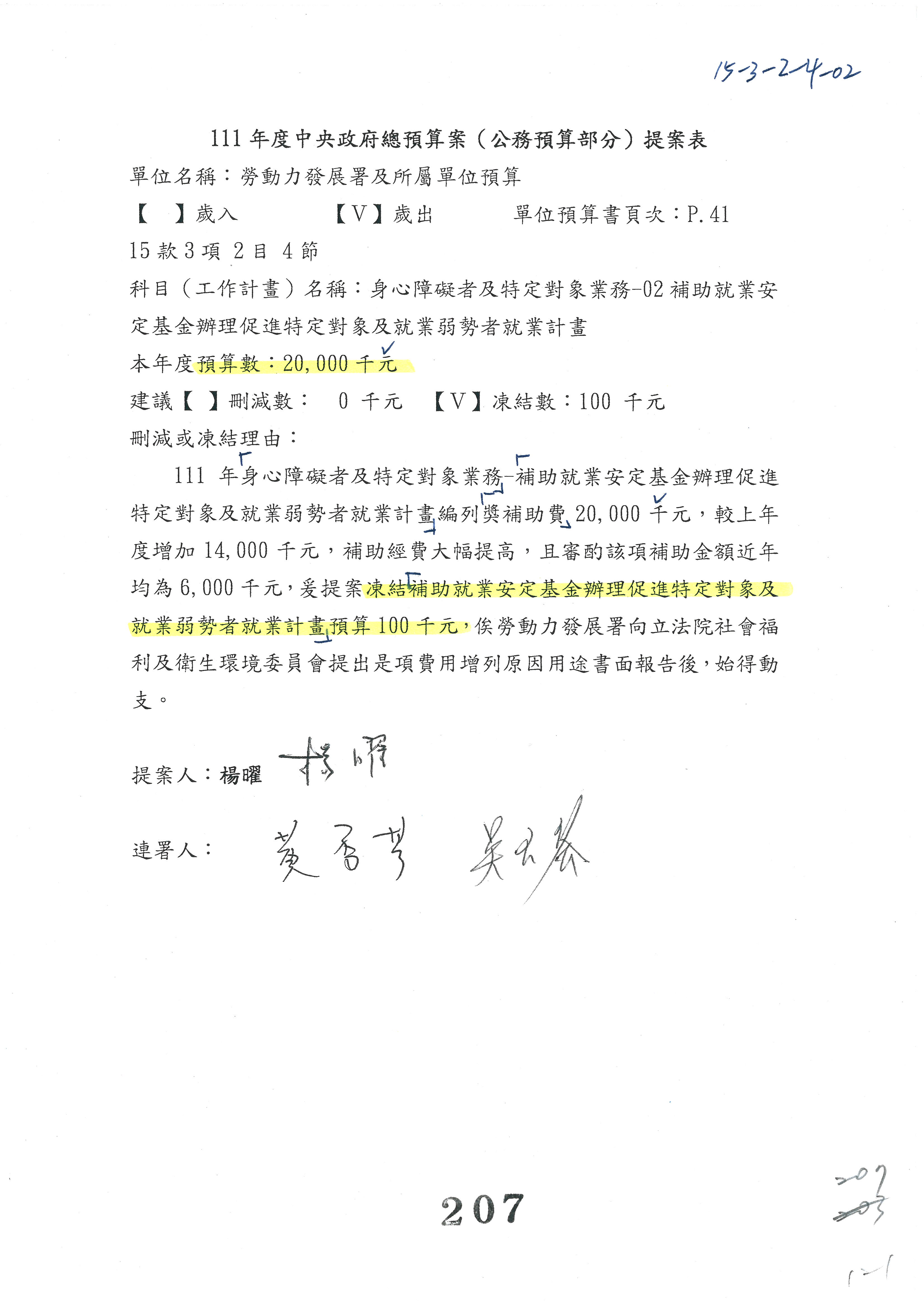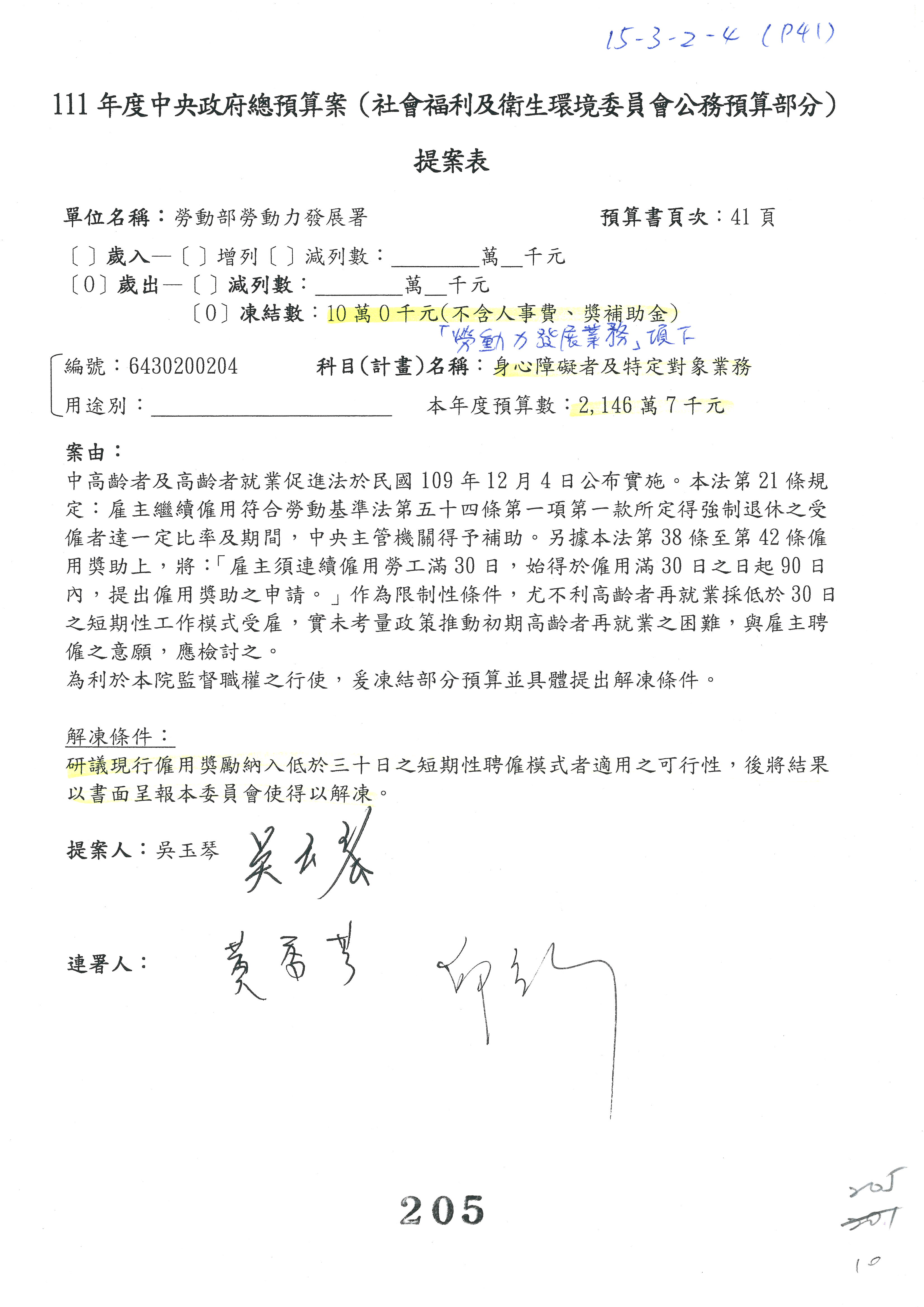 陳司長美女:我們會遵照委員指示,持續研議勞保財務改善的對策,委員同意改凍10萬元,併第3案凍結,提書面報告後始得動支,委員已簽署。