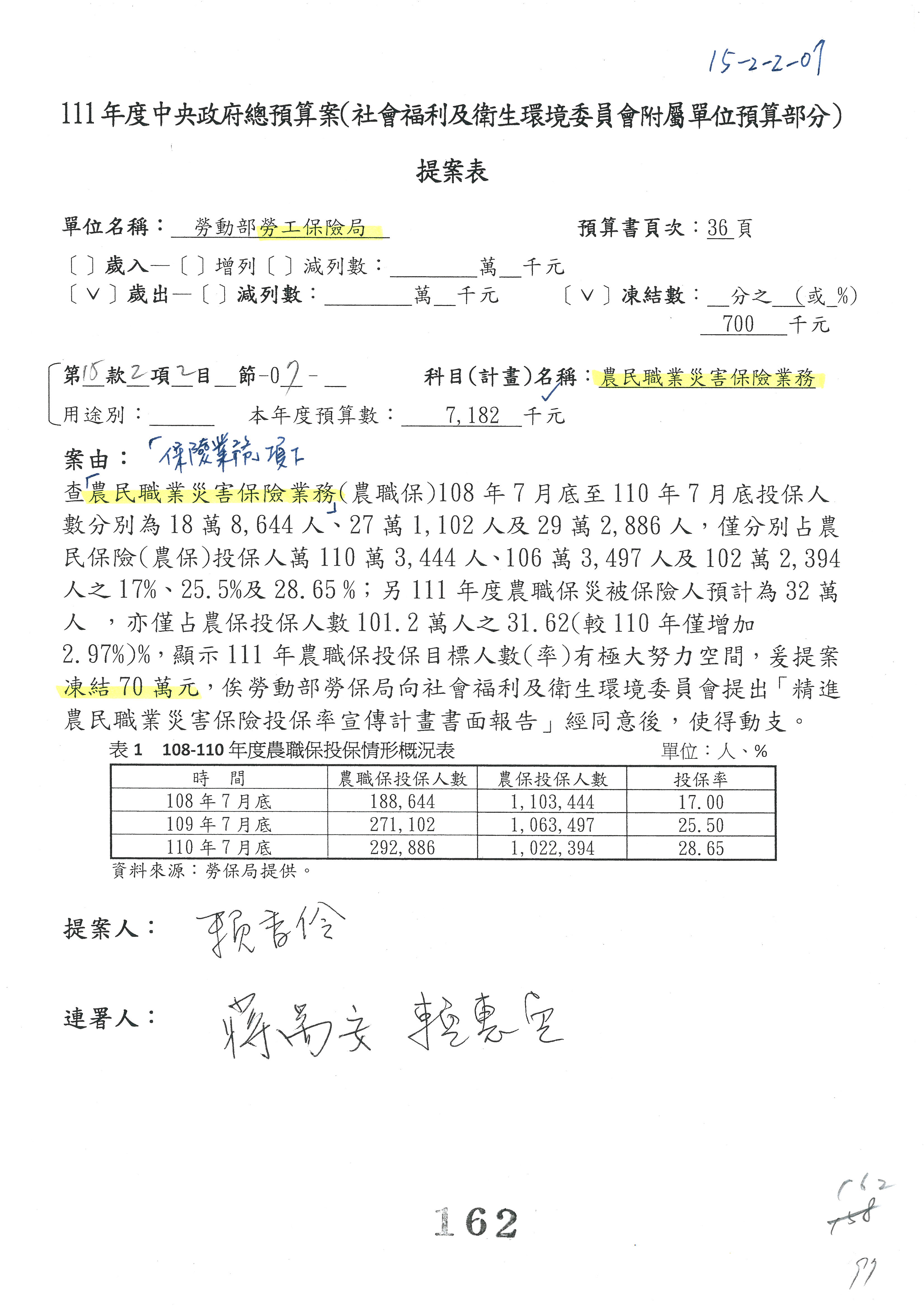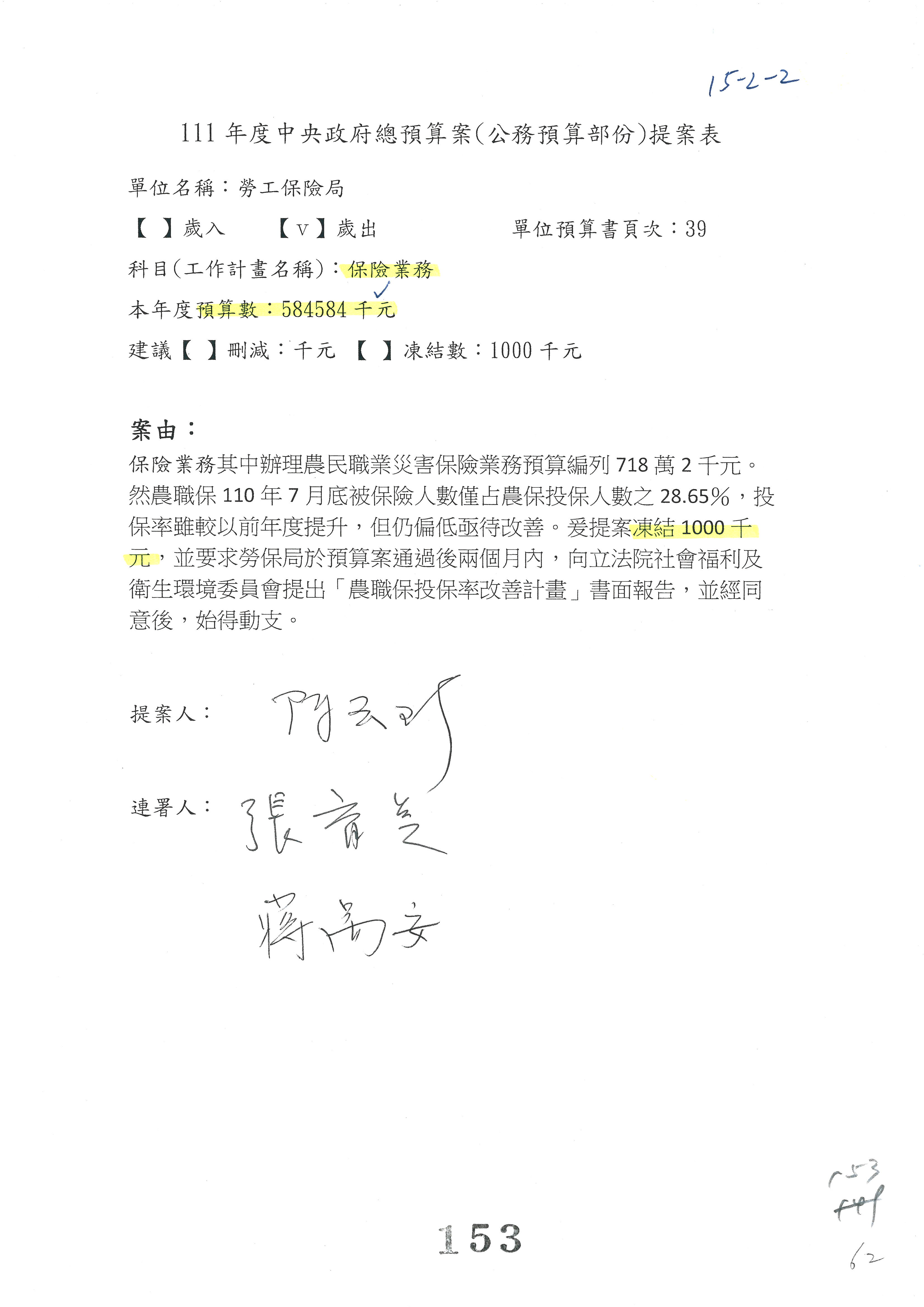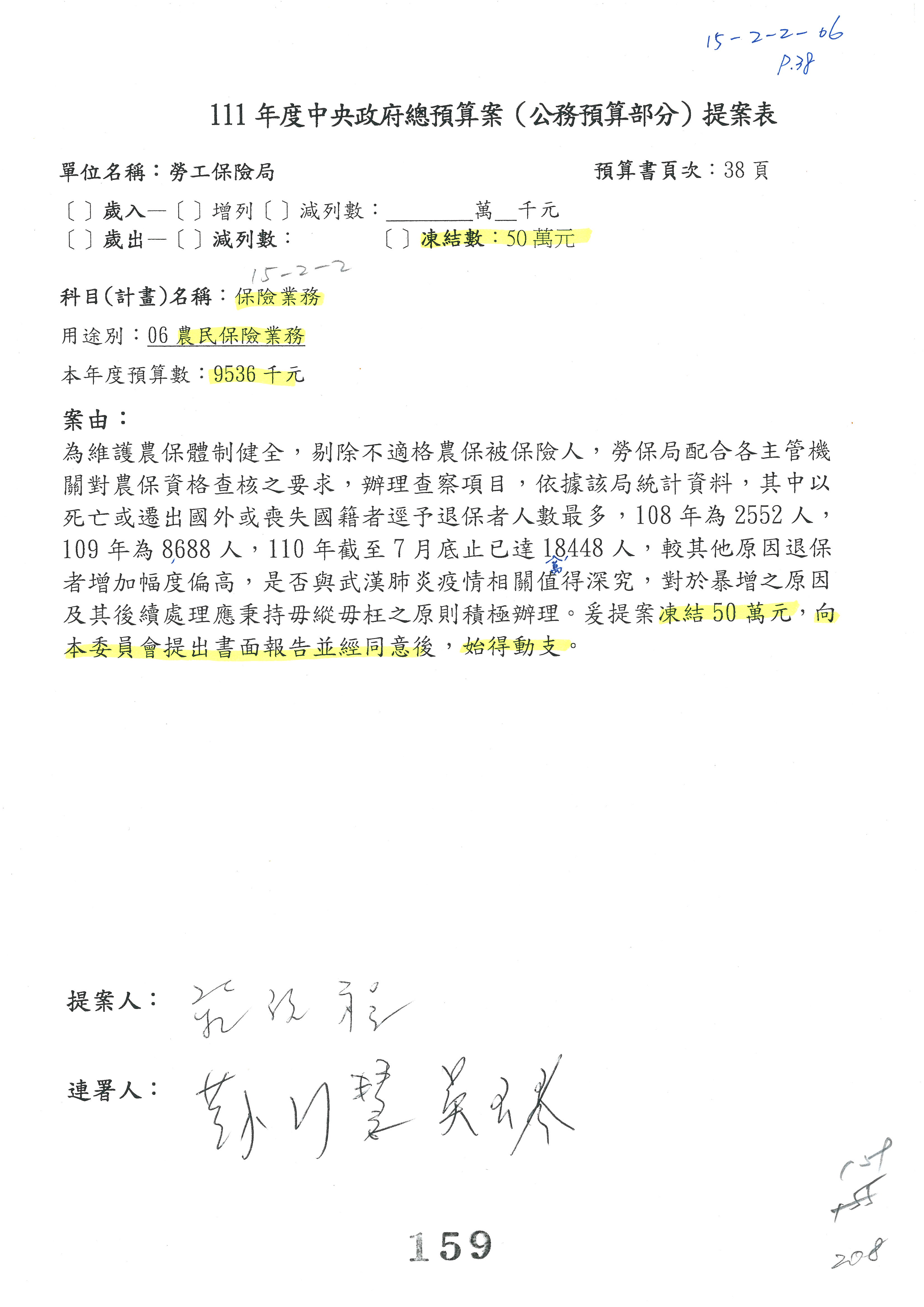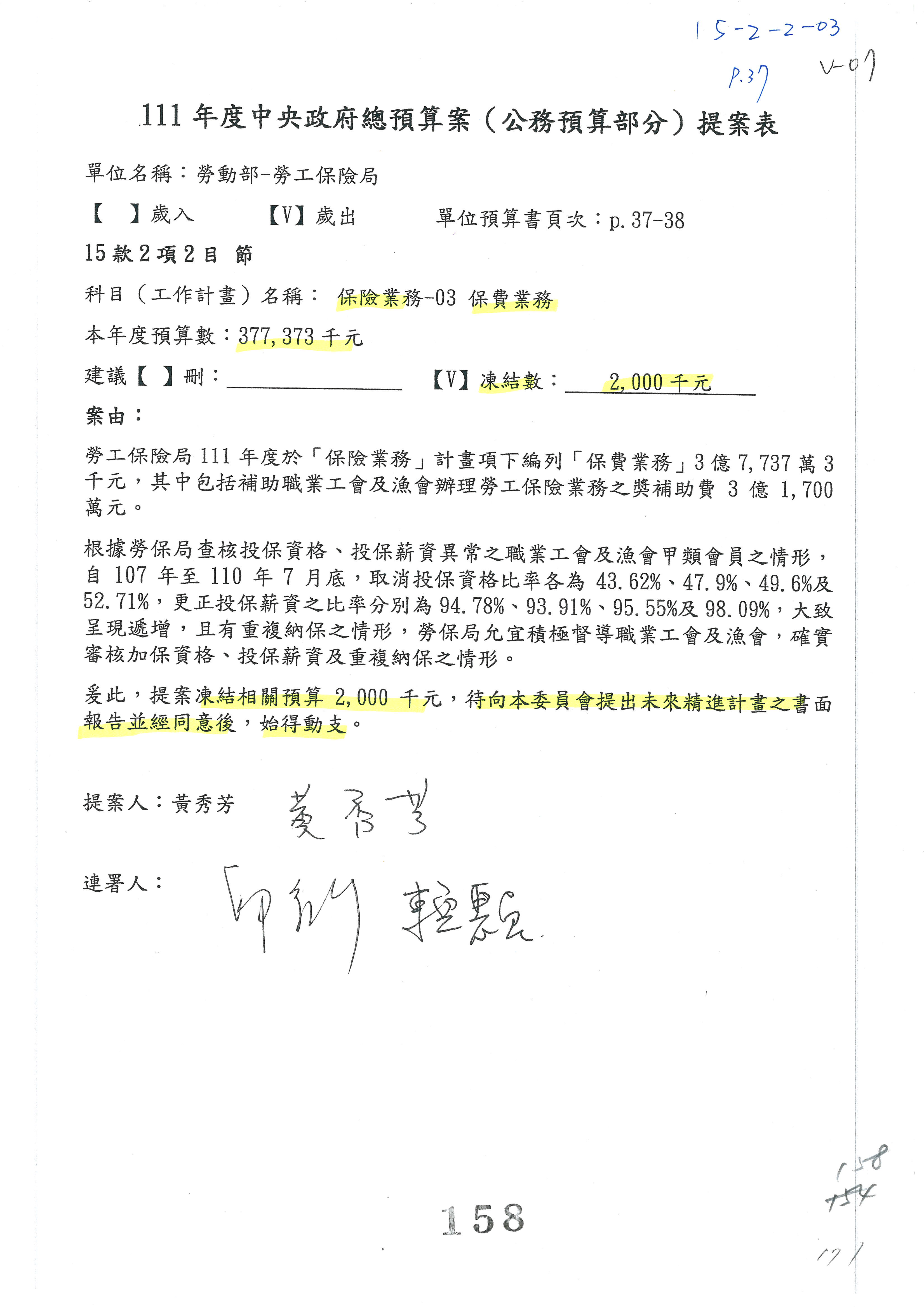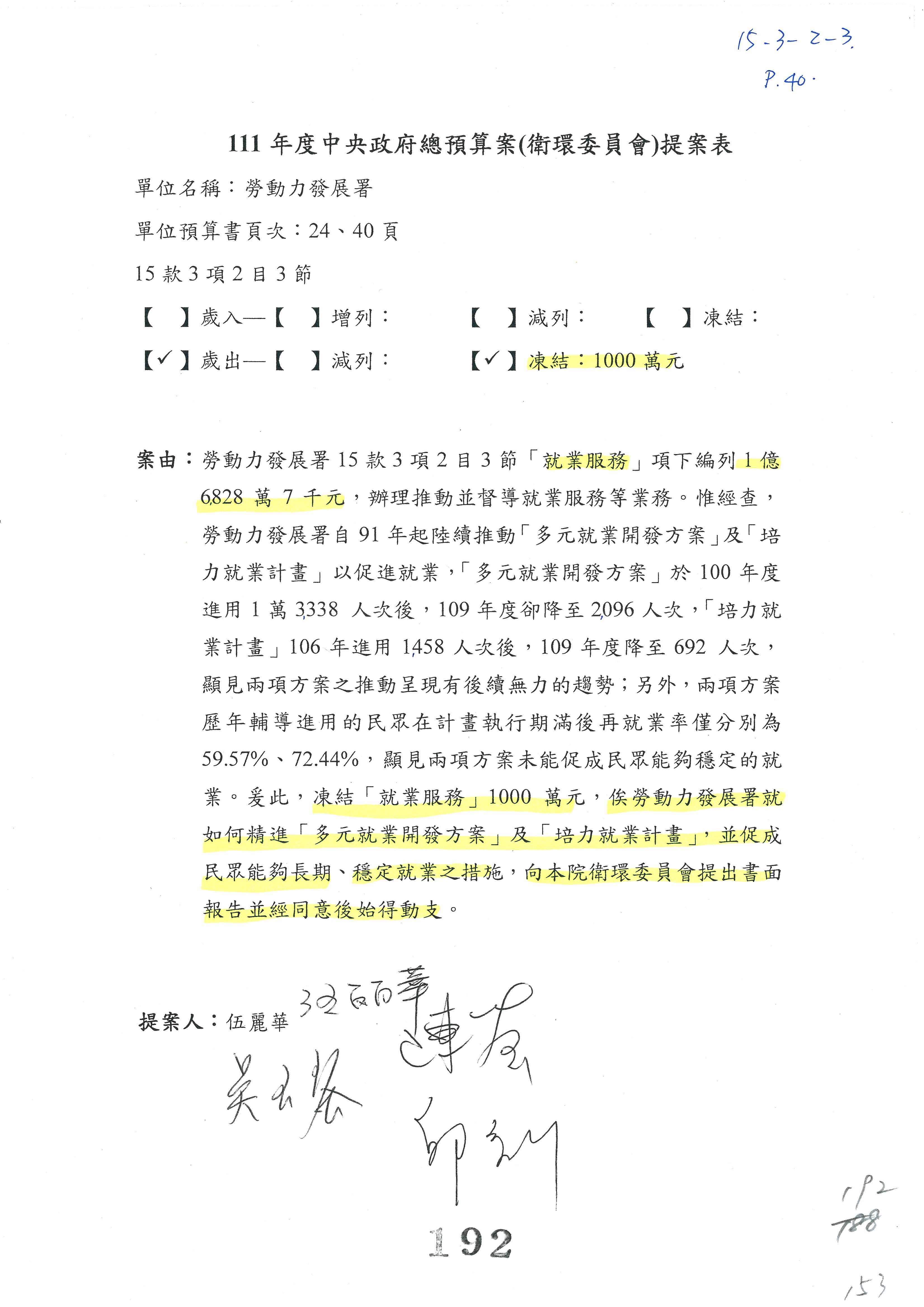 陳司長美女:我們會遵照委員指示,持續研議勞保財務改善的對策,委員同意改凍10萬元,併第3案凍結,提書面報告後始得動支,委員已簽署。