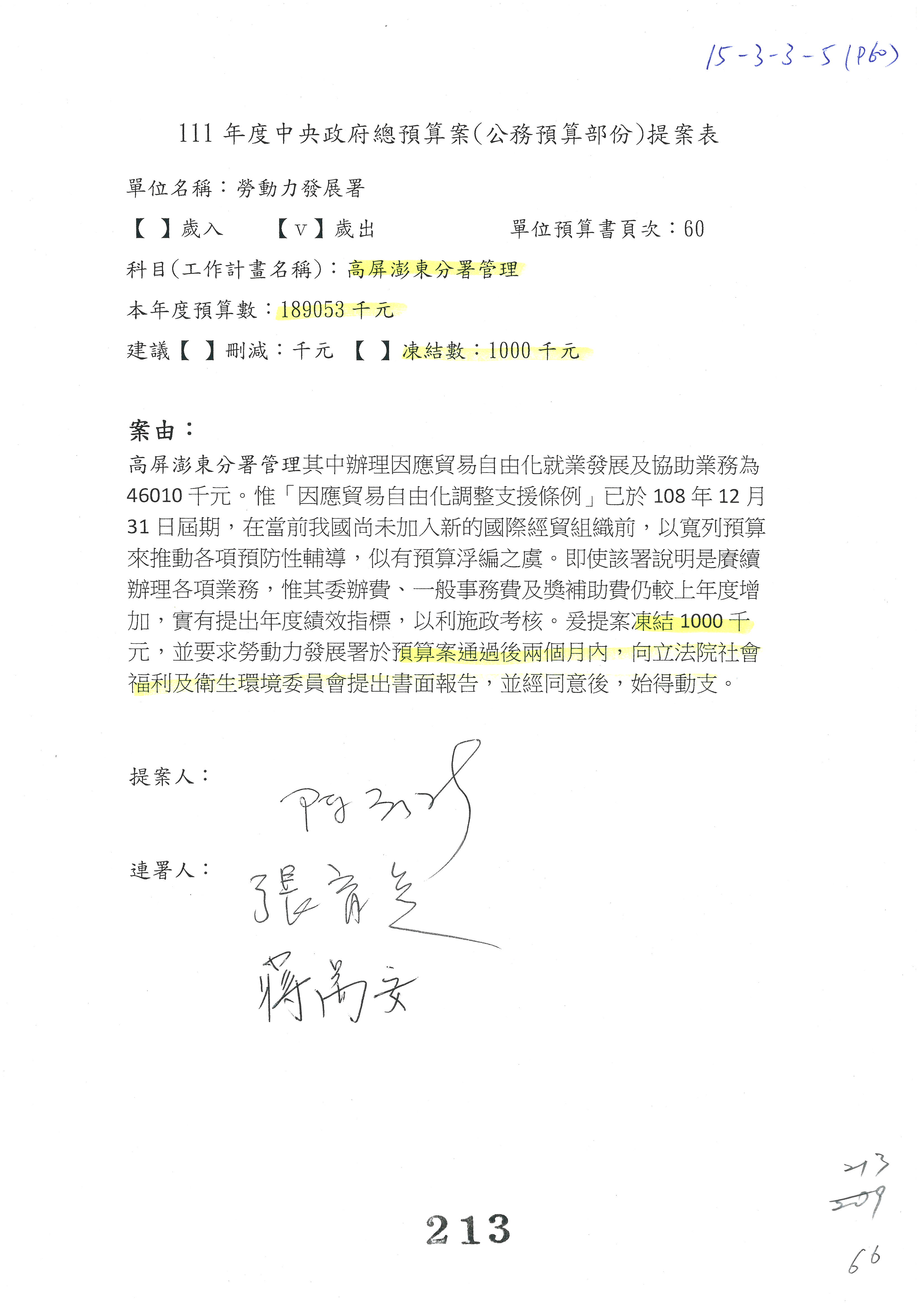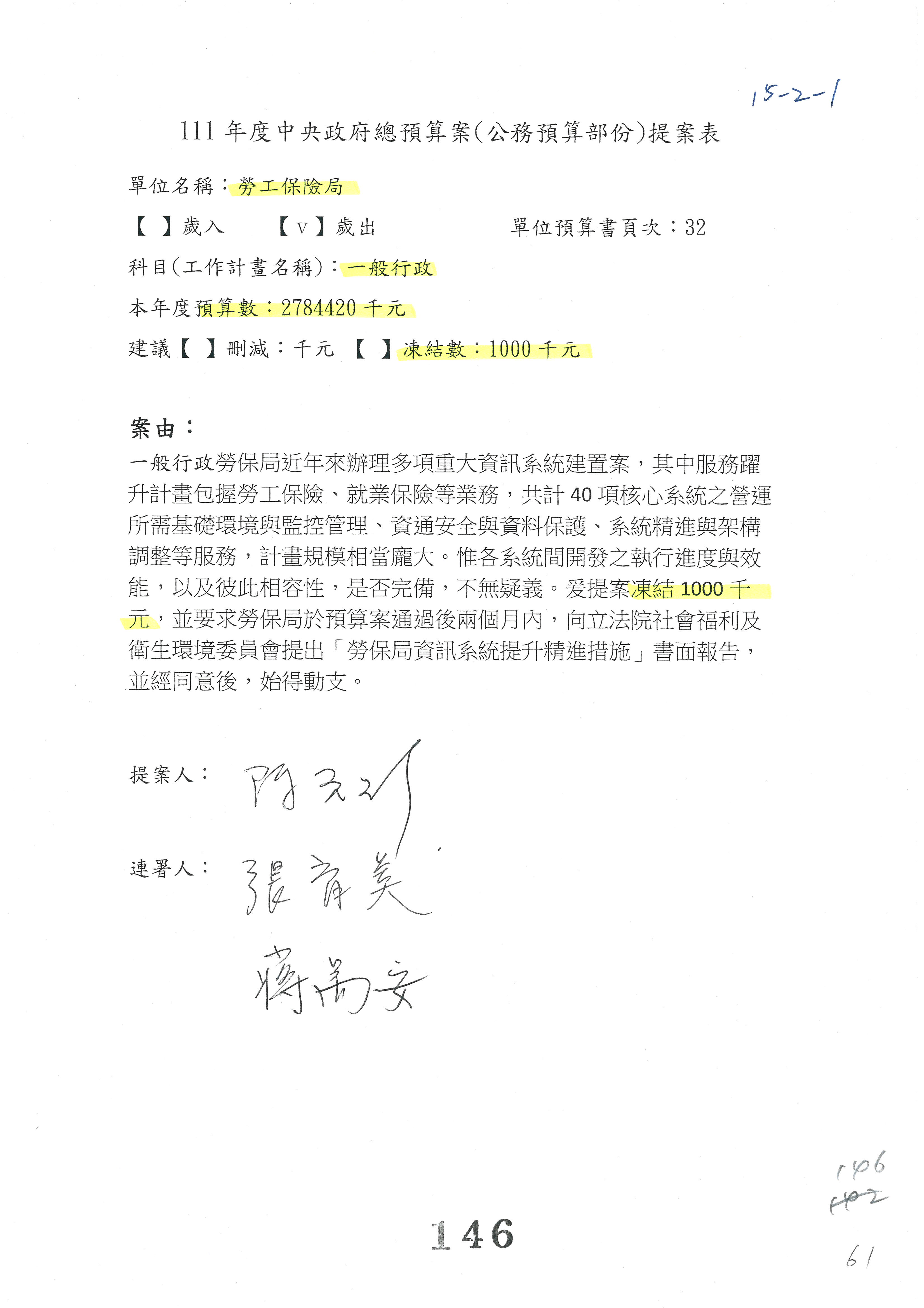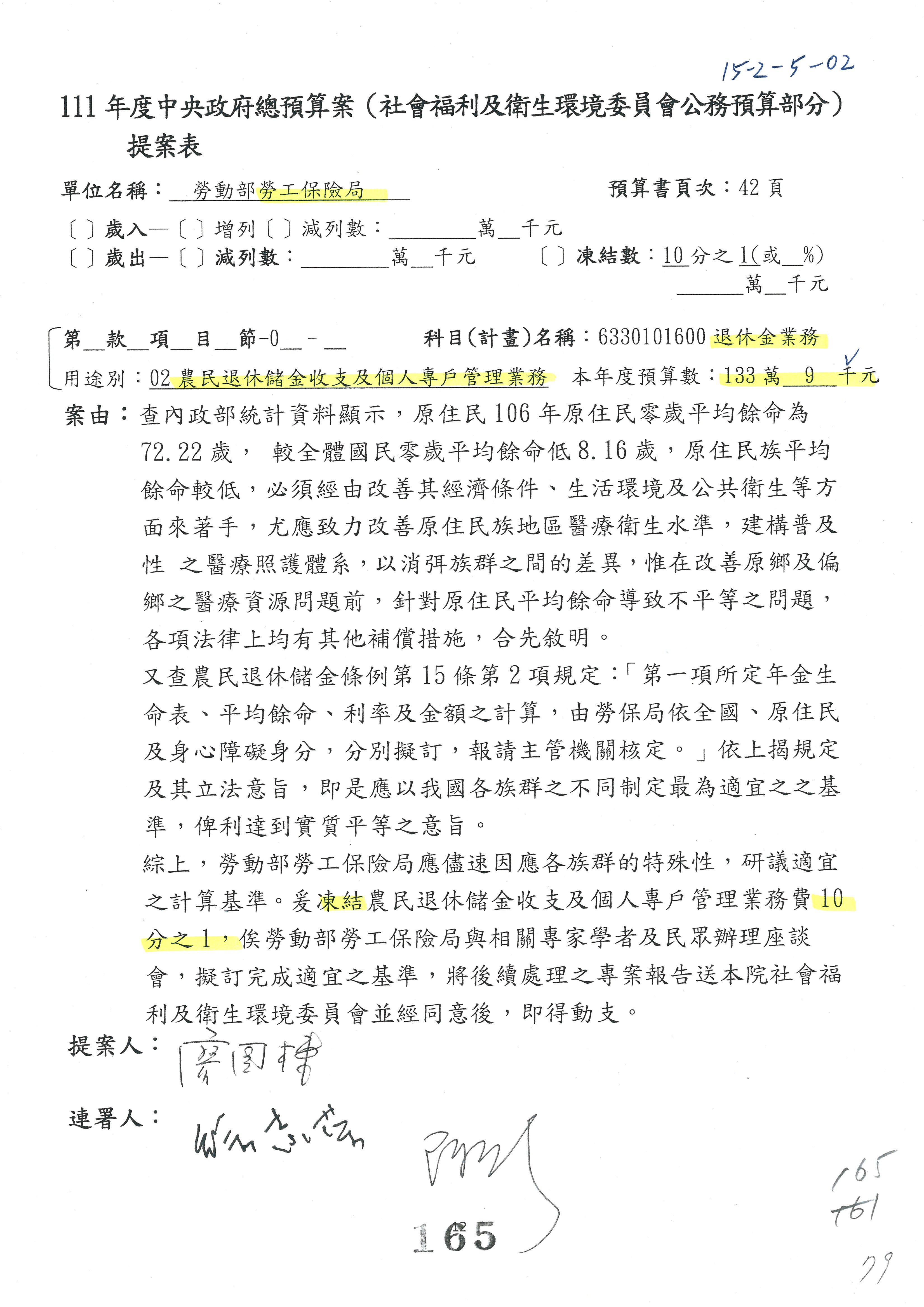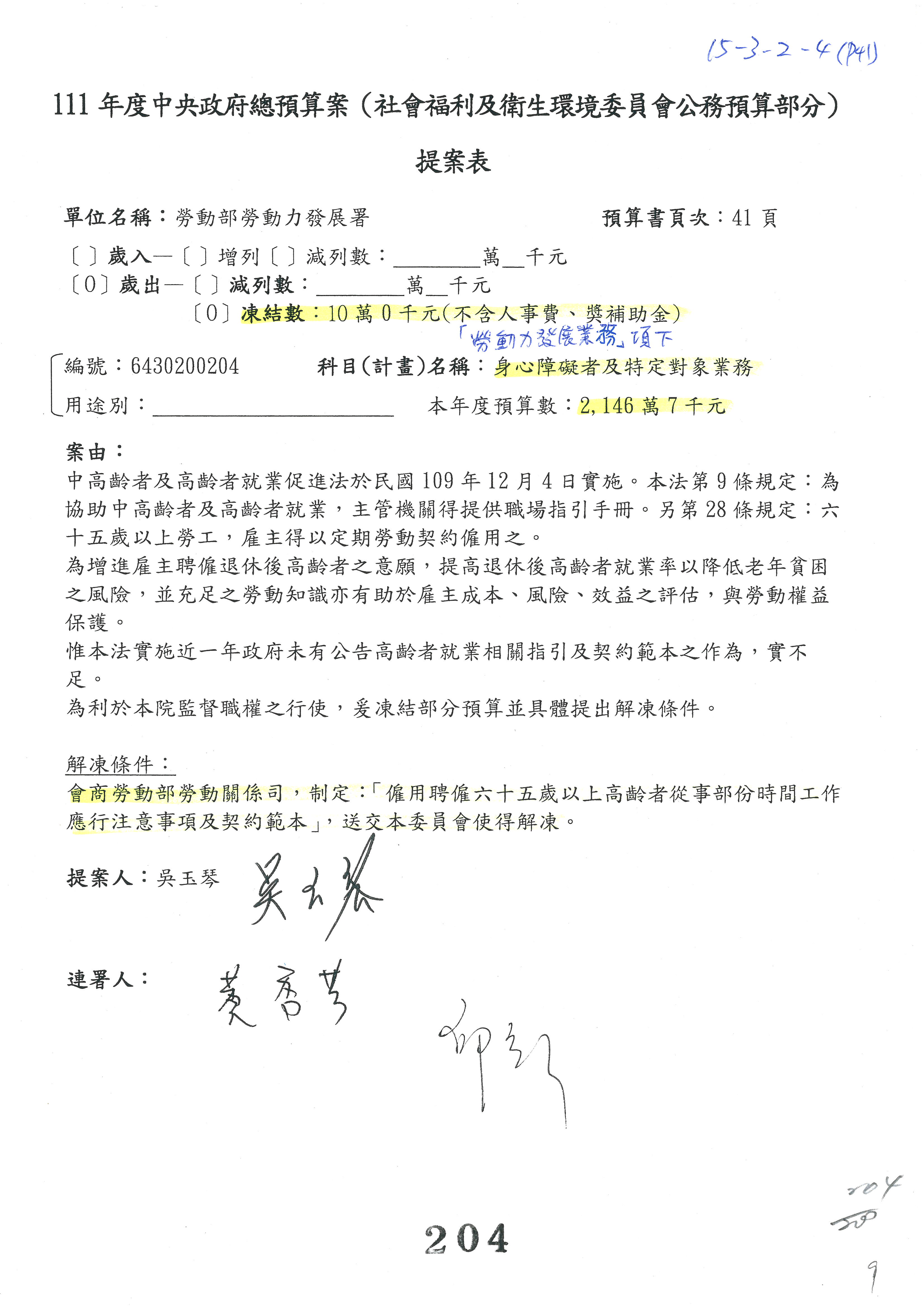 陳司長美女:我們會遵照委員指示,持續研議勞保財務改善的對策,委員同意改凍10萬元,併第3案凍結,提書面報告後始得動支,委員已簽署。