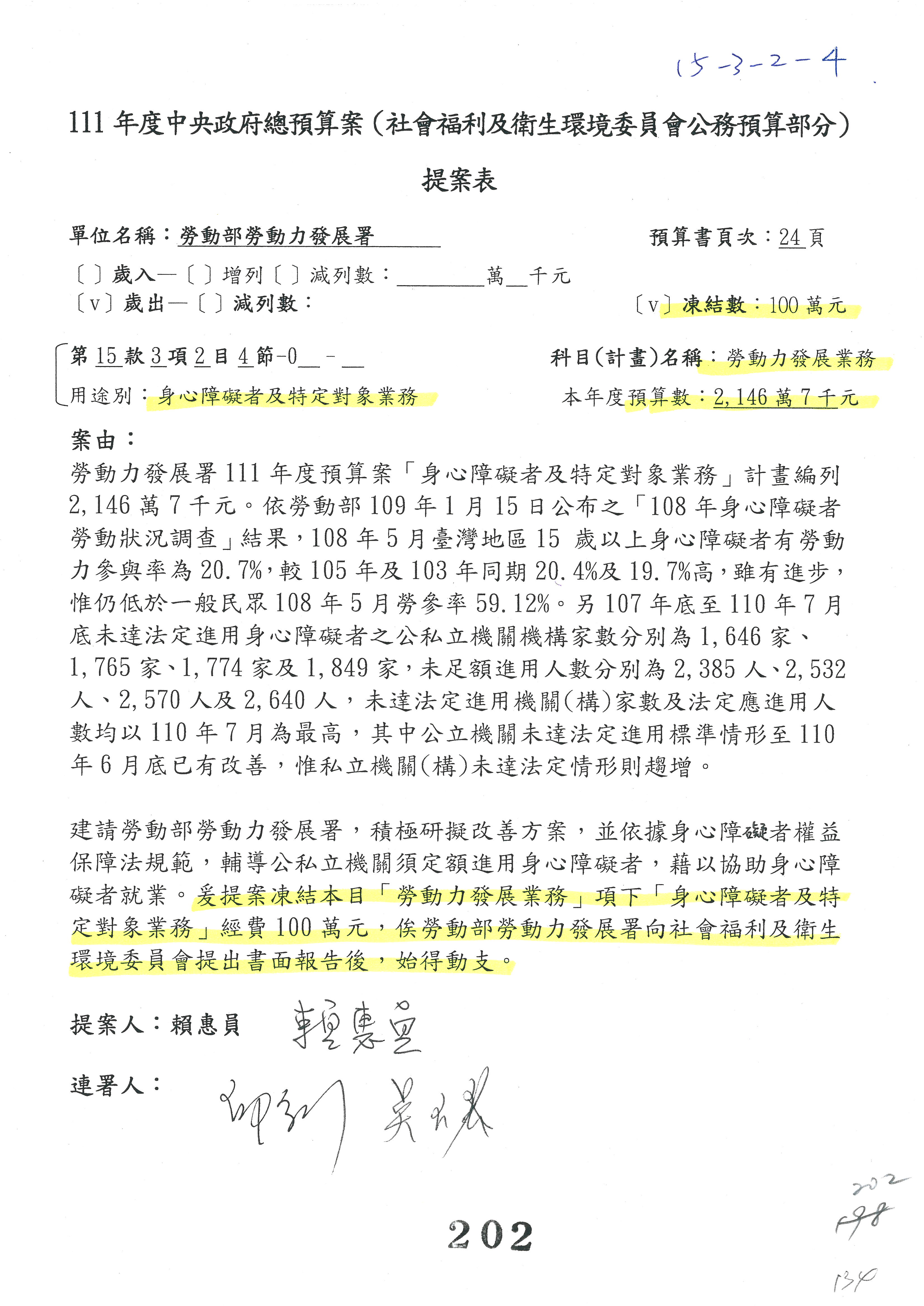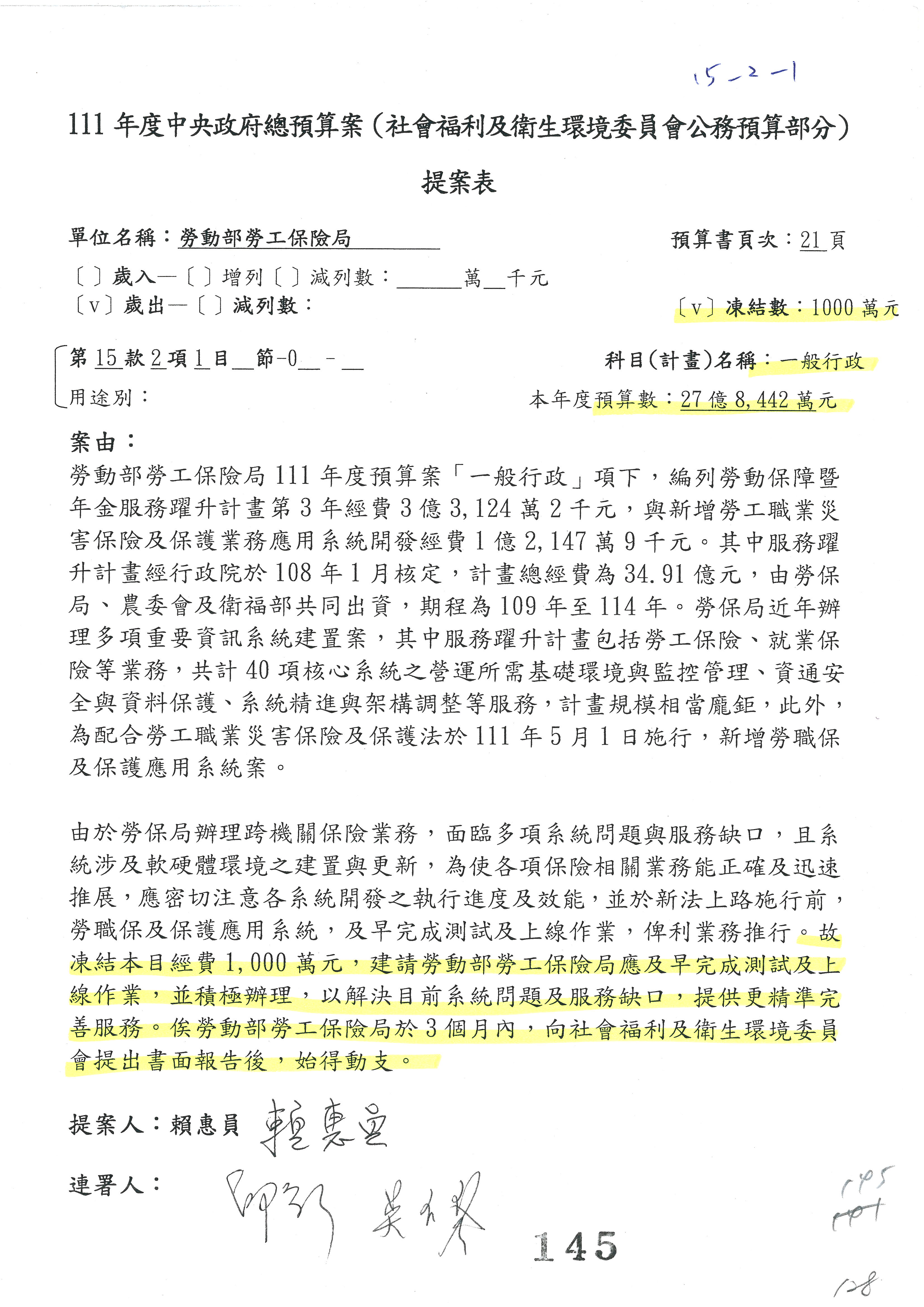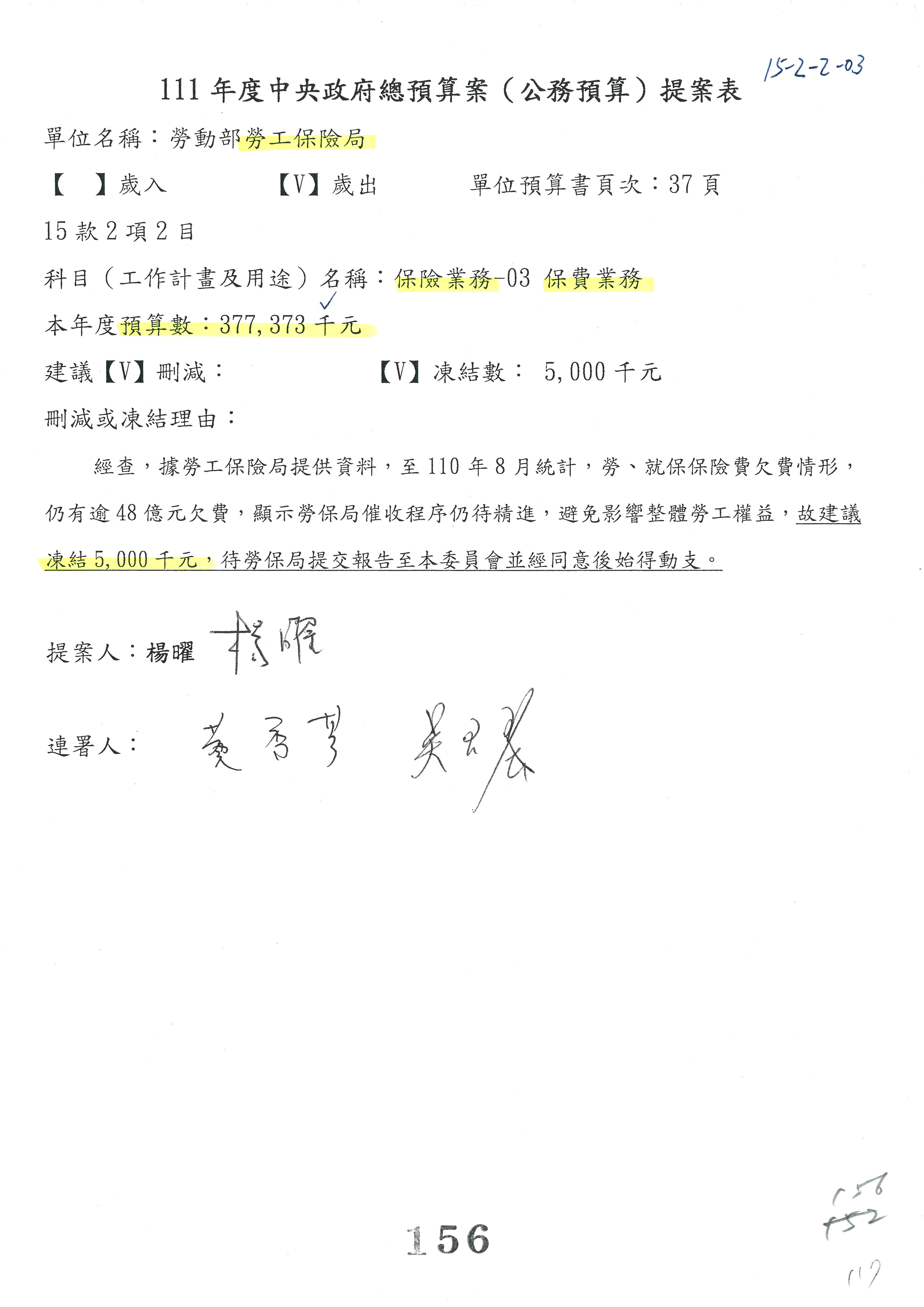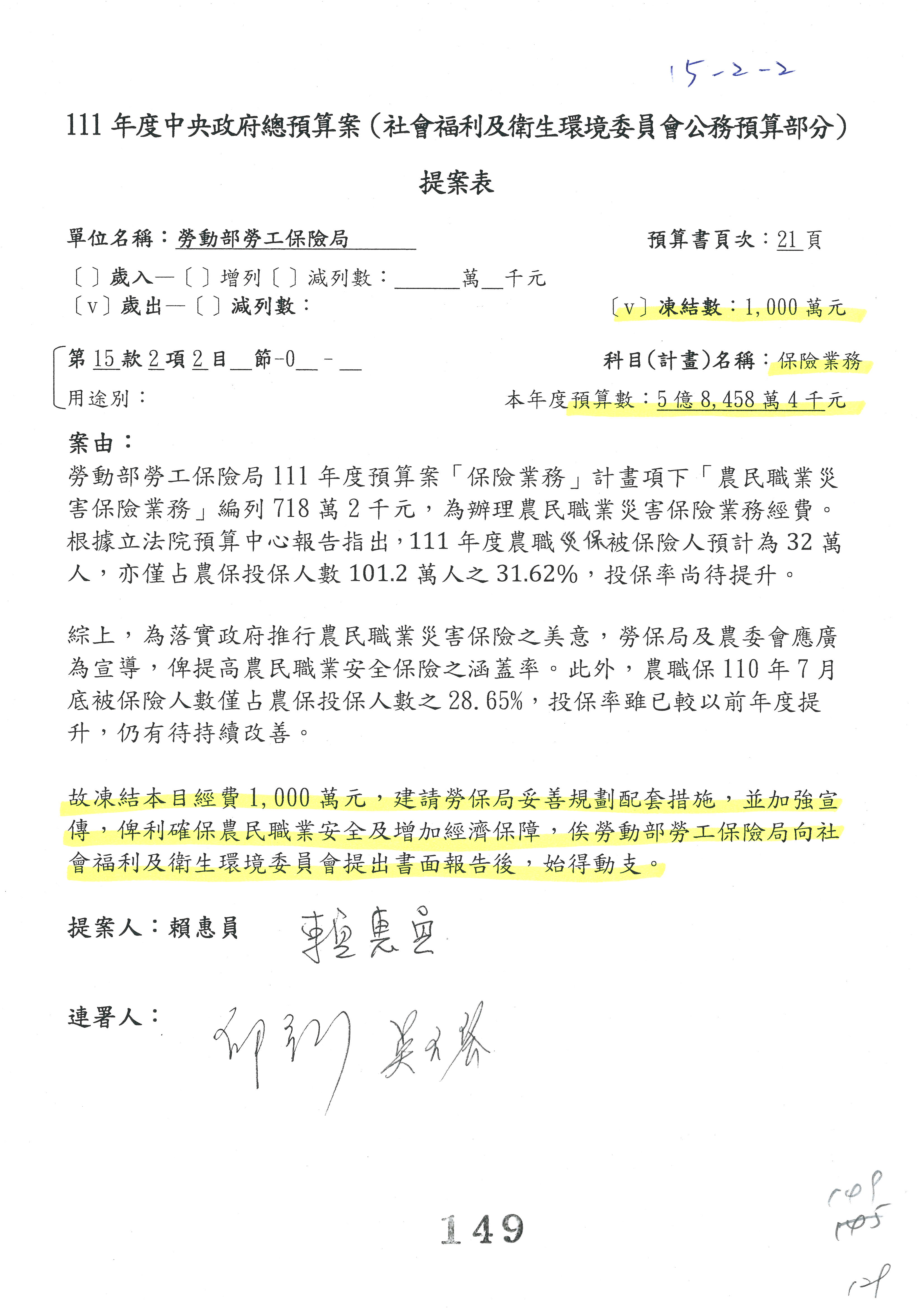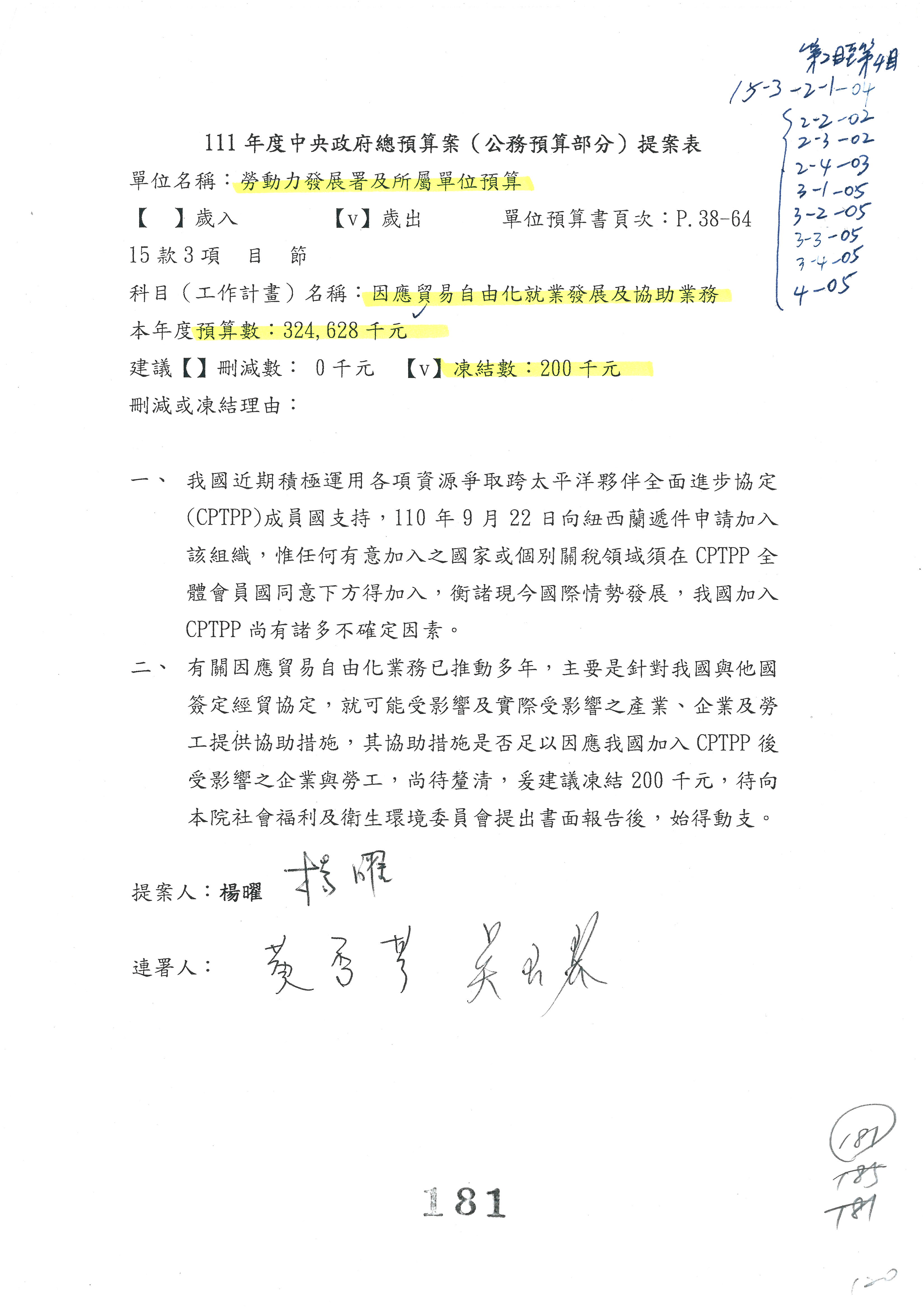 陳司長美女:我們會遵照委員指示,持續研議勞保財務改善的對策,委員同意改凍10萬元,併第3案凍結,提書面報告後始得動支,委員已簽署。