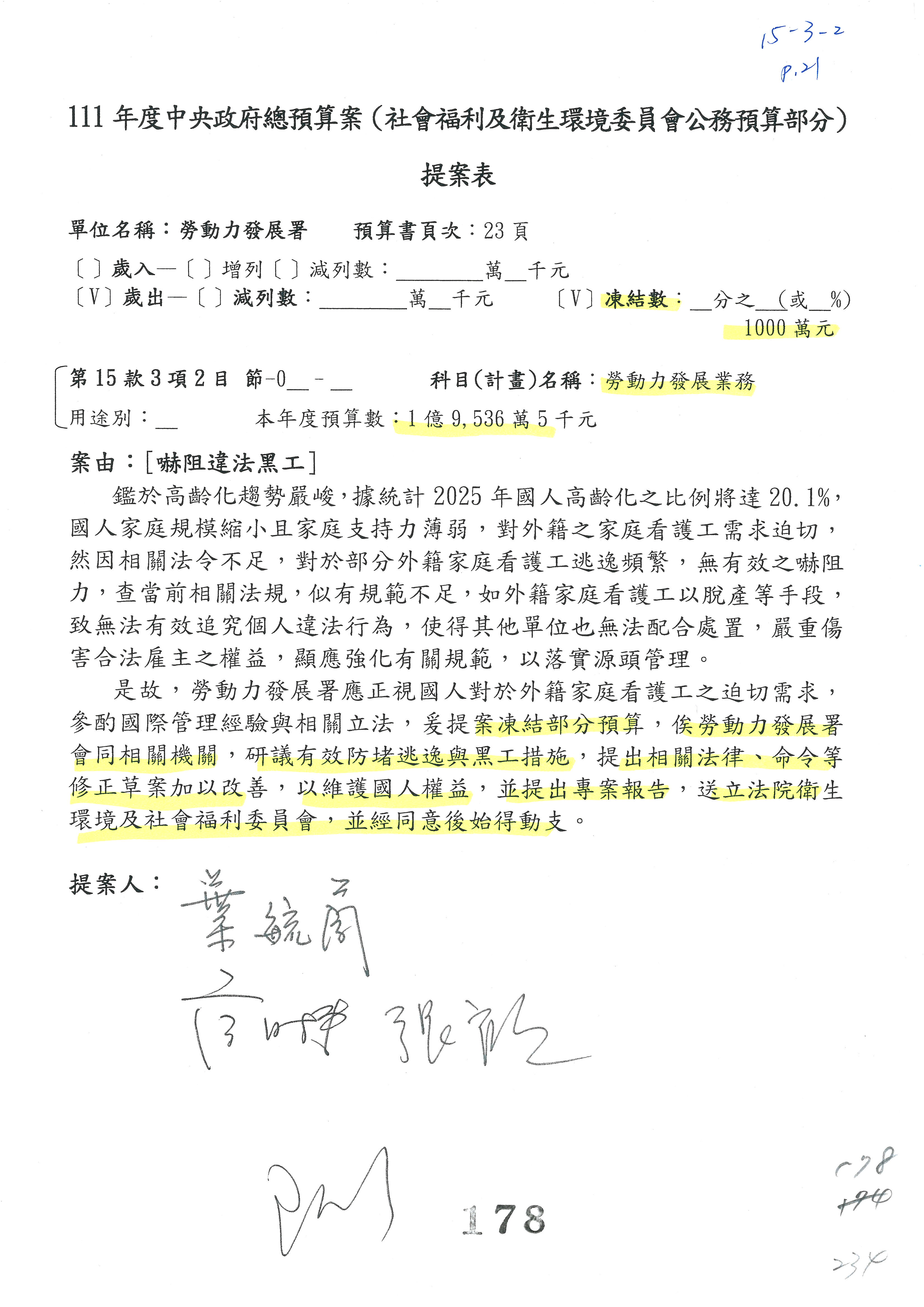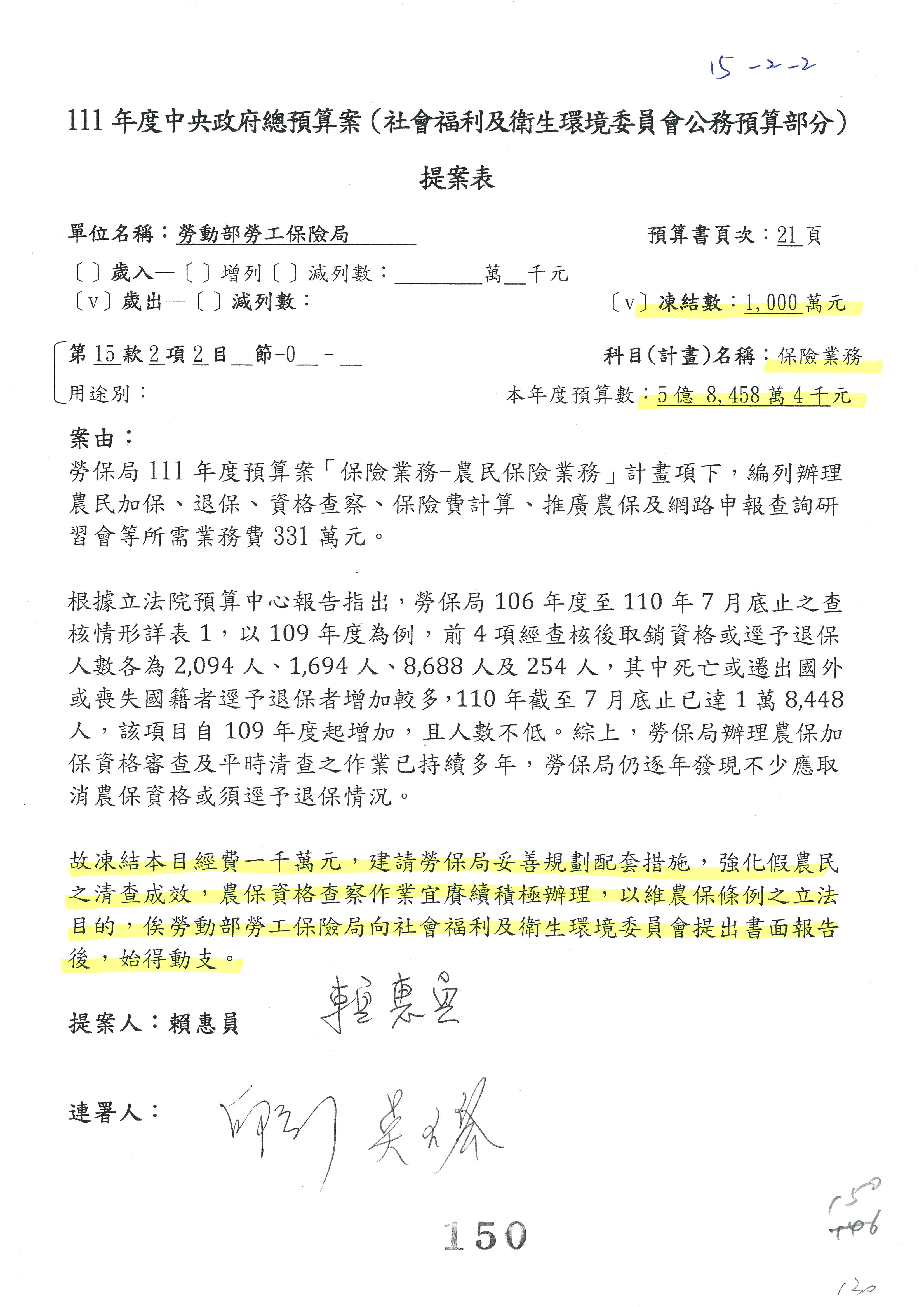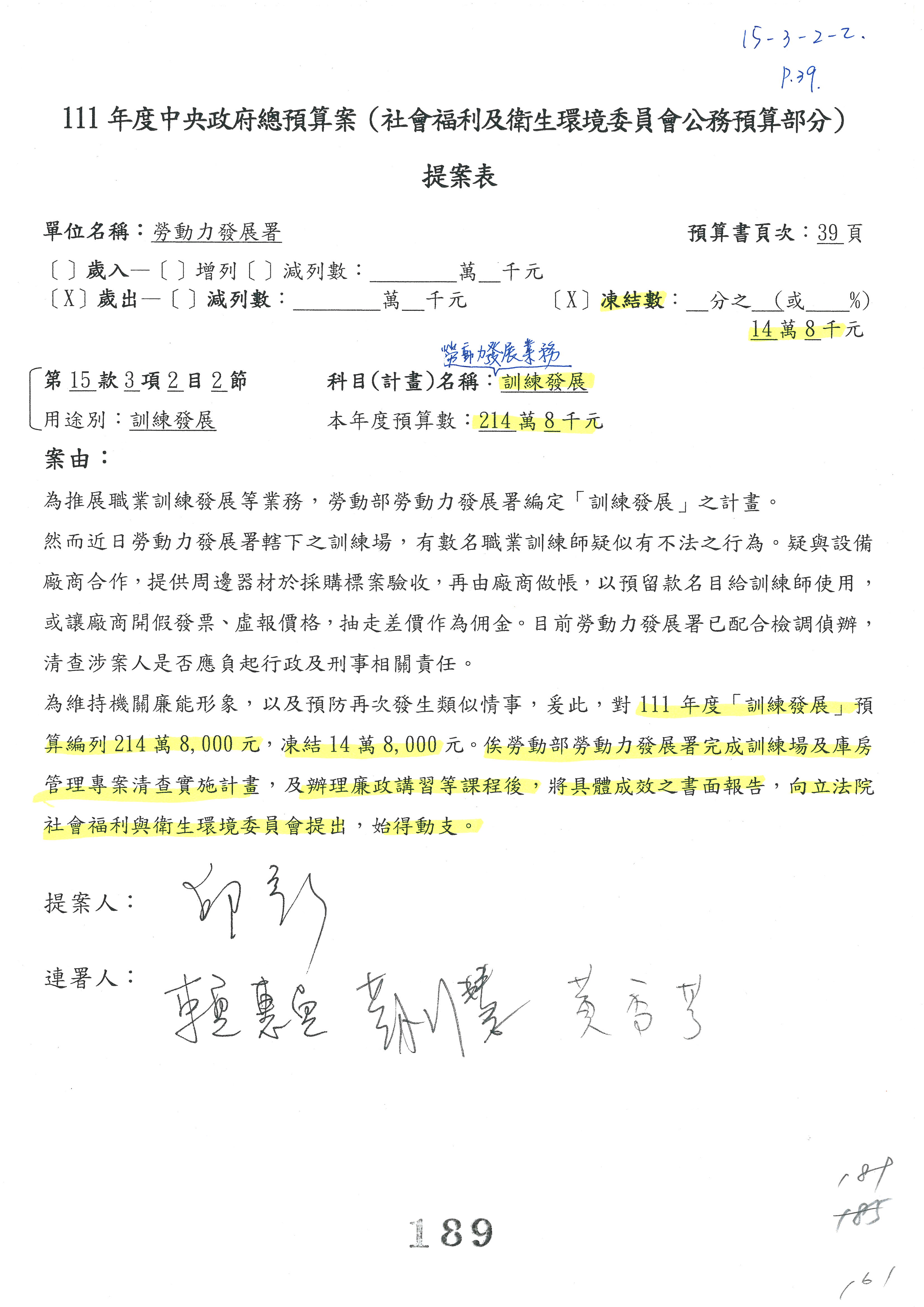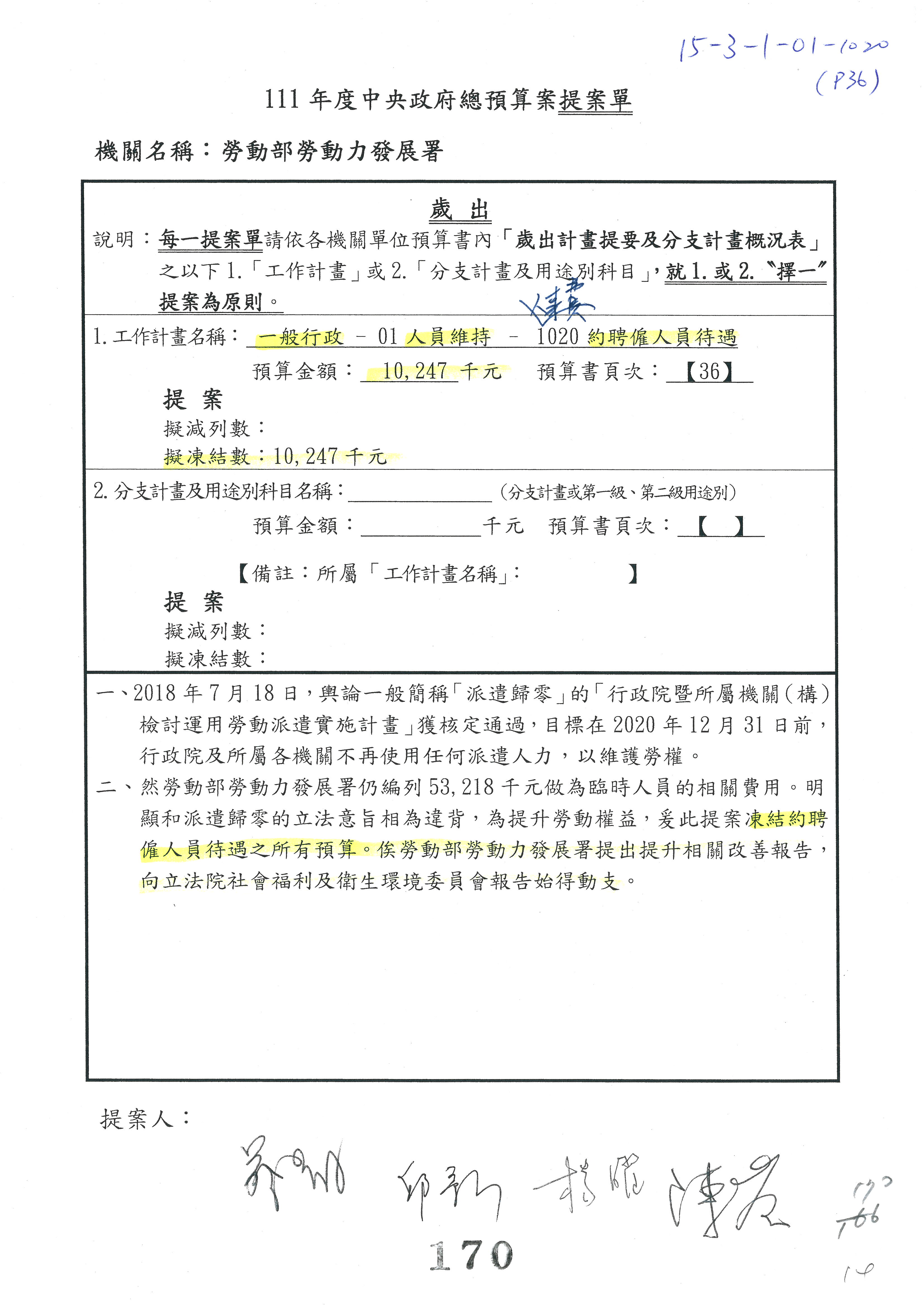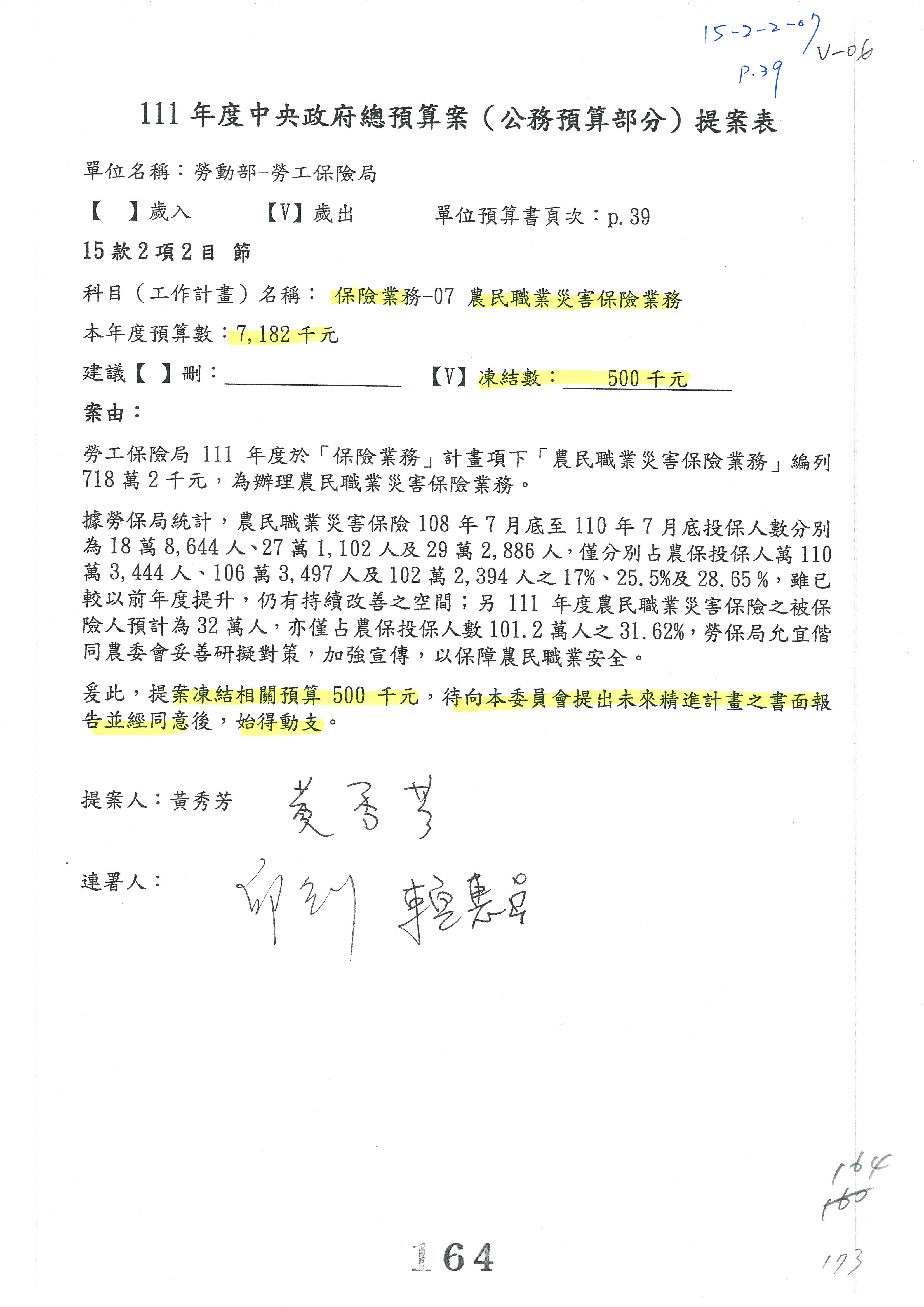 陳司長美女:我們會遵照委員指示,持續研議勞保財務改善的對策,委員同意改凍10萬元,併第3案凍結,提書面報告後始得動支,委員已簽署。