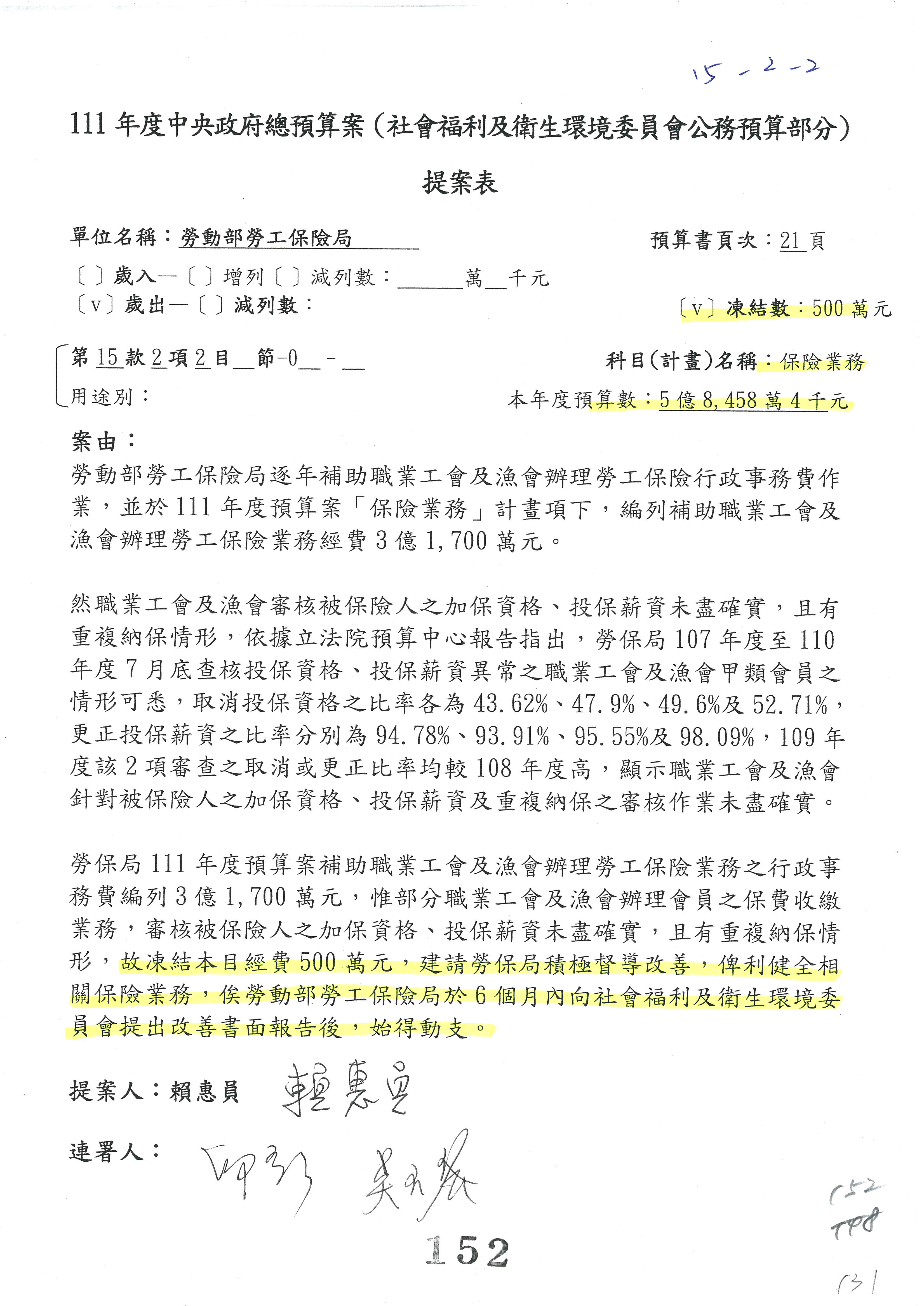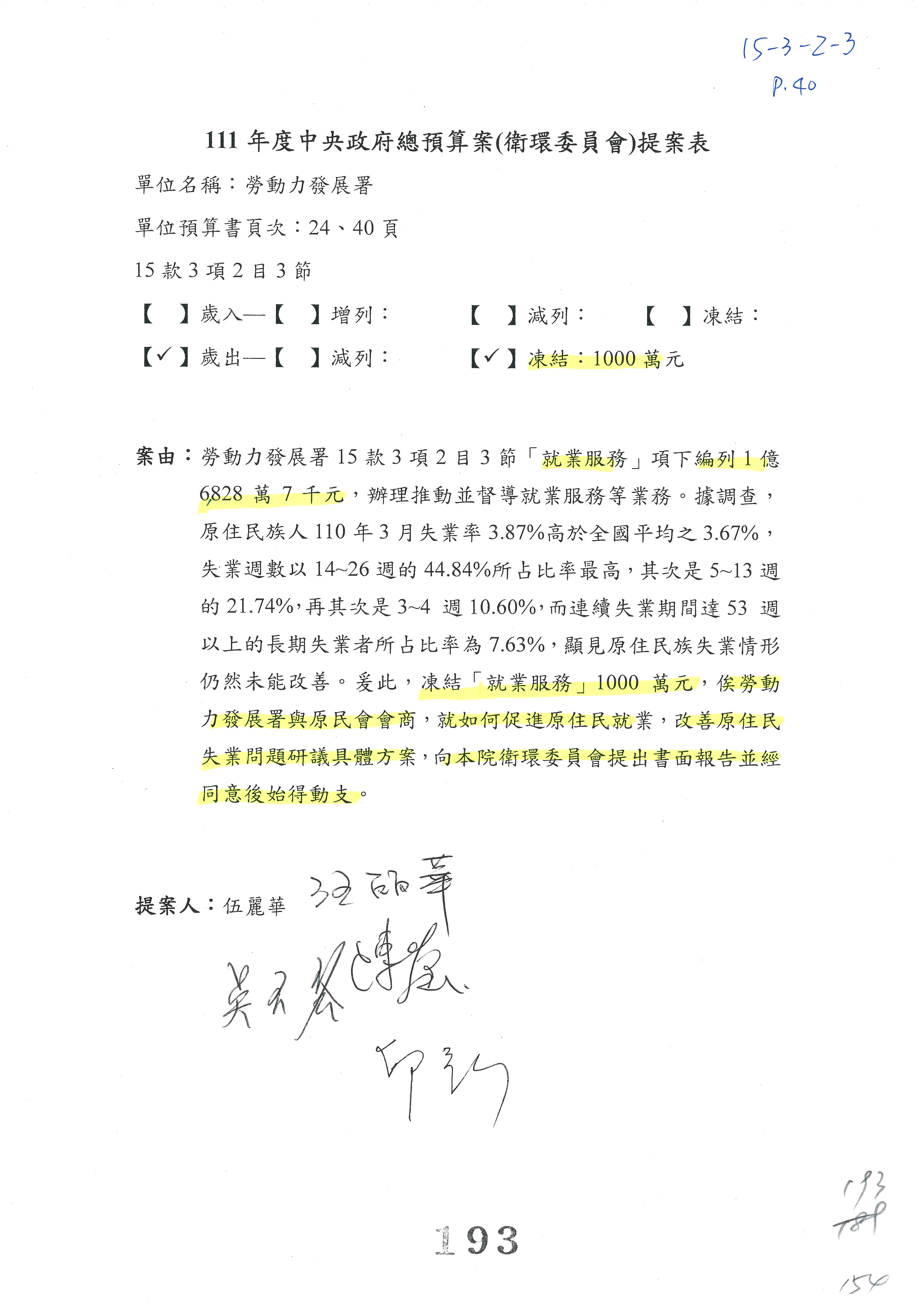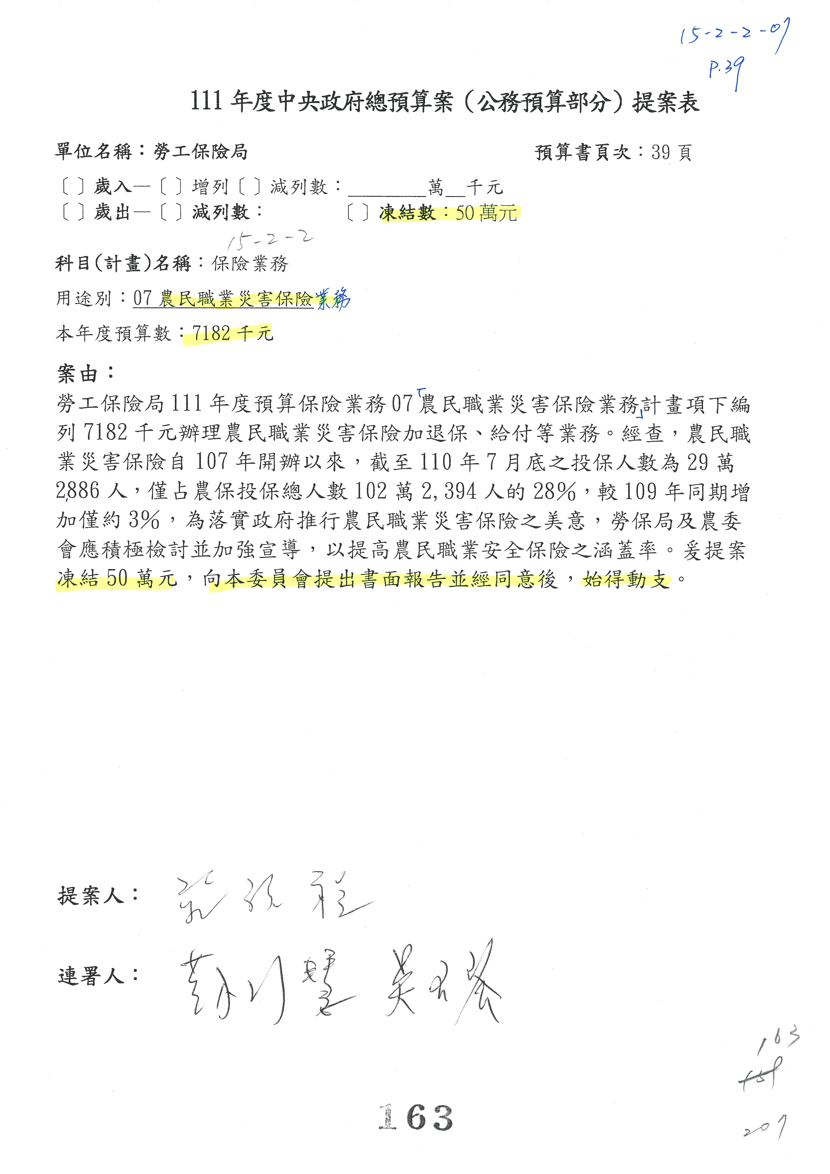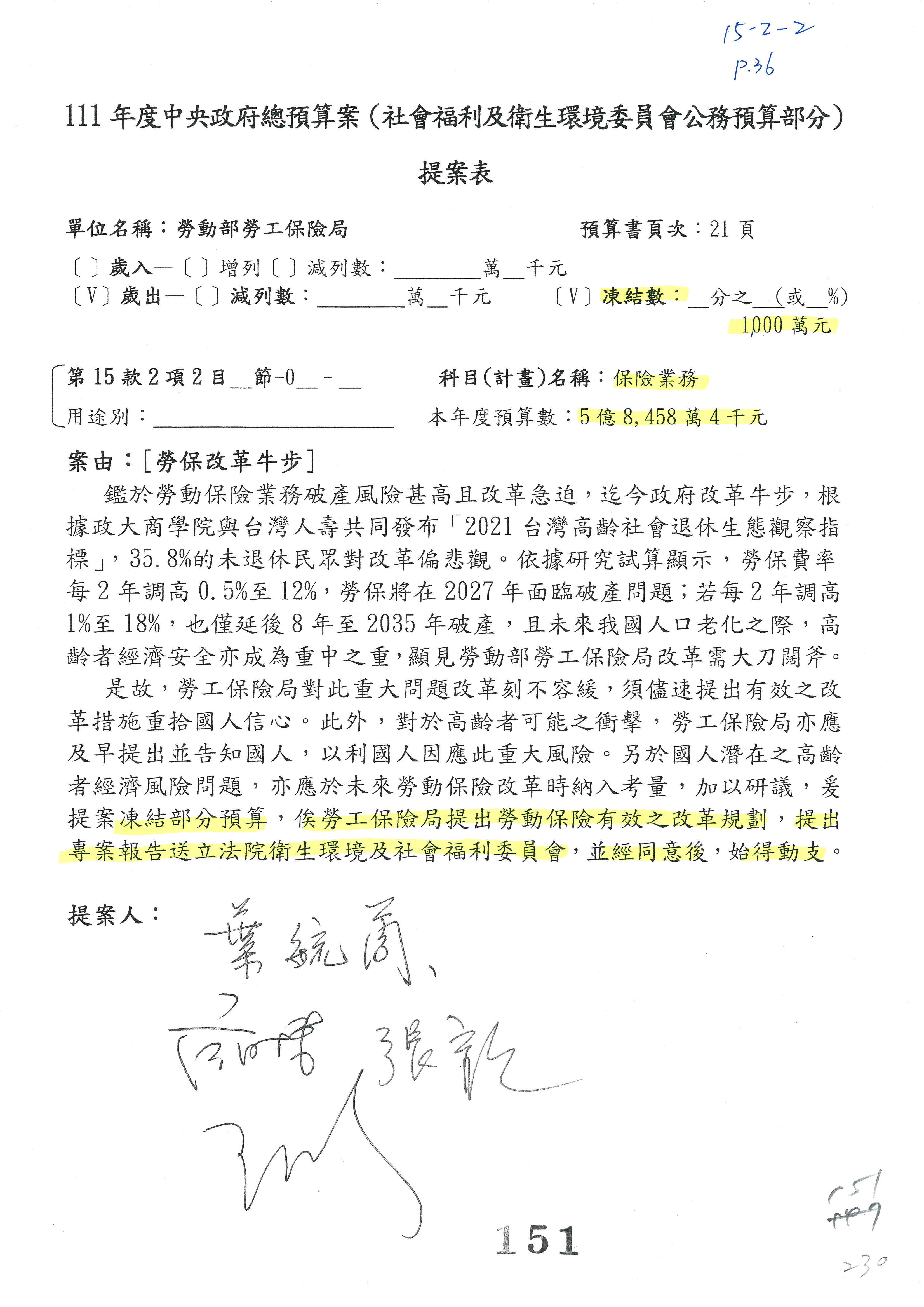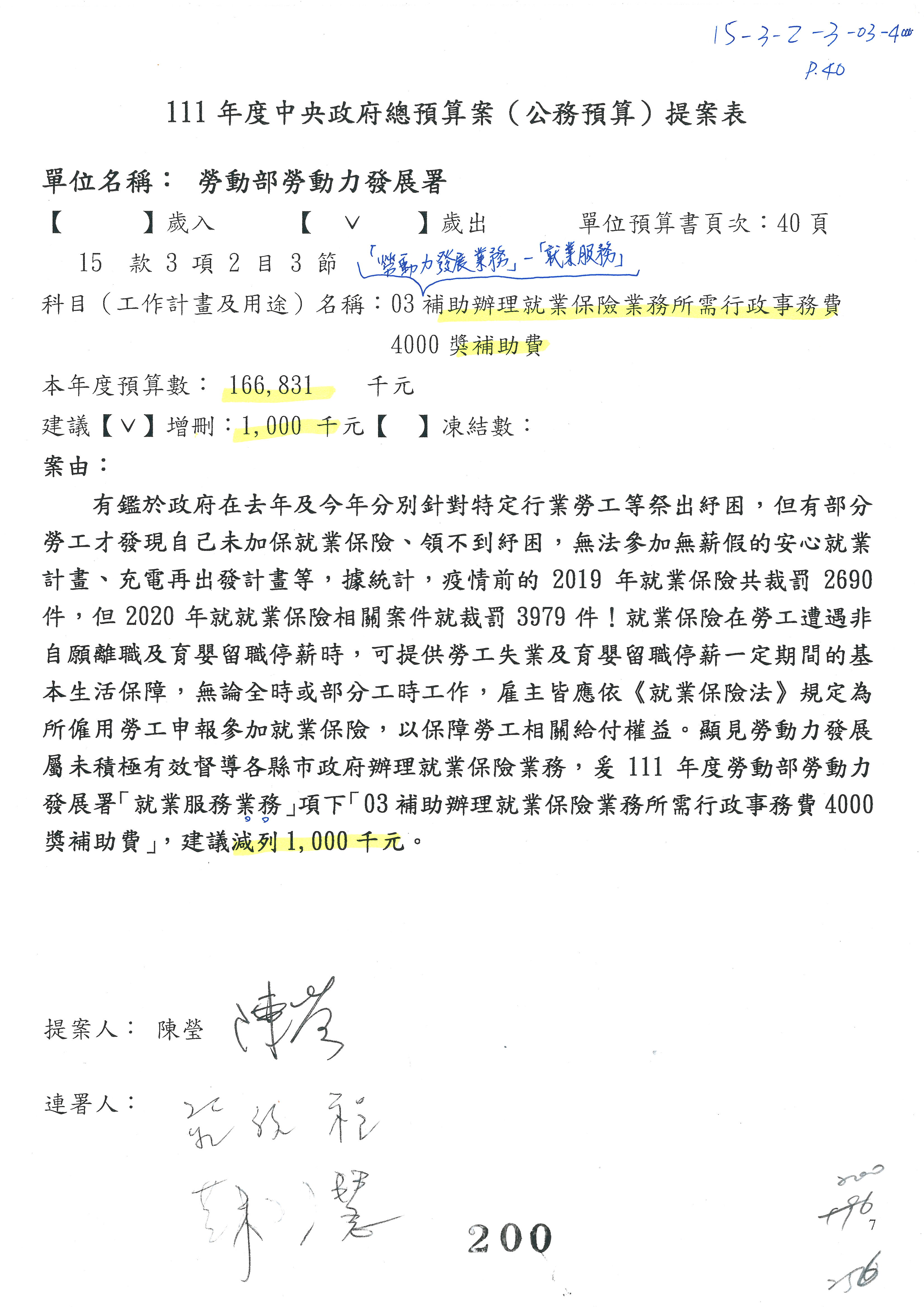 陳司長美女:我們會遵照委員指示,持續研議勞保財務改善的對策,委員同意改凍10萬元,併第3案凍結,提書面報告後始得動支,委員已簽署。
