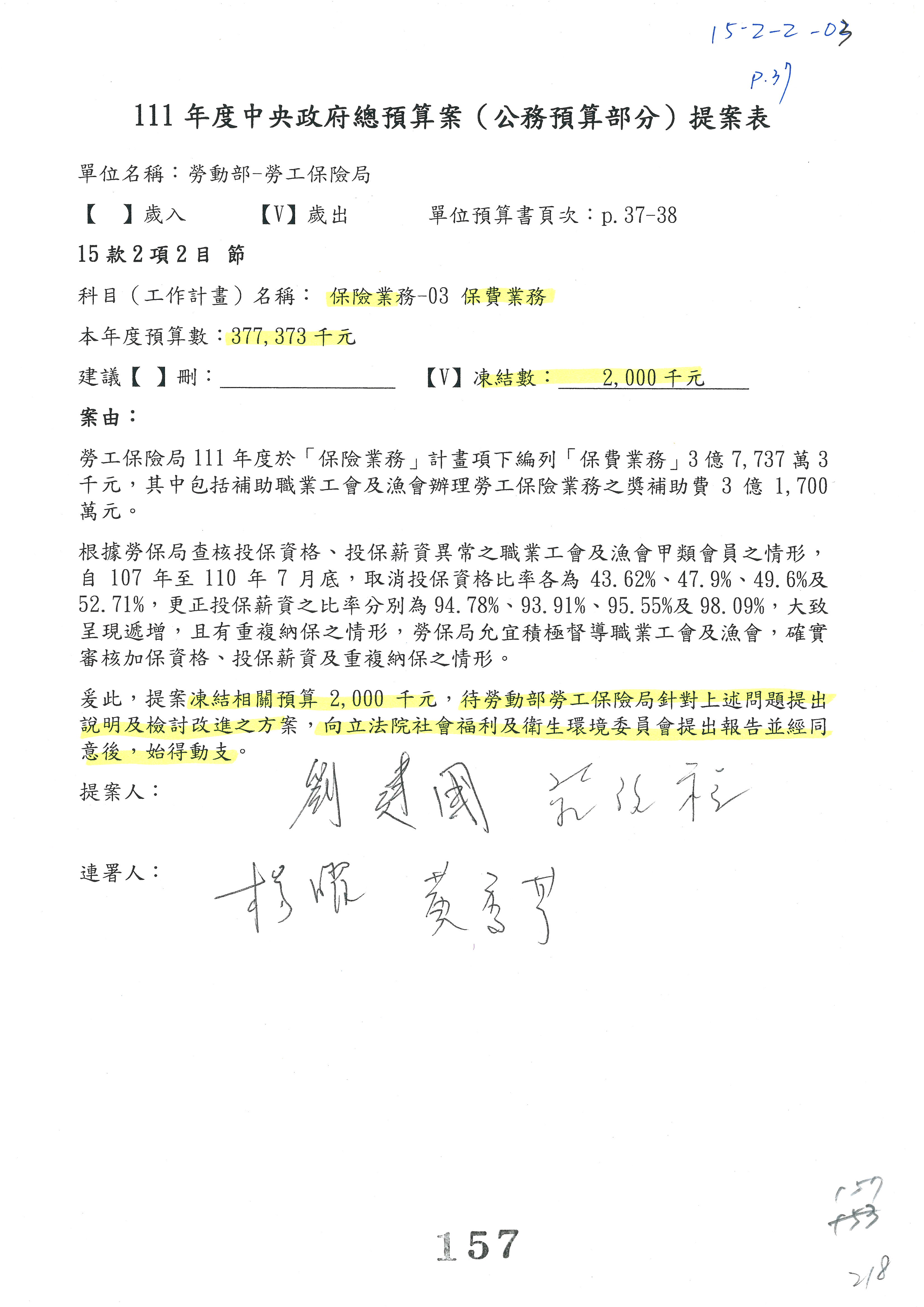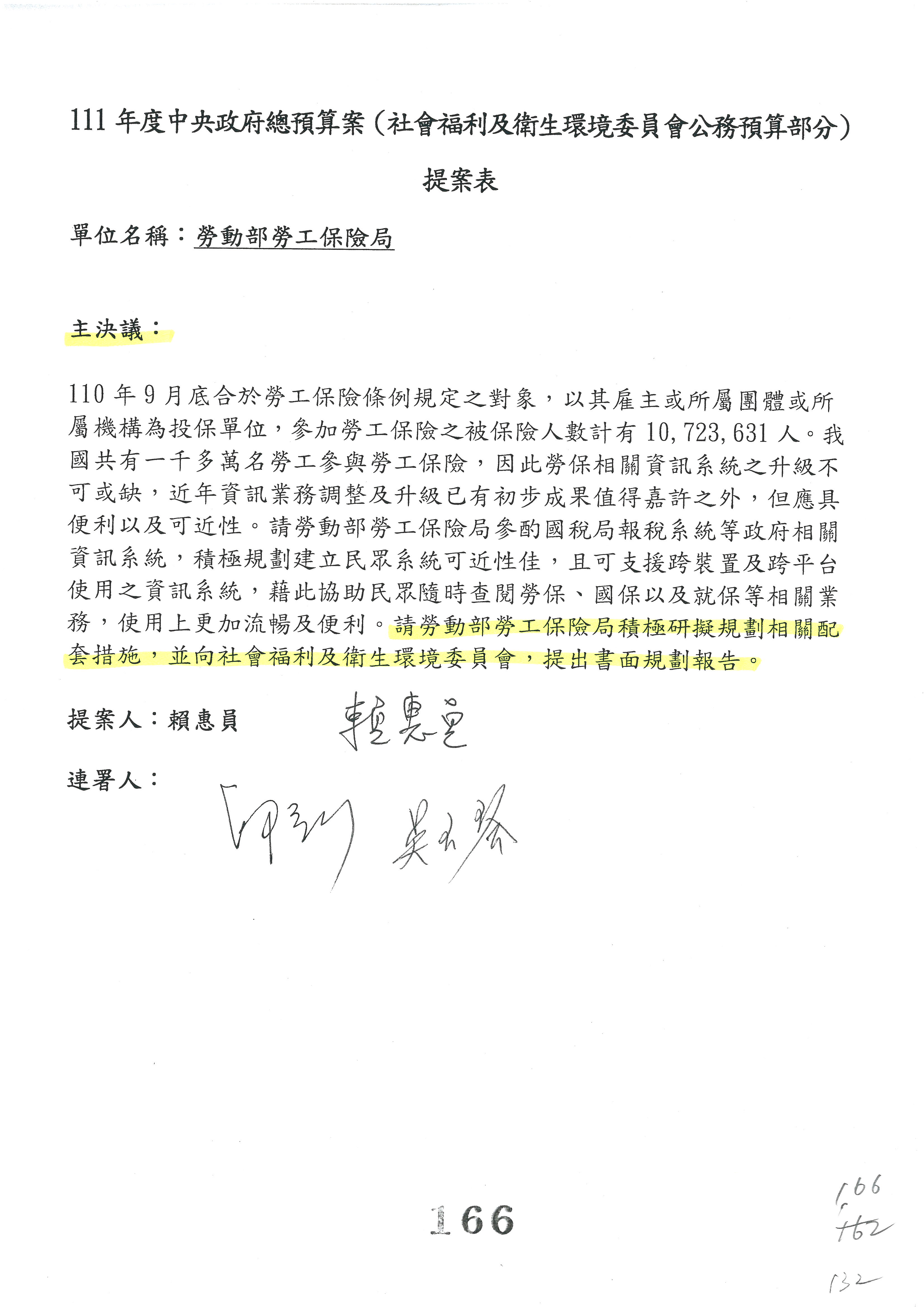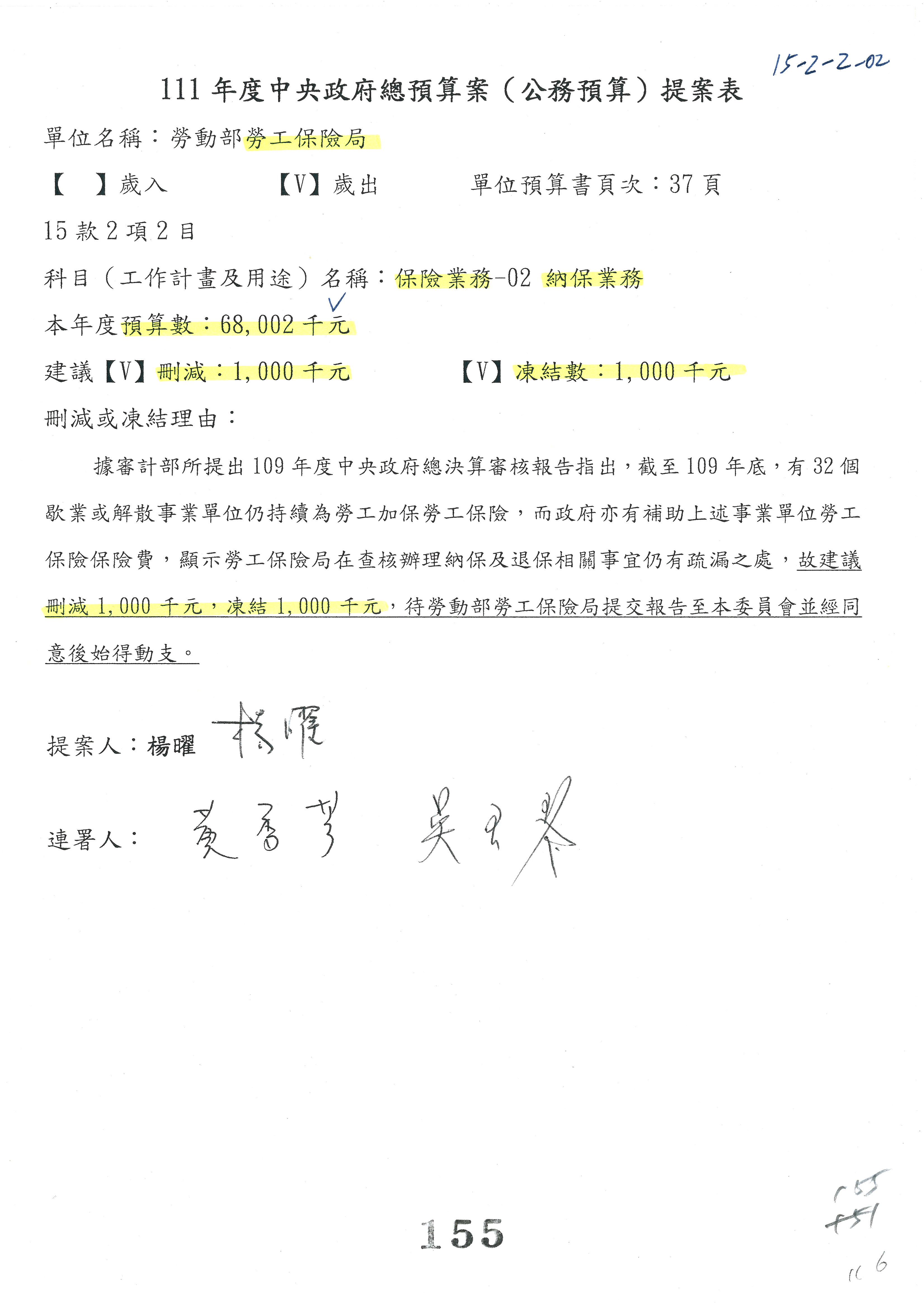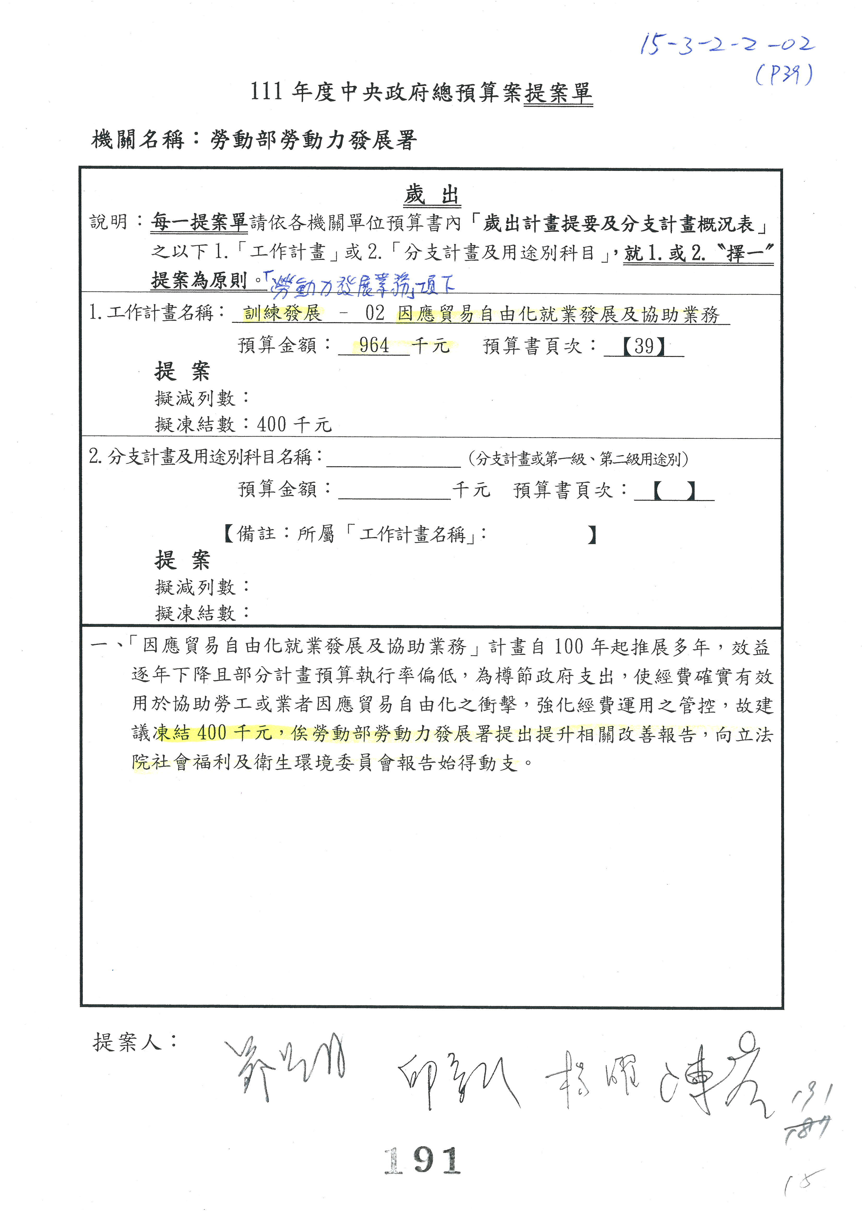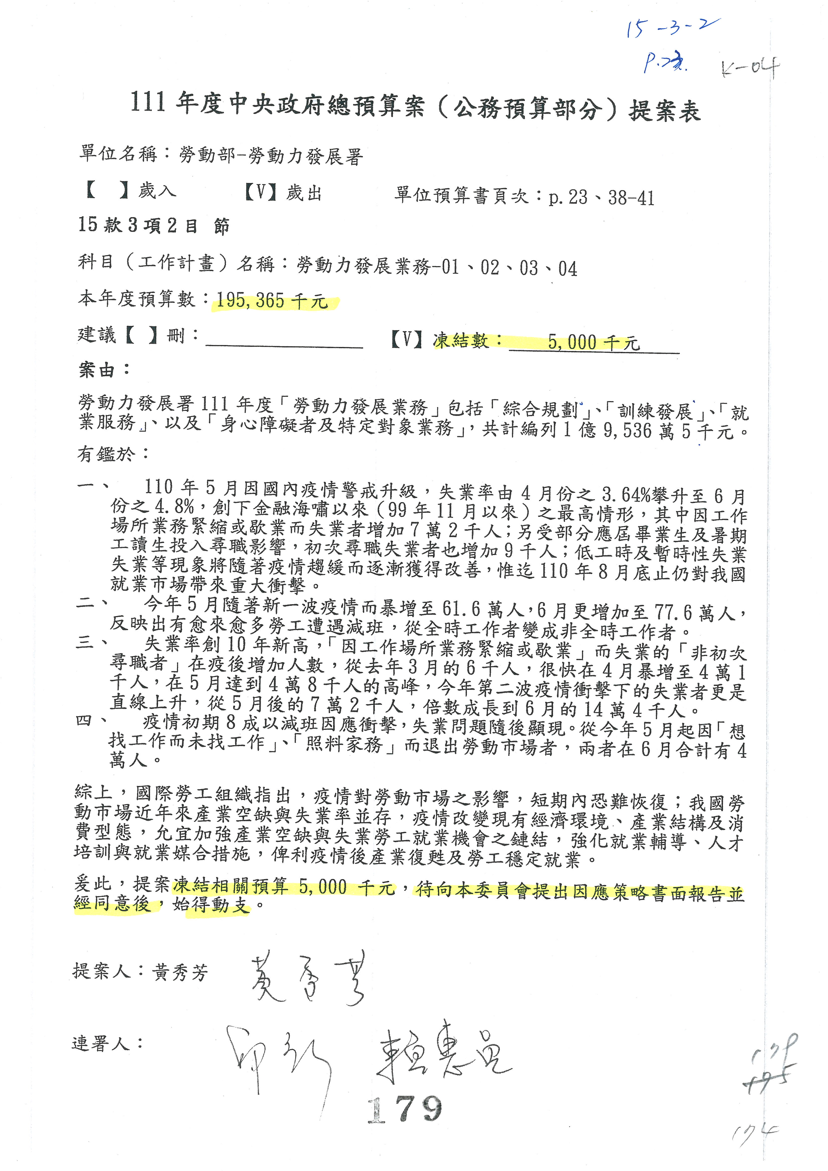 陳司長美女:我們會遵照委員指示,持續研議勞保財務改善的對策,委員同意改凍10萬元,併第3案凍結,提書面報告後始得動支,委員已簽署。